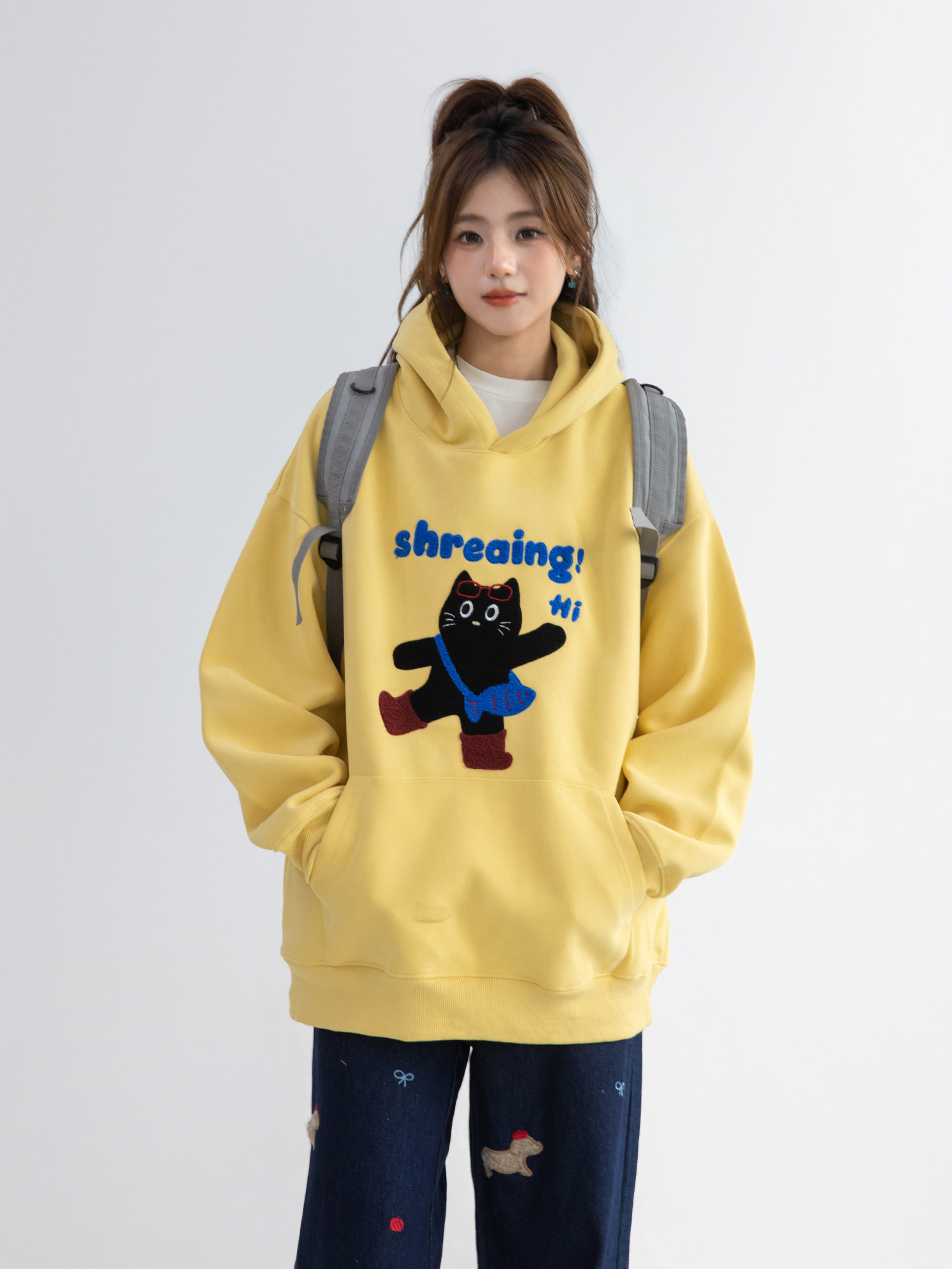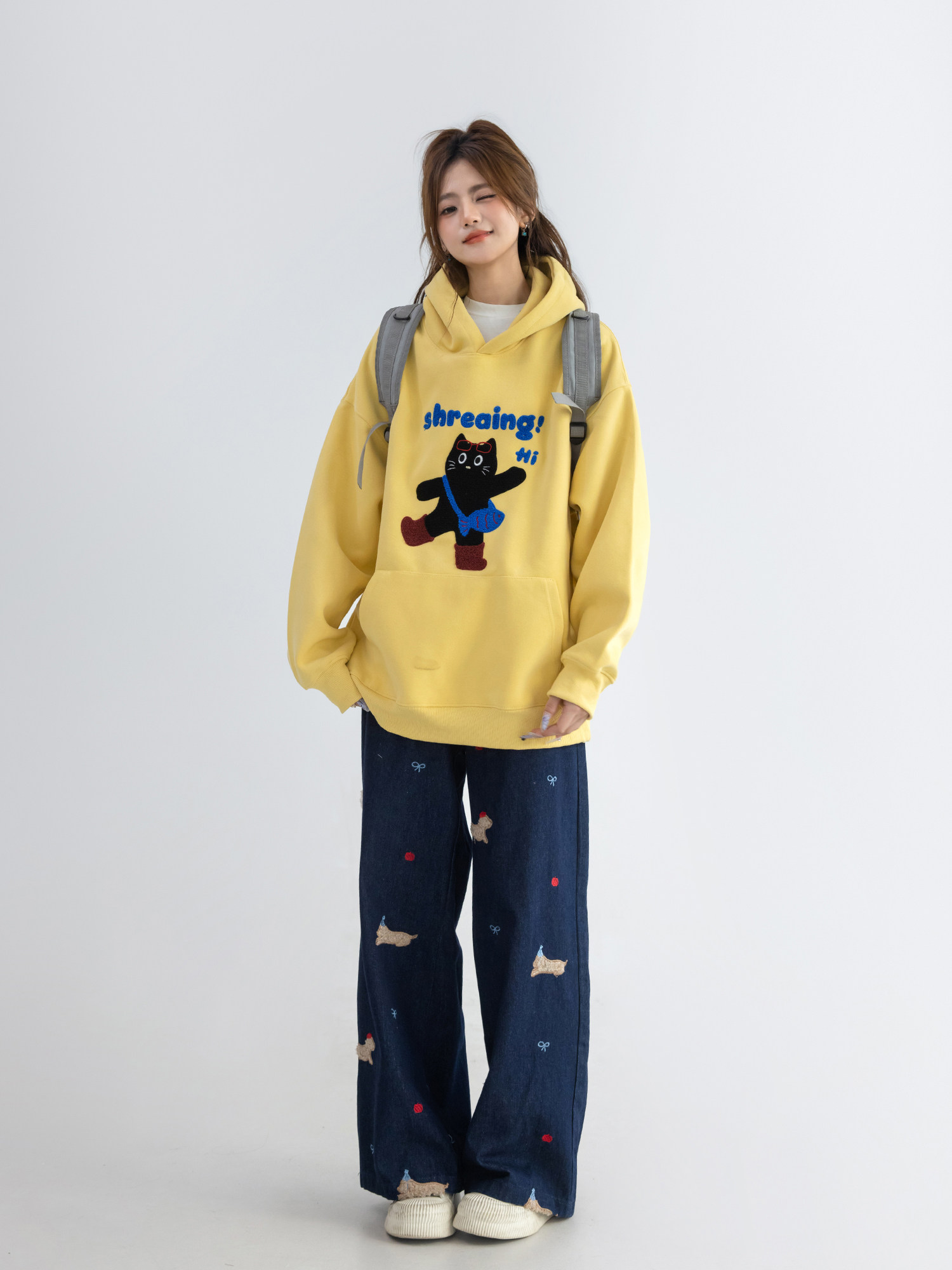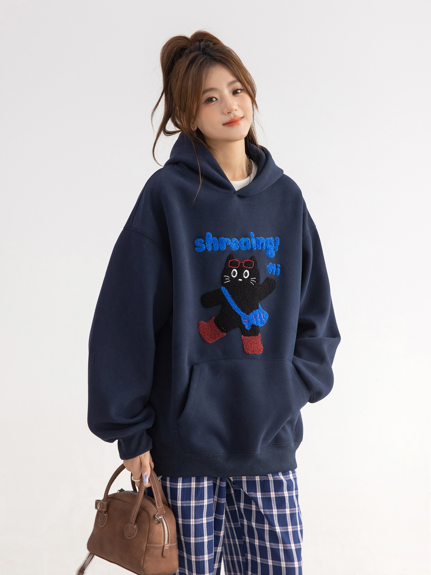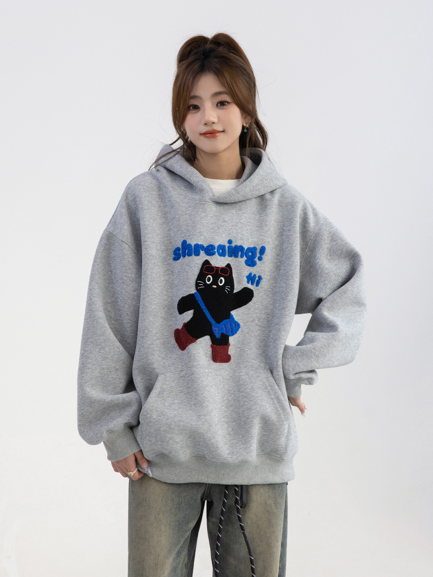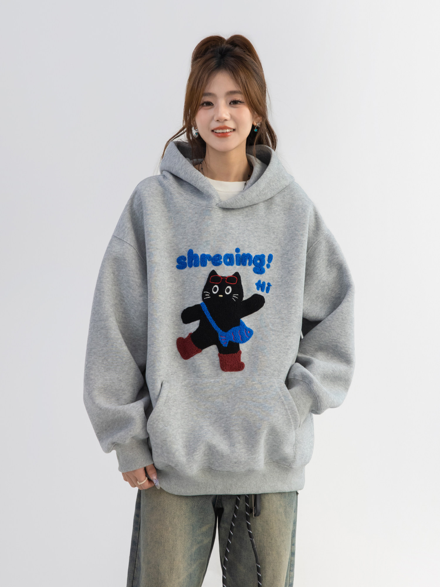 【商品名】【トップス】可愛い猫 タオル刺繍 フード付き ねこ柄 スウェット レディース ゆったり 長袖 パーカー【FCシリーズ】