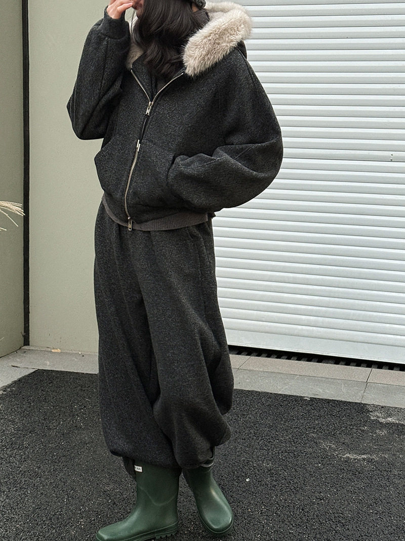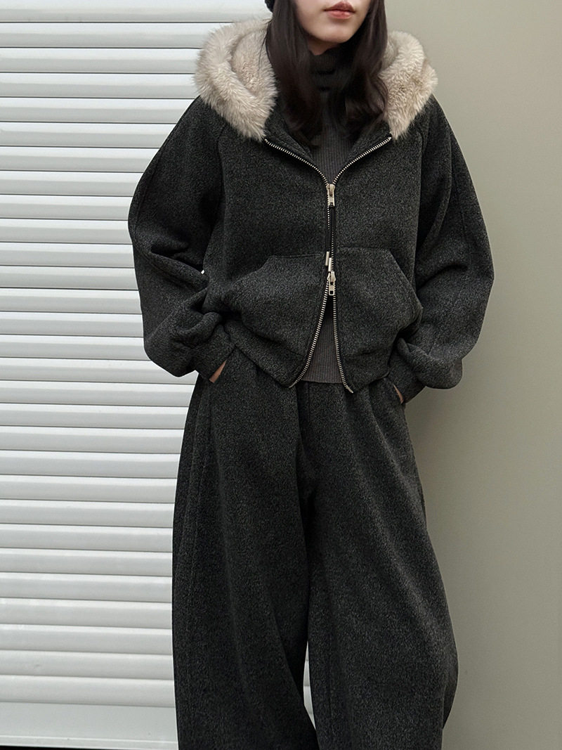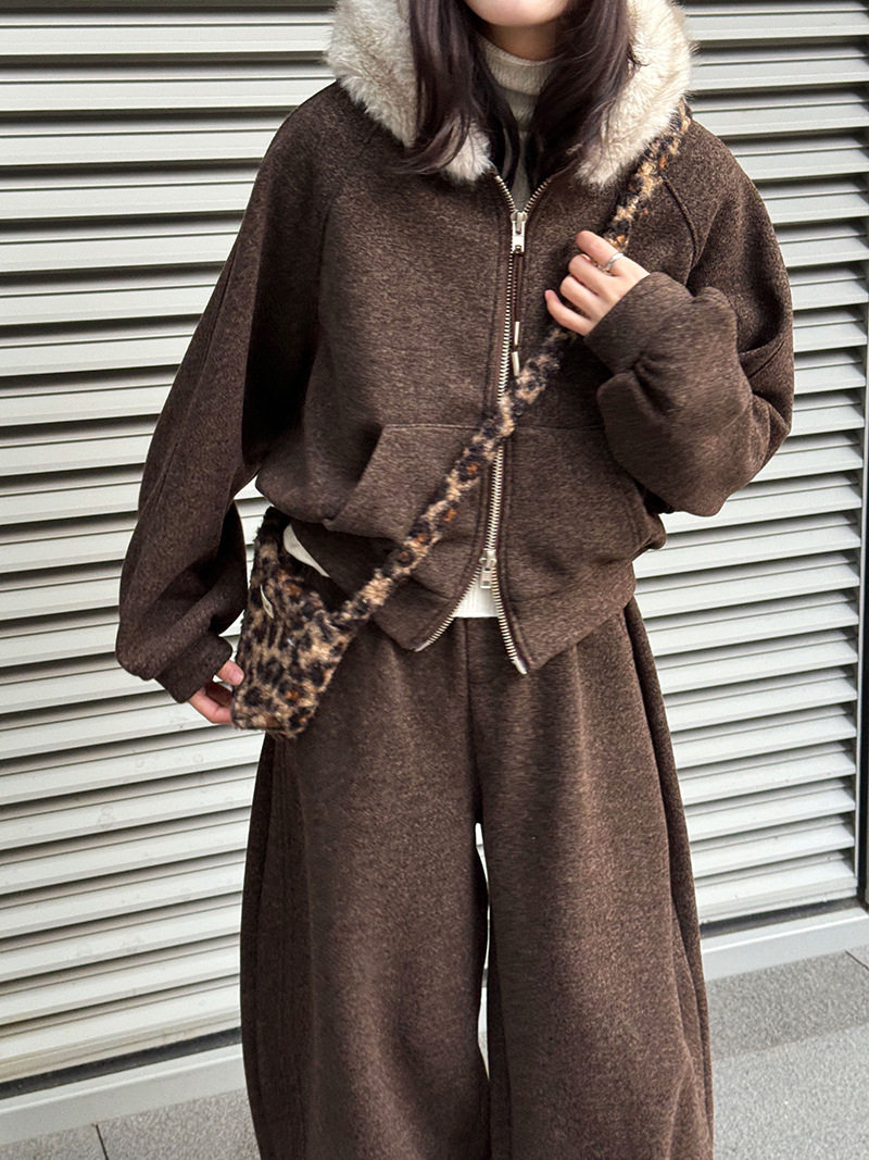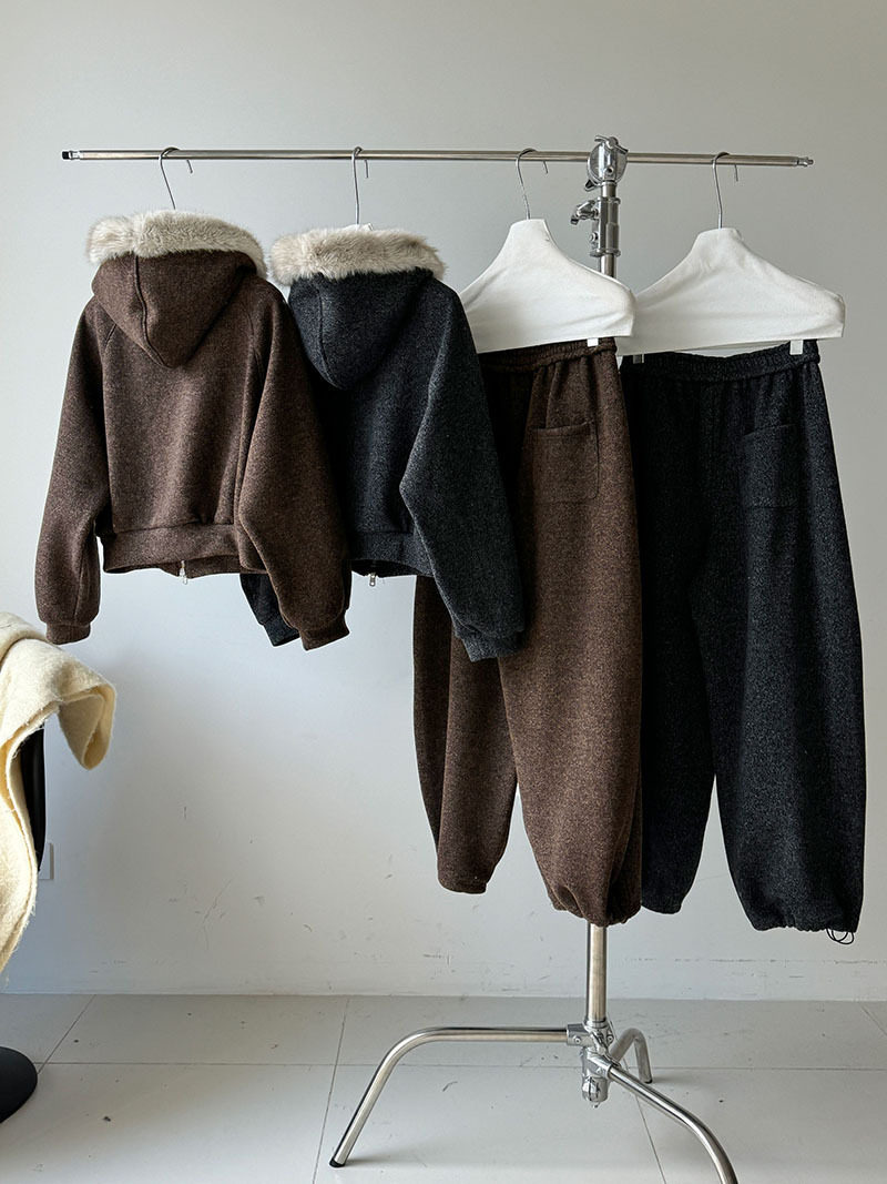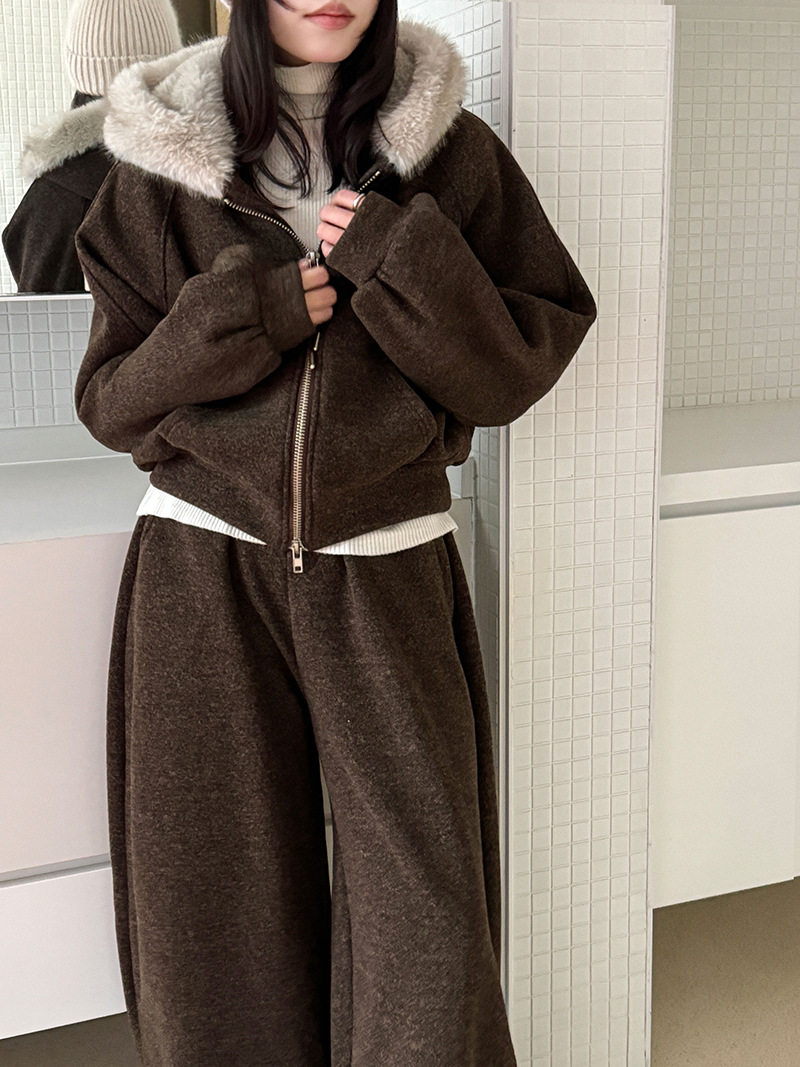【セットアップ】【単品注文】ファー襟 スウェットアウター + カーブ ワイドパンツ 2点上下セット 【JZシリーズ】