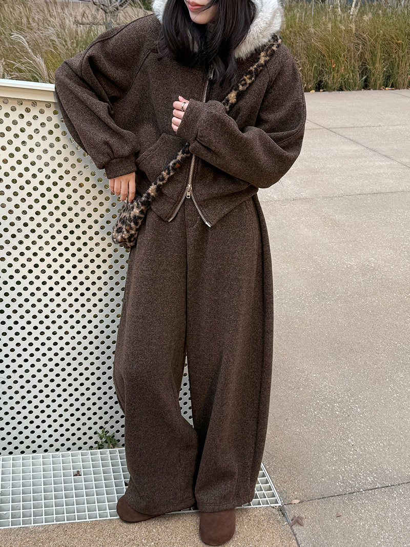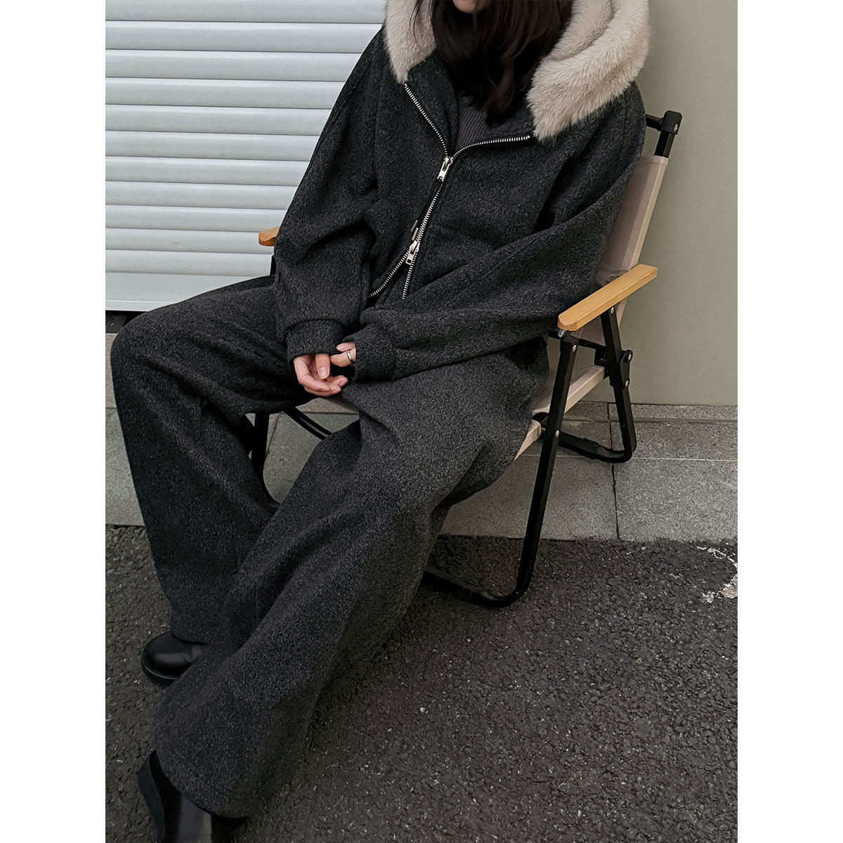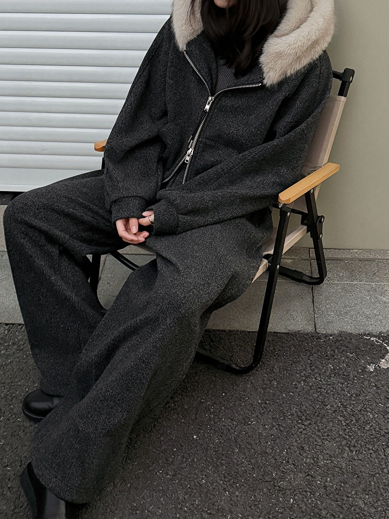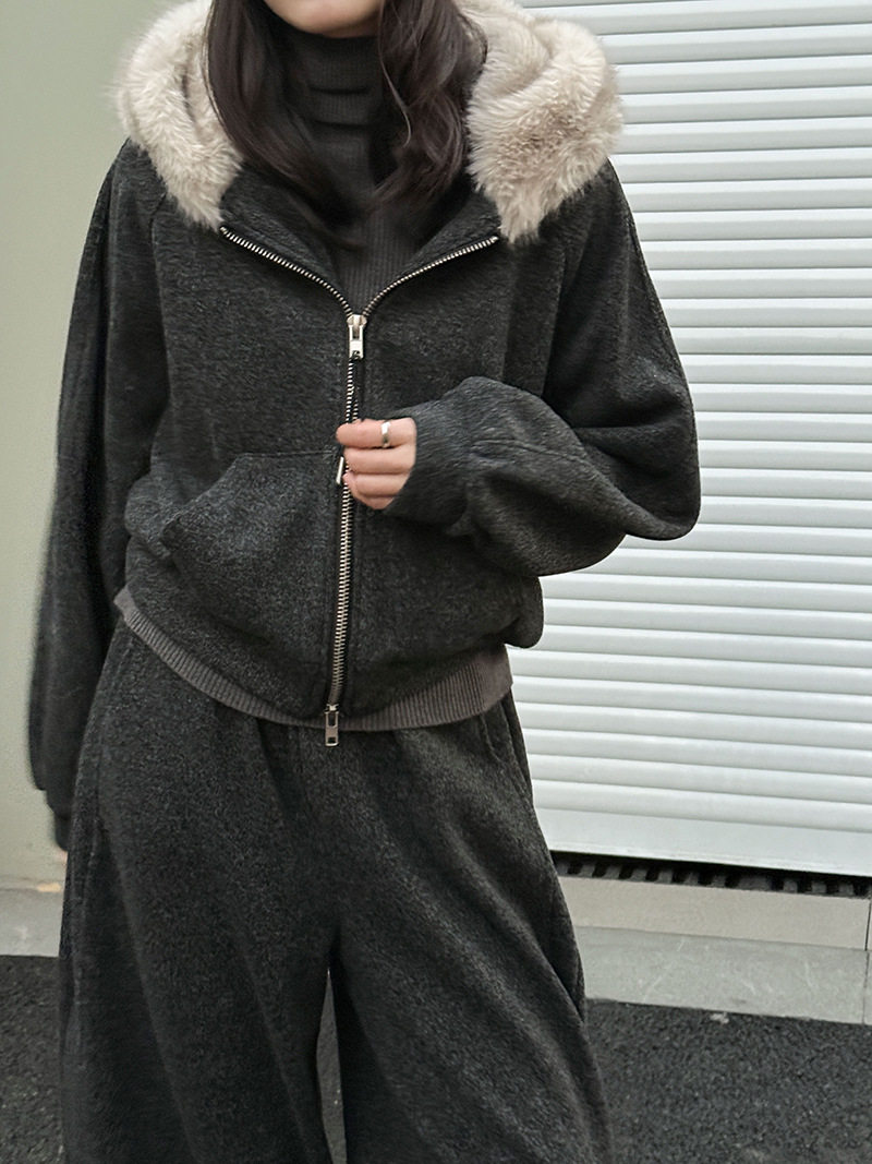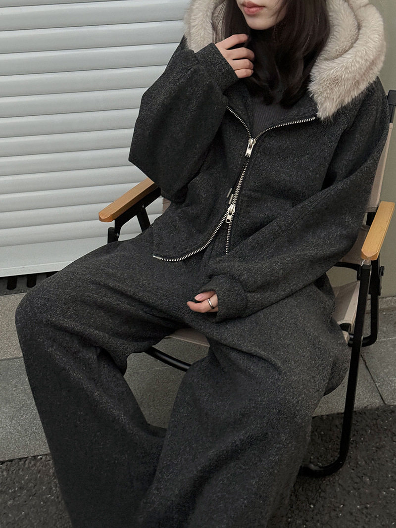 【商品名】【セットアップ】【単品注文】ファー襟 スウェットアウター + カーブ ワイドパンツ 2点上下セット 【JZシリーズ】