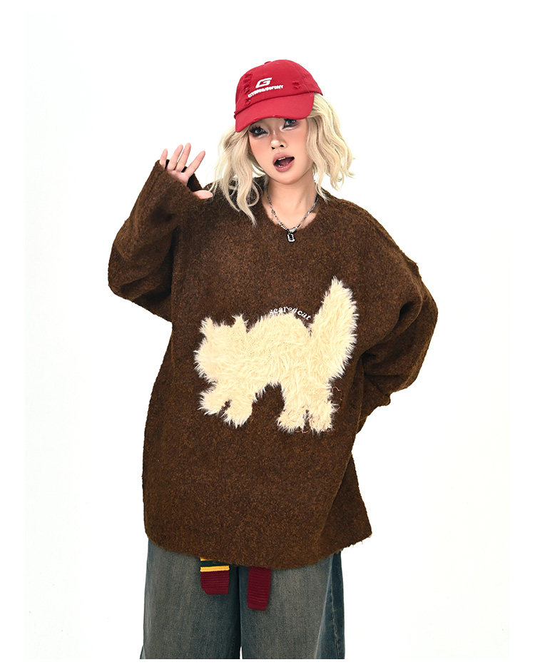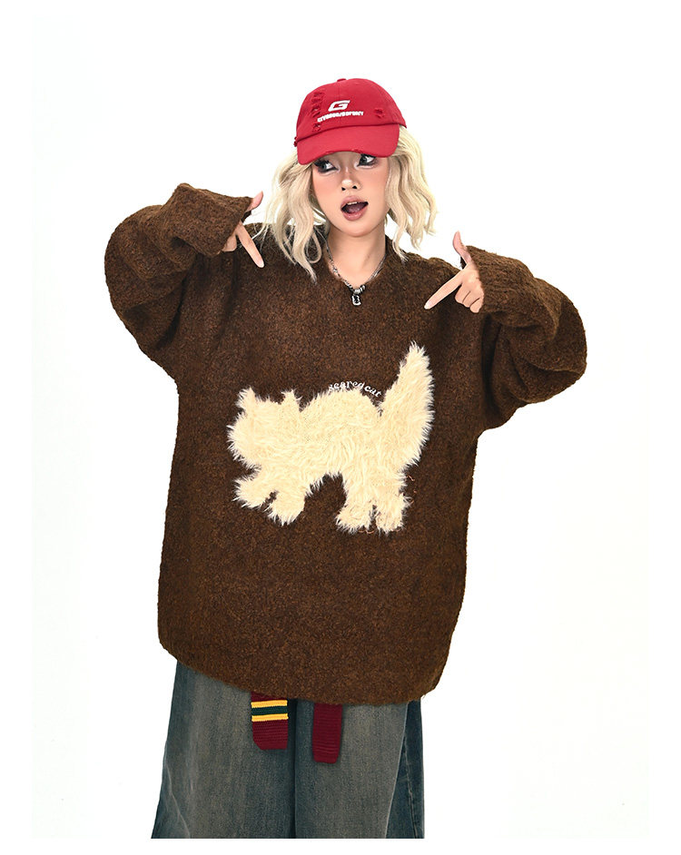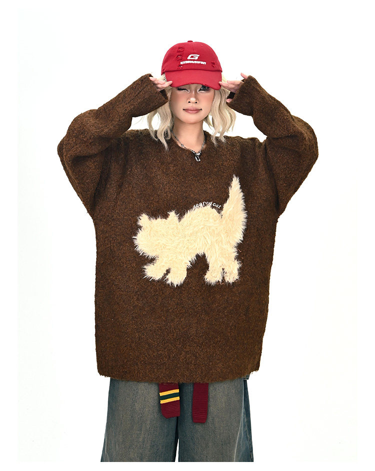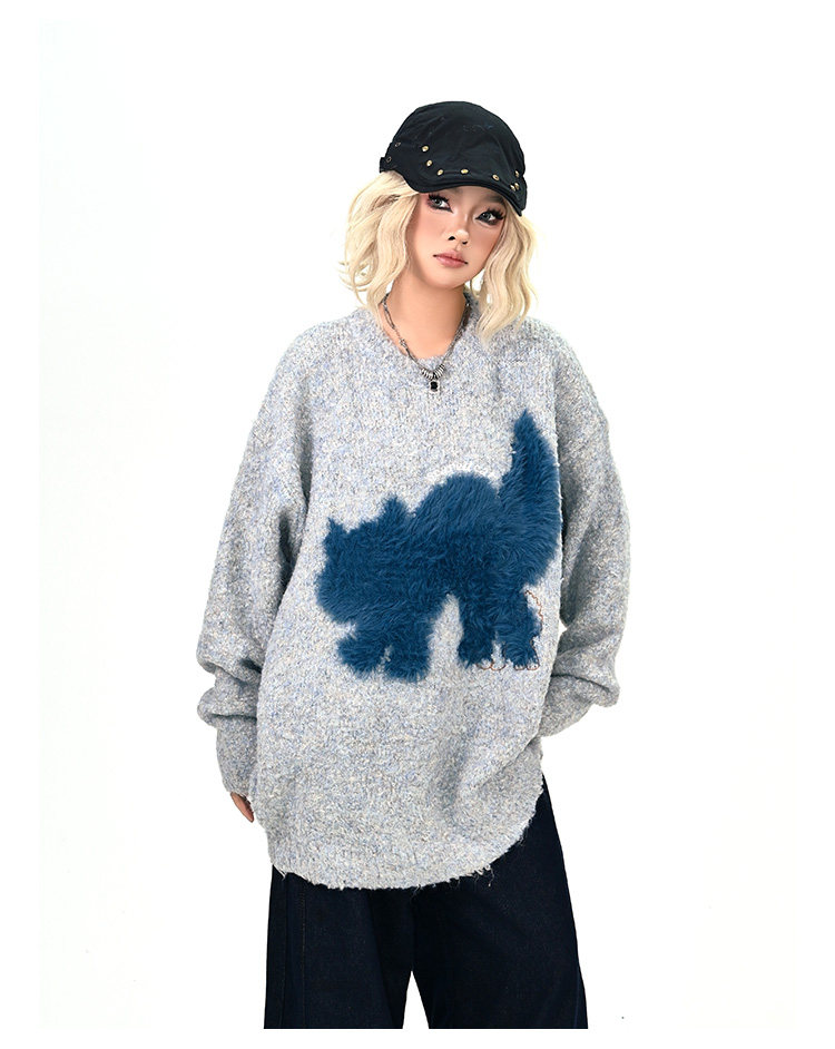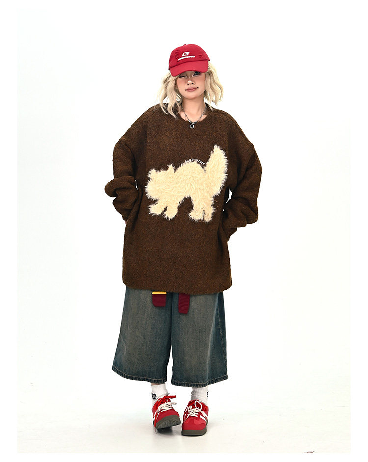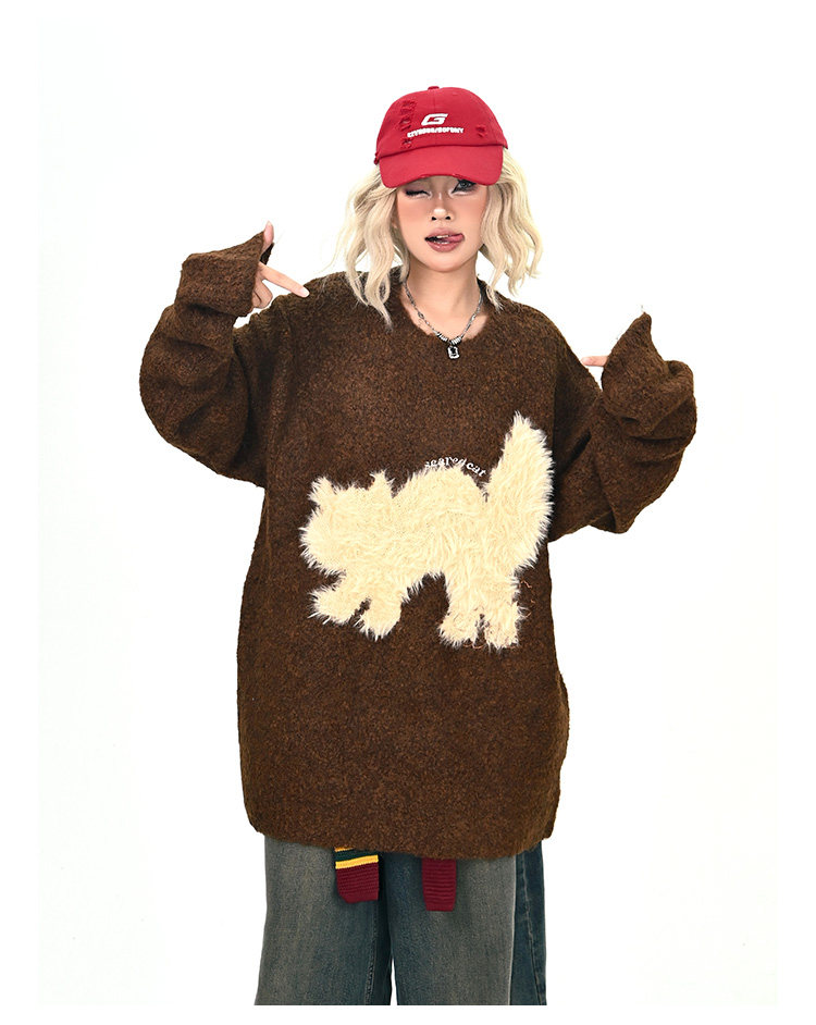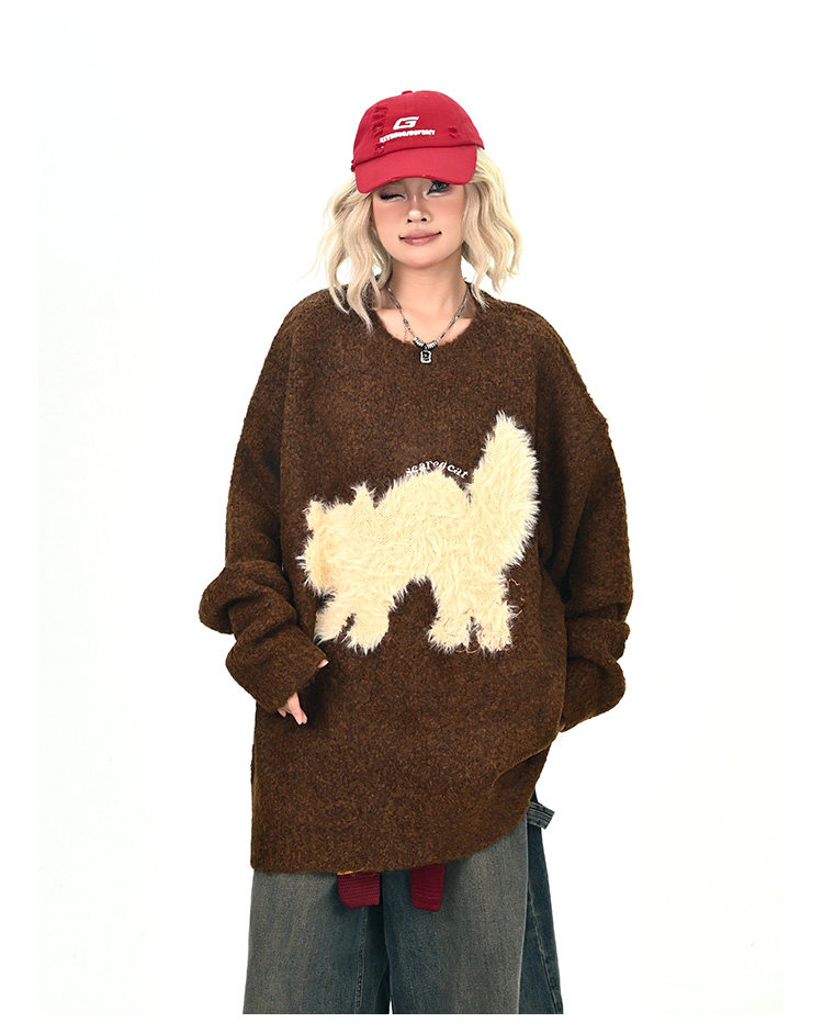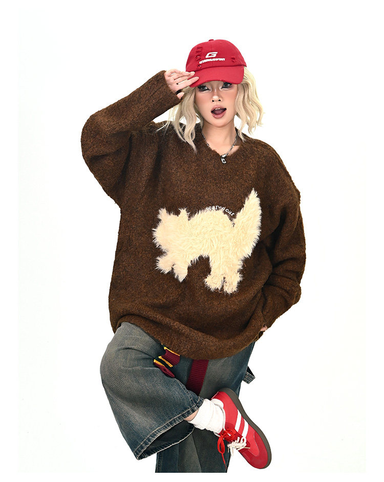 【トップス】アメリカンレトロ 猫モチーフ 猫柄 ネコ クルーネック ニット ルーズ 秋新作【FCシリーズ】