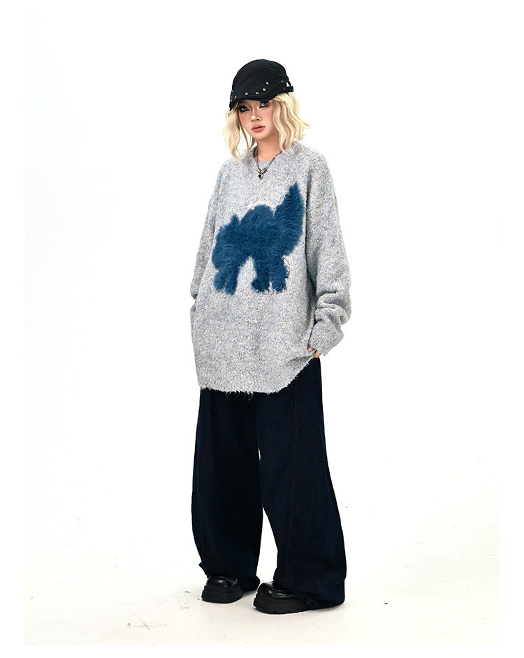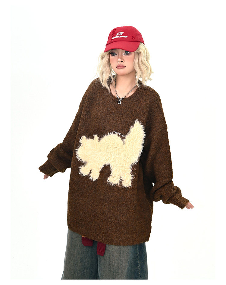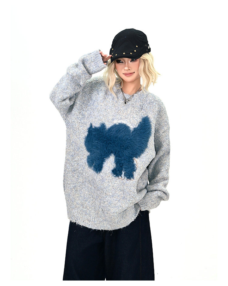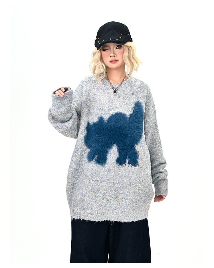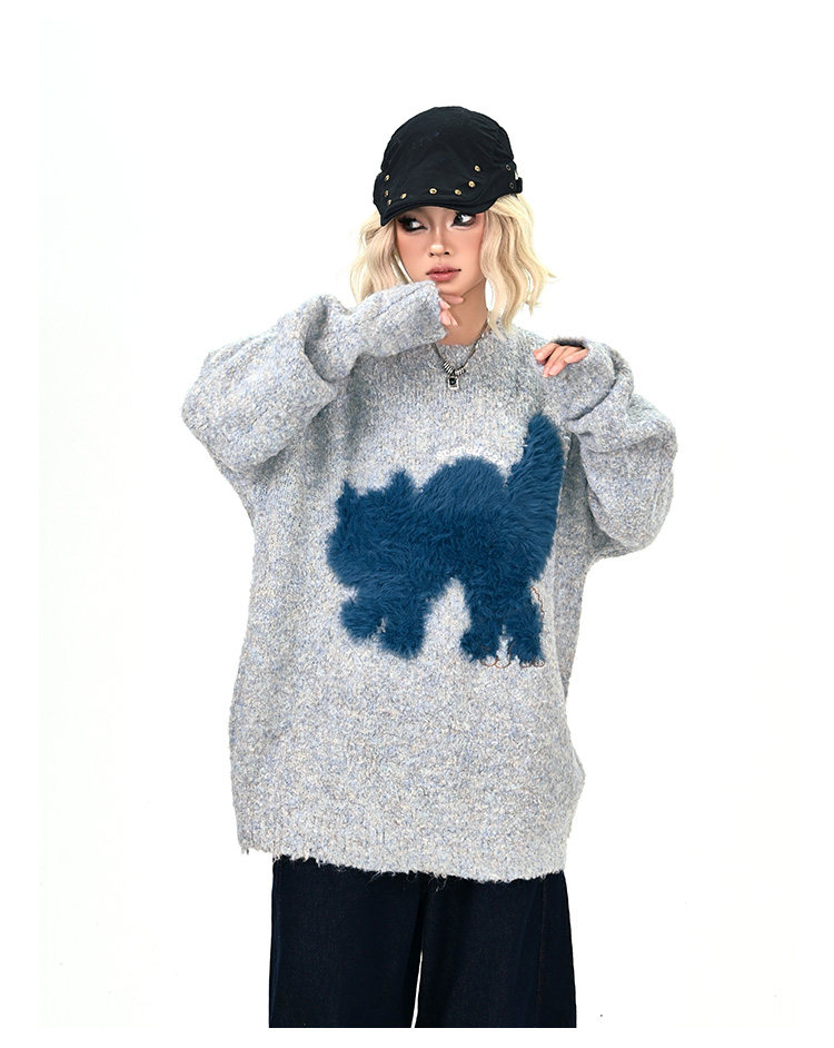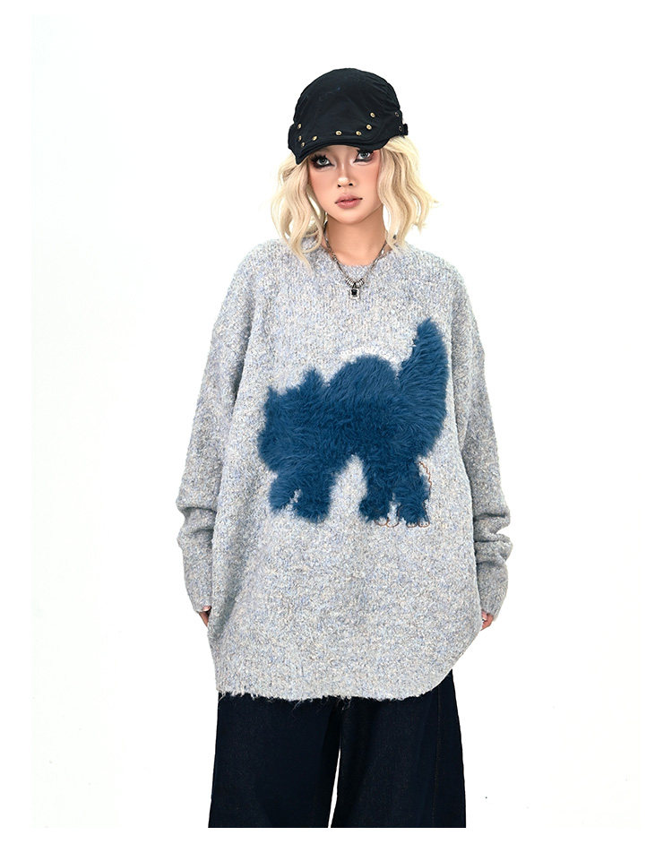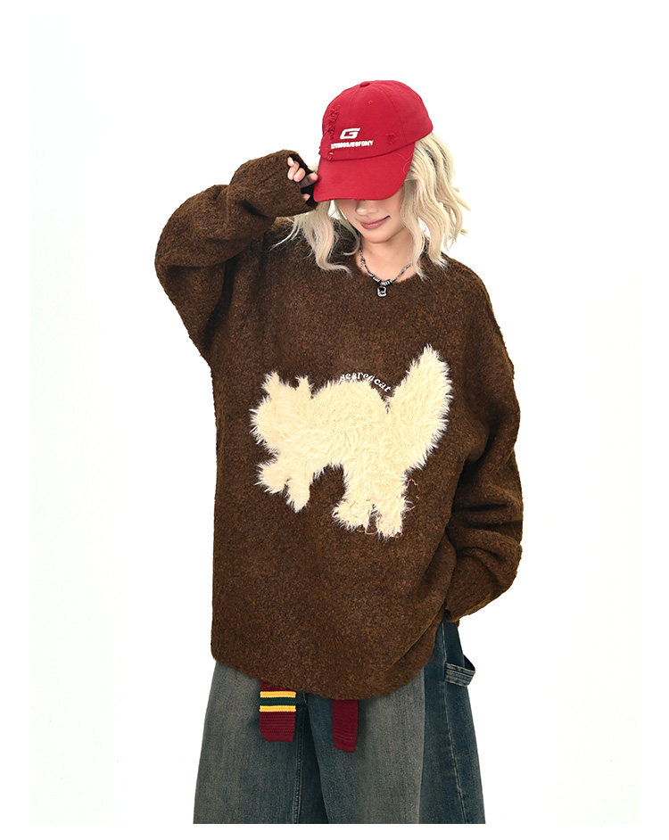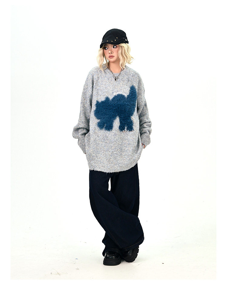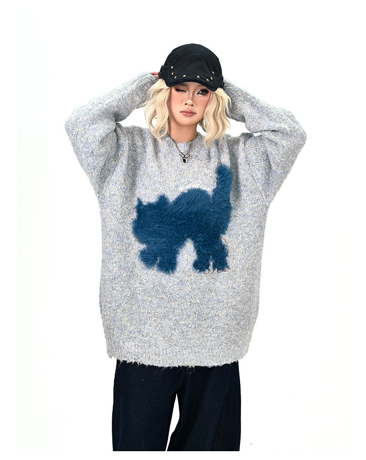 【トップス】アメリカンレトロ 猫モチーフ 猫柄 ネコ クルーネック ニット ルーズ 秋新作【FCシリーズ】