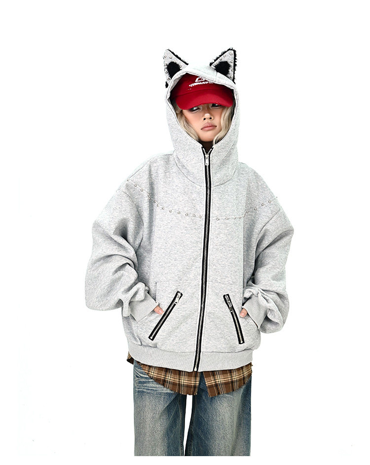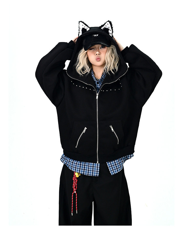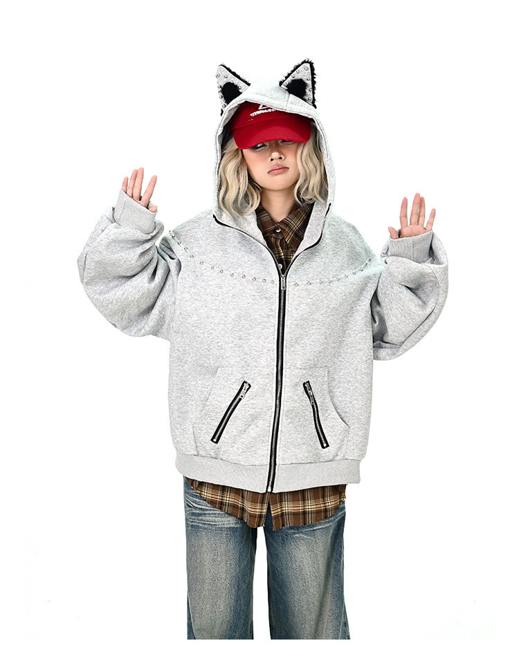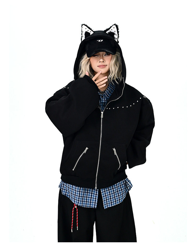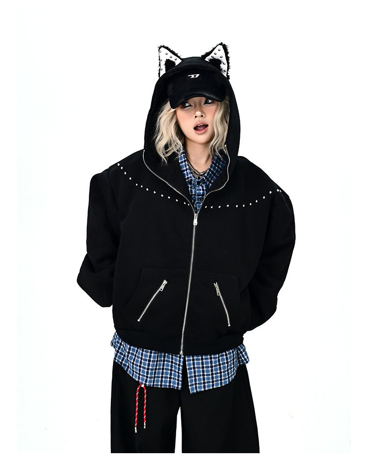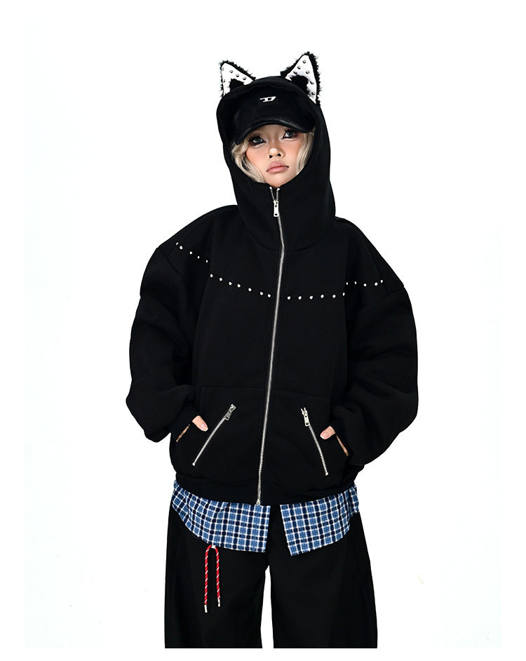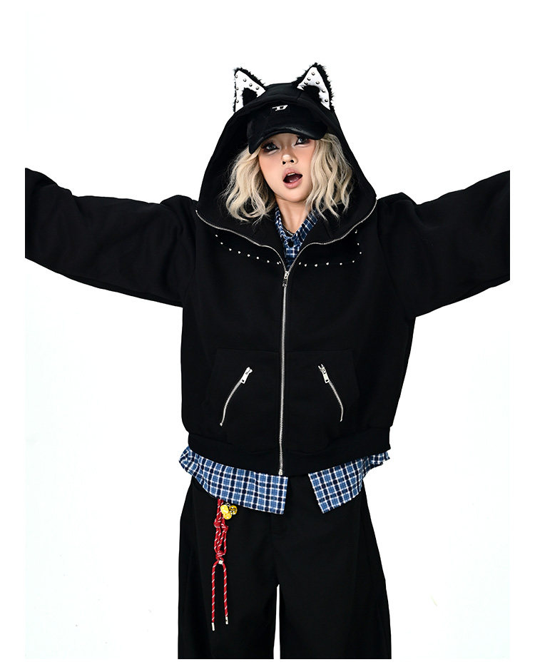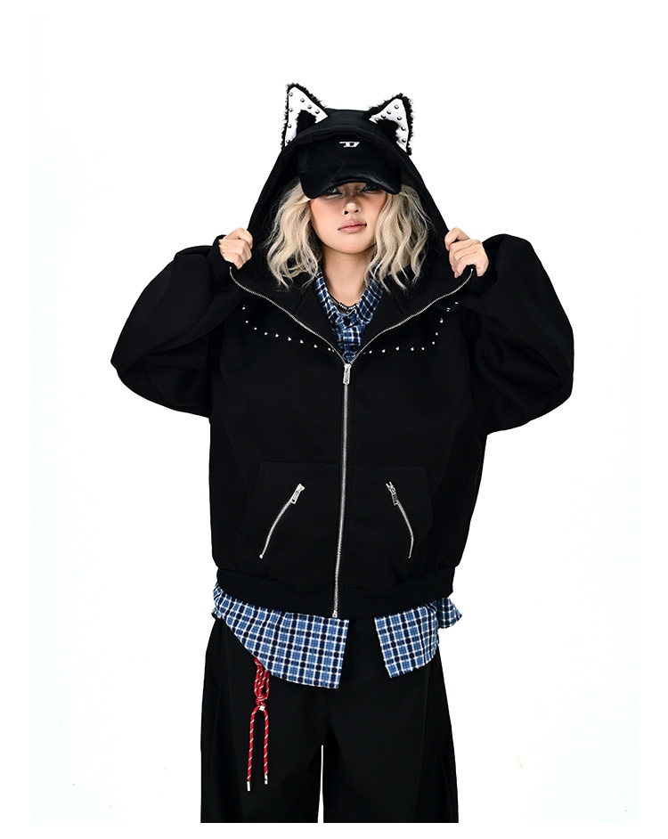 【アウター】スタッズ付き 猫耳 フードジップアップ レディース ゆったりBF風 学院風 ジャケット【FCシリーズ】