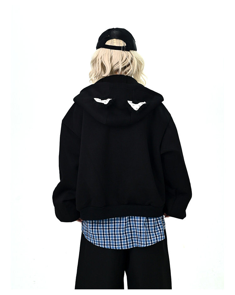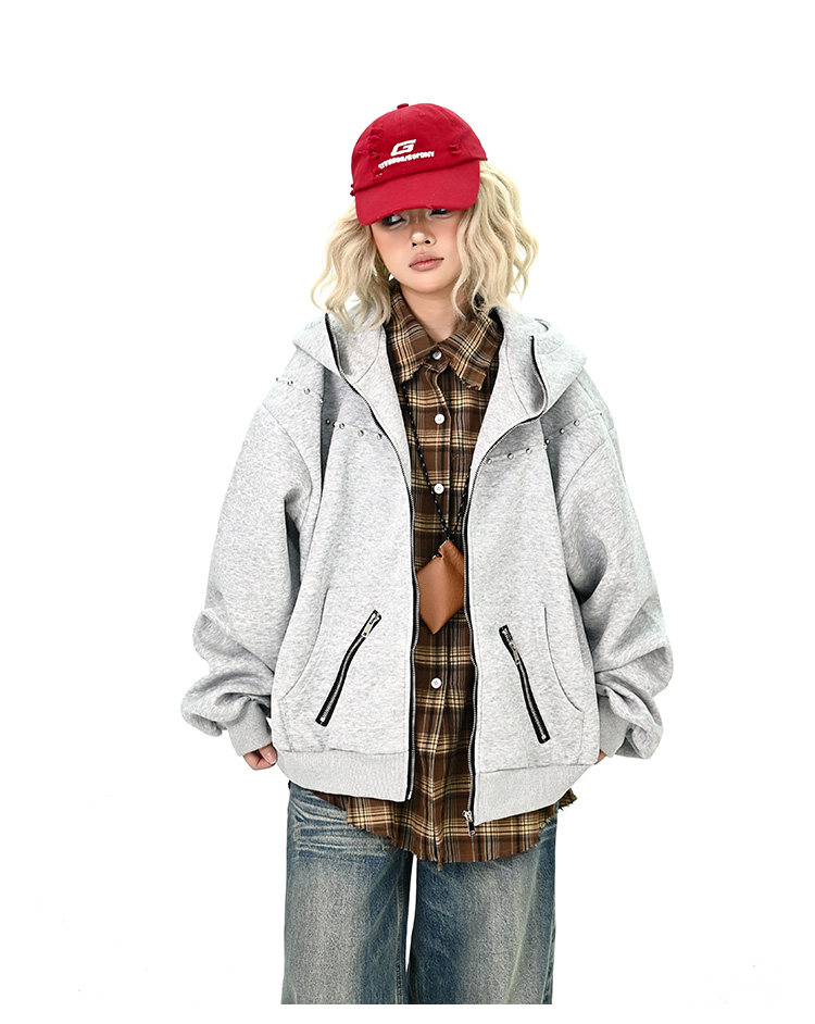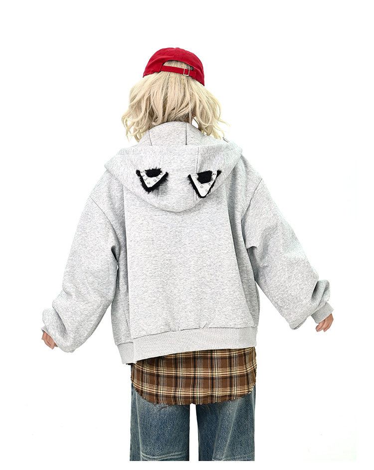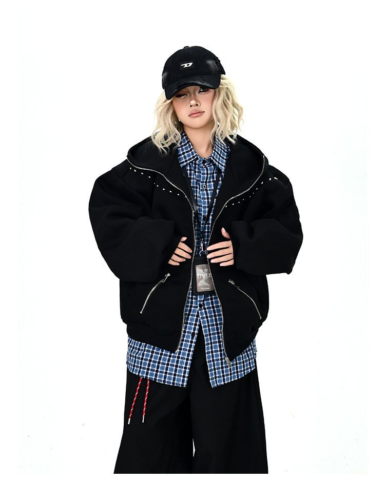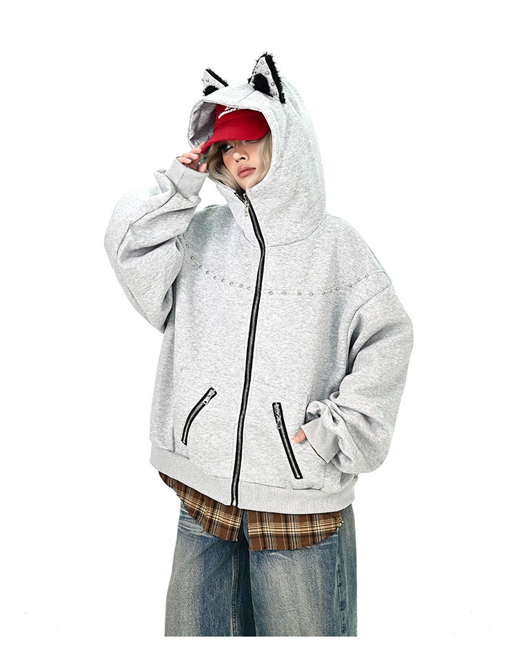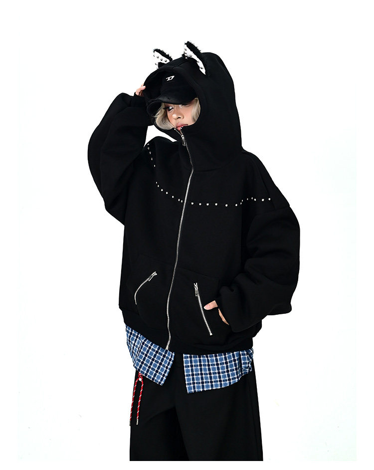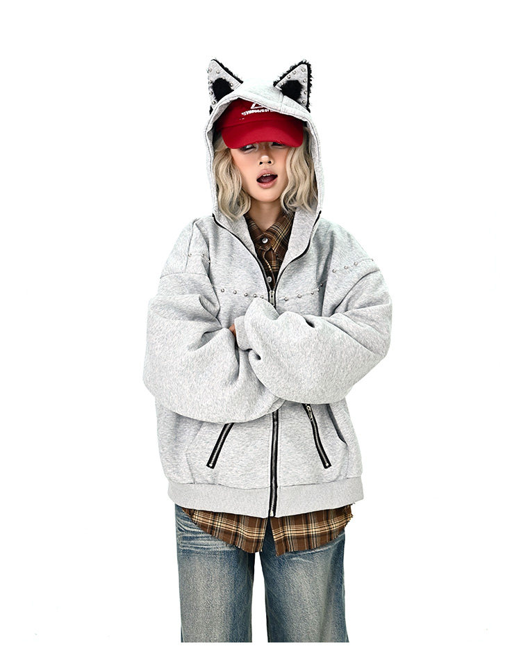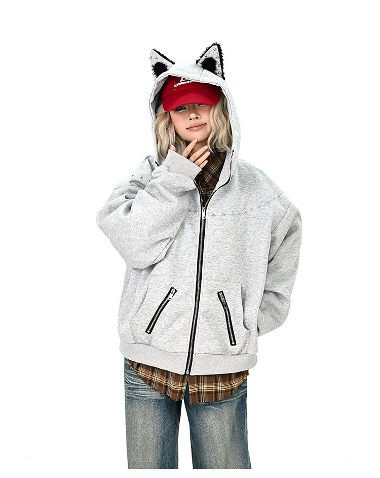 【アウター】スタッズ付き 猫耳 フードジップアップ レディース ゆったりBF風 学院風 ジャケット【FCシリーズ】