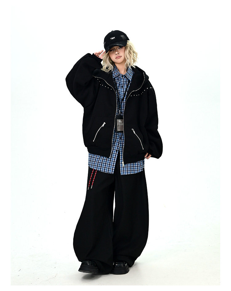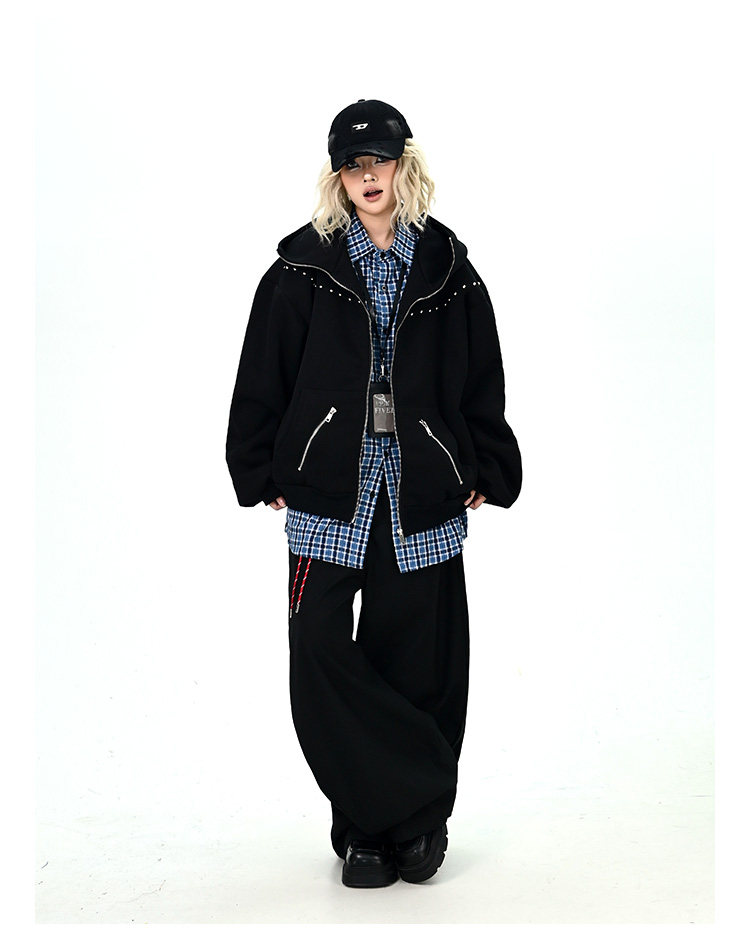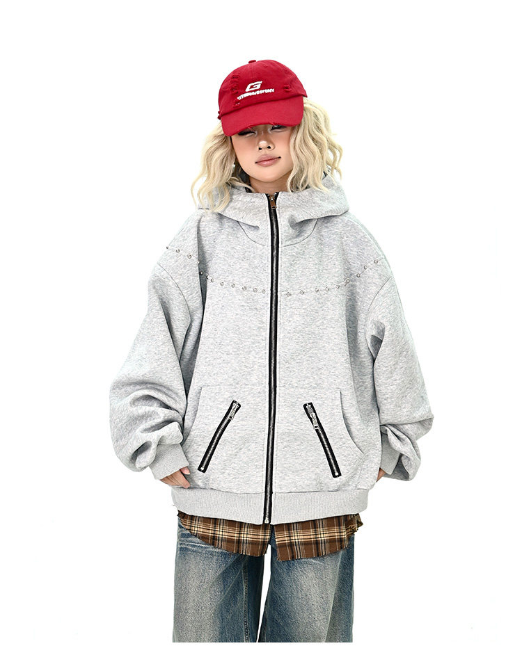 【商品名】【アウター】スタッズ付き 猫耳 フードジップアップ レディース ゆったりBF風 学院風 ジャケット【FCシリーズ】
