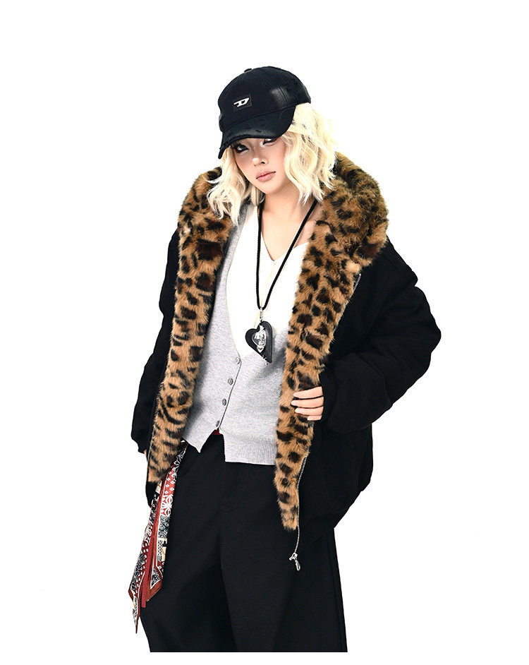 【商品名】【アウター】レオパード柄ファー襟 猫耳フード中綿ジャケット 冬新作 ゆったりBF風 綿入れコート【FCシリーズ】
