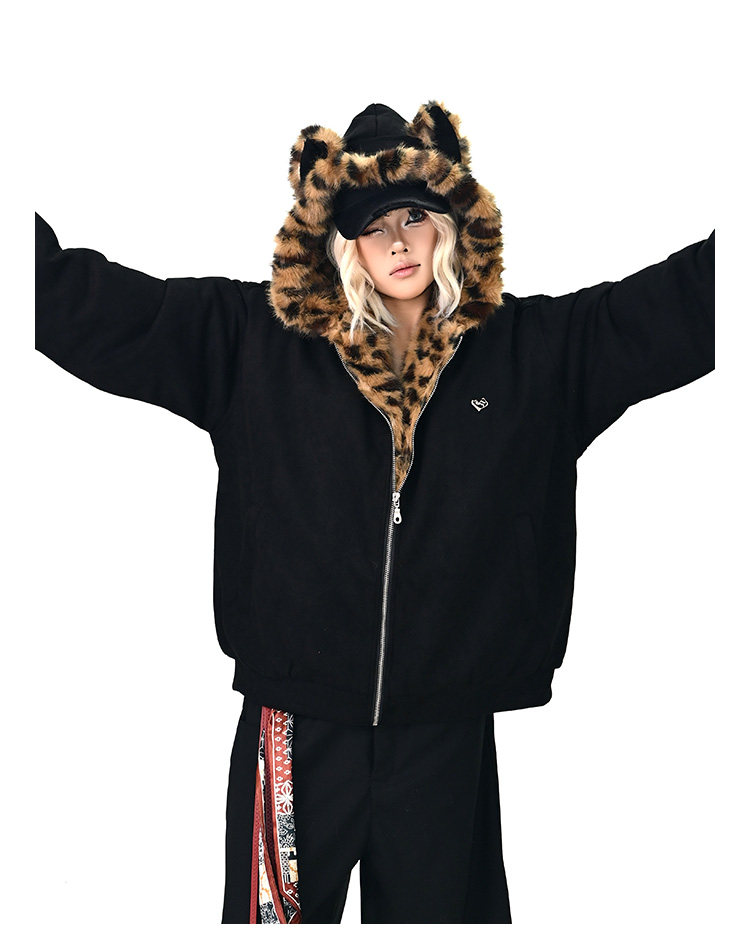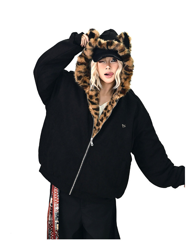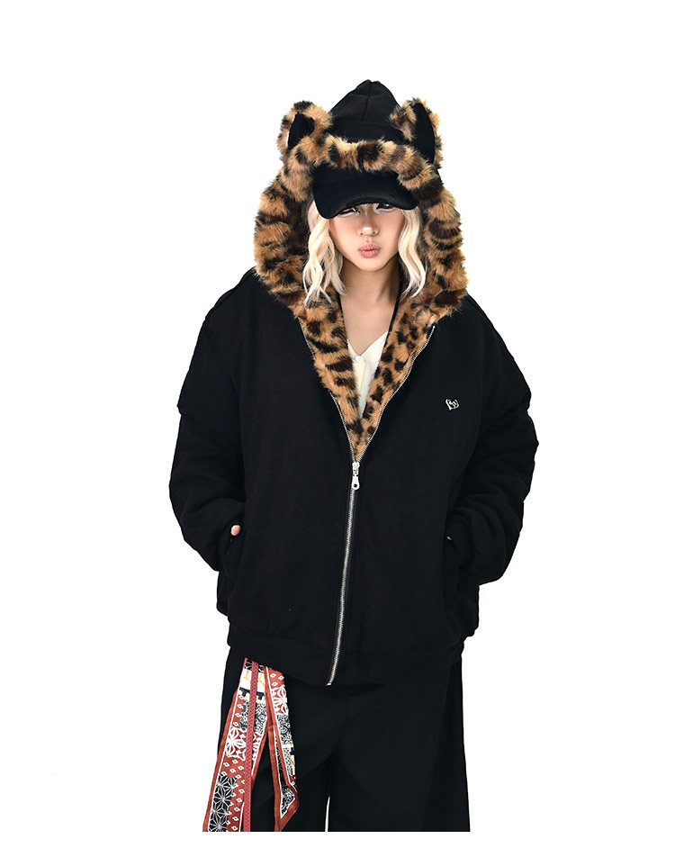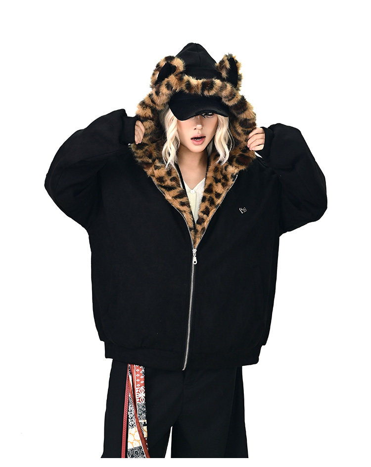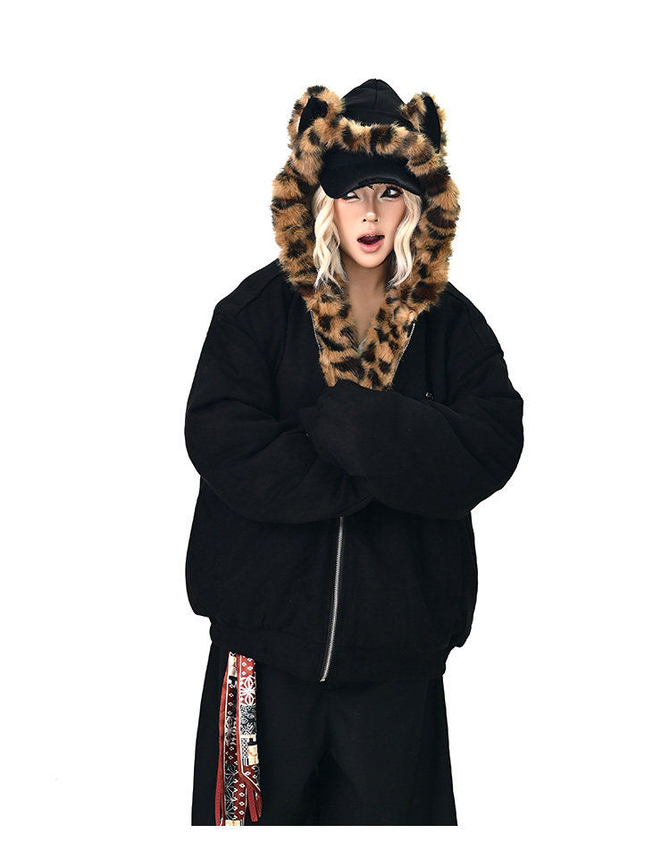 【アウター】レオパード柄ファー襟 猫耳フード中綿ジャケット 冬新作 ゆったりBF風 綿入れコート【FCシリーズ】