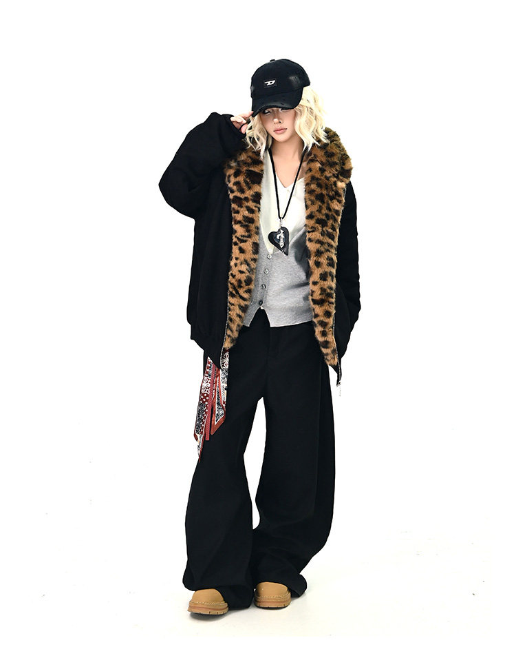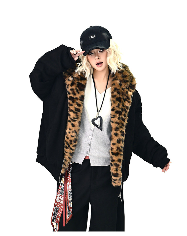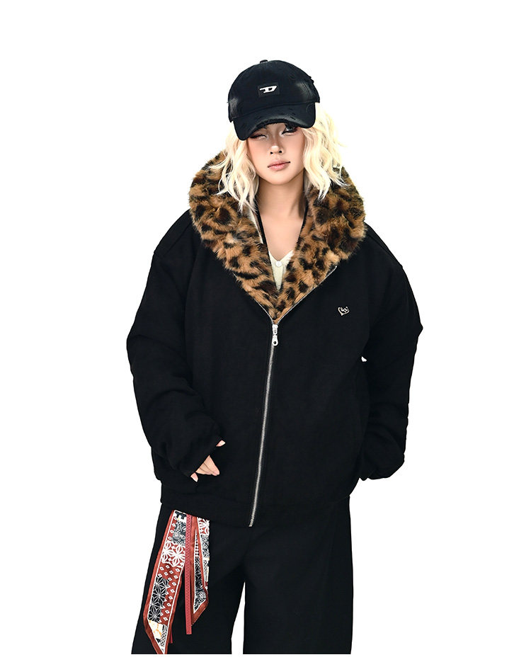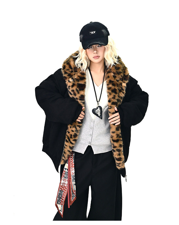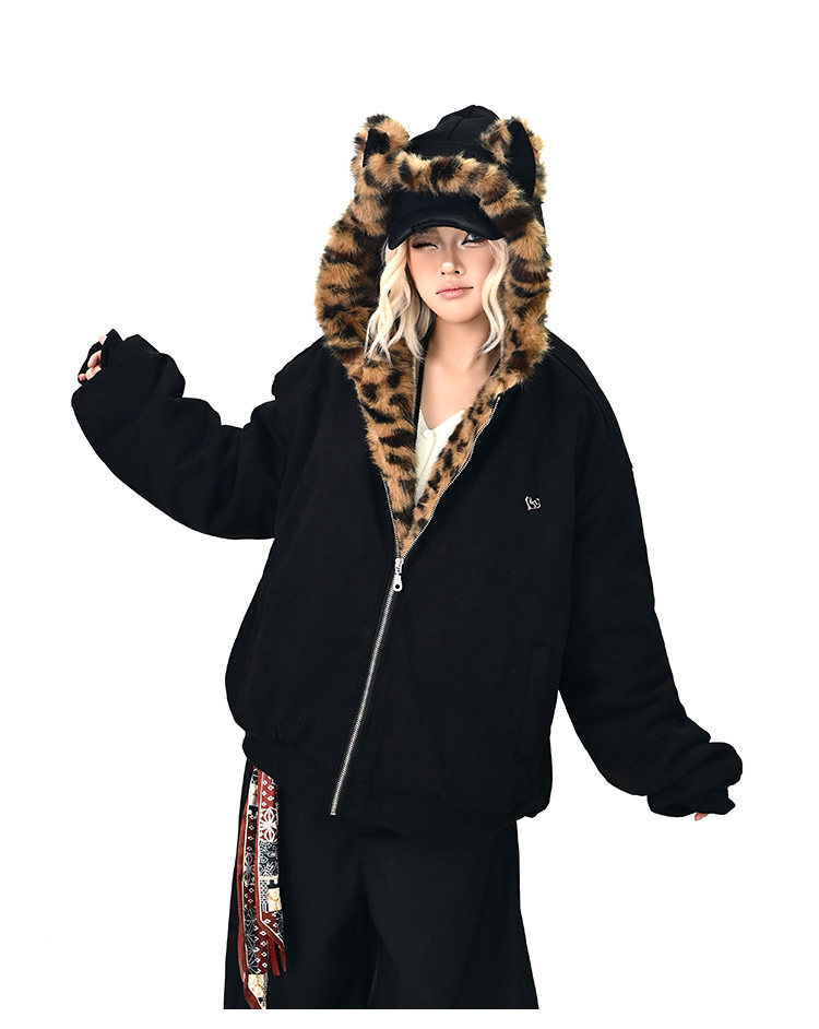 【アウター】レオパード柄ファー襟 猫耳フード中綿ジャケット 冬新作 ゆったりBF風 綿入れコート【FCシリーズ】
