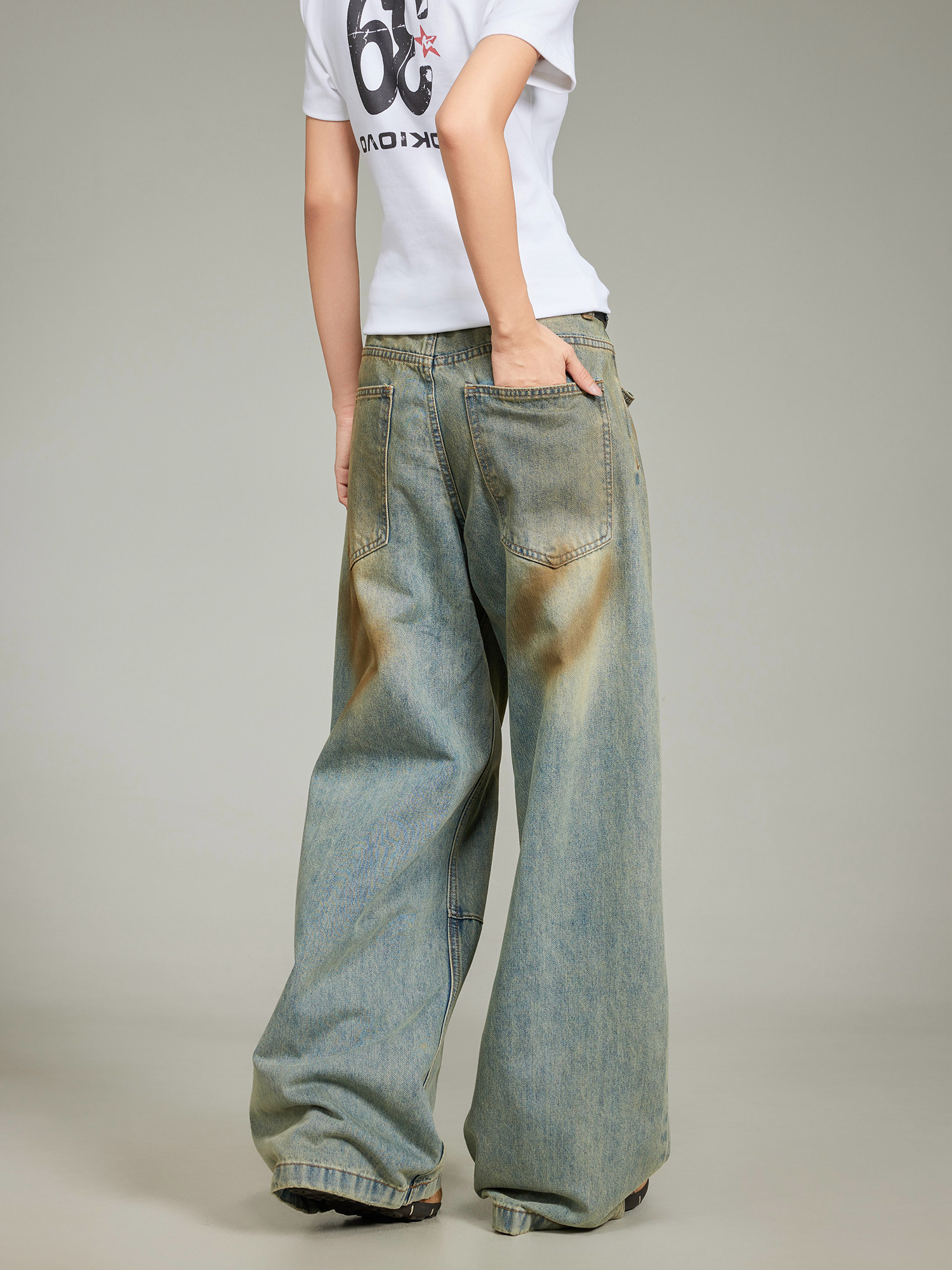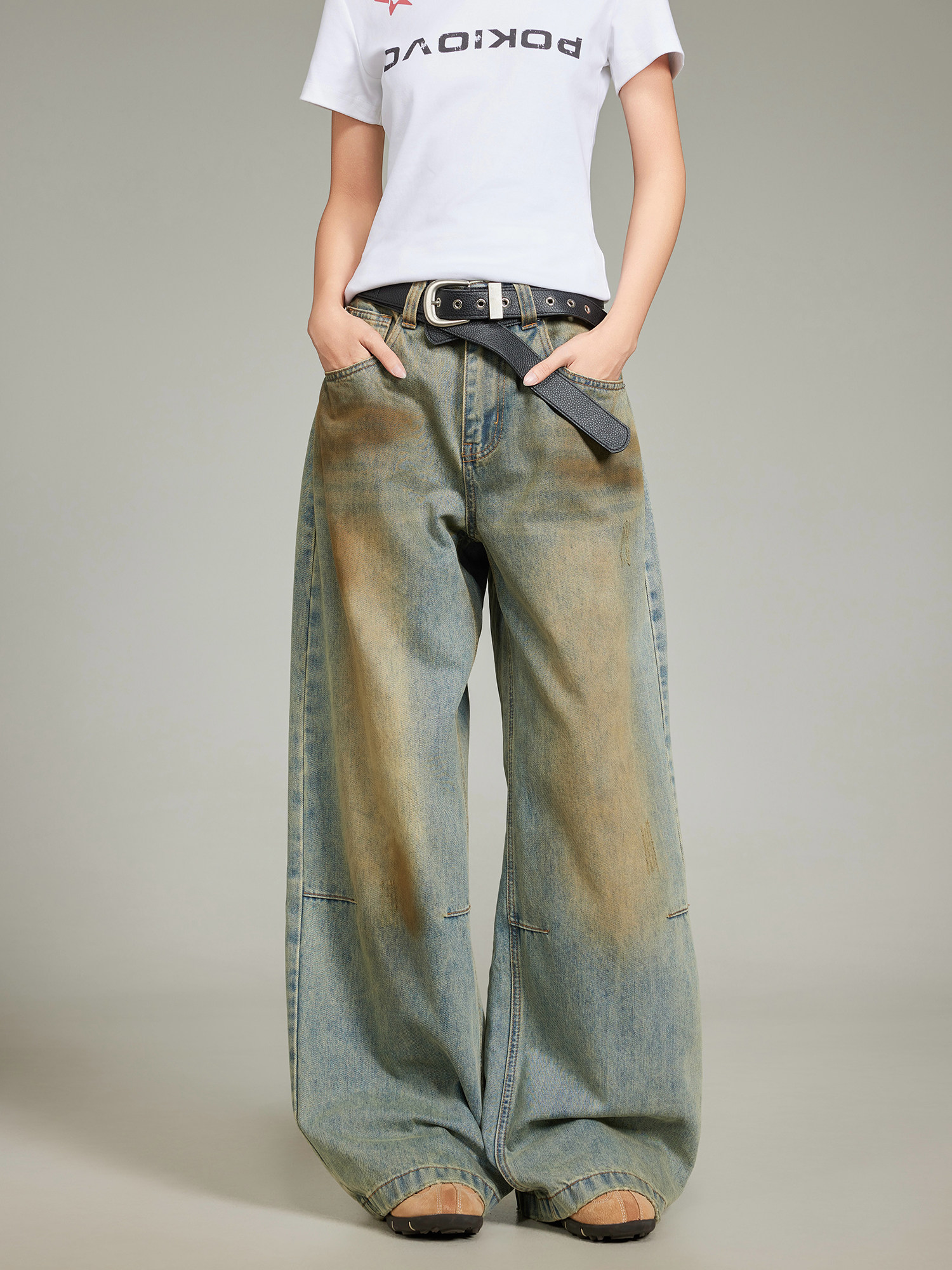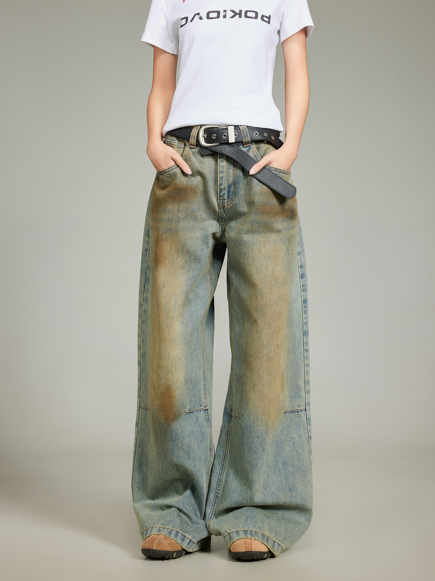 【ボトムス】ウォッシュ加工 ペイントデザイン ストレート デニムパンツ 男女兼用 アメリカンヴィンテージ【FCシリーズ】