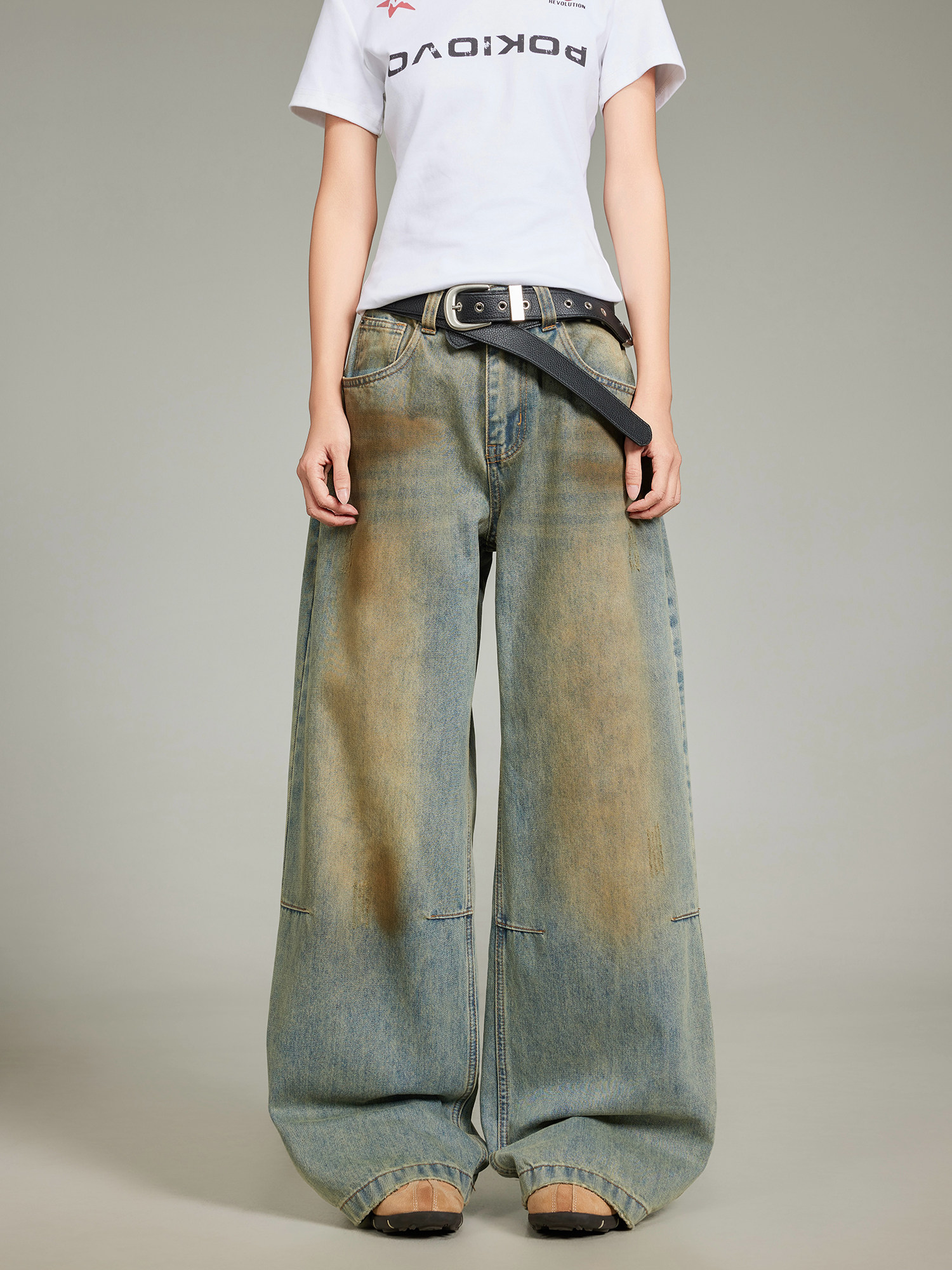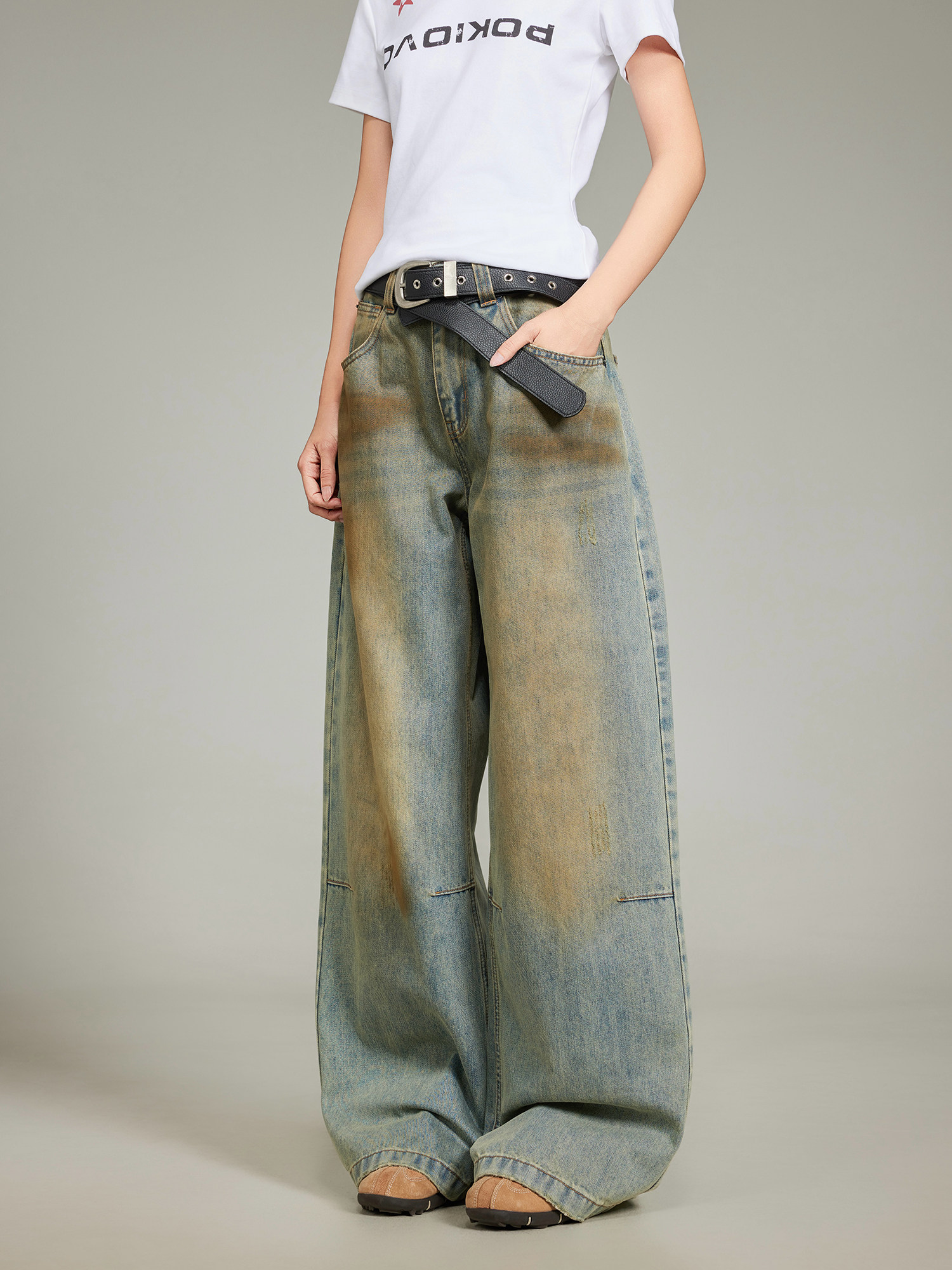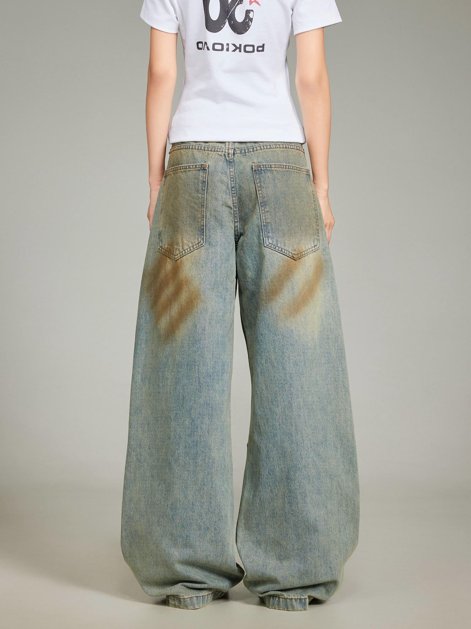 【ボトムス】ウォッシュ加工 ペイントデザイン ストレート デニムパンツ 男女兼用 アメリカンヴィンテージ【FCシリーズ】
