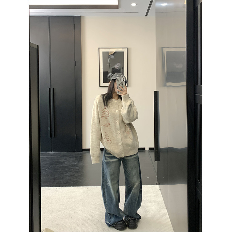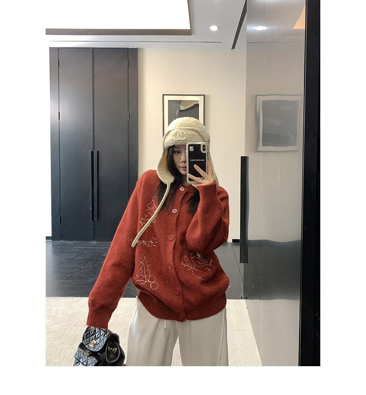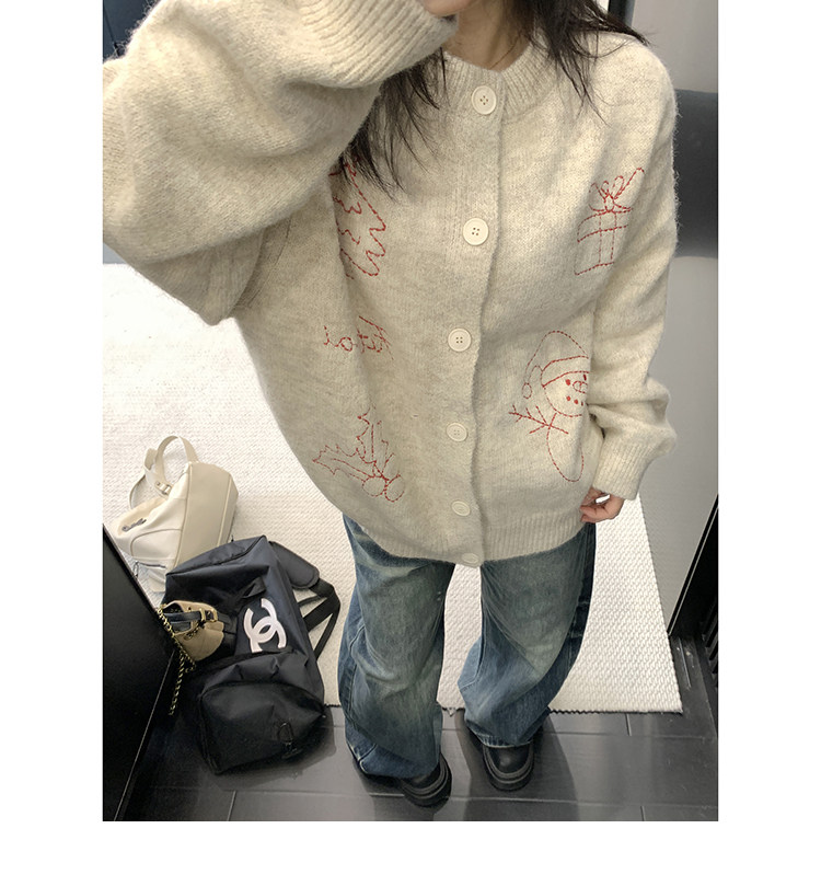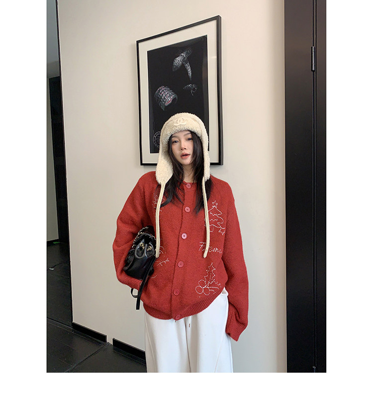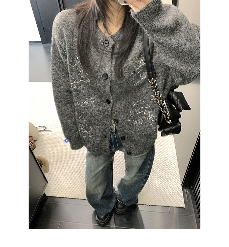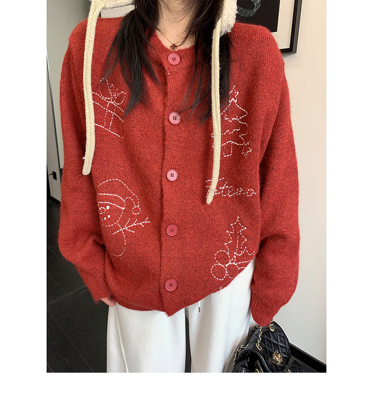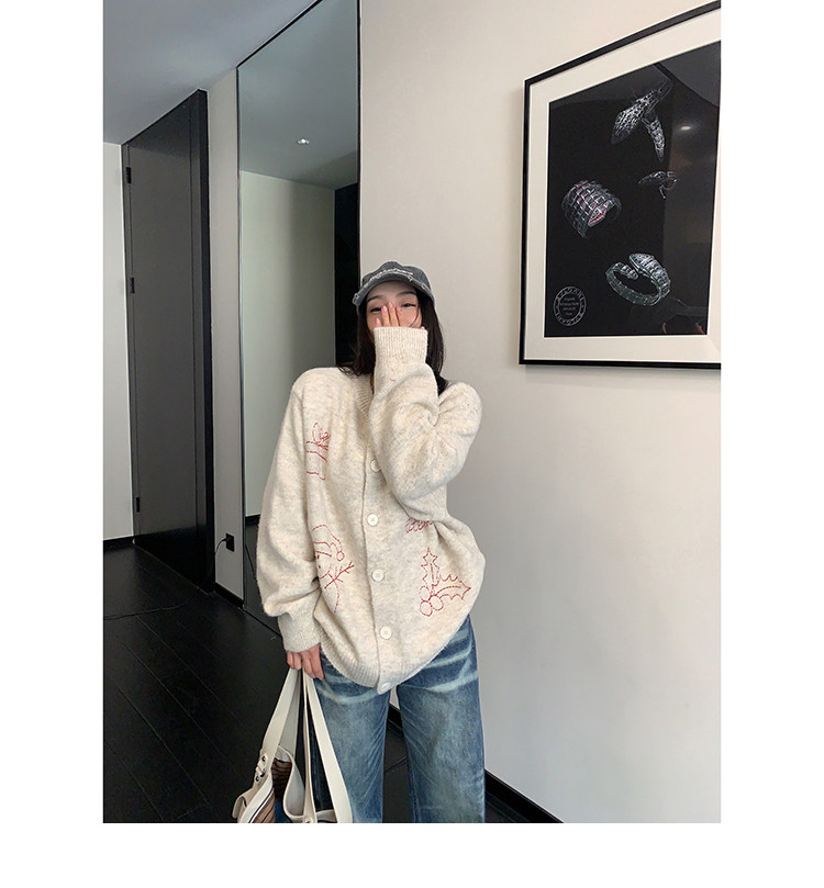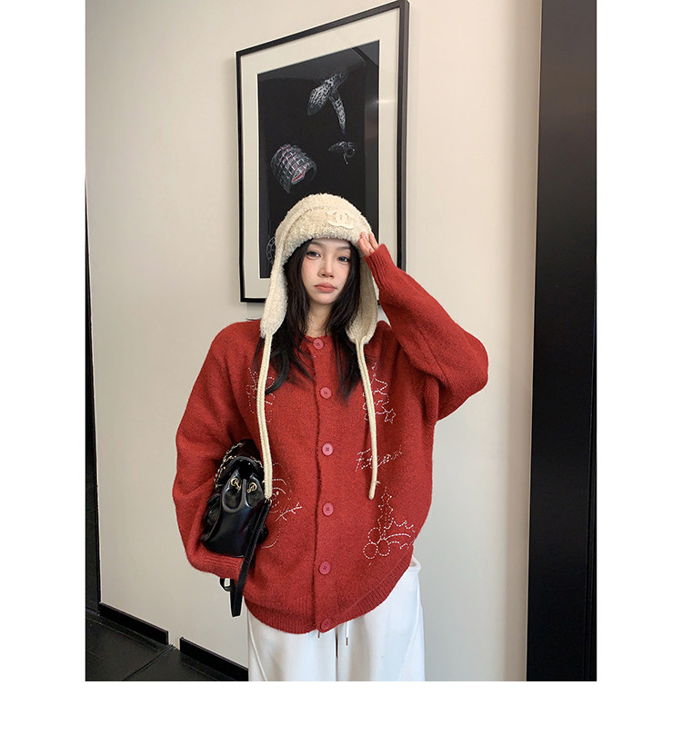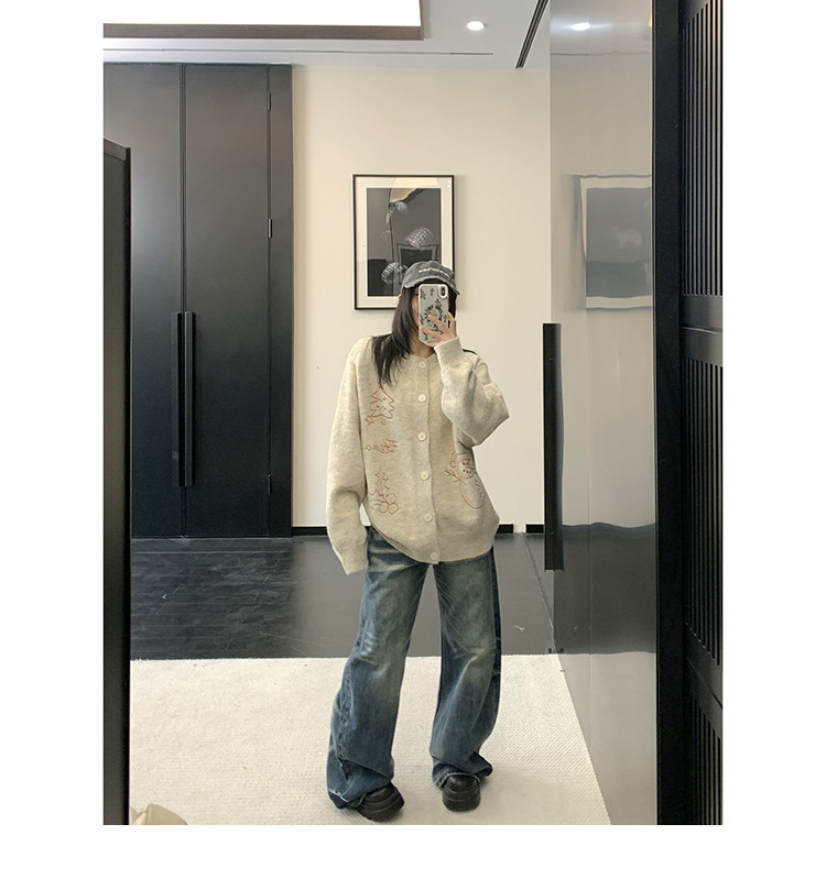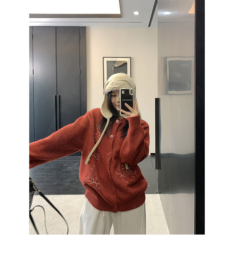 【アウター】レトロ 刺繍 厚手 ラウンドネック カーディガン ニットセーター【FCシリーズ】