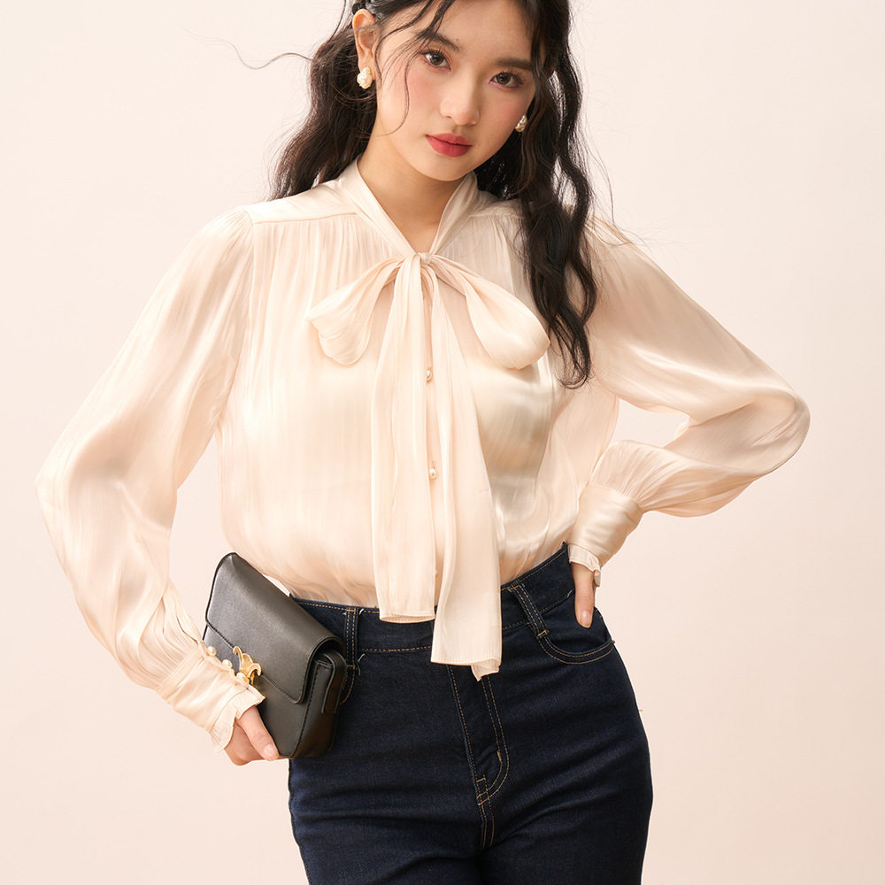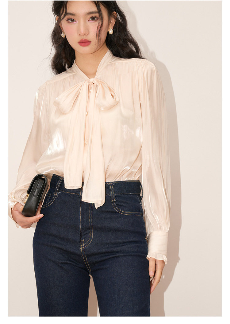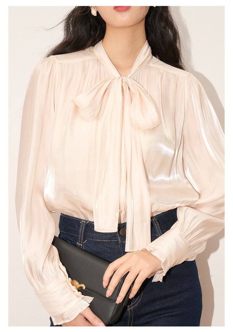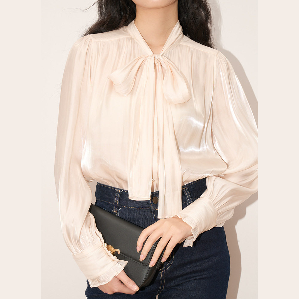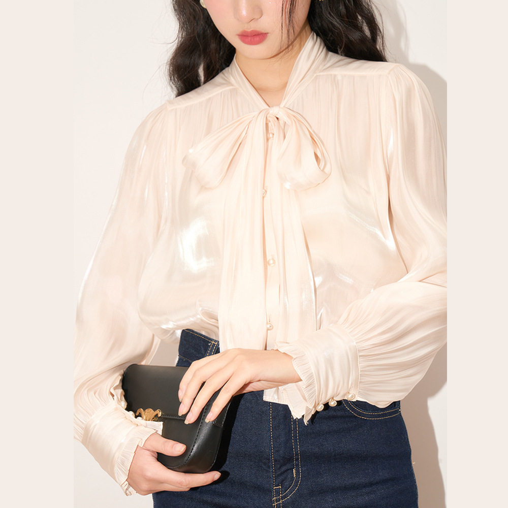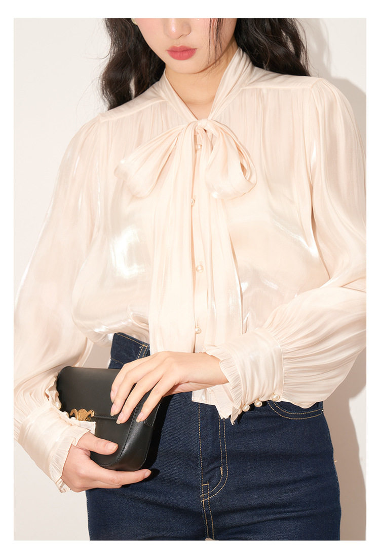 【トップス】エレガント 光沢感 ボウタイ リボン結び ブラウス 【JZシリーズ】