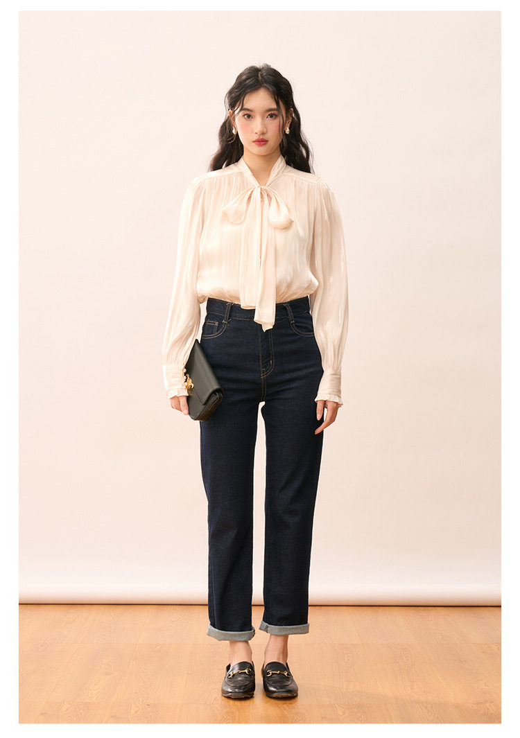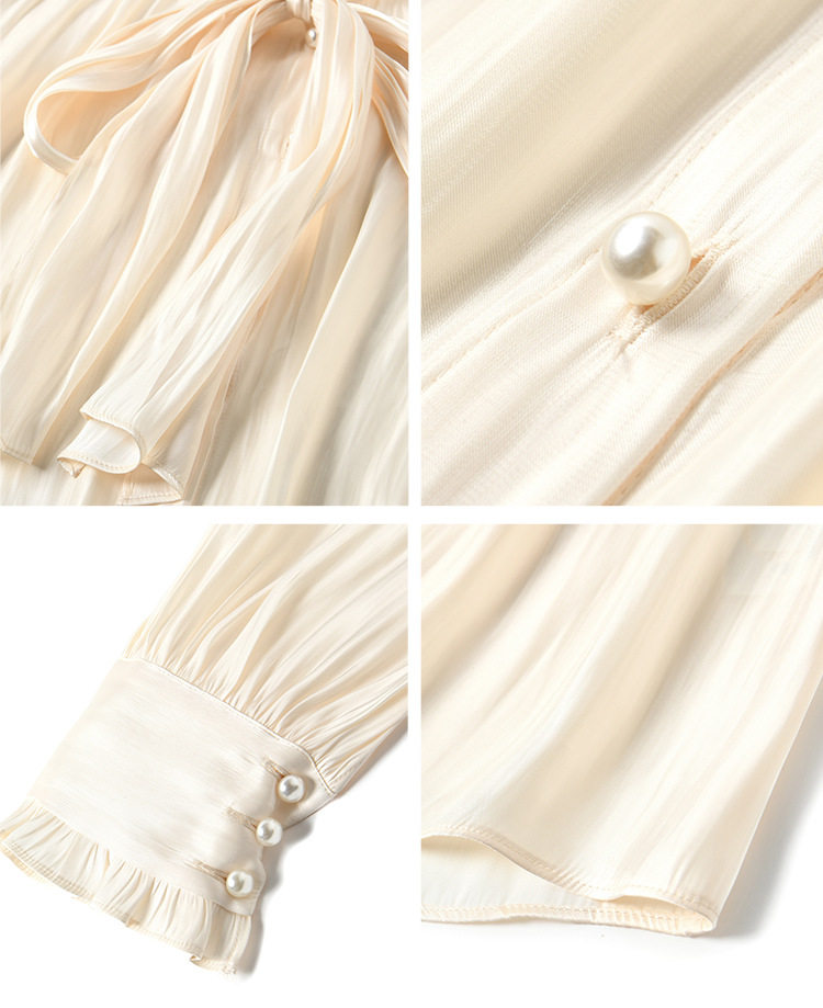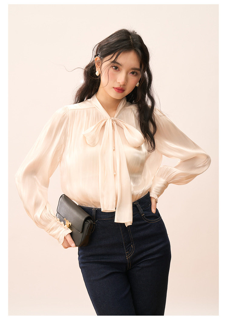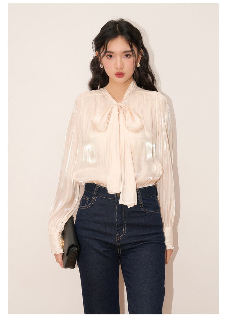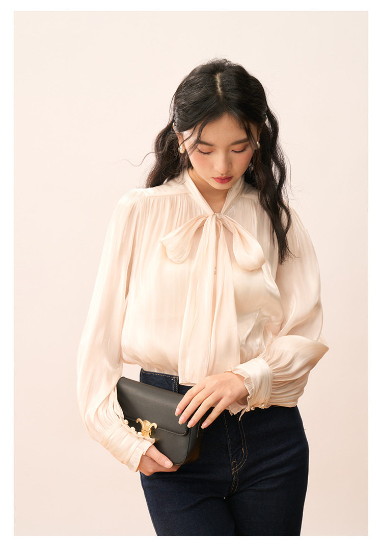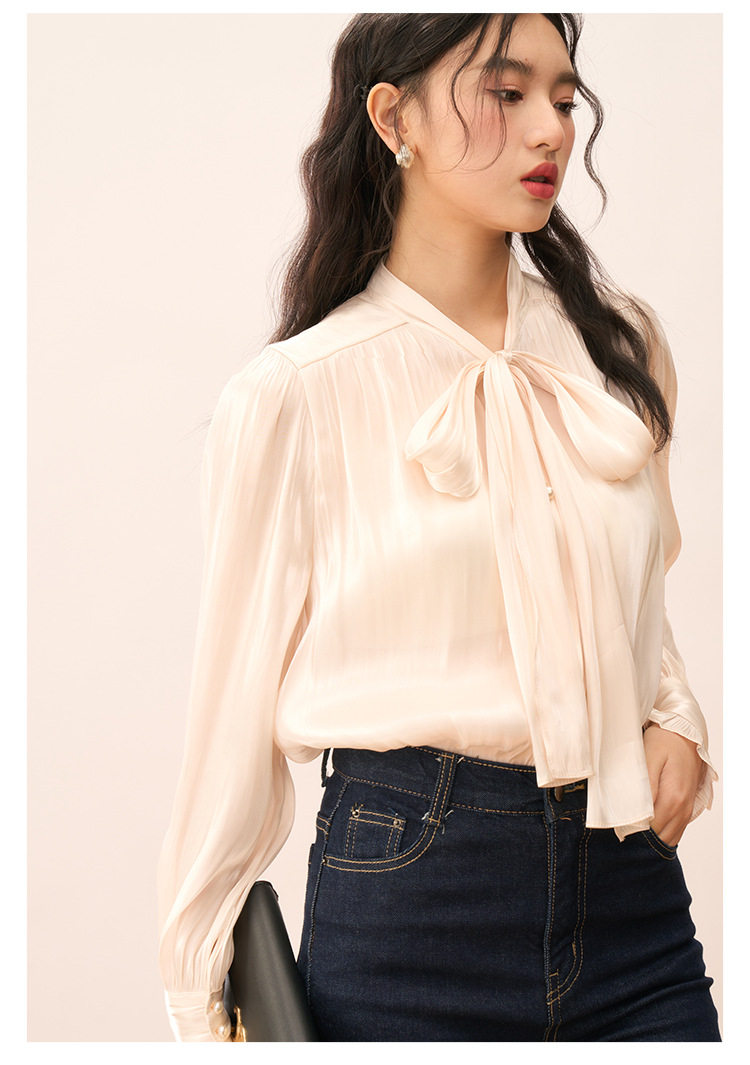 【トップス】エレガント 光沢感 ボウタイ リボン結び ブラウス 【JZシリーズ】