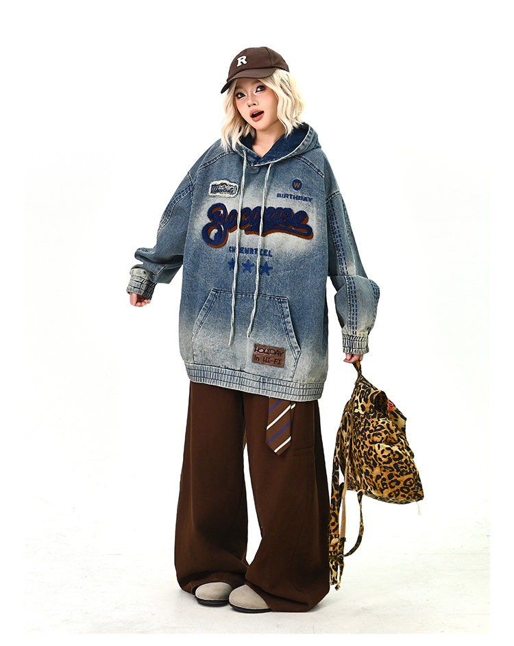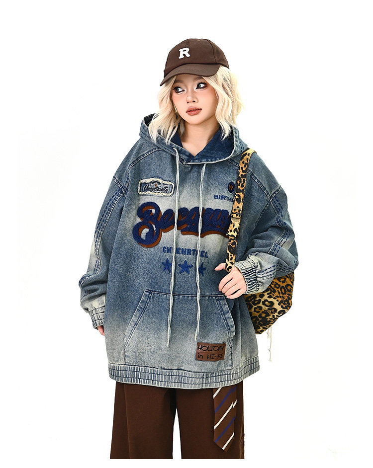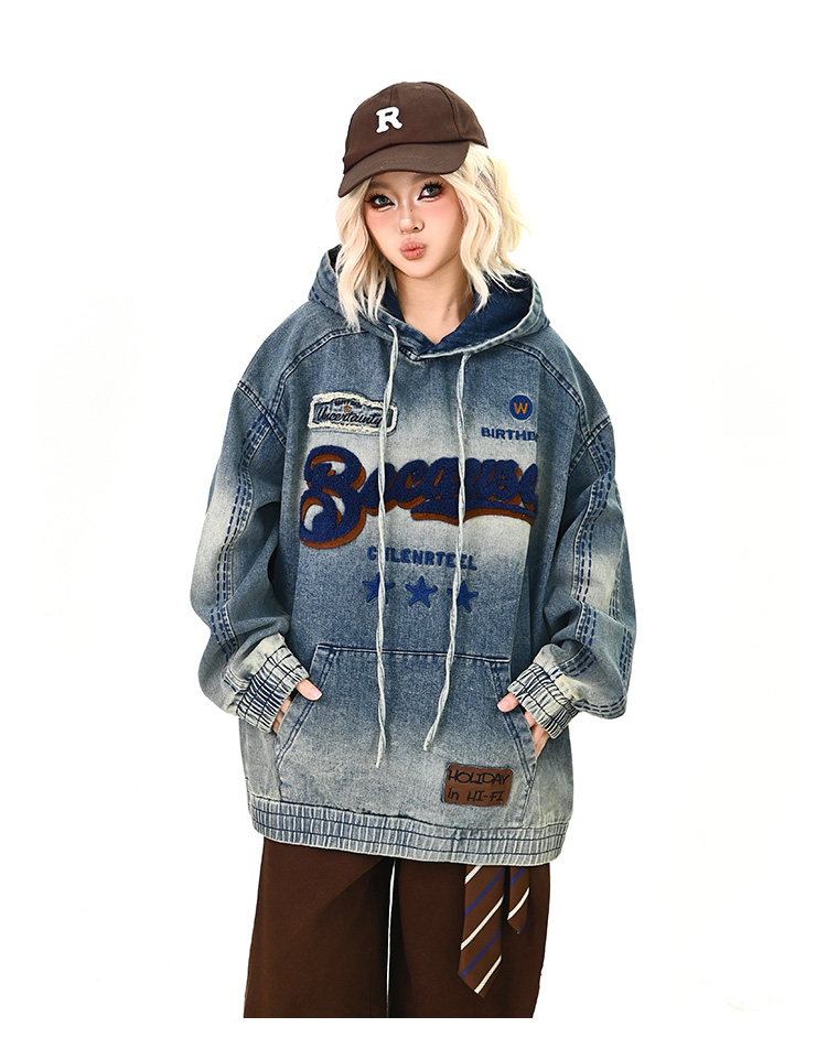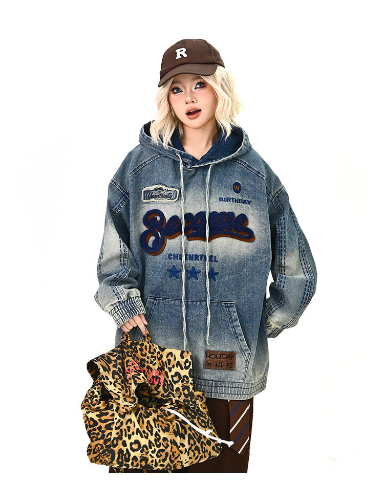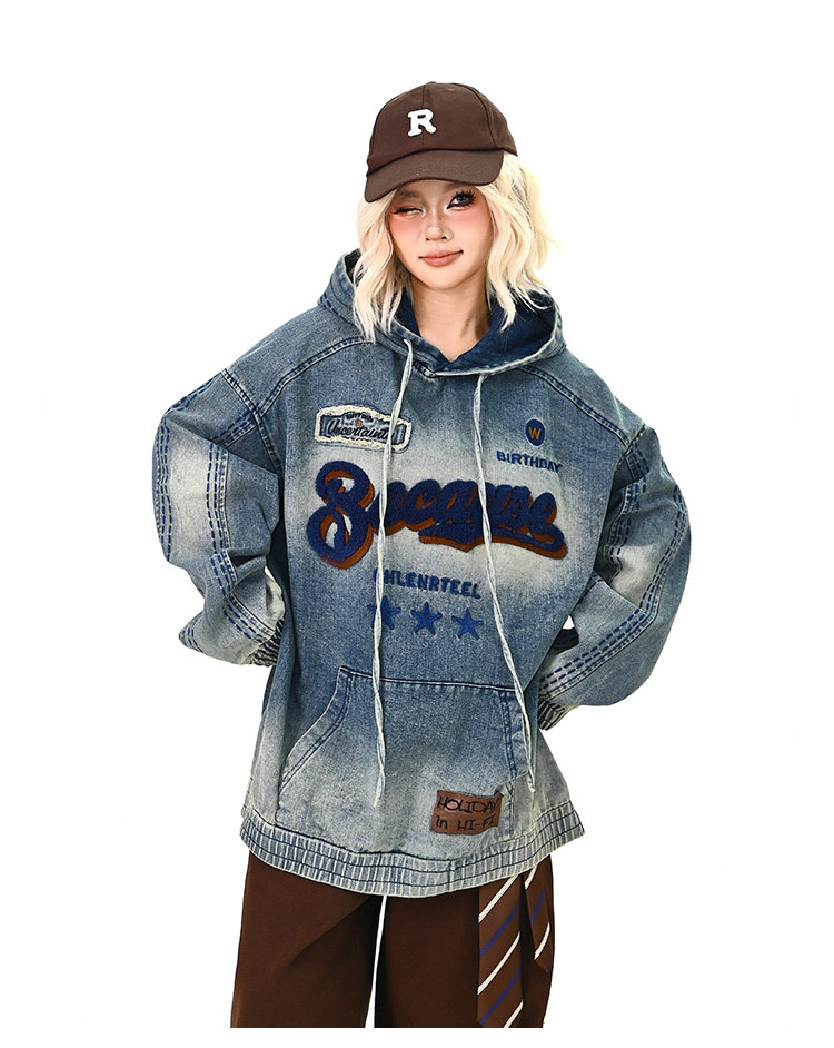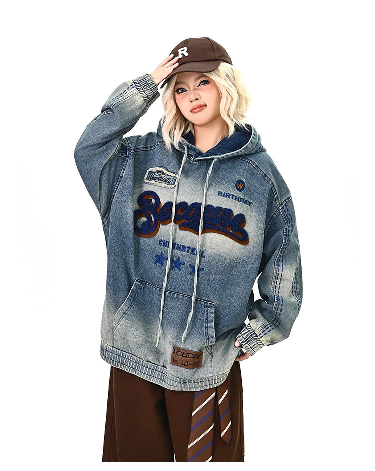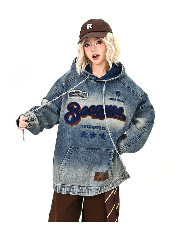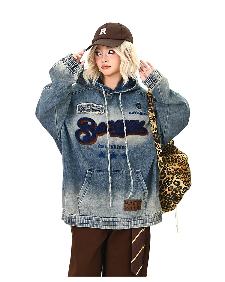 【トップス】春秋冬 Oversize レトロ 刺繍 ゆったり フード付き デニム パーカー【FCシリーズ】【15~20日発送】