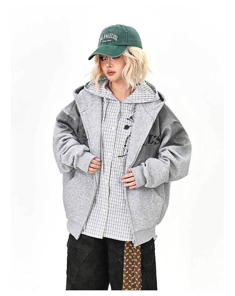 【トップス】フェイクレイヤード フードパーカー 春秋 男女兼用 ゆったり カジュアル トップス【FCシリーズ】
