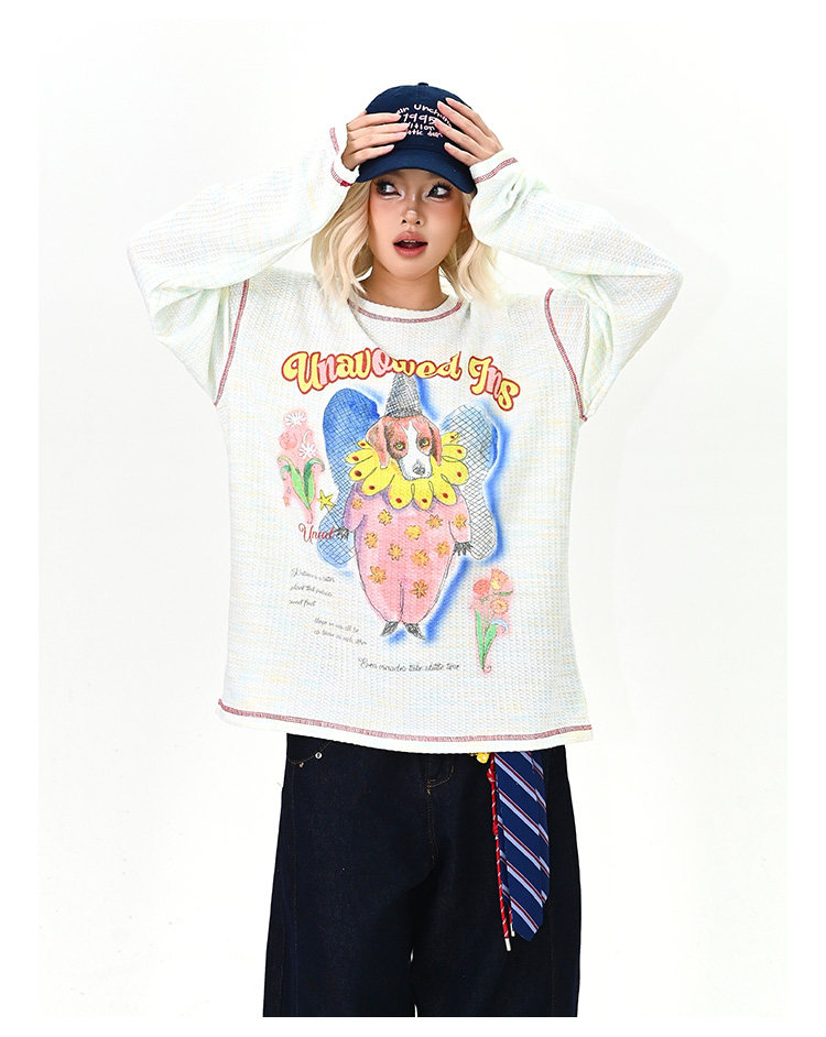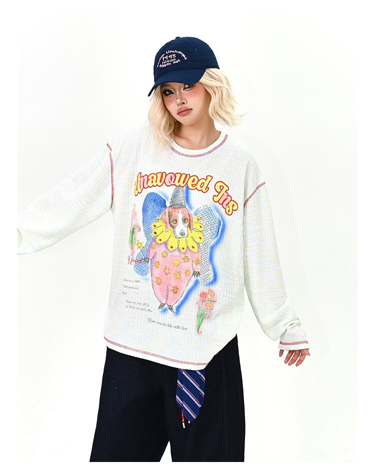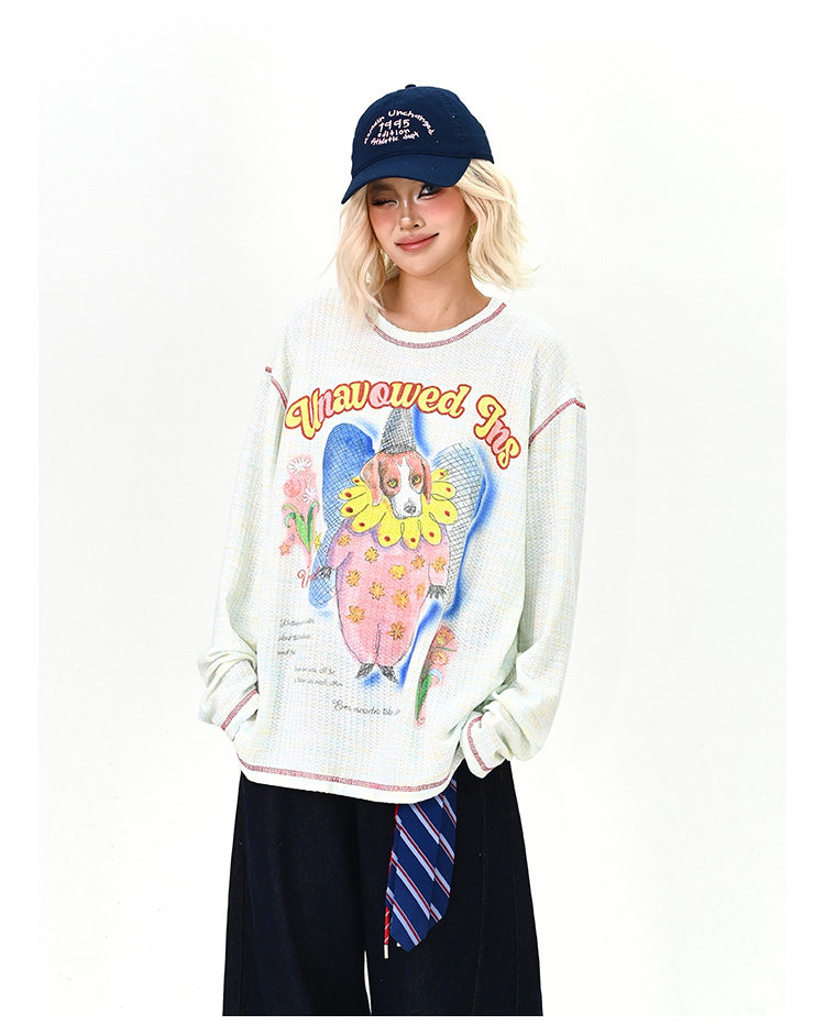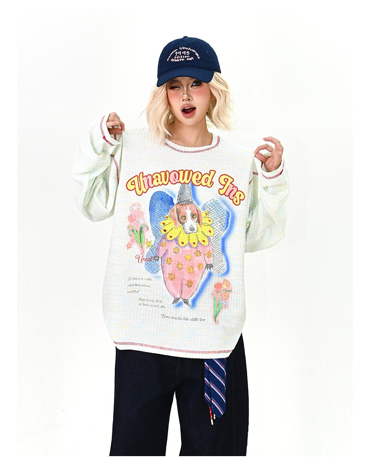 【トップス】レトロ デザイン 小犬柄 クルーネック ニット レディース ゆったり ルーズ 着回し セーター【FCシリーズ】