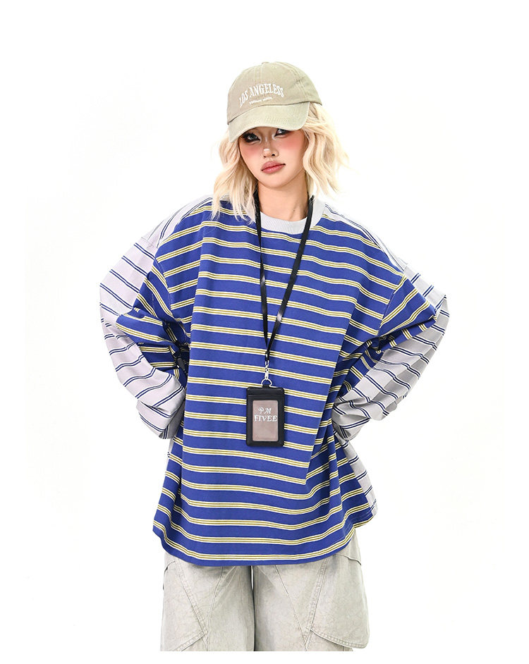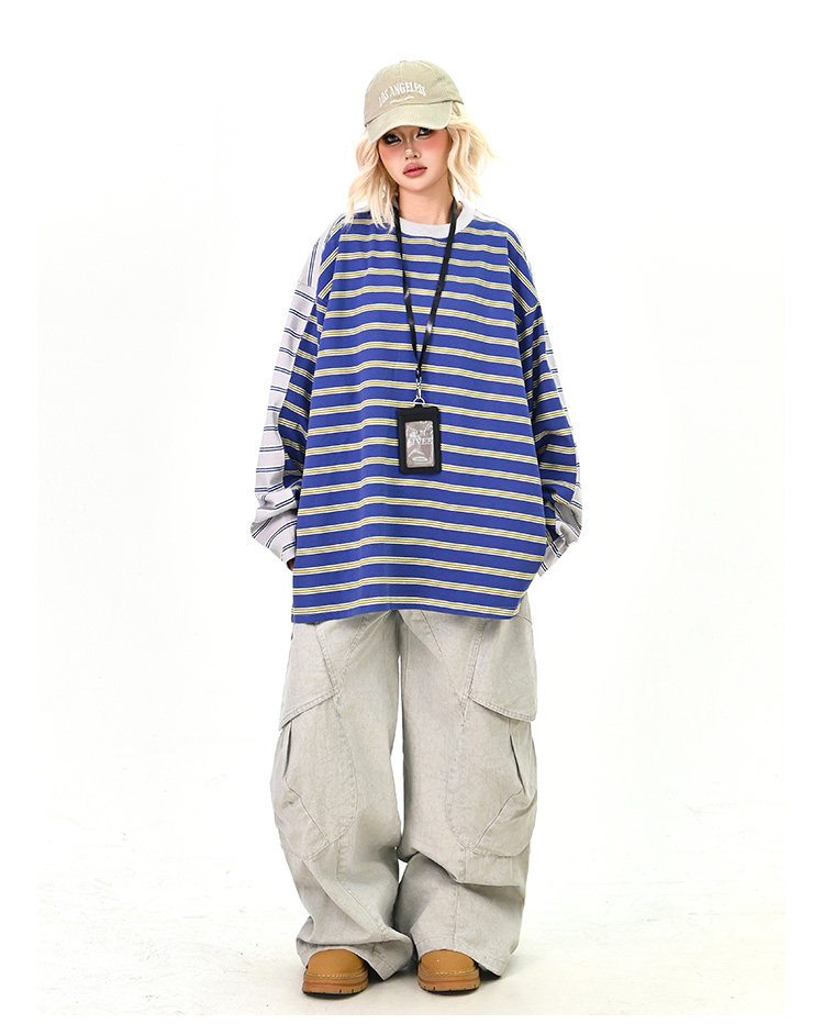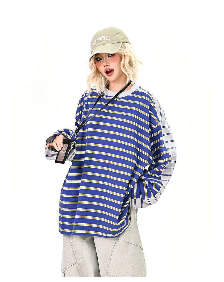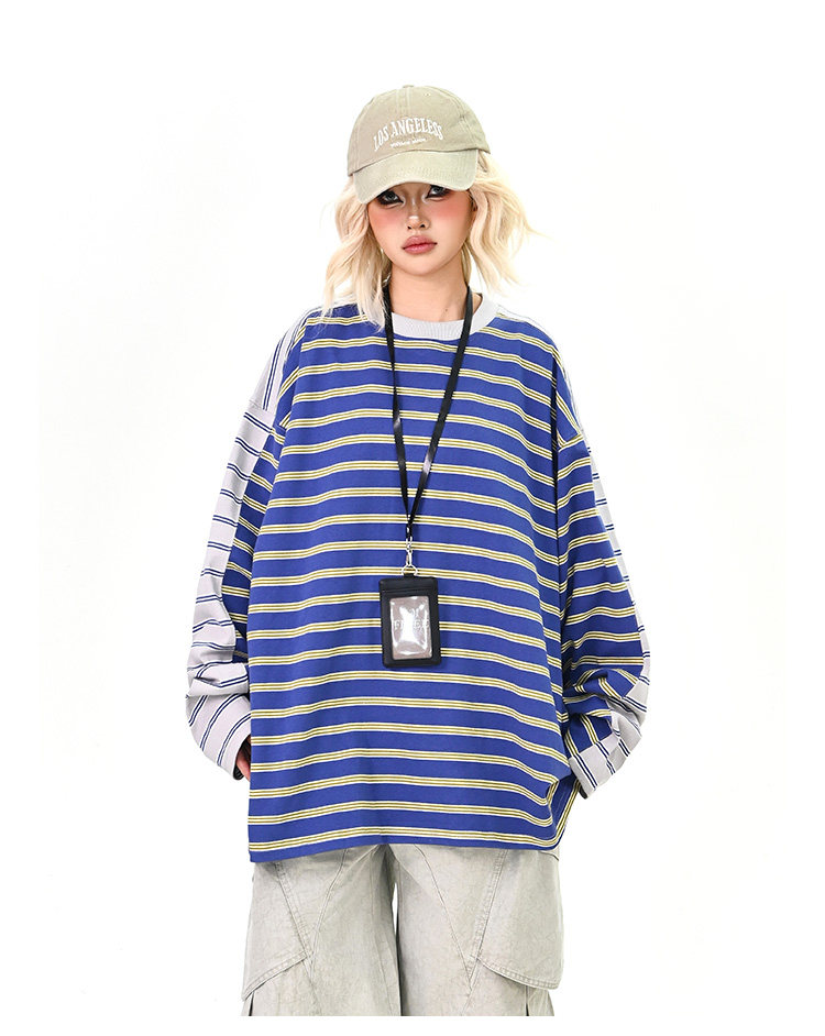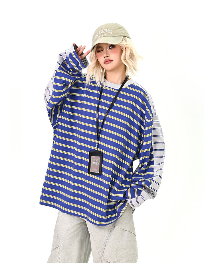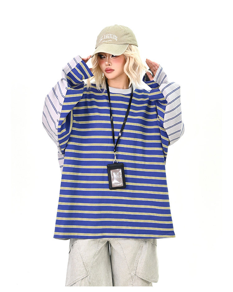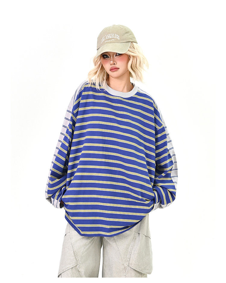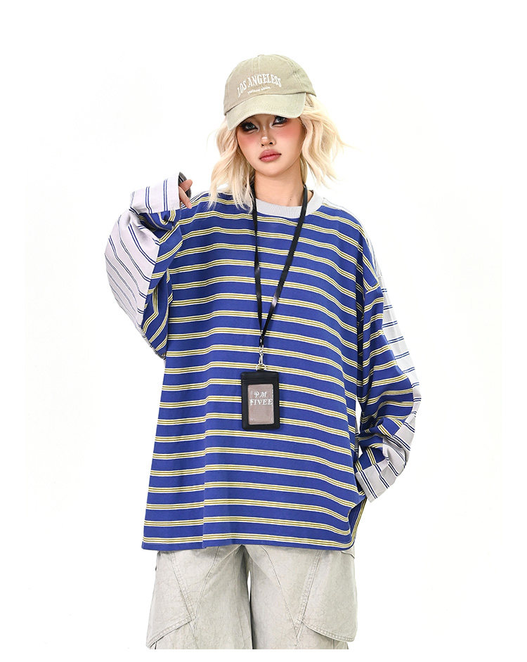 【トップス】配色ボーダー 長袖Tシャツ オーバーサイズ BFスタイル 韓国ストリート レディース【FCシリーズ】