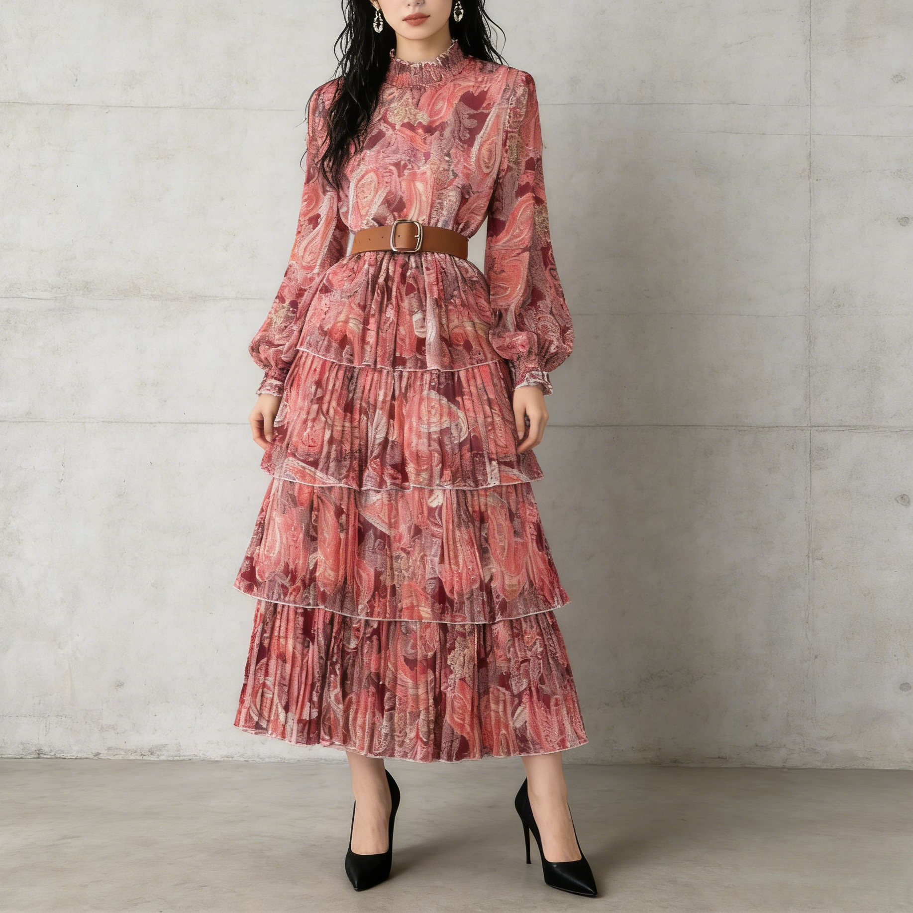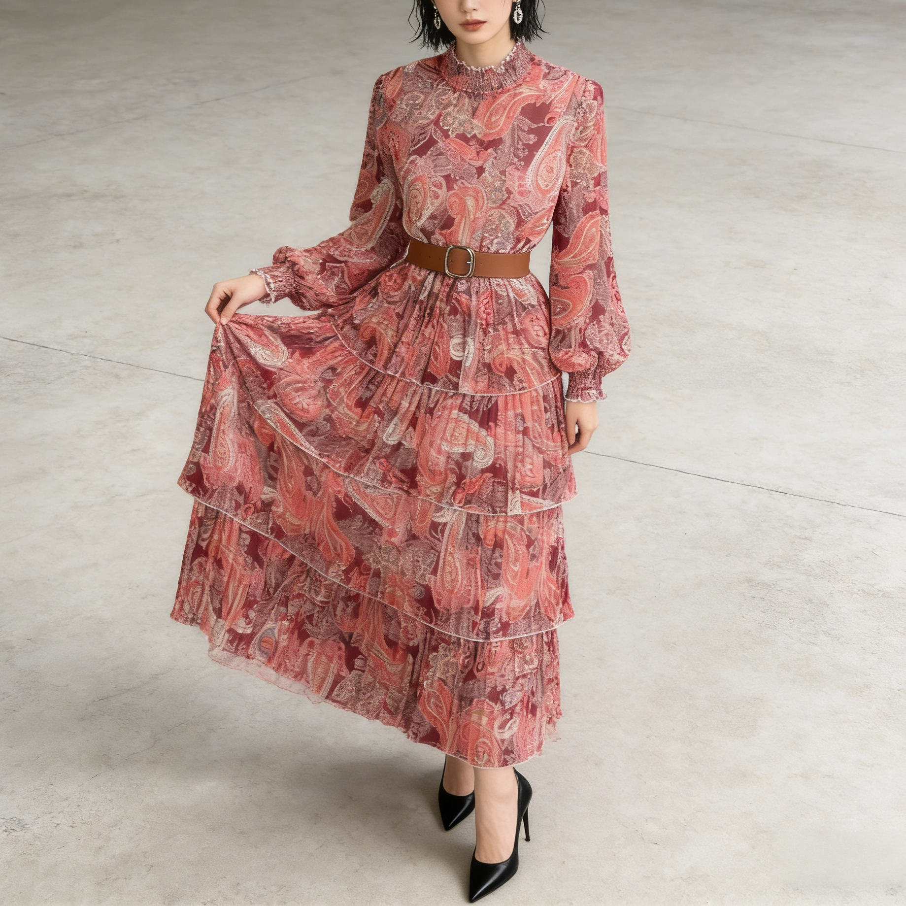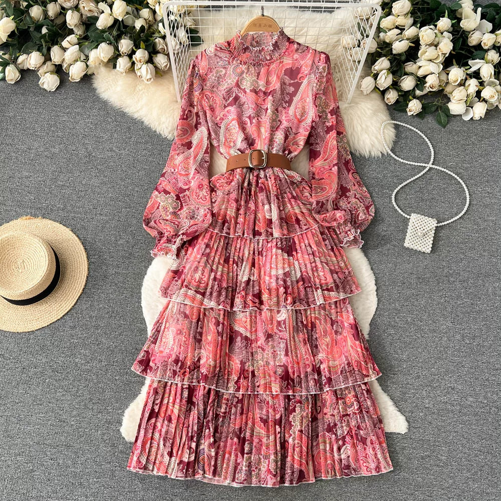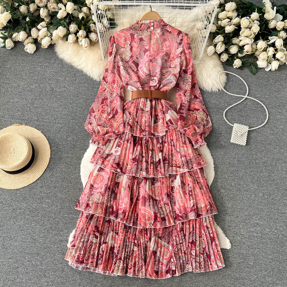 【ワンピース】レディライク シングルボタン ベルト付き フレア 花柄 長袖 ワンピース【SHシリーズ】