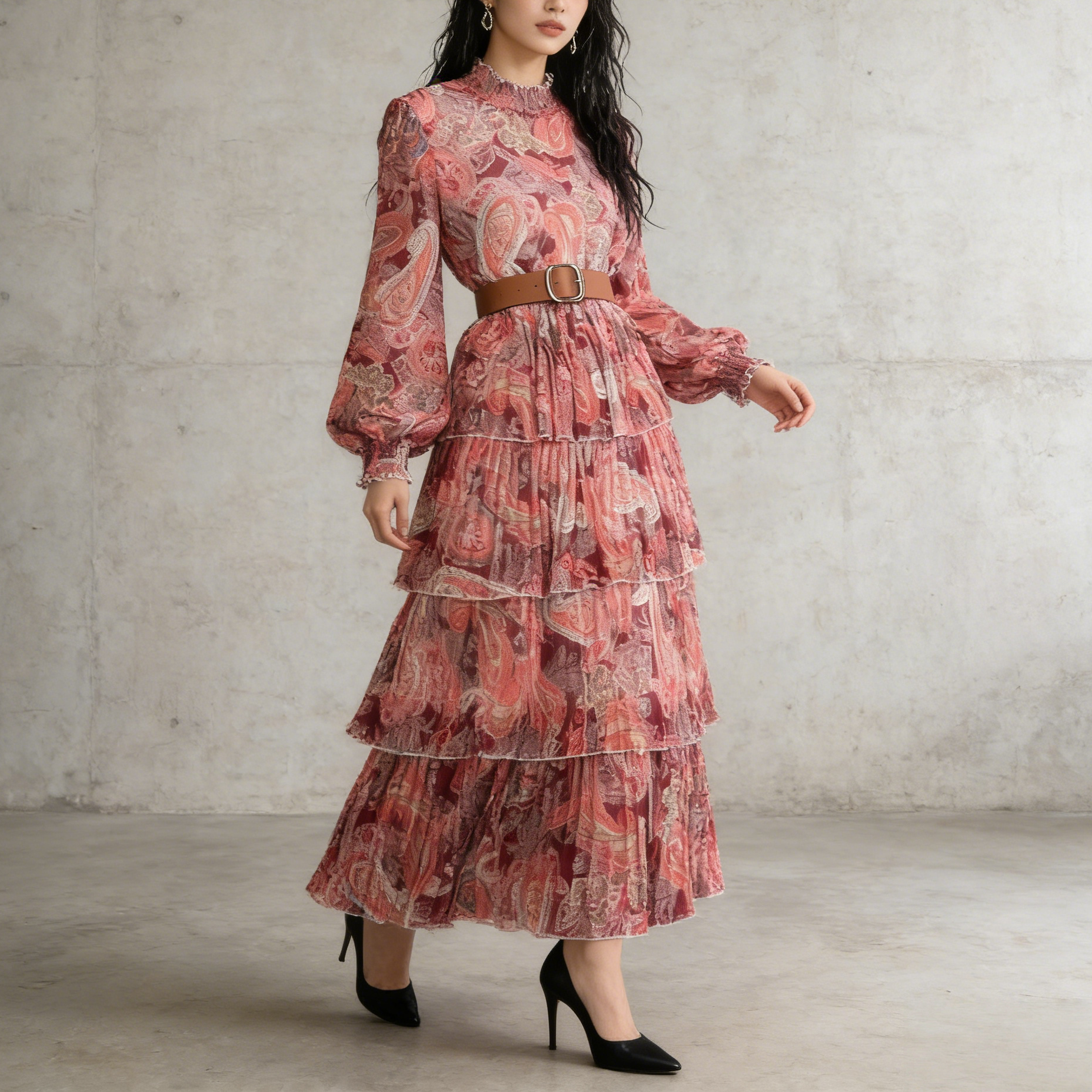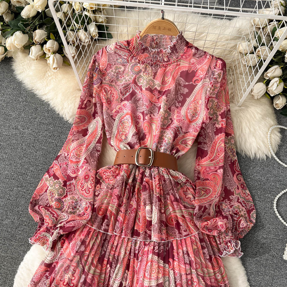 【ワンピース】ボリュームスリーブ プリント ウエスト切り替え ふんわり フレア 長袖 ワンピース 【SHシリーズ】