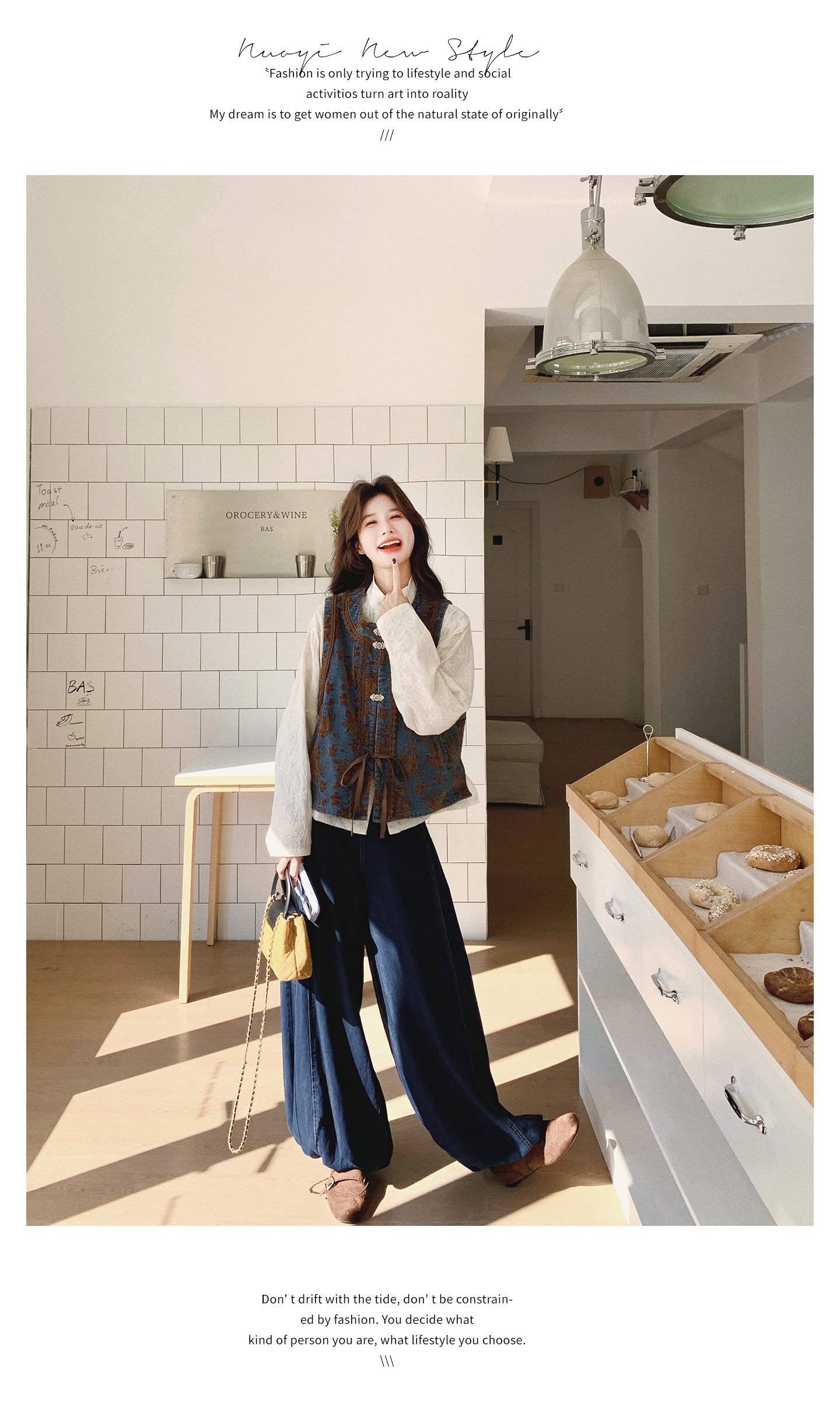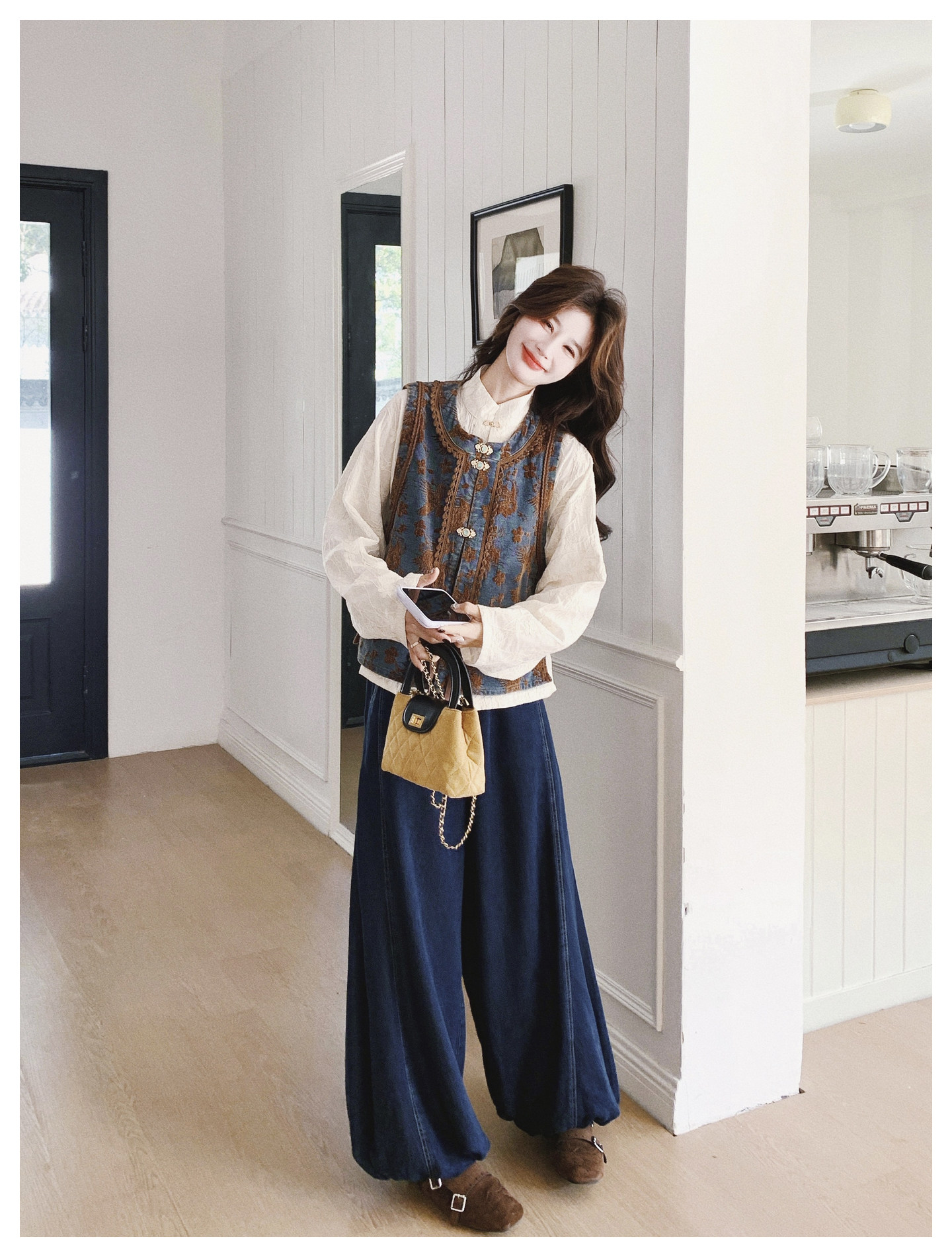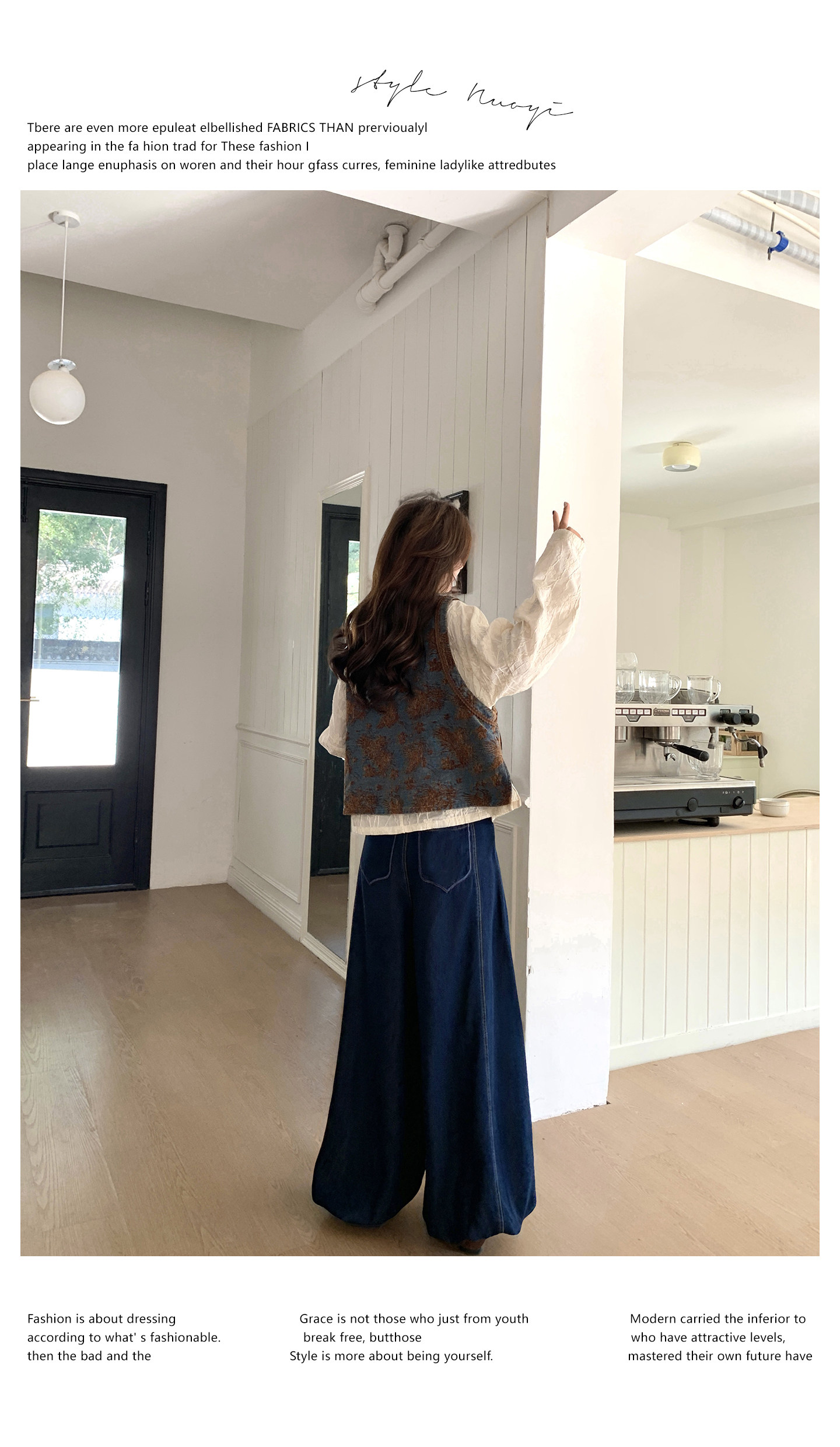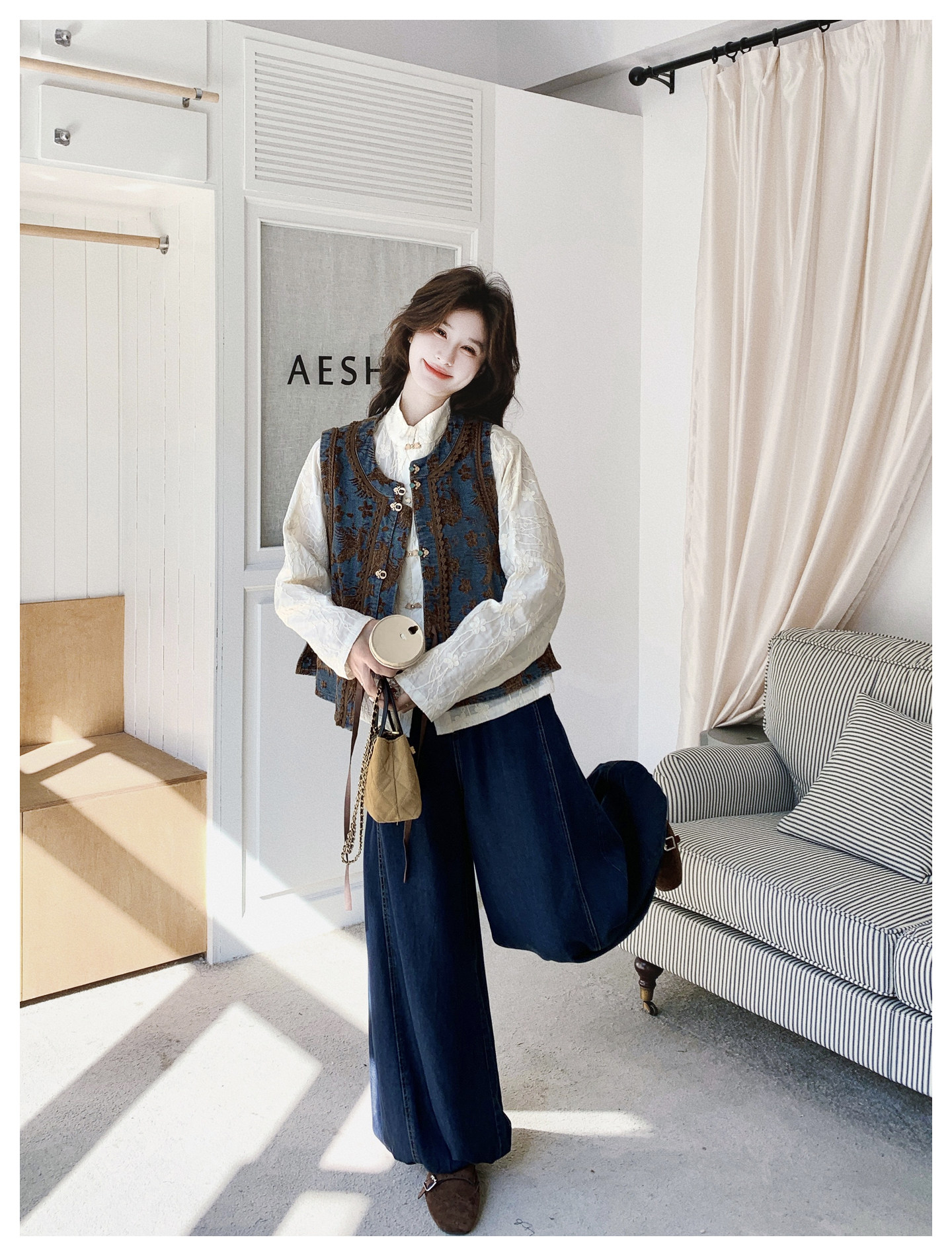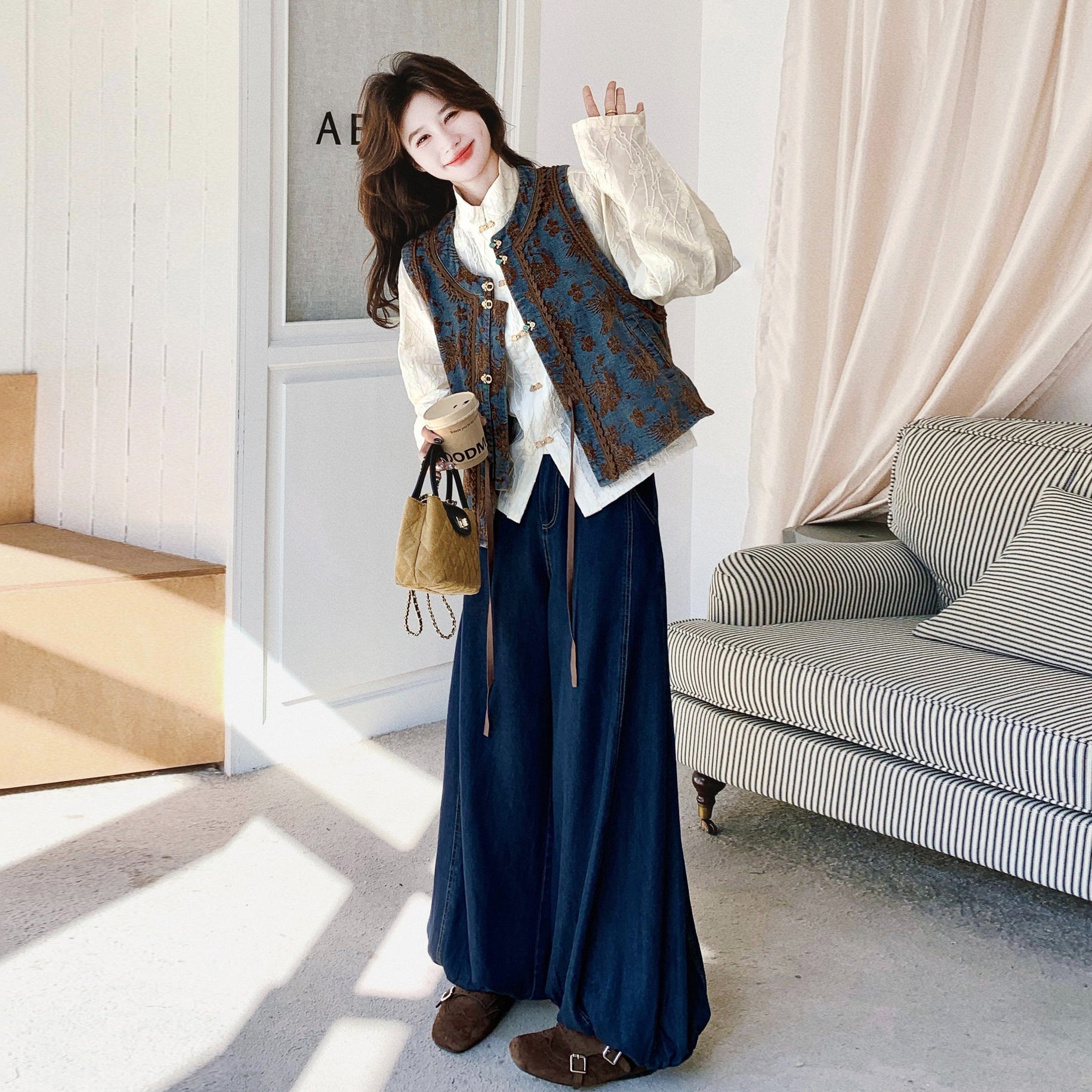 【商品名】3点セット!【セットアップ】メラードジャカード×配色 ベスト+中国風シャツ+ワイドデニムパンツ 上下セット レディース 早春・秋 サン系コーデ【SHシリーズ】