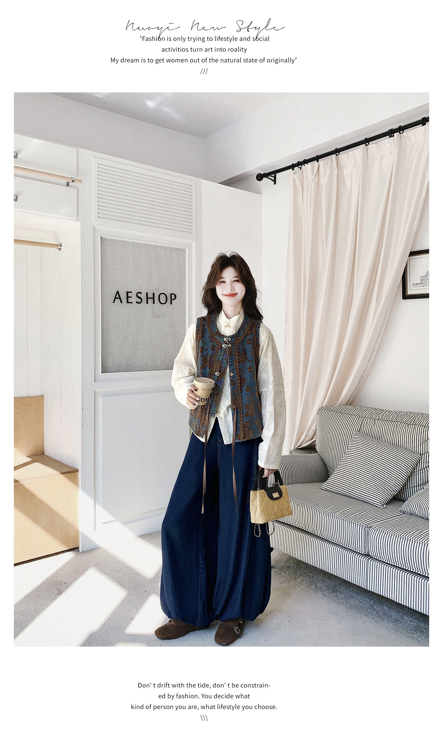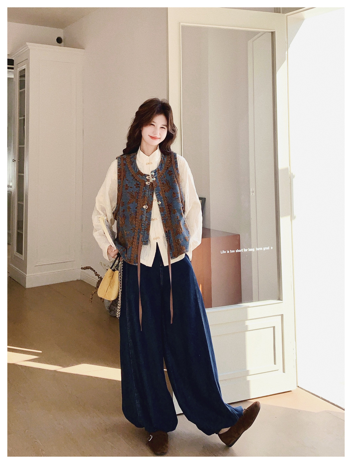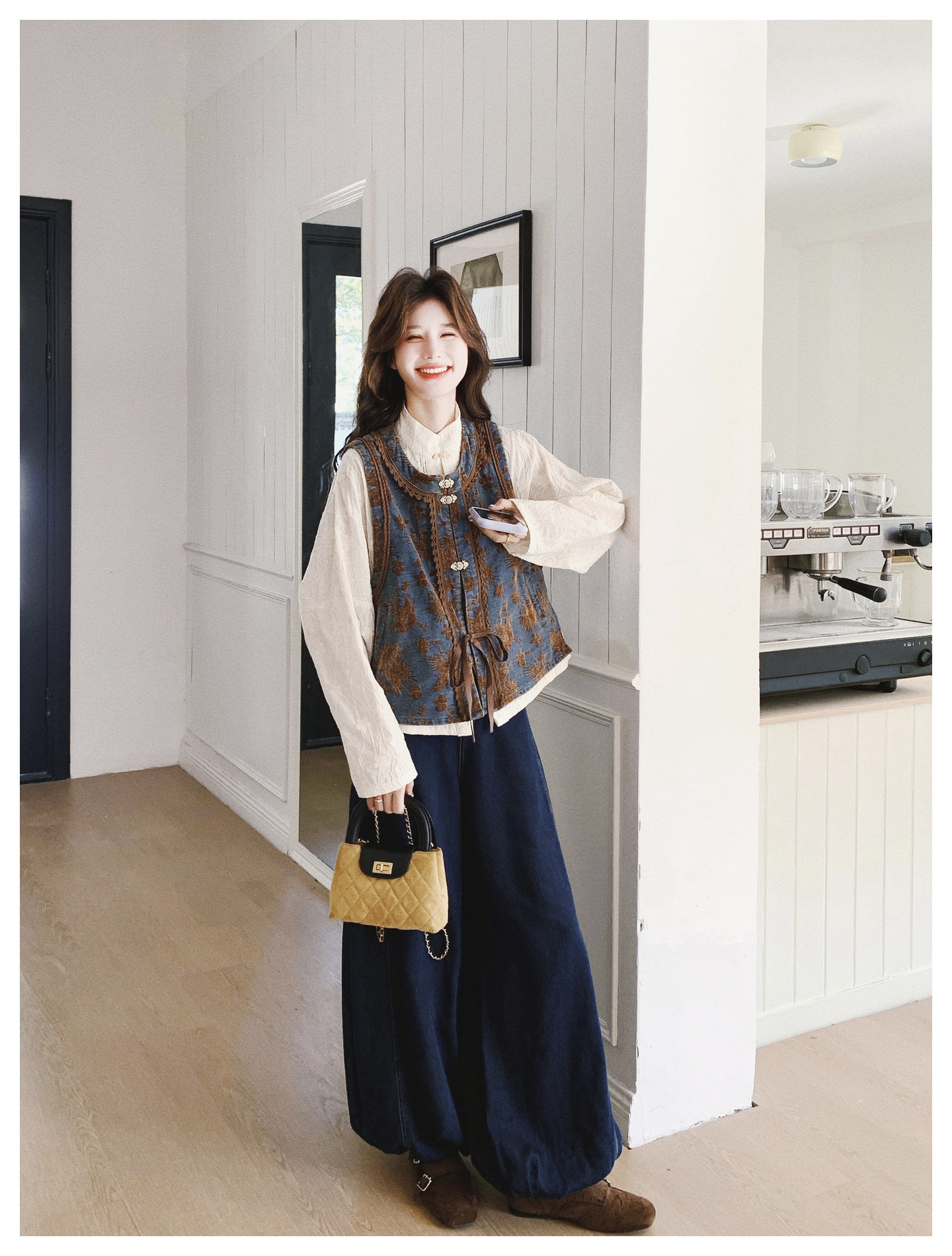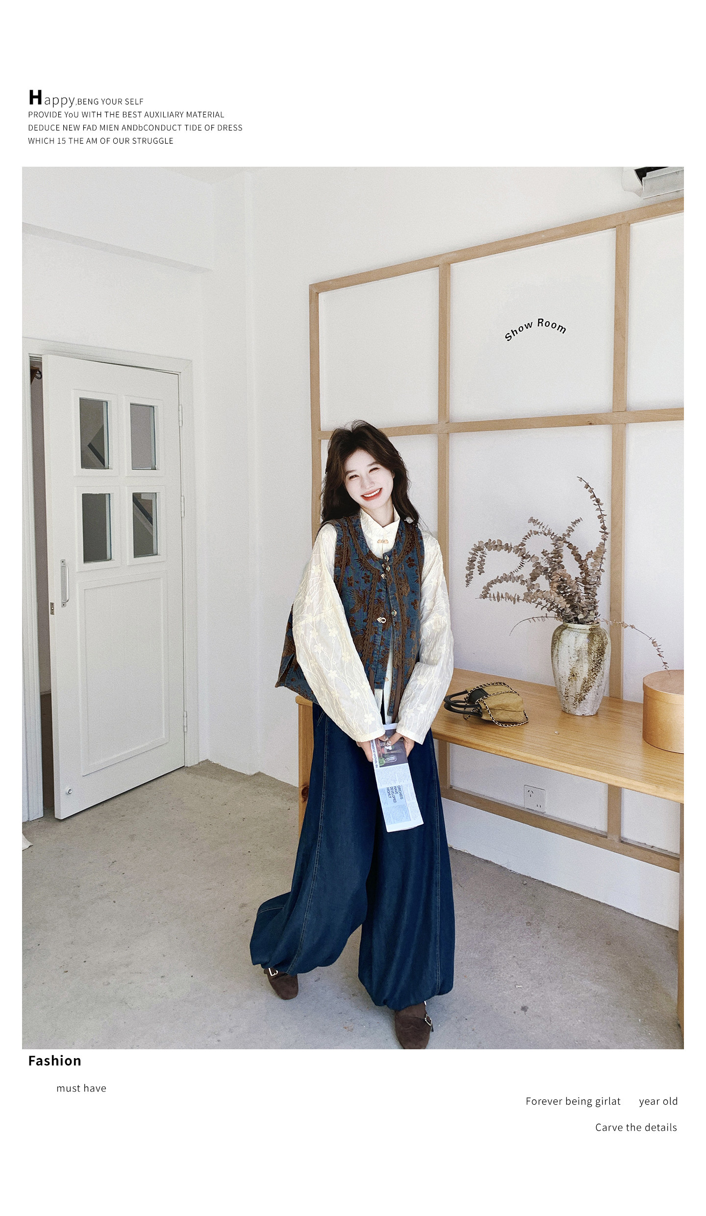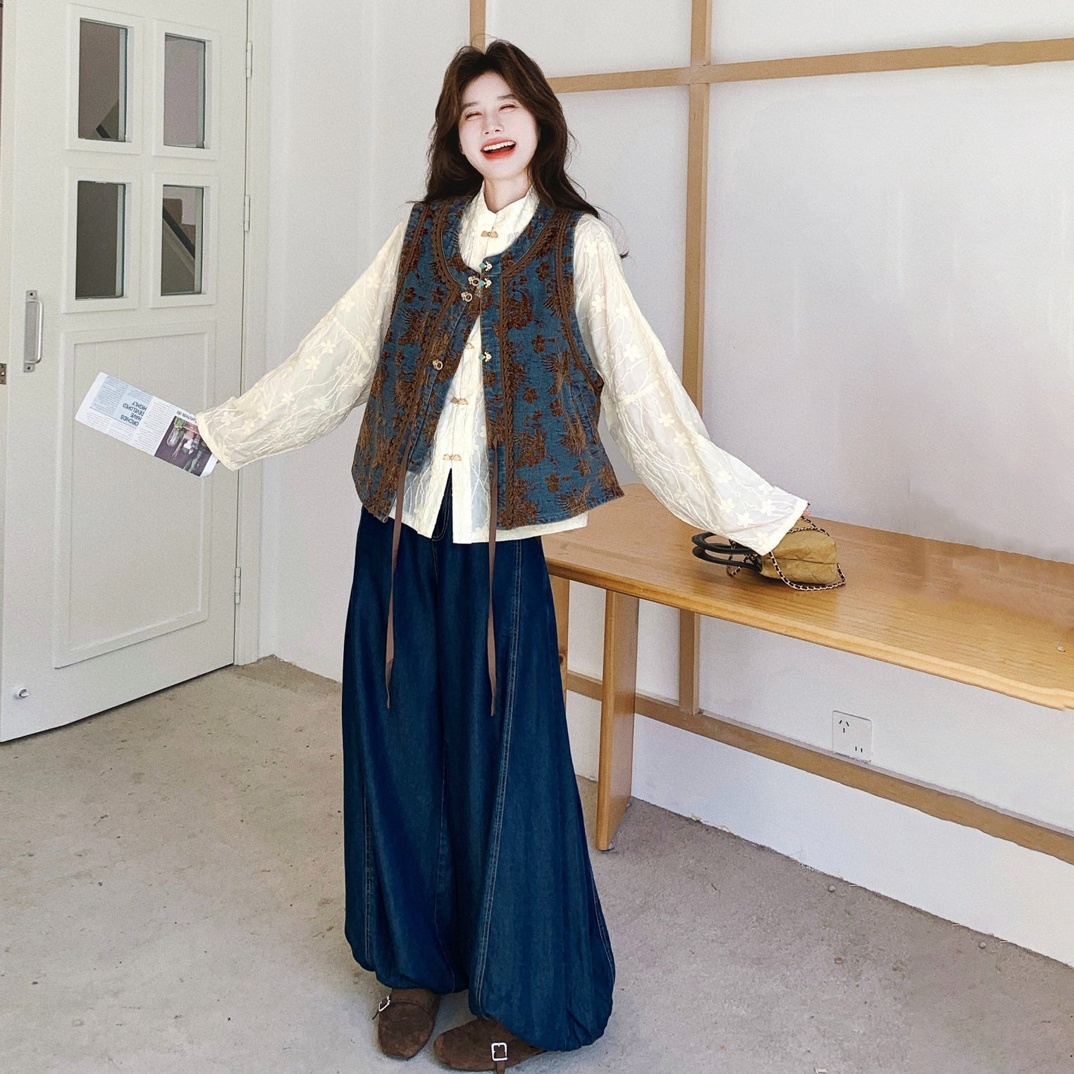 【商品名】3点セット!【セットアップ】メラードジャカード×配色 ベスト+中国風シャツ+ワイドデニムパンツ 上下セット レディース 早春・秋 サン系コーデ【SHシリーズ】