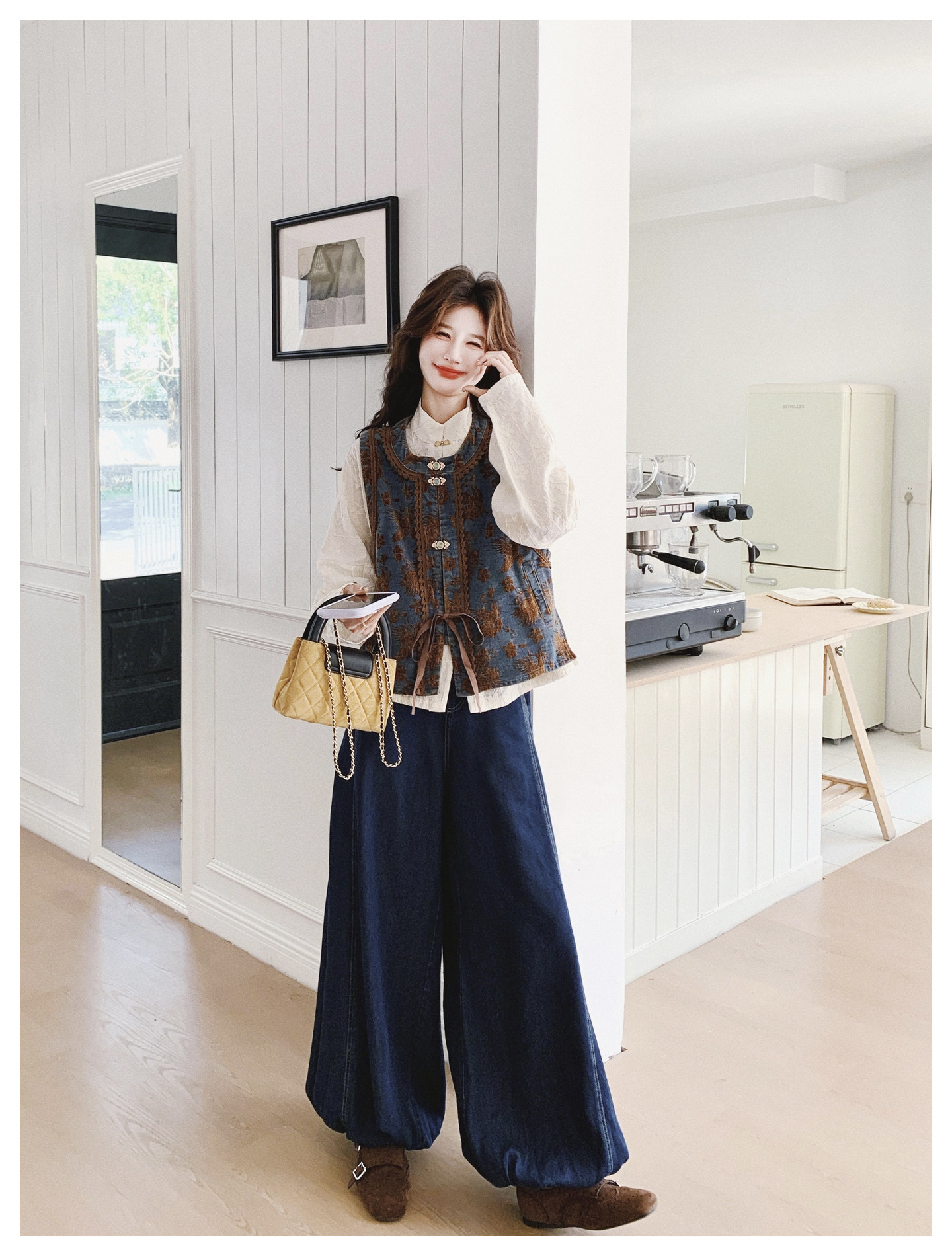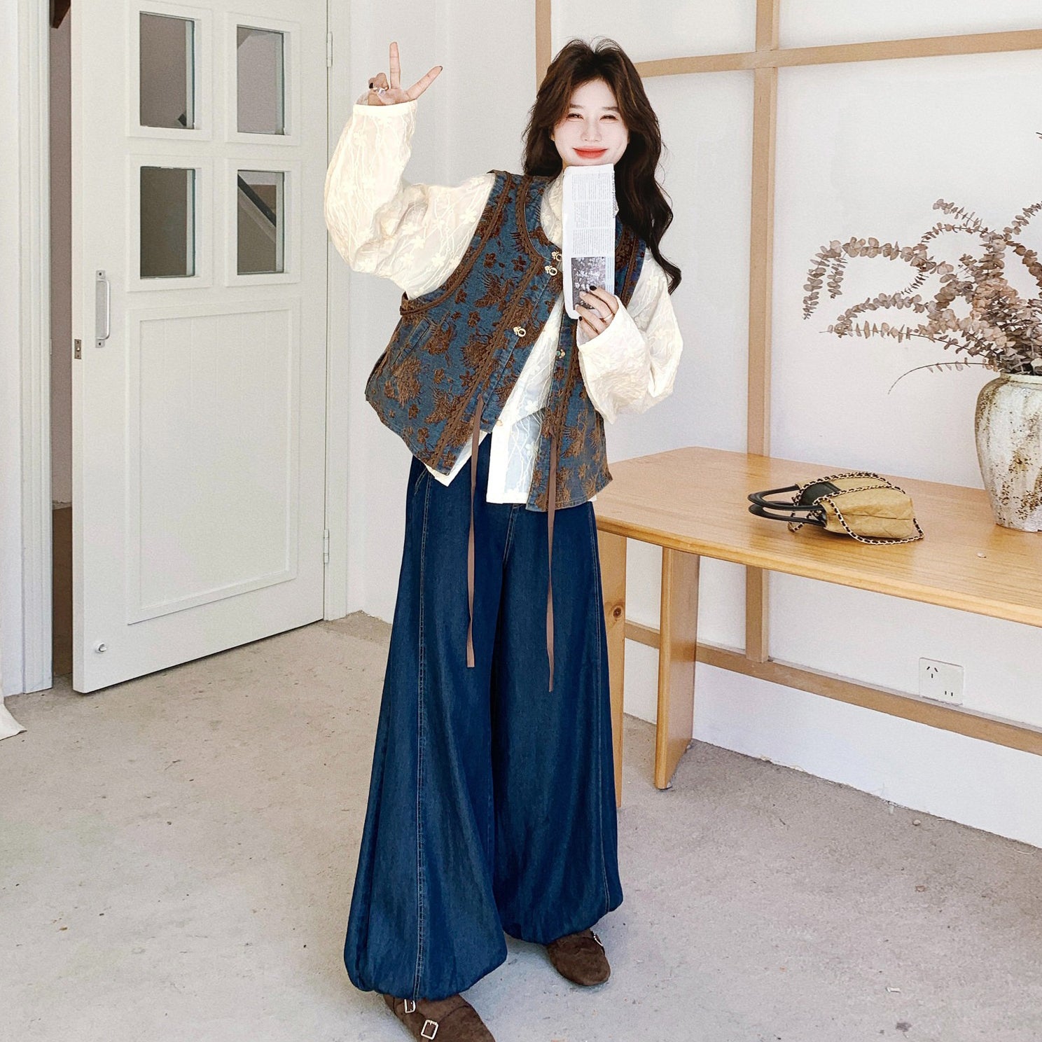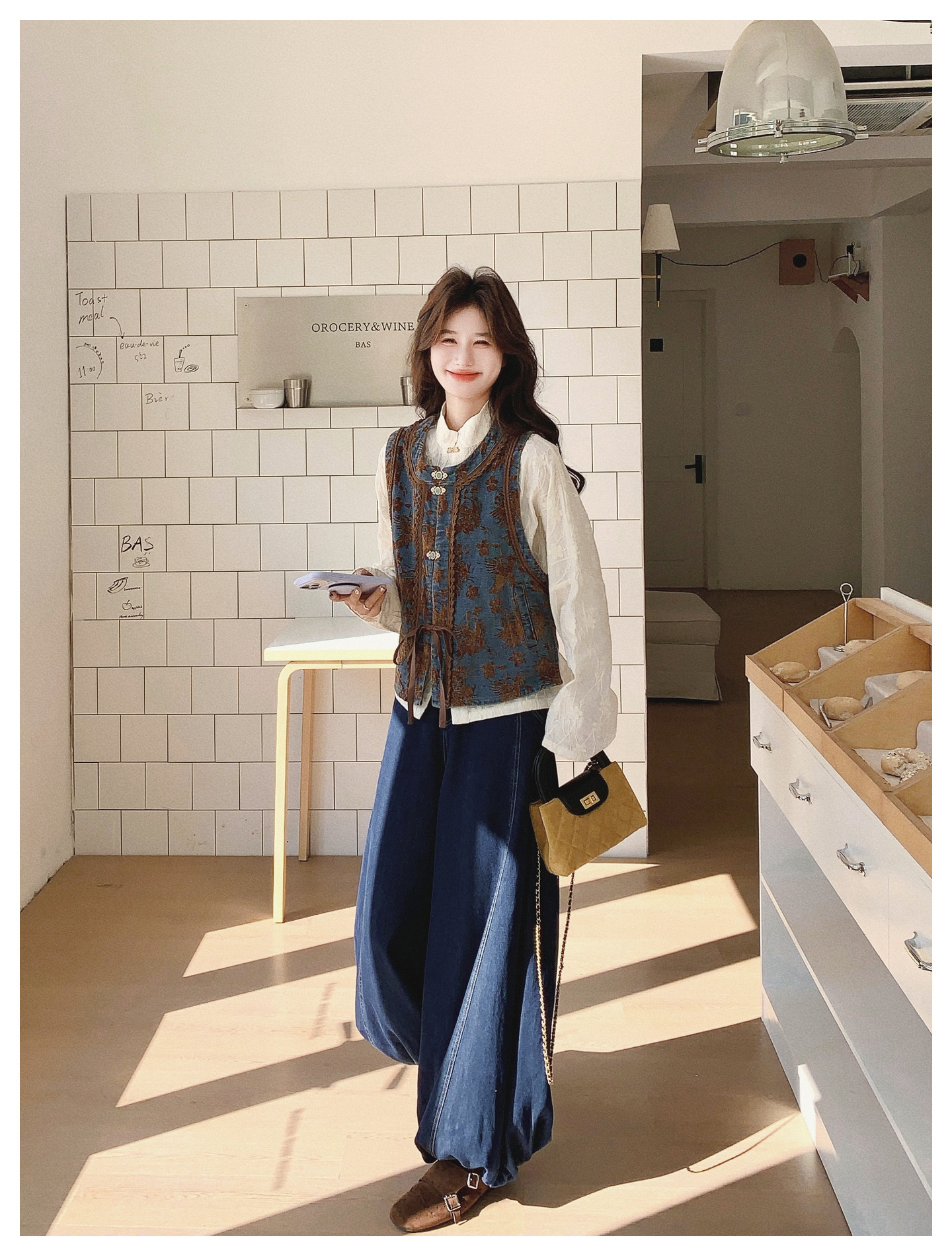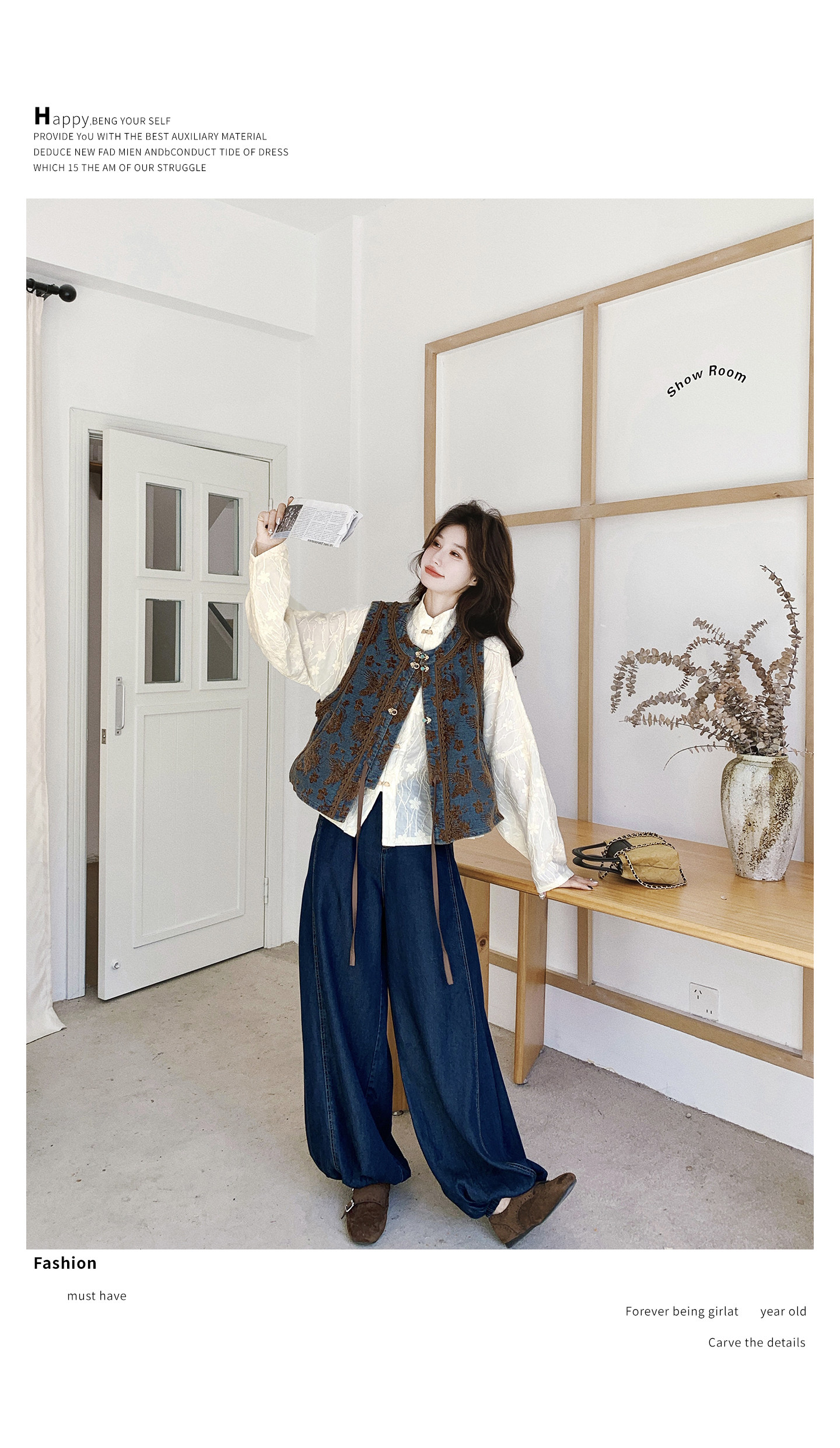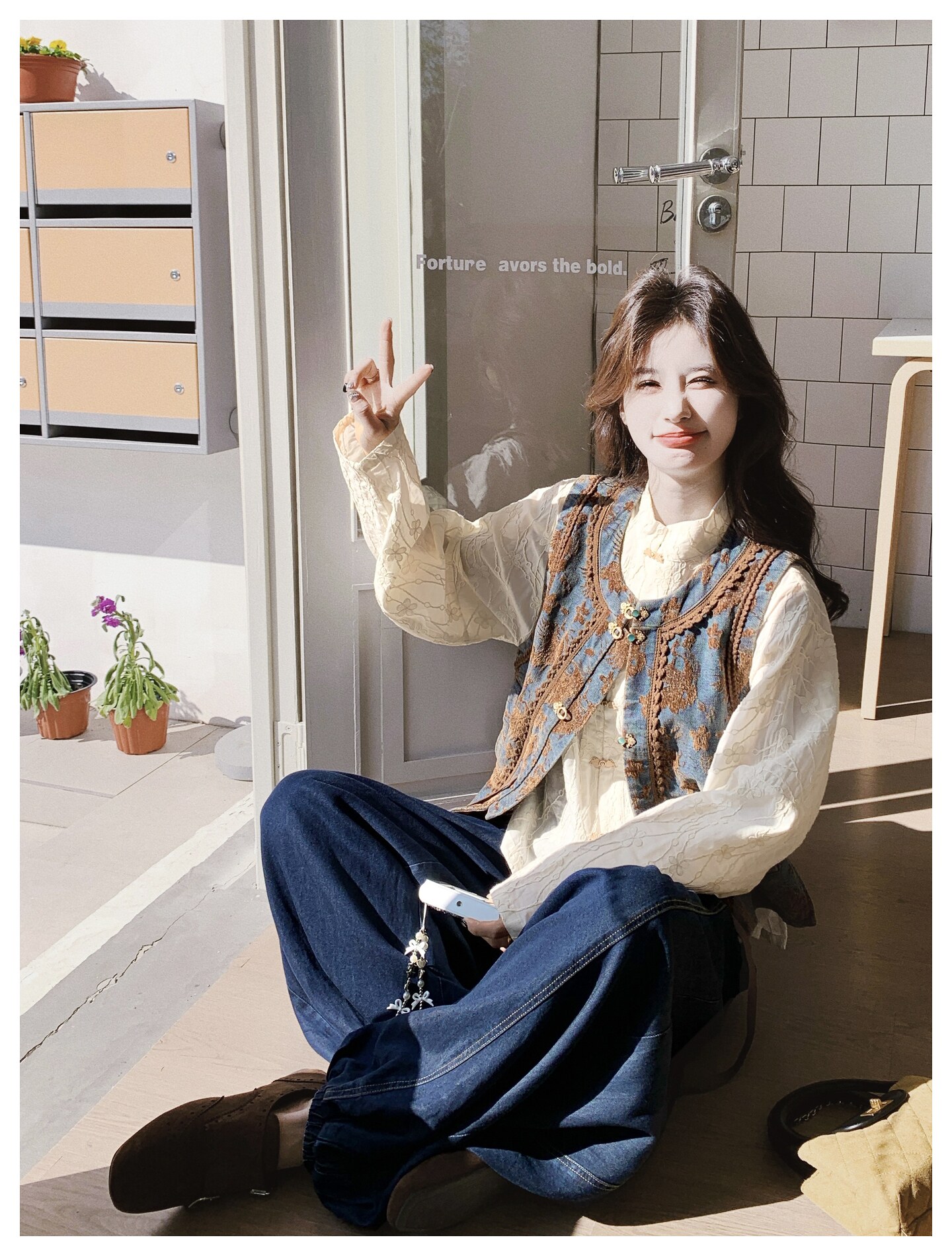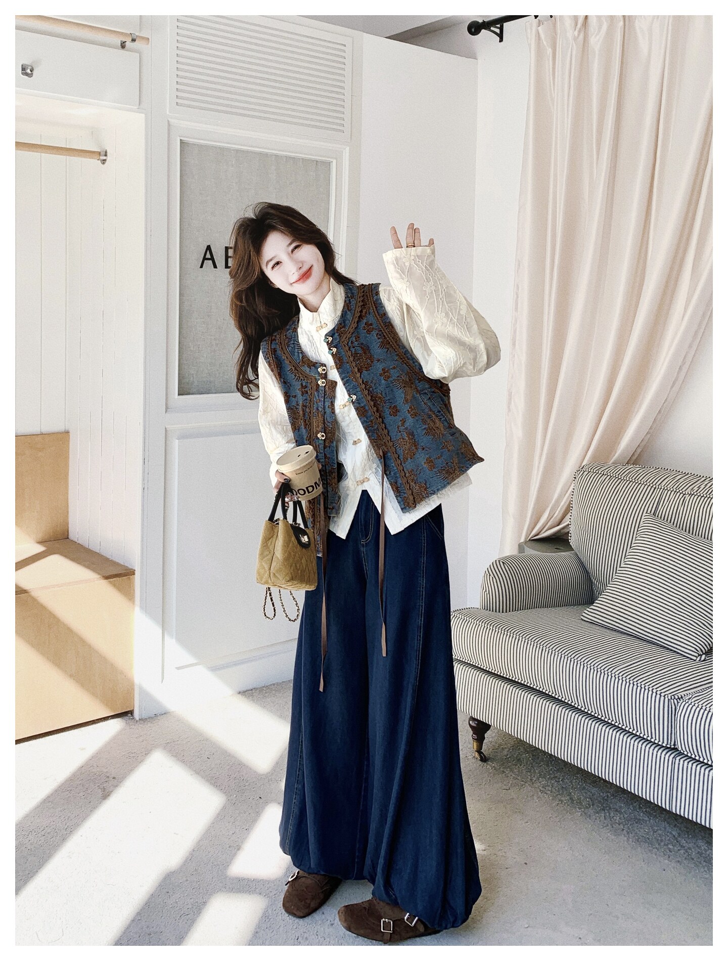 【商品名】3点セット!【セットアップ】メラードジャカード×配色 ベスト+中国風シャツ+ワイドデニムパンツ 上下セット レディース 早春・秋 サン系コーデ【SHシリーズ】
