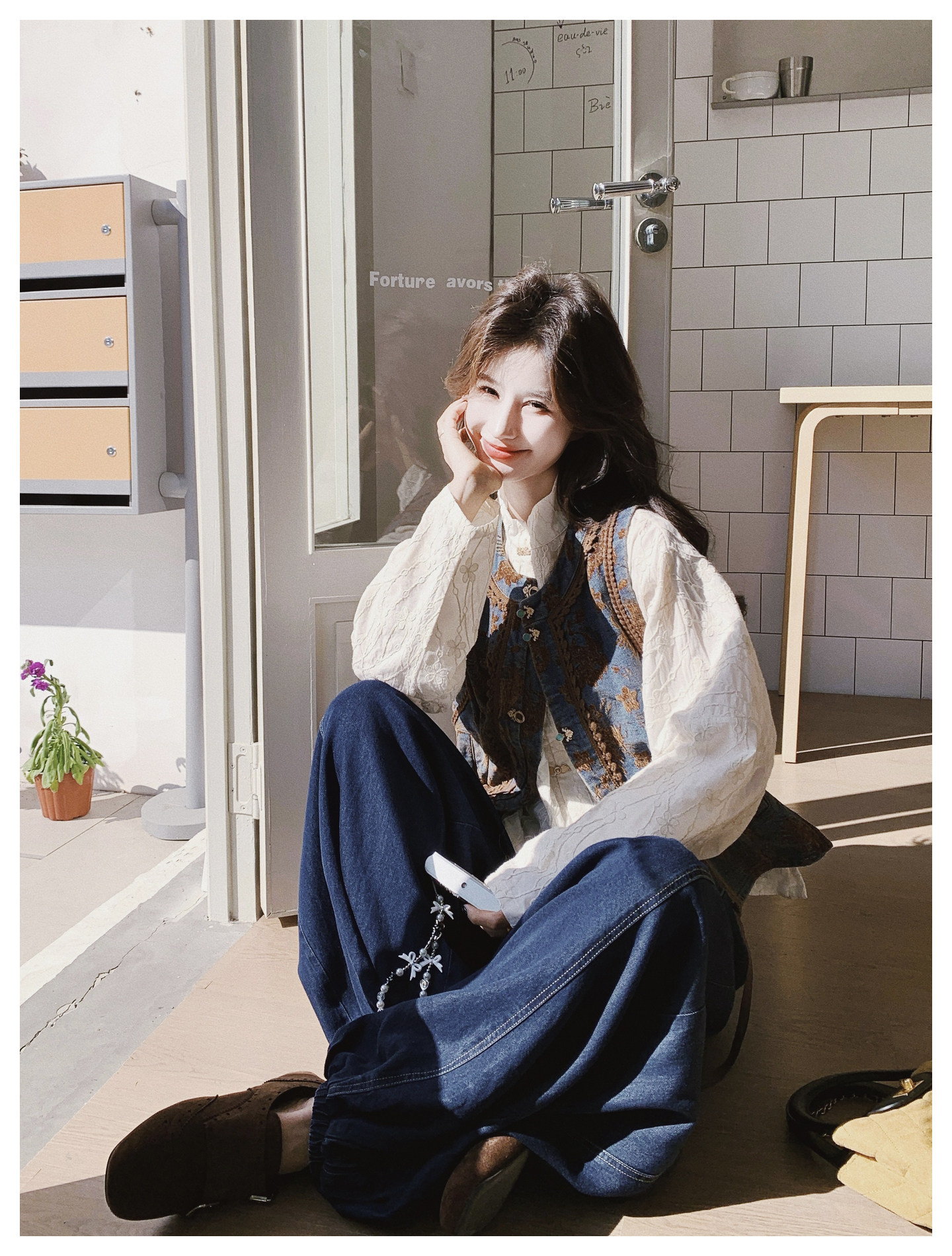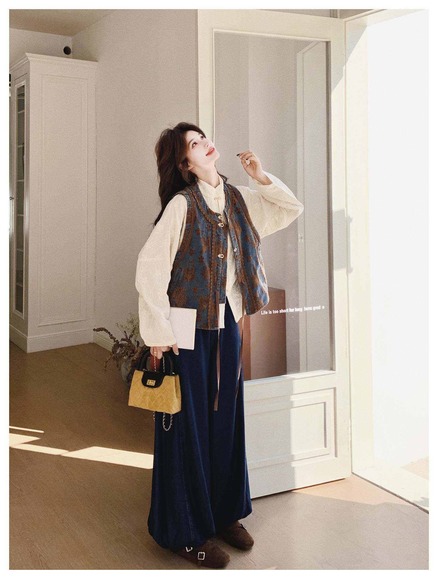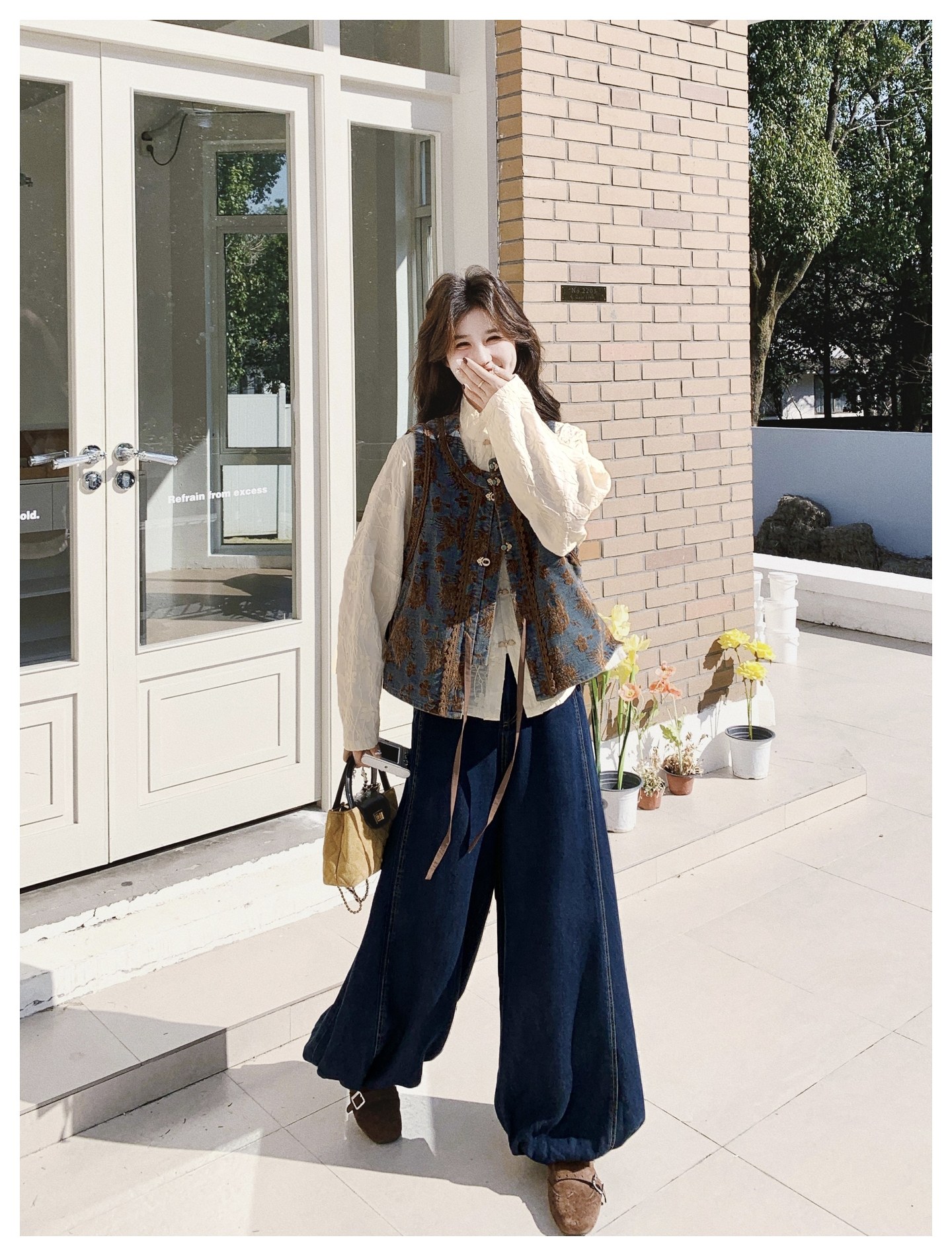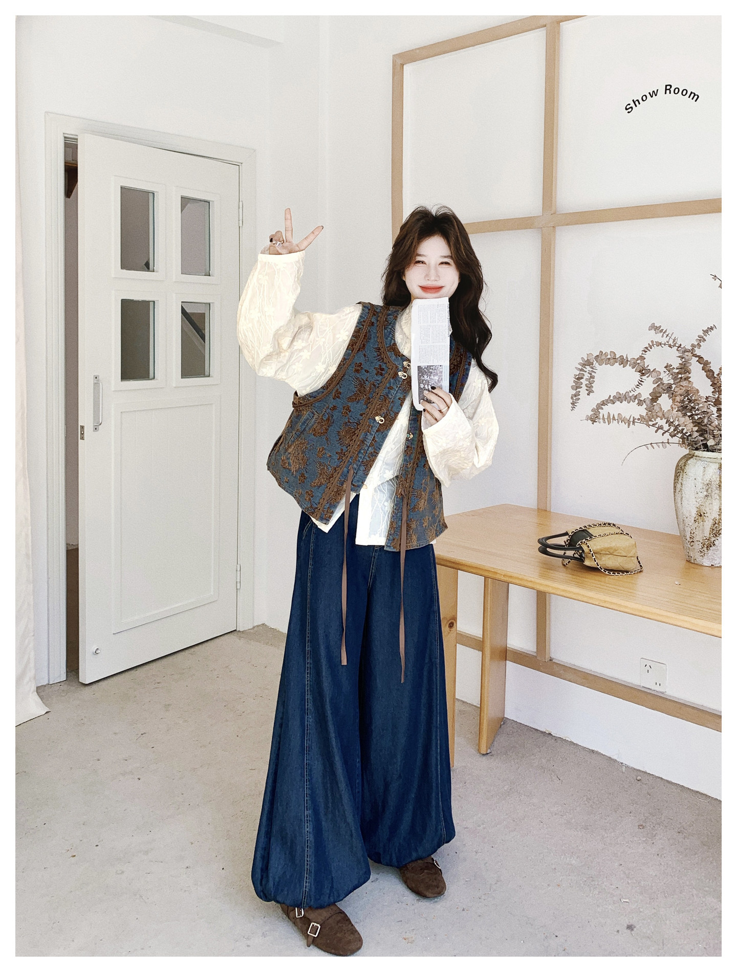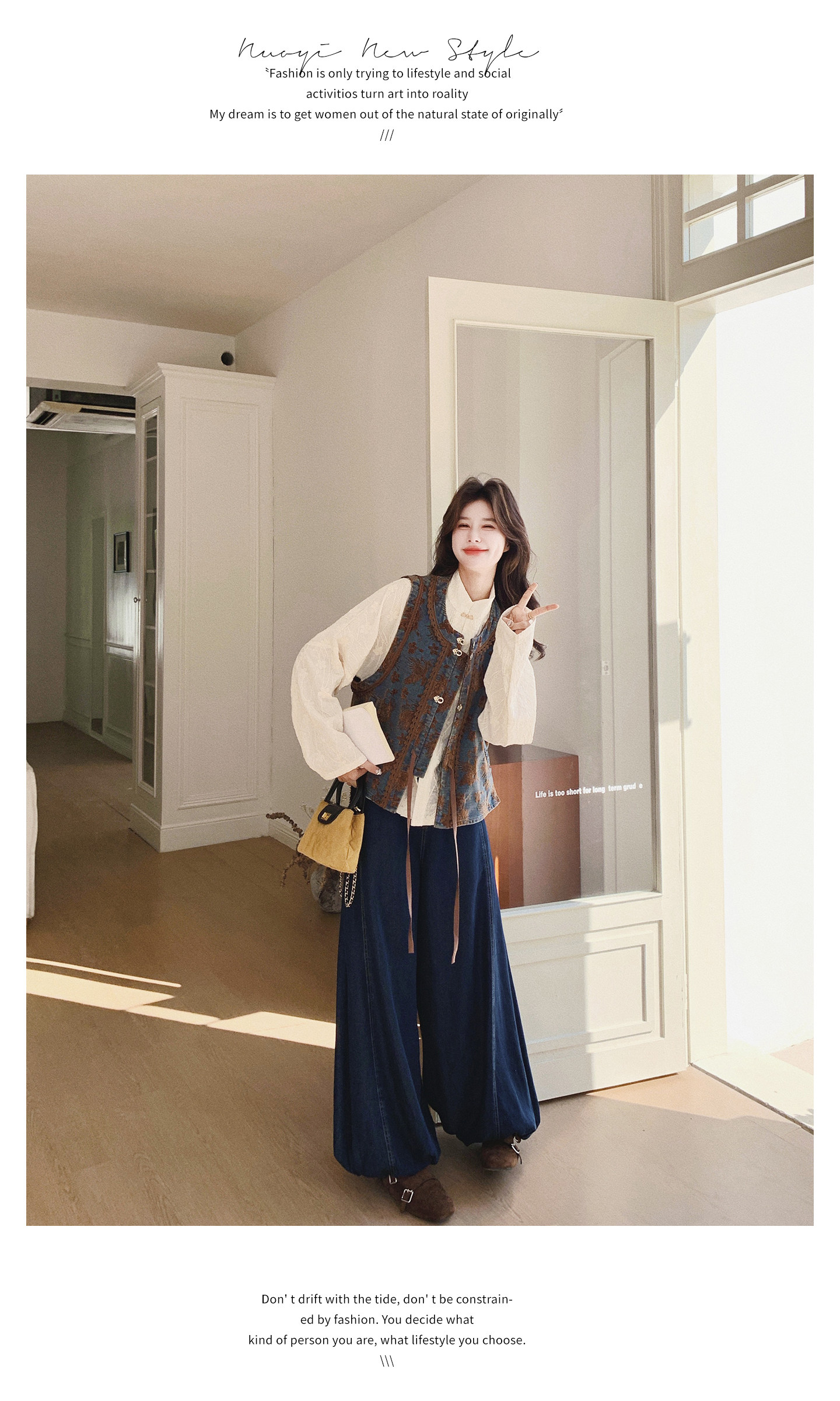 【商品名】3点セット!【セットアップ】メラードジャカード×配色 ベスト+中国風シャツ+ワイドデニムパンツ 上下セット レディース 早春・秋 サン系コーデ【SHシリーズ】