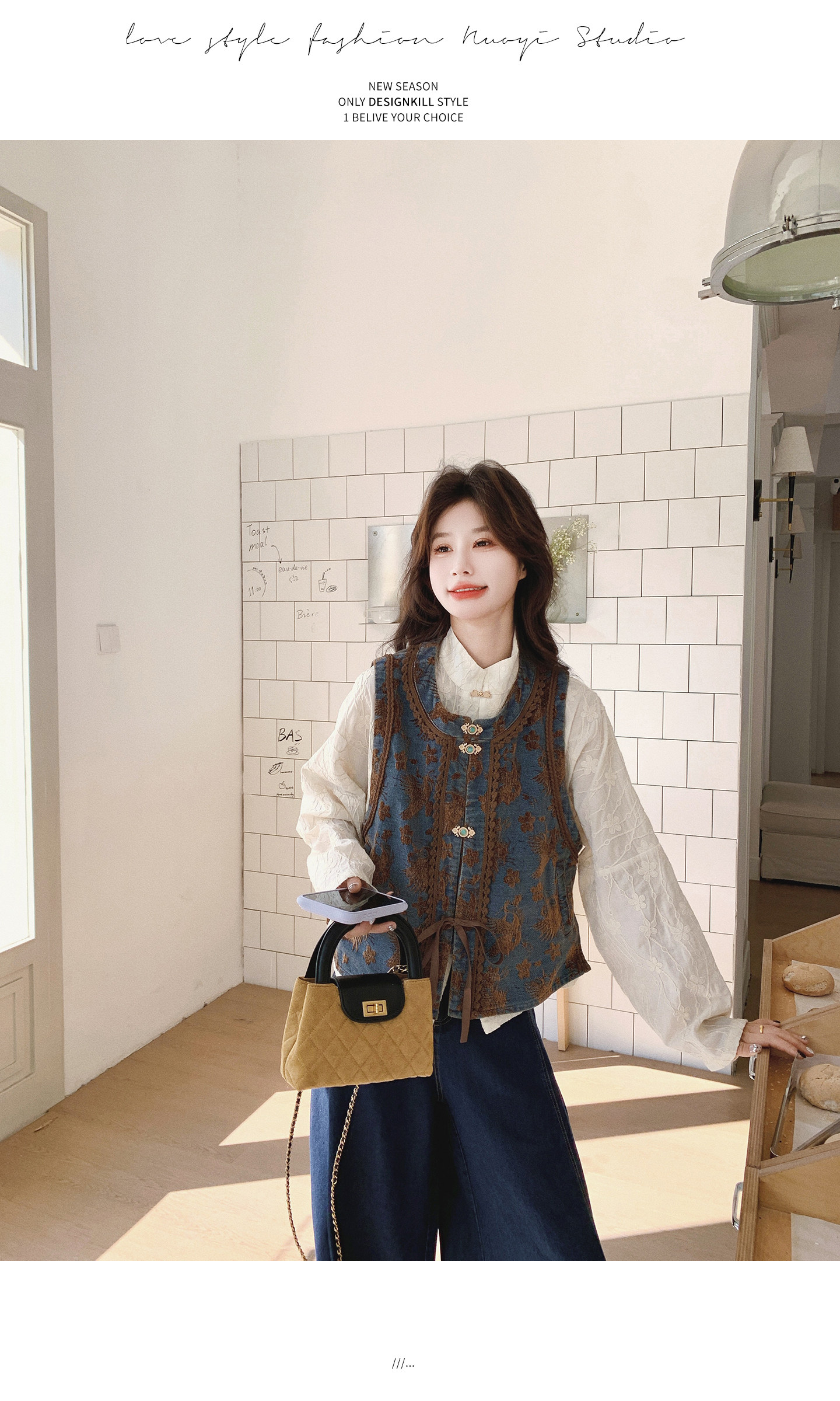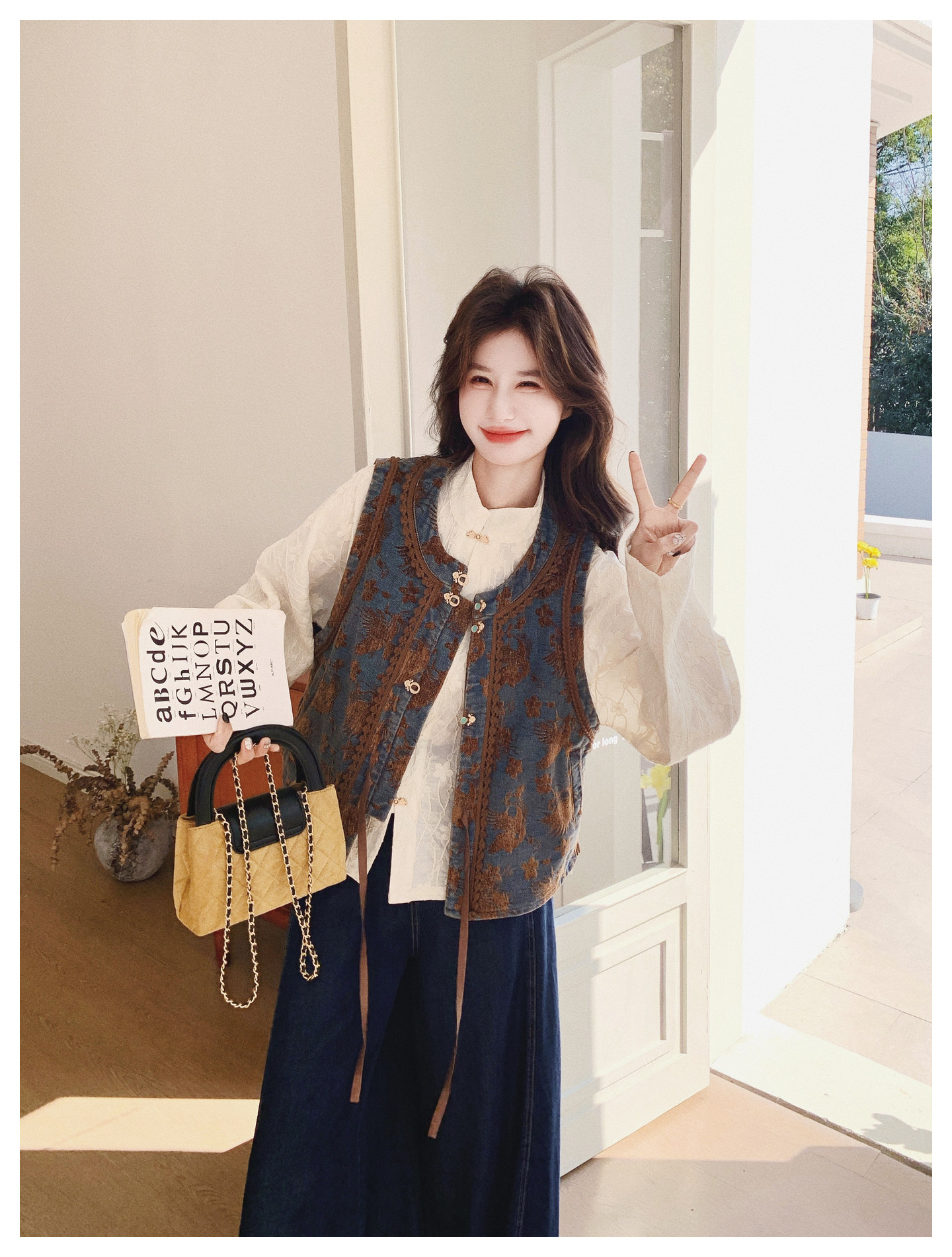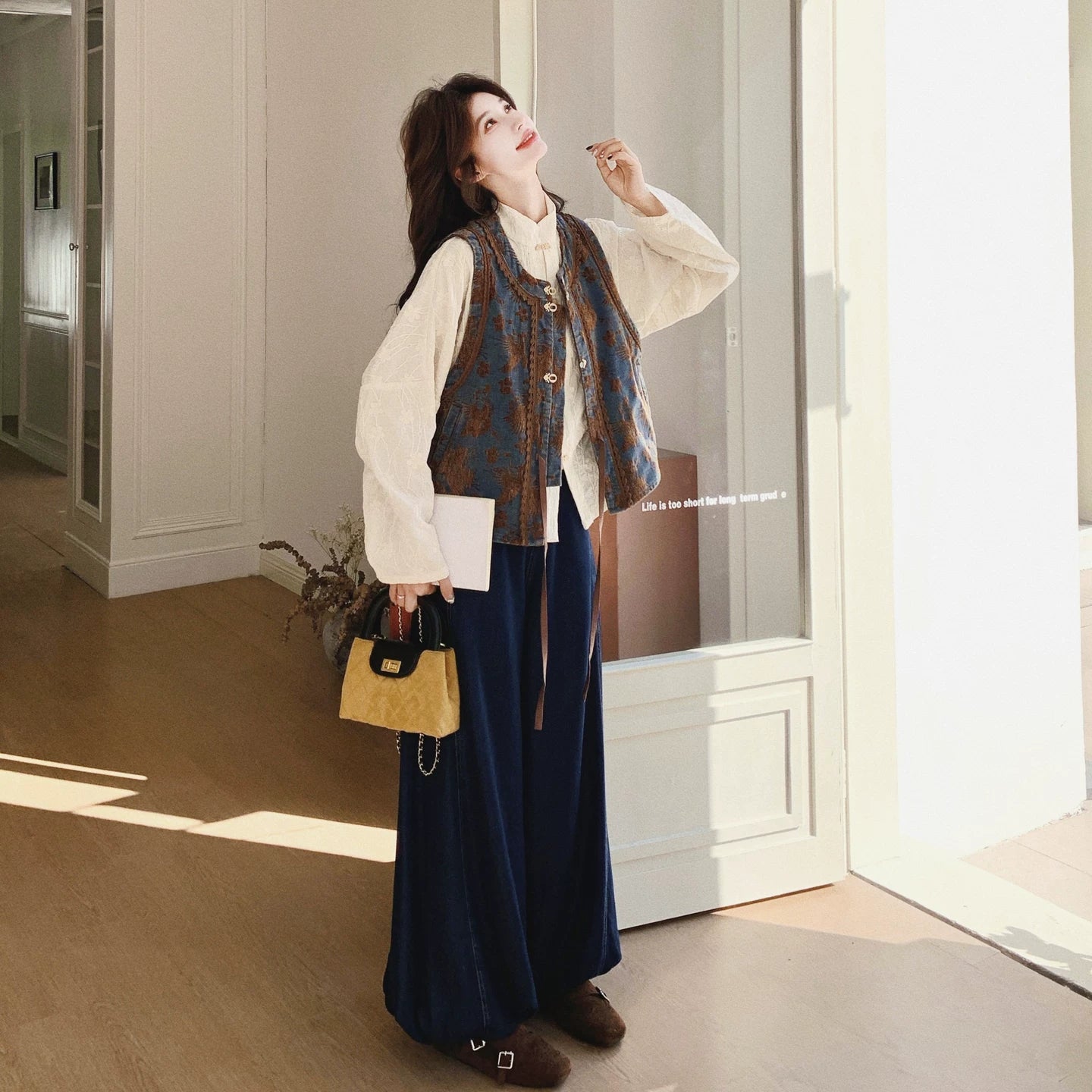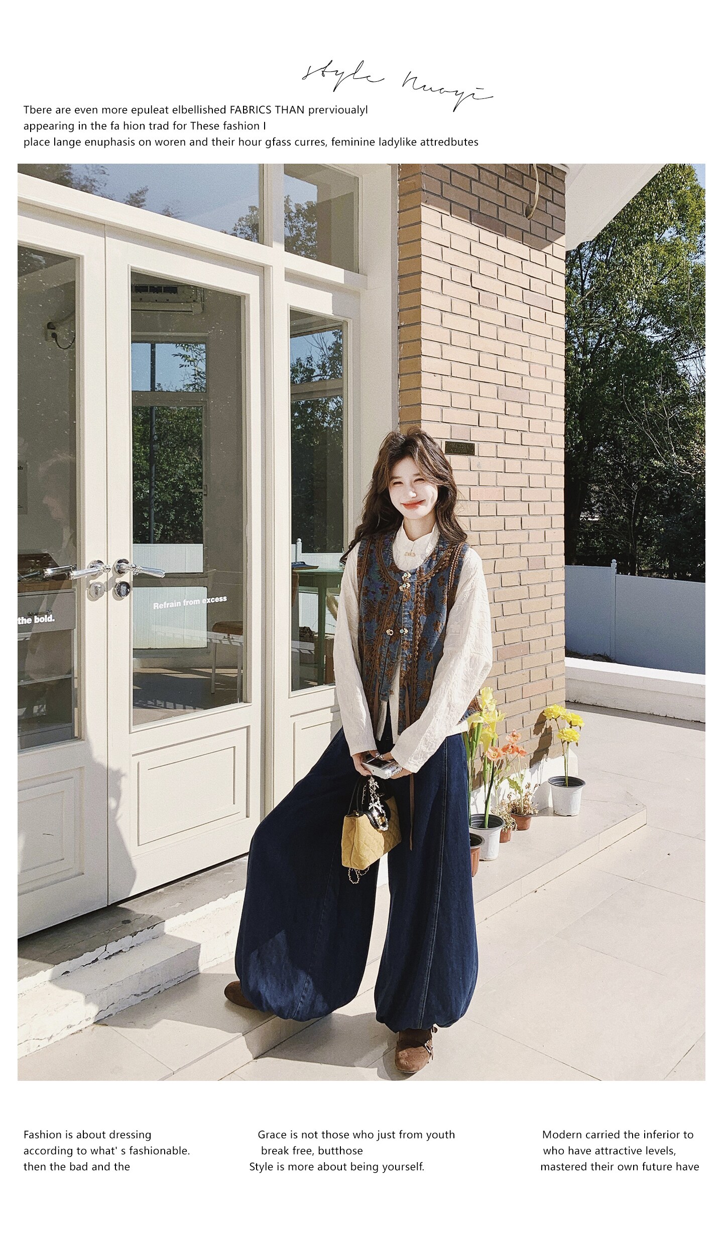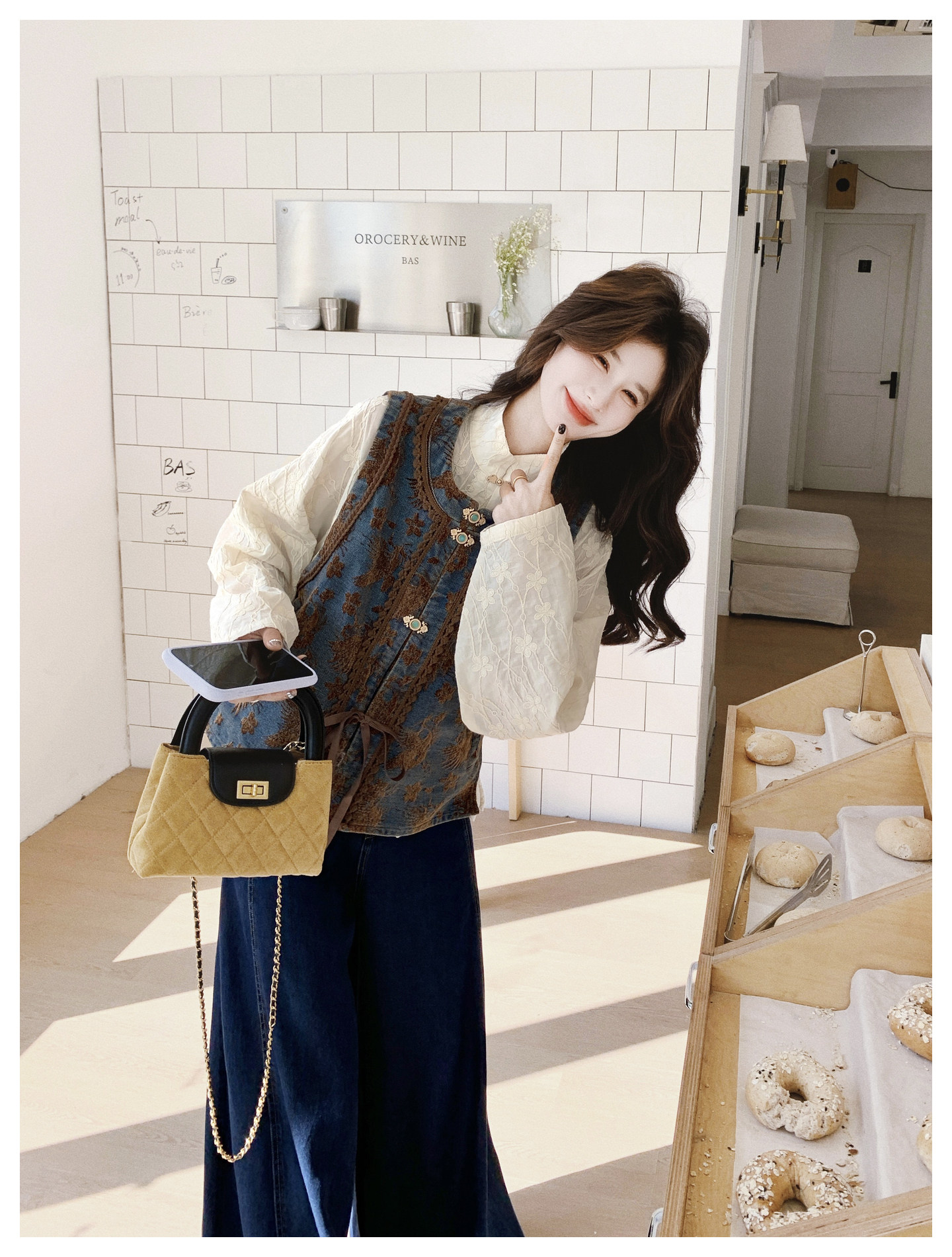 【商品名】3点セット!【セットアップ】メラードジャカード×配色 ベスト+中国風シャツ+ワイドデニムパンツ 上下セット レディース 早春・秋 サン系コーデ【SHシリーズ】