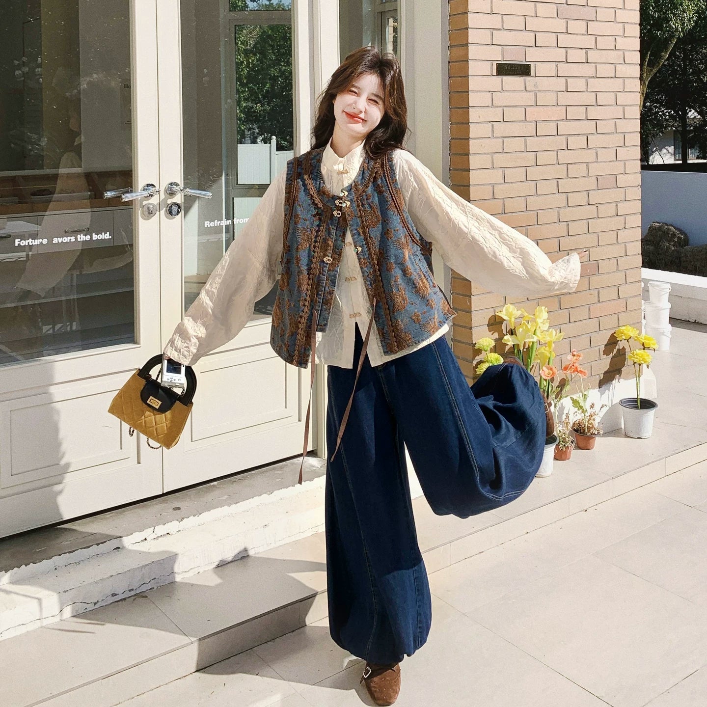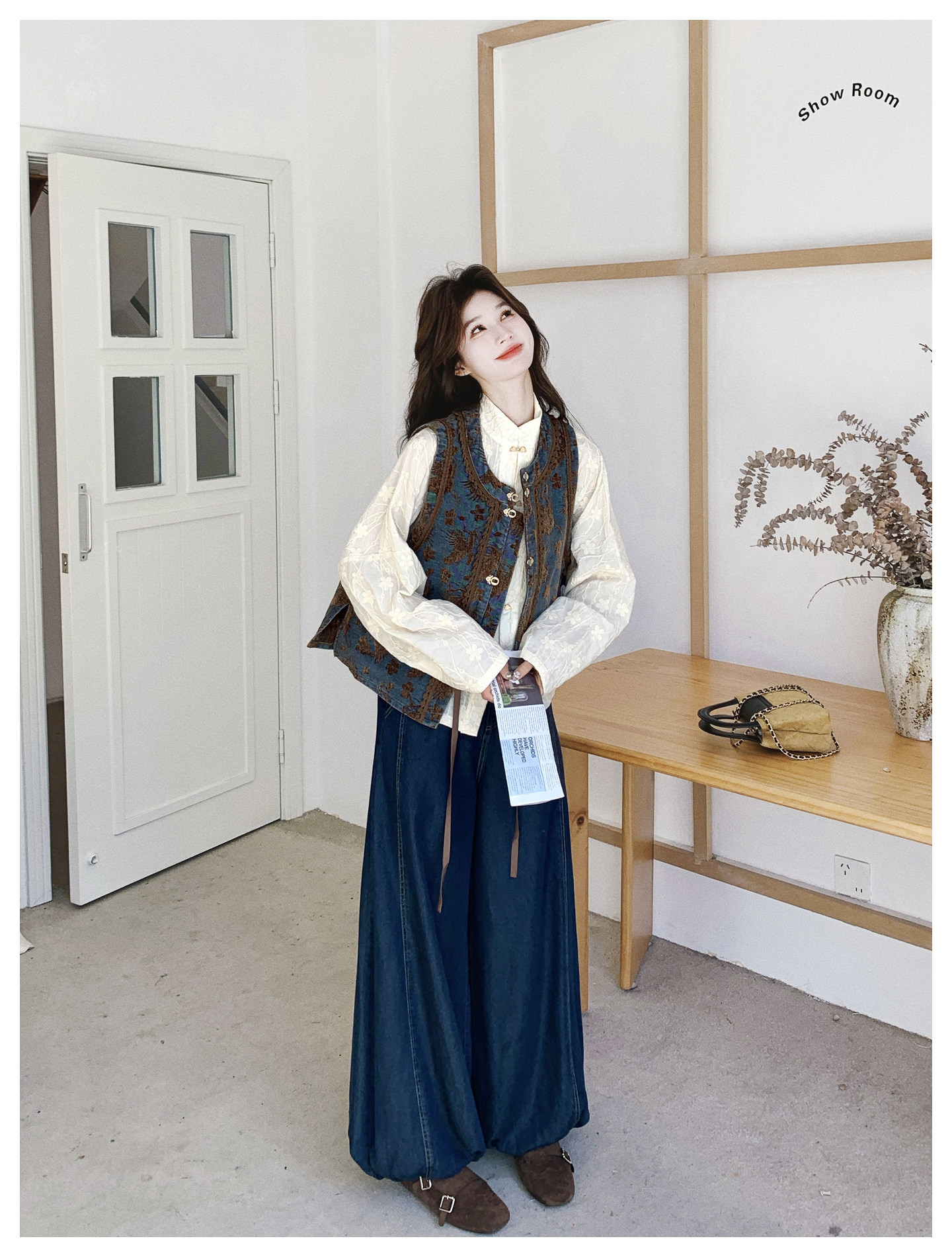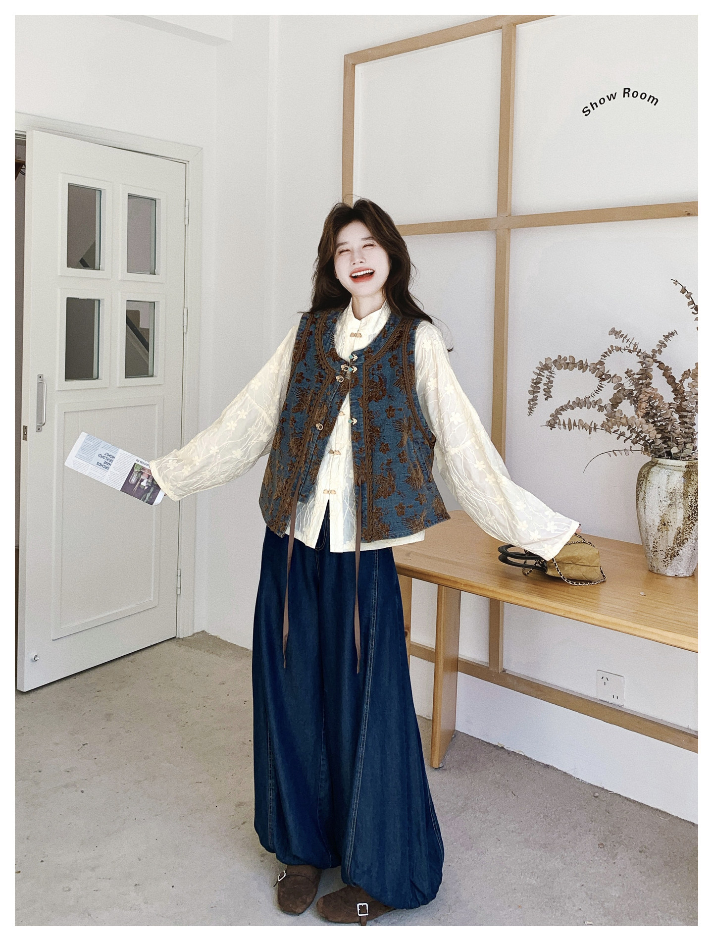3点セット!【セットアップ】メラードジャカード×配色 ベスト+中国風シャツ+ワイドデニムパンツ 上下セット レディース 早春・秋 サン系コーデ【SHシリーズ】