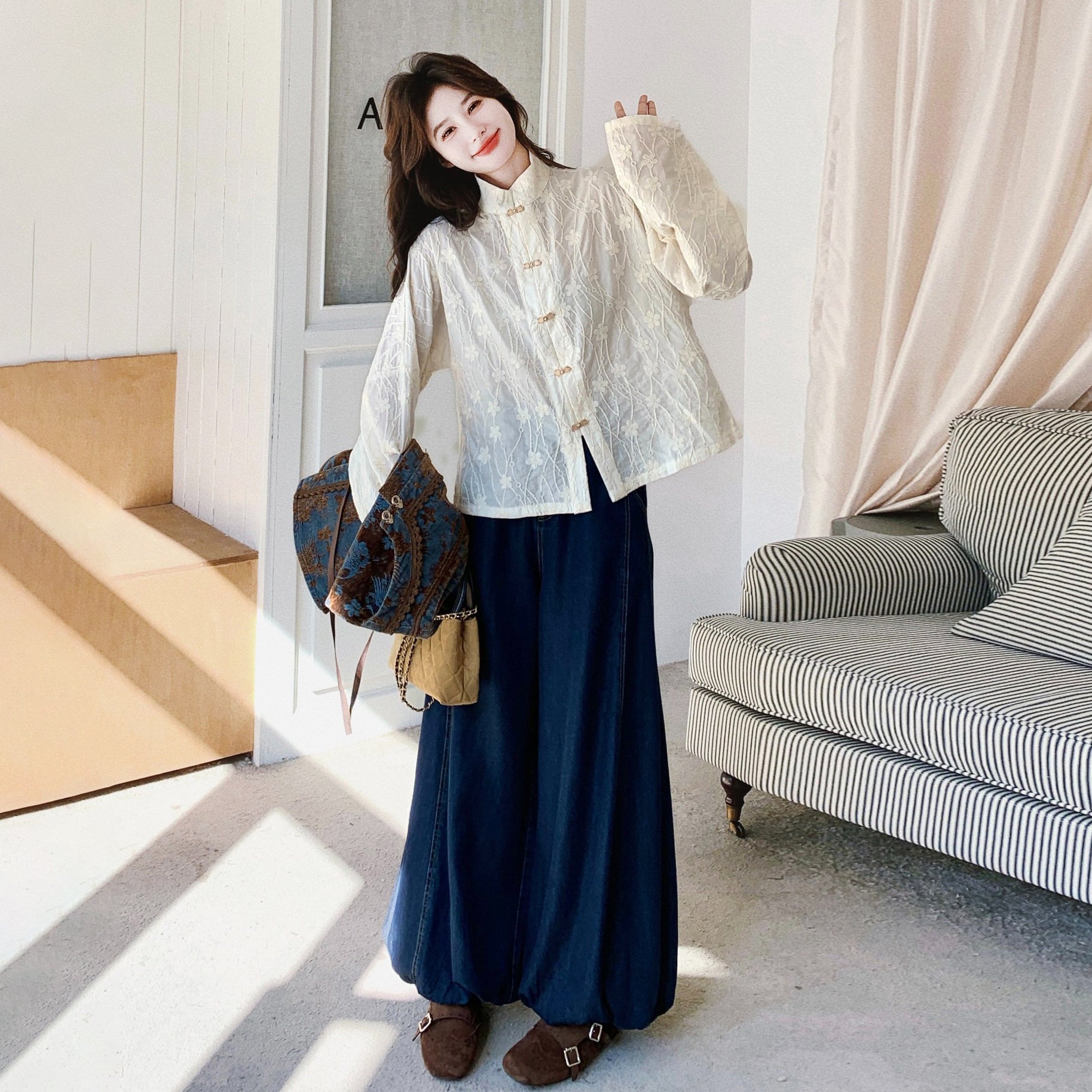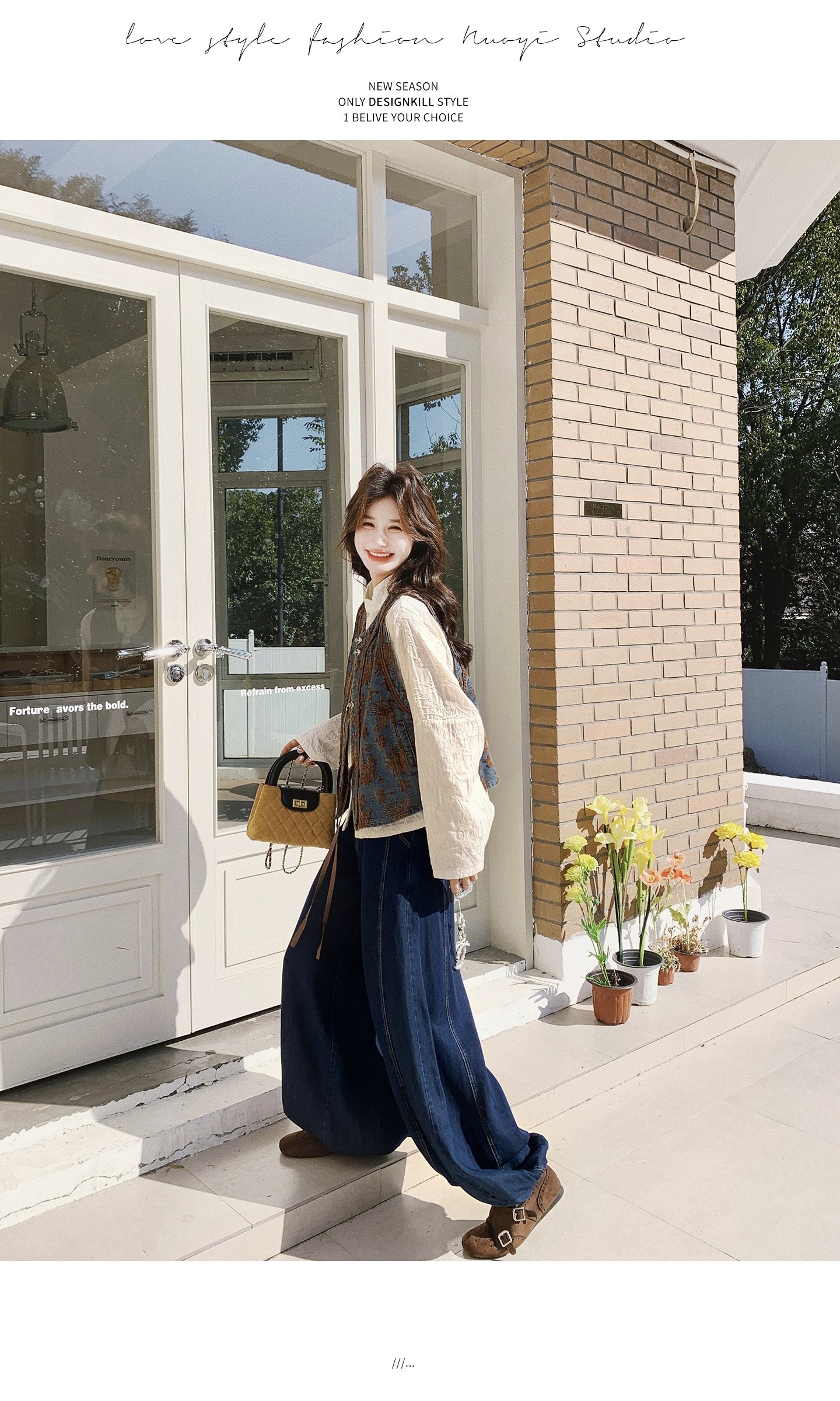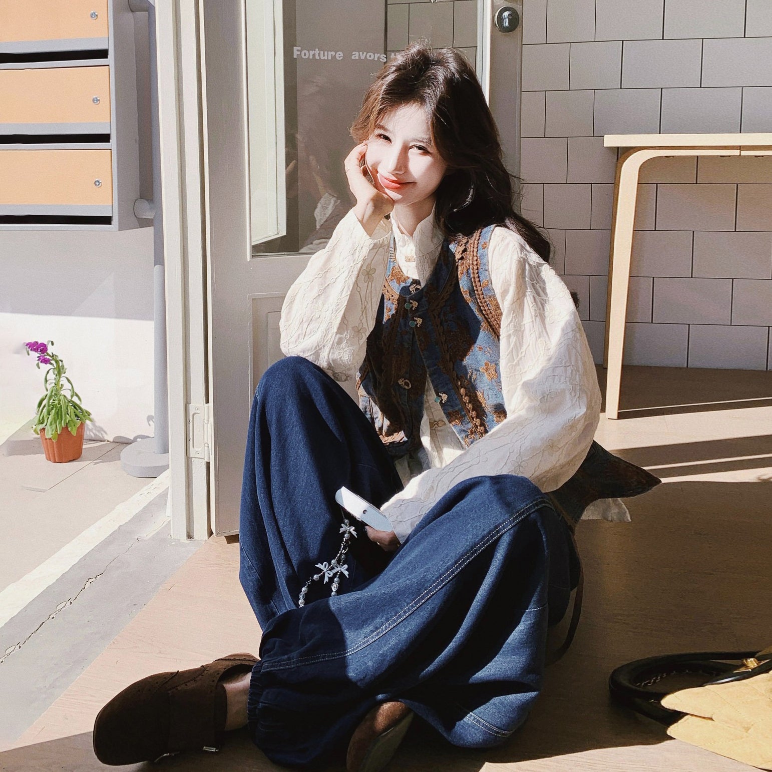 3点セット!【セットアップ】メラードジャカード×配色 ベスト+中国風シャツ+ワイドデニムパンツ 上下セット レディース 早春・秋 サン系コーデ【SHシリーズ】