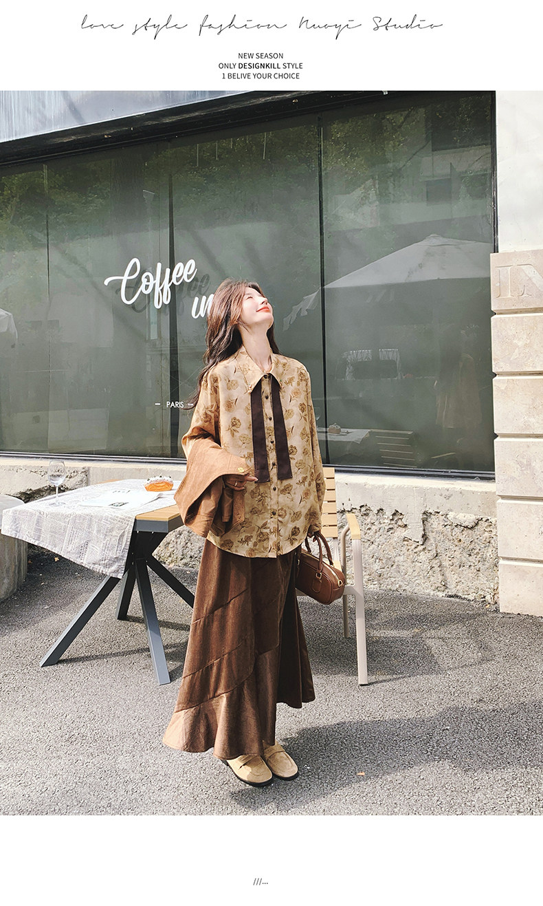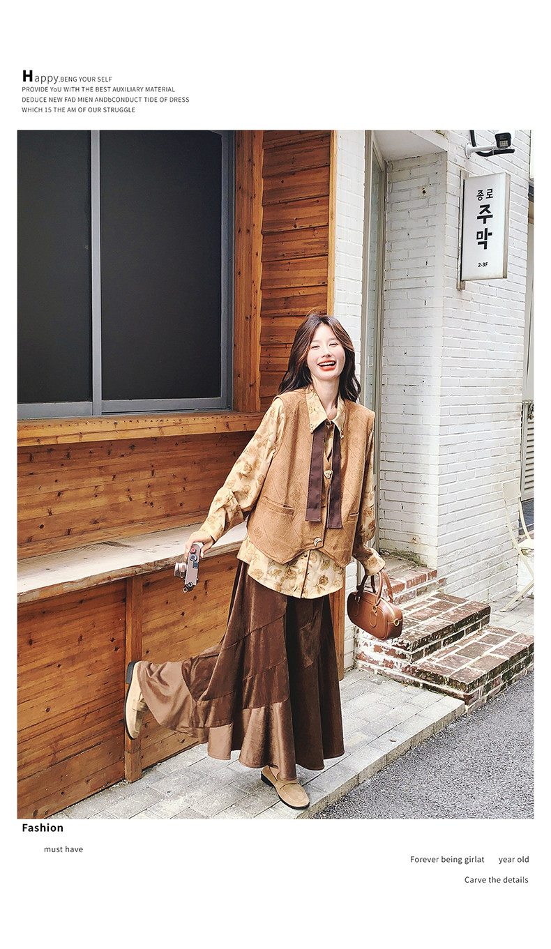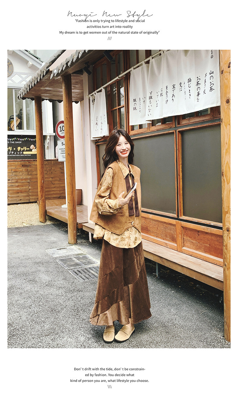 【商品名】 3点セット!【セットアップ 】春新作メラードスエードベスト+レトロプリントシャツ+スカート 上下セット 文芸風コーデ【SHシリーズ】