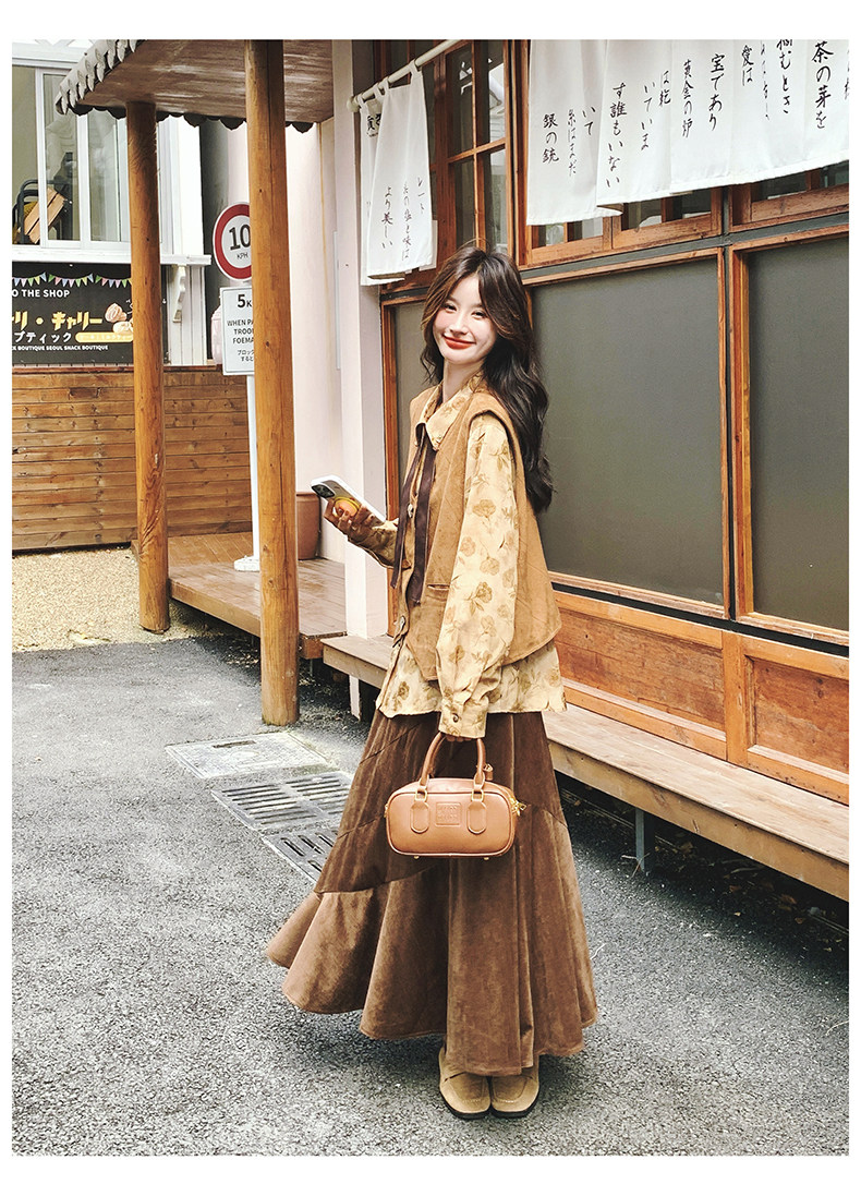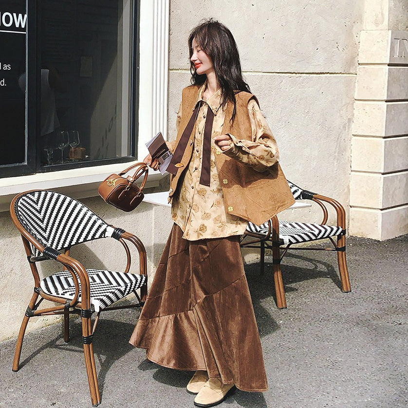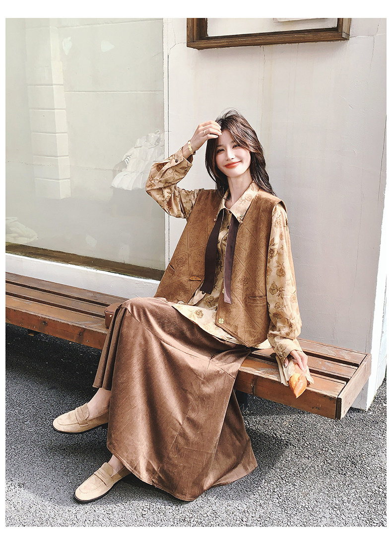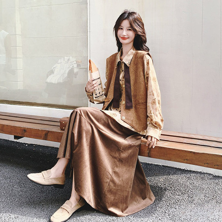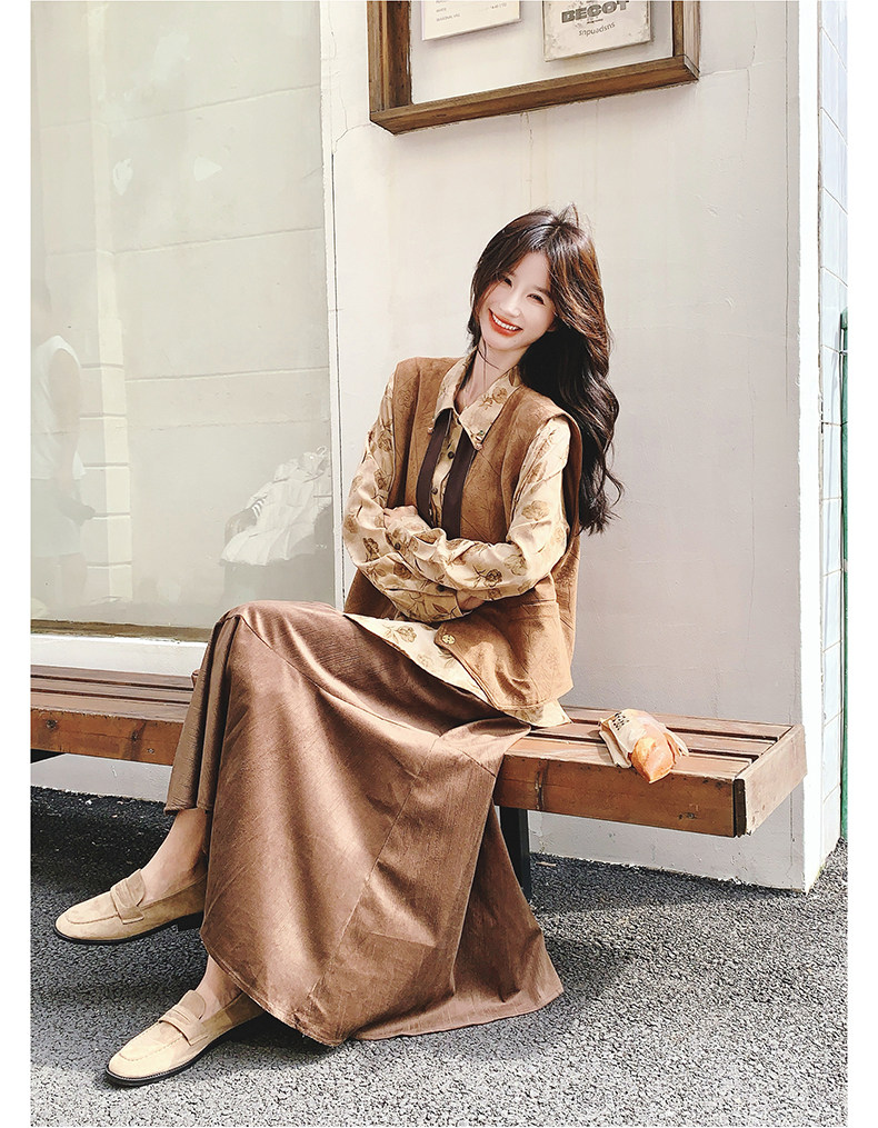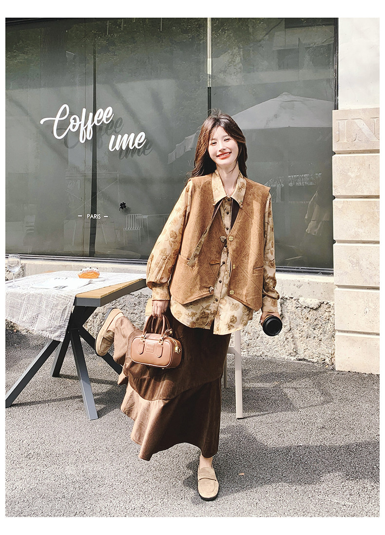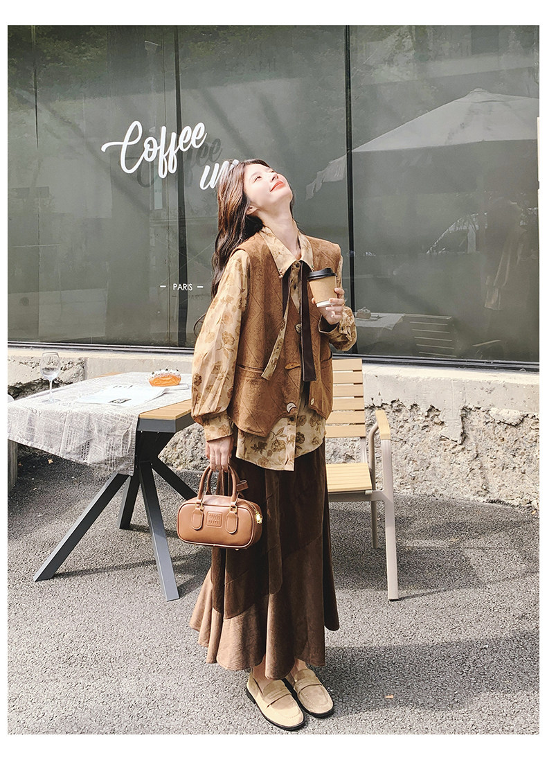 3点セット!【セットアップ 】春新作メラードスエードベスト+レトロプリントシャツ+スカート 上下セット 文芸風コーデ【SHシリーズ】