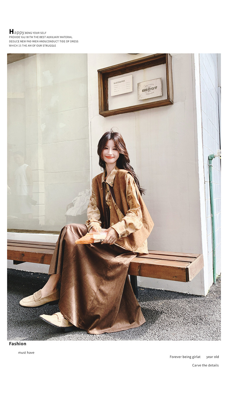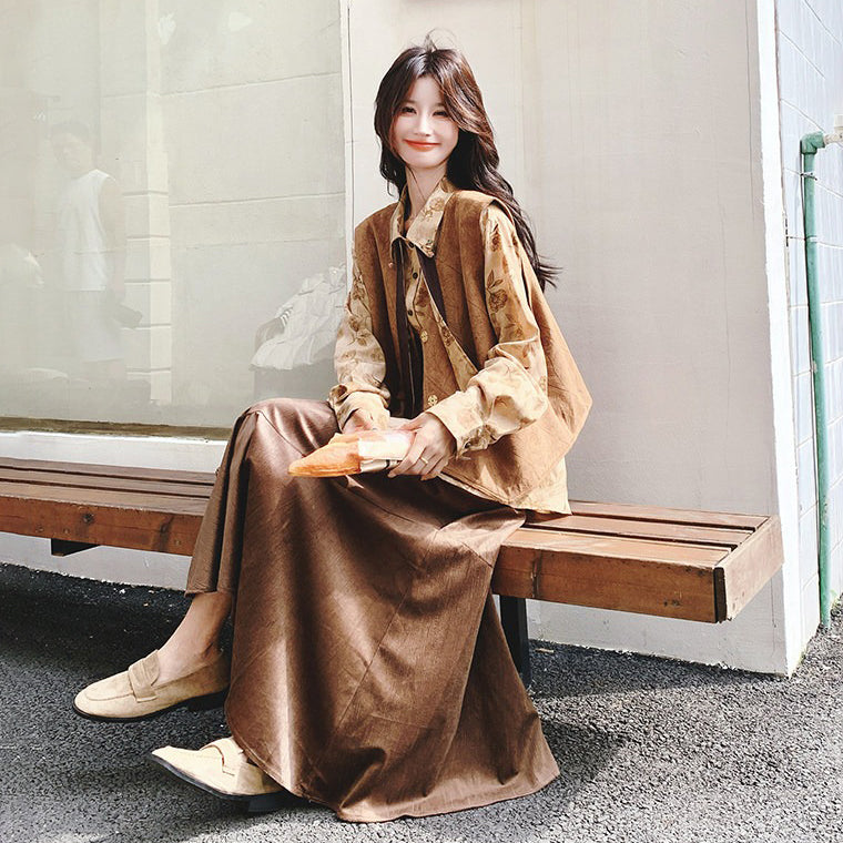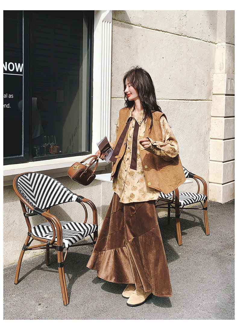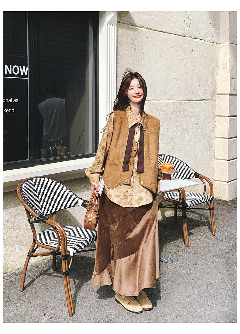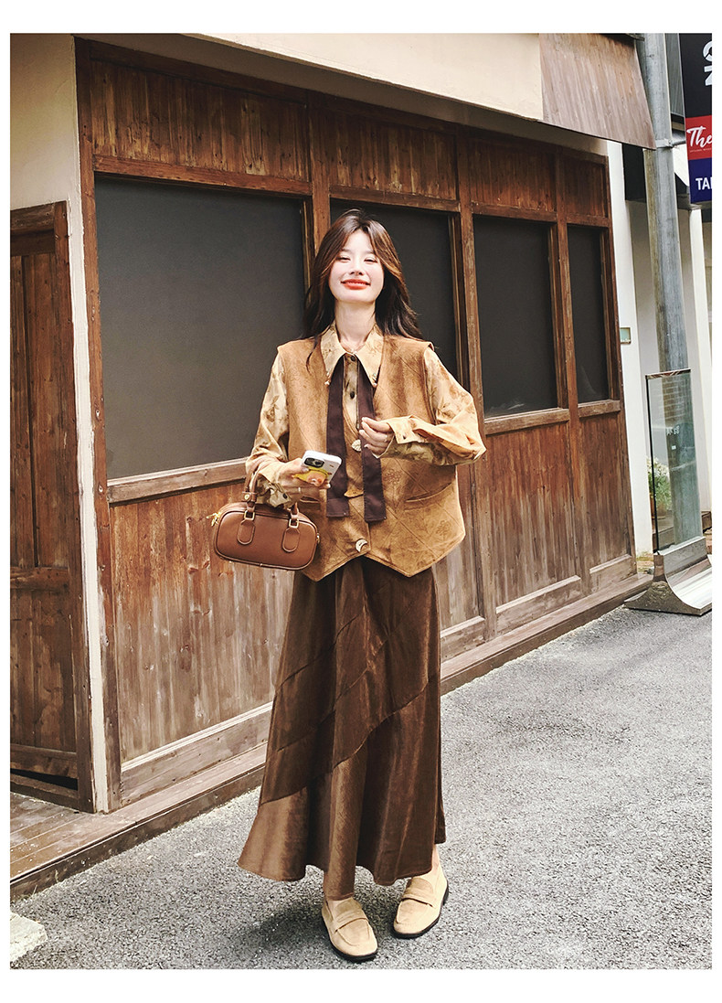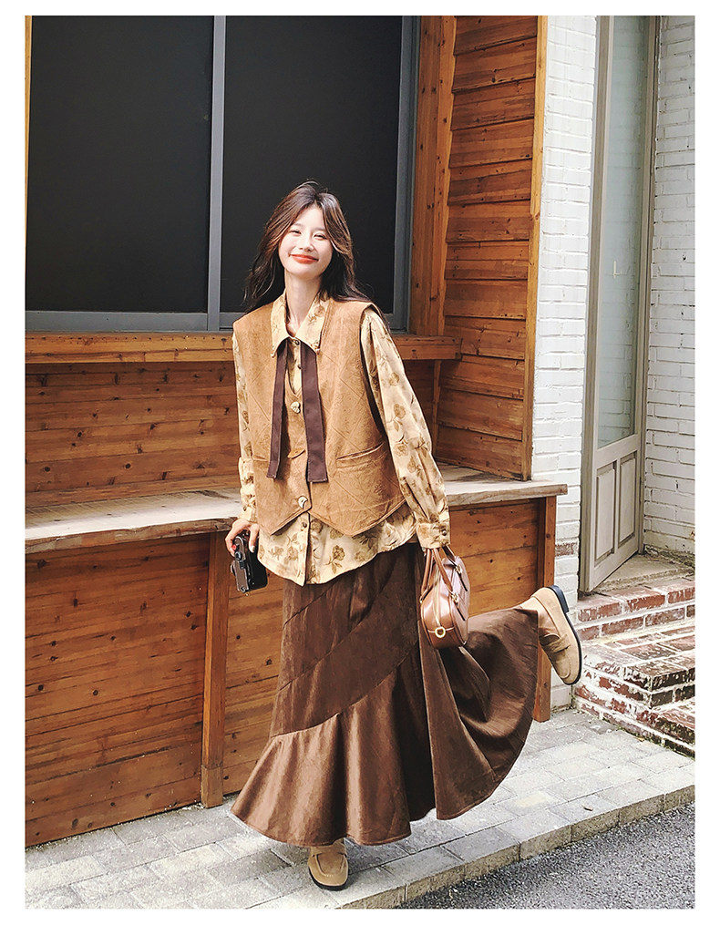 3点セット!【セットアップ 】春新作メラードスエードベスト+レトロプリントシャツ+スカート 上下セット 文芸風コーデ【SHシリーズ】