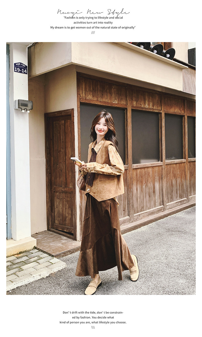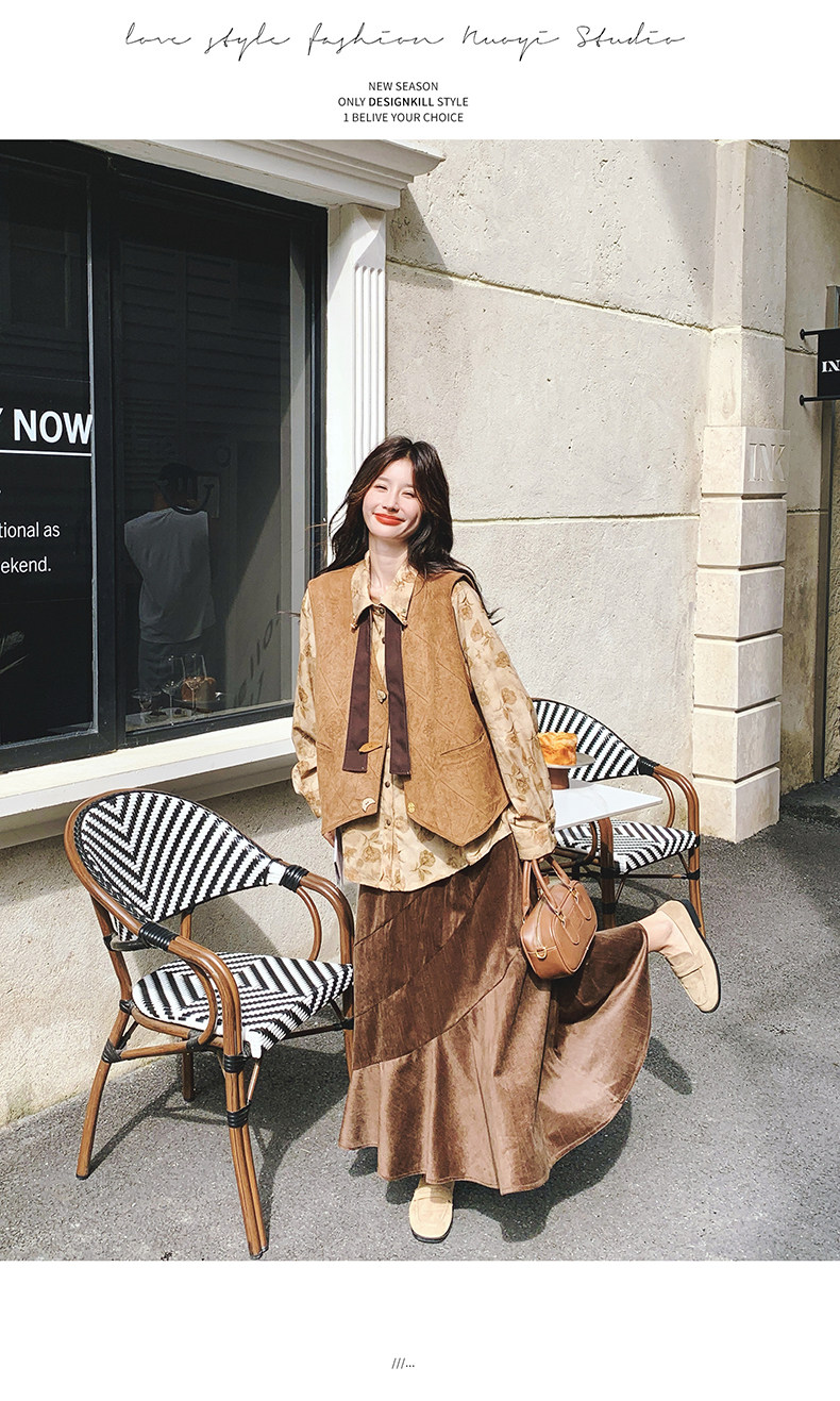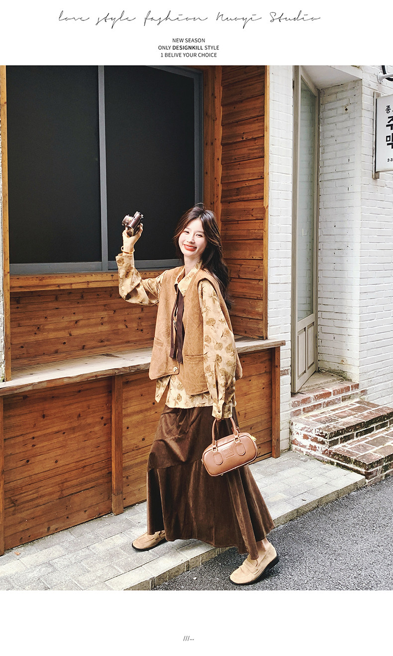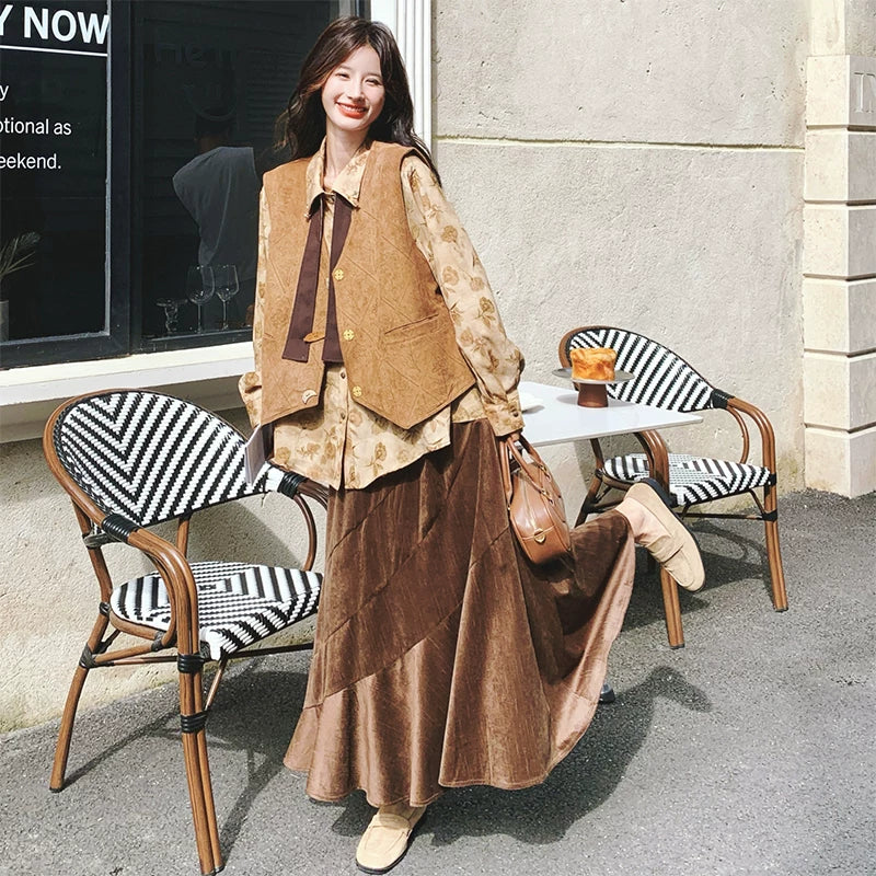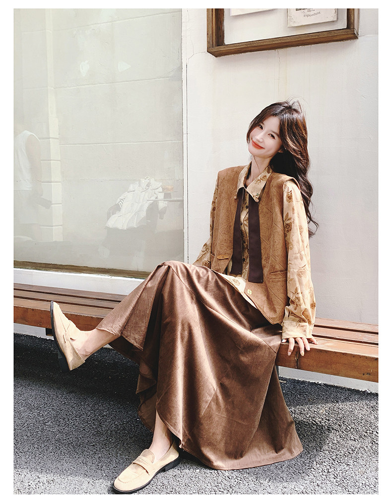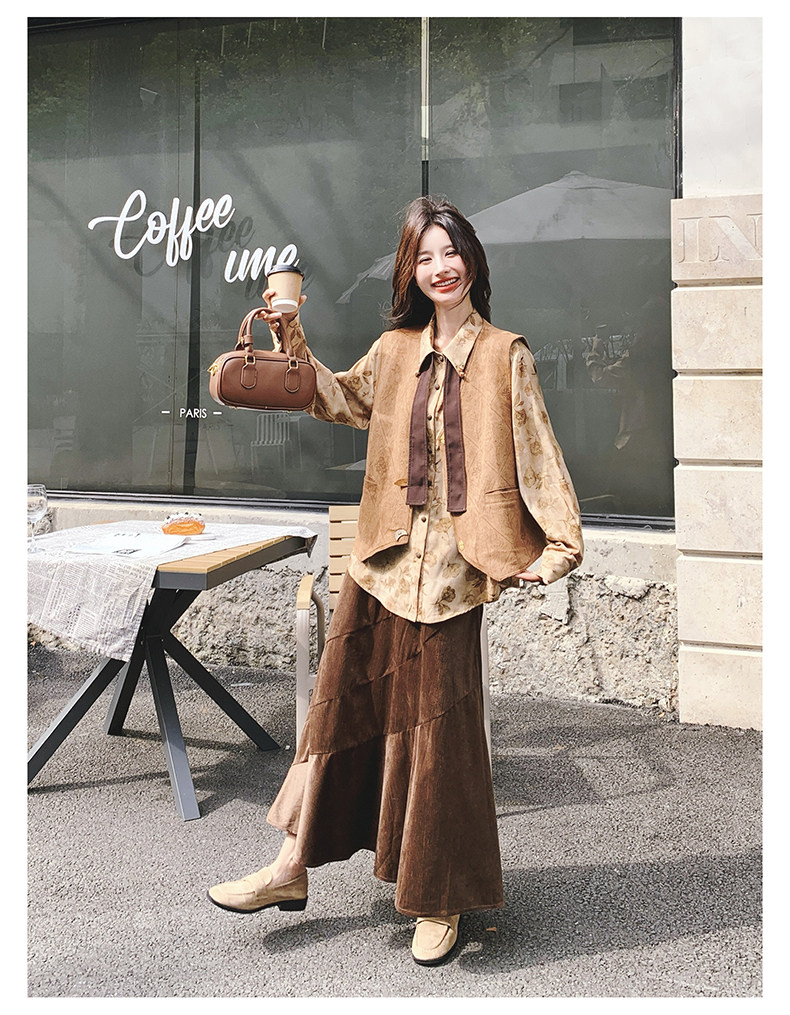 3点セット!【セットアップ 】春新作メラードスエードベスト+レトロプリントシャツ+スカート 上下セット 文芸風コーデ【SHシリーズ】