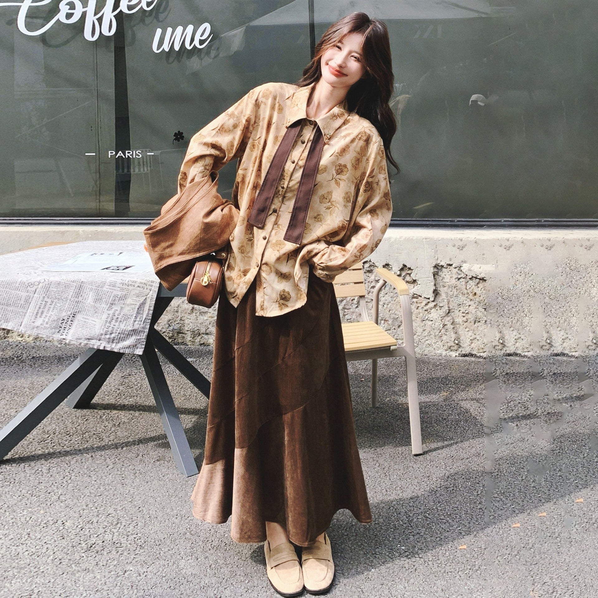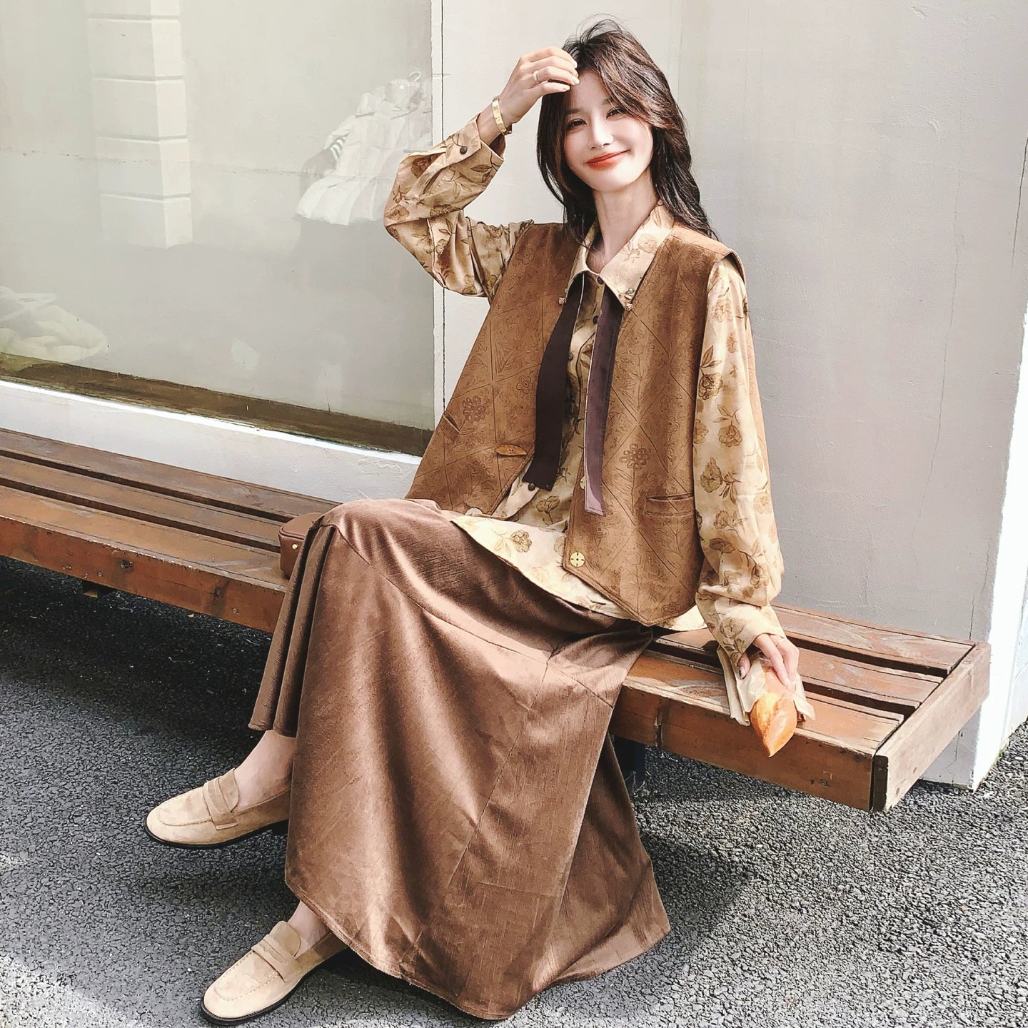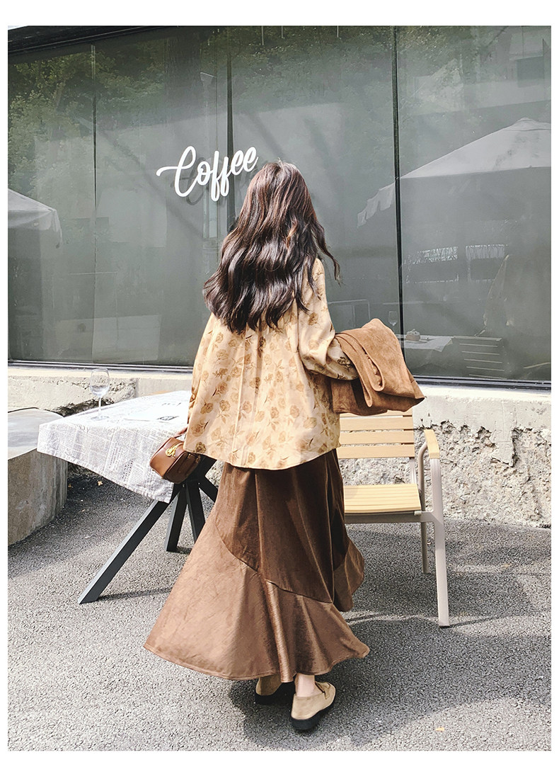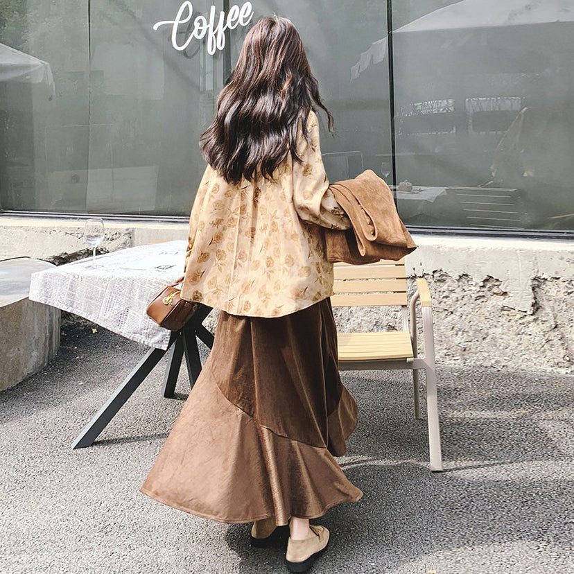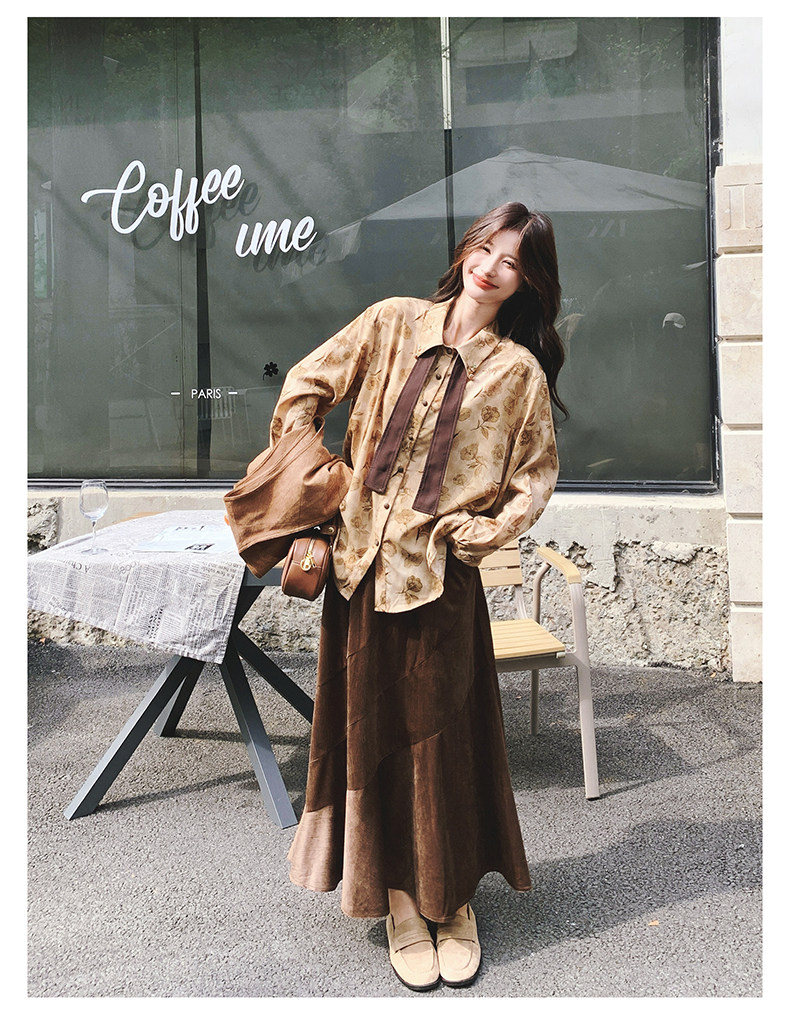 3点セット!【セットアップ 】春新作メラードスエードベスト+レトロプリントシャツ+スカート 上下セット 文芸風コーデ【SHシリーズ】