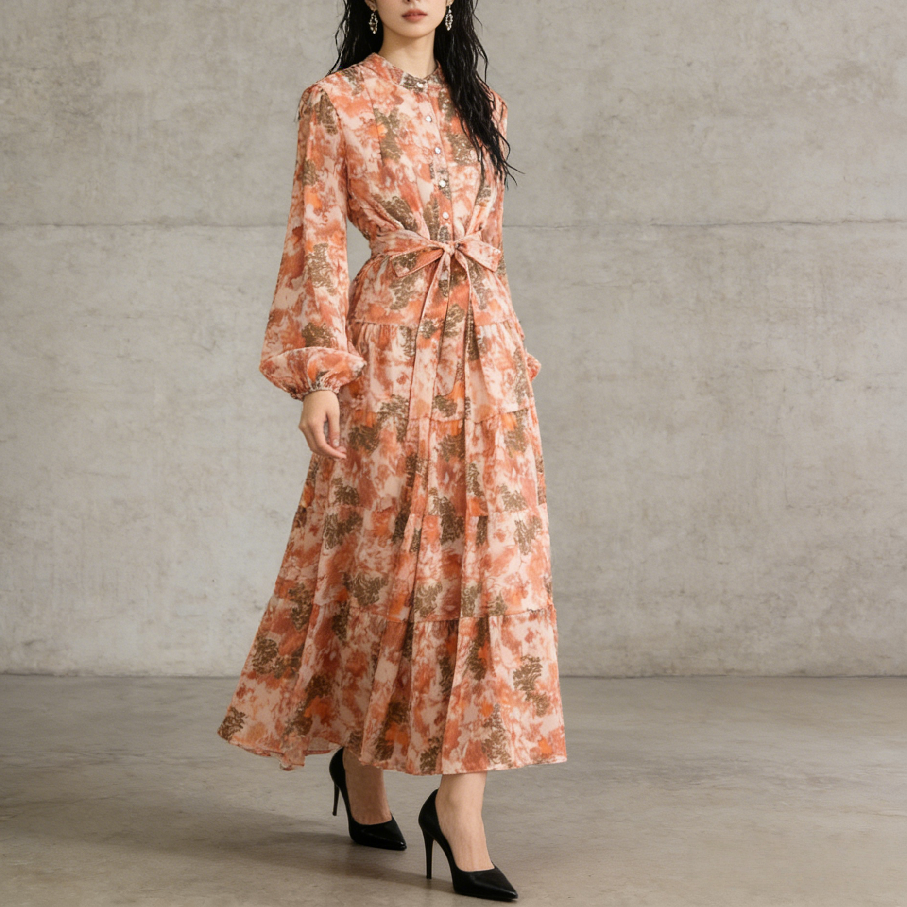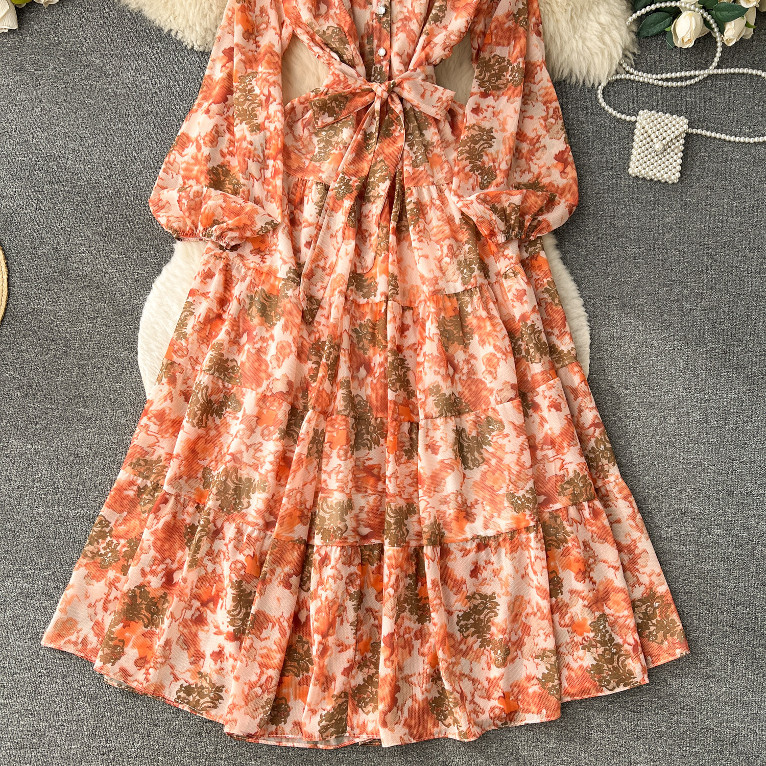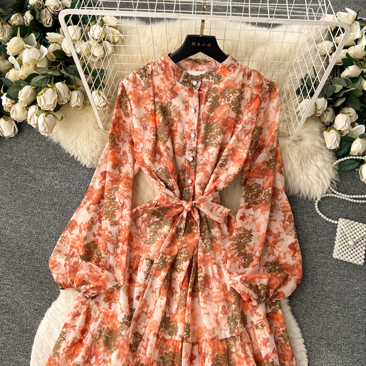 【ワンピース】レディライク シングルボタン ベルト付き フレア 花柄 長袖 ワンピース【SHシリーズ】