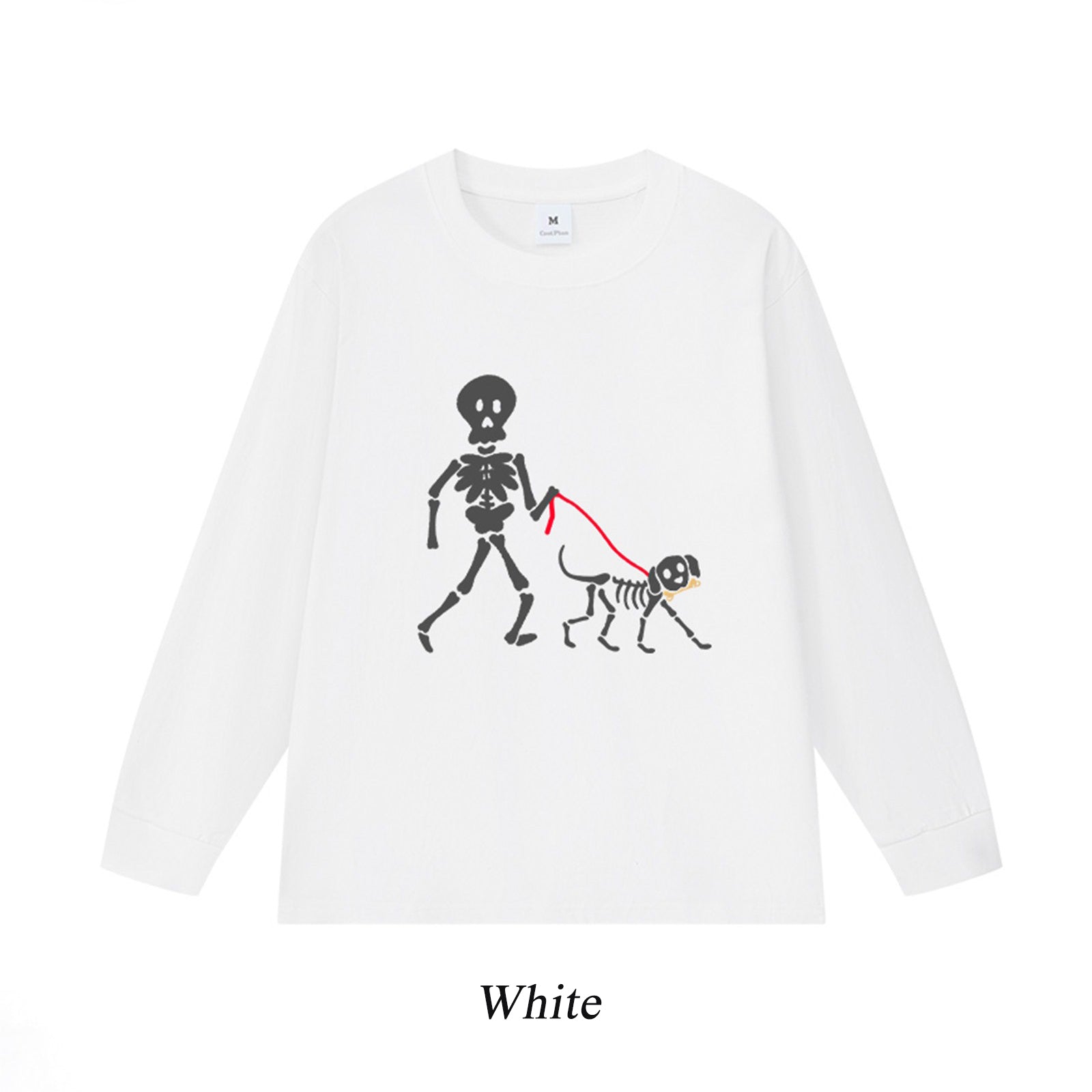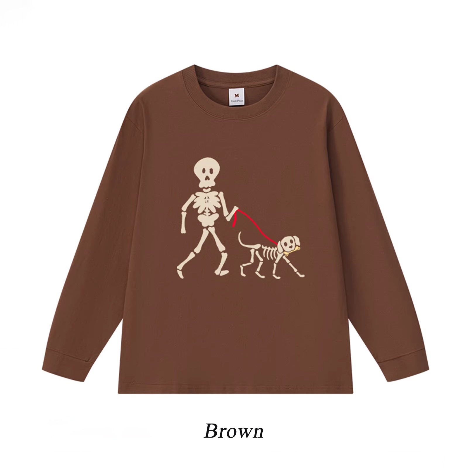 6カラー | S~3XL【トップス】スカル犬 散歩プリント Tシャツ 長袖 ユニセックス ペットオーナー向け カジュアル【FCシリーズ】