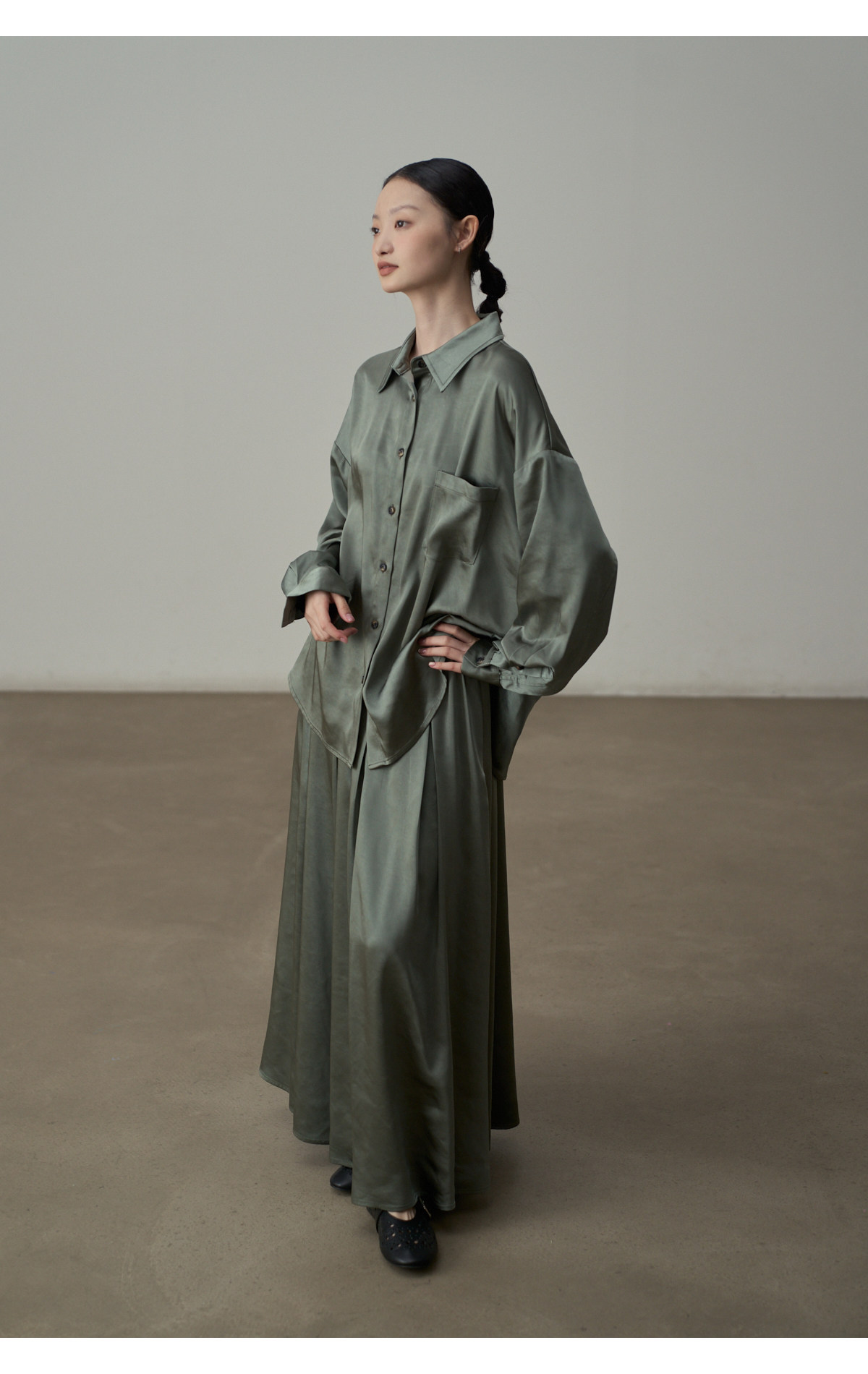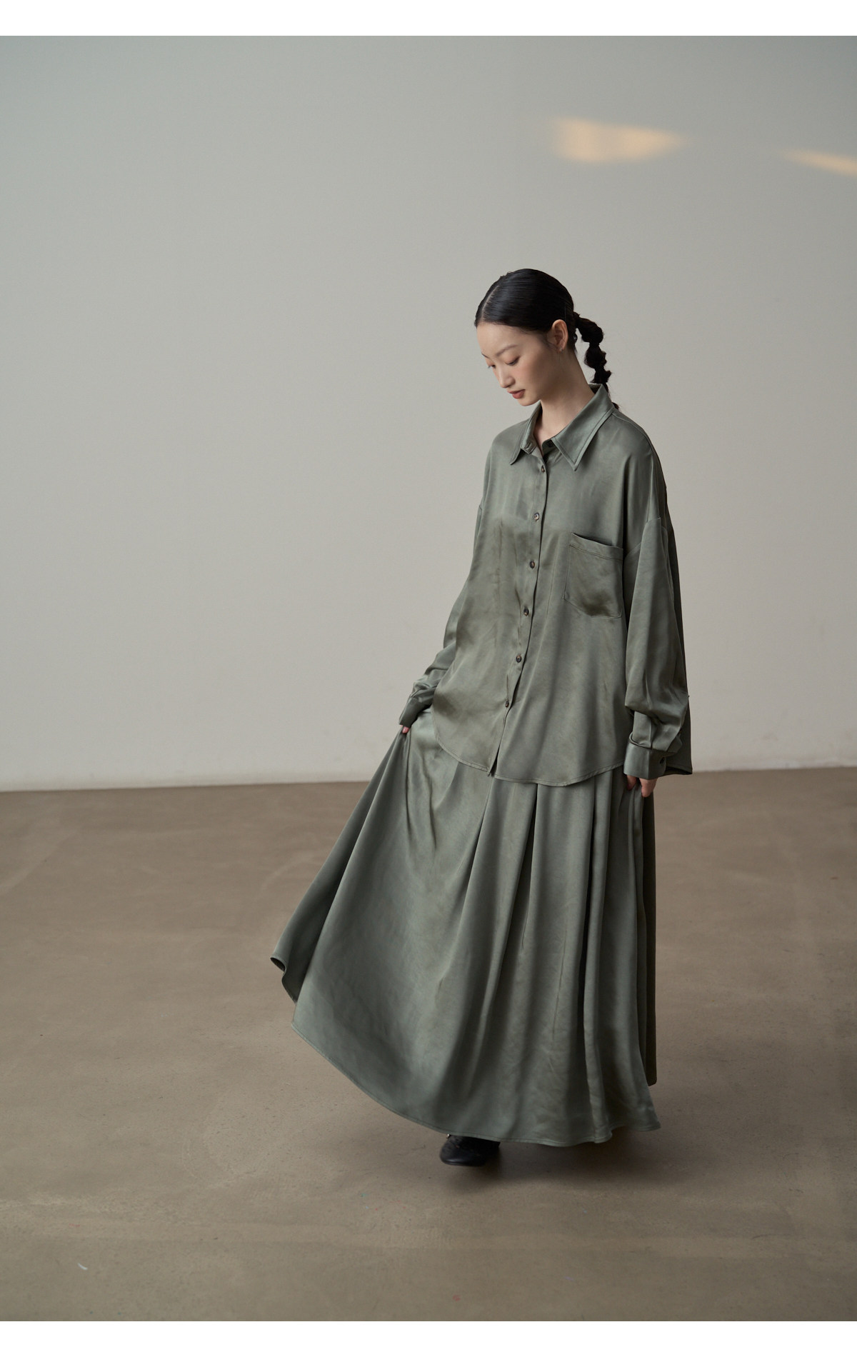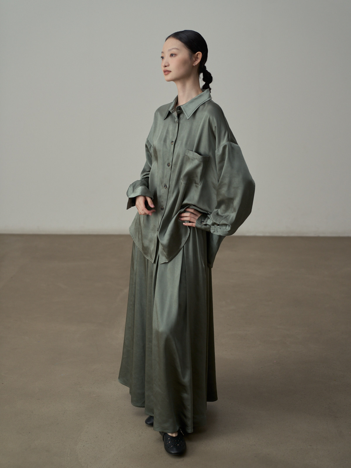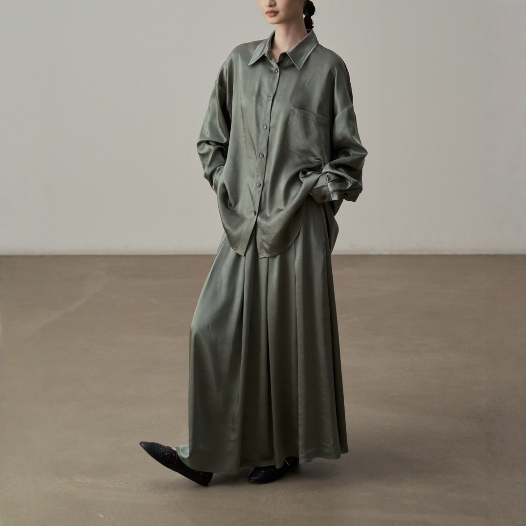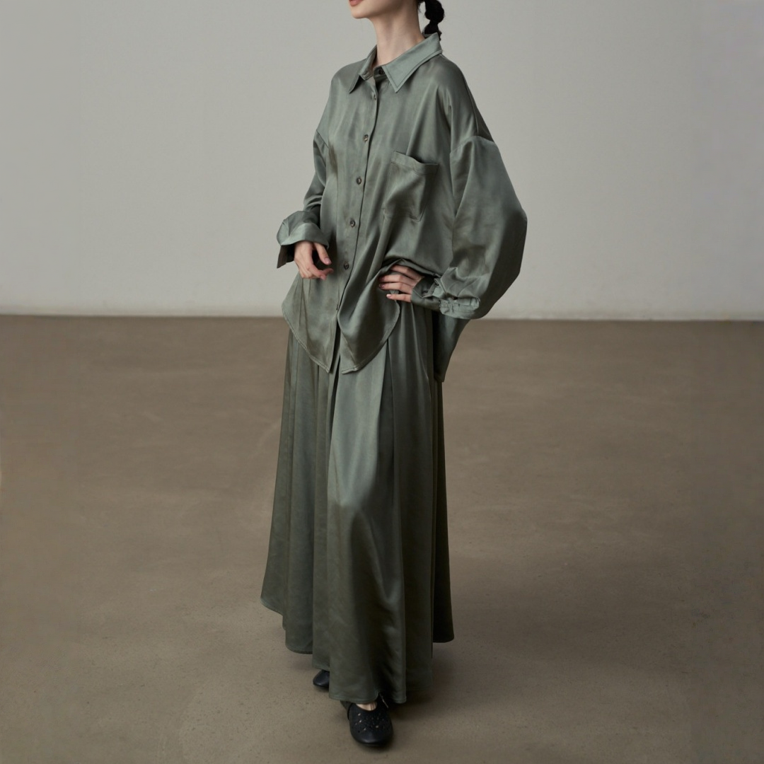 【セットアップ】【単品注文】サテン ゆったり シャツ + フレアプリーツスカート 2点上下セット 【JZシリーズ】