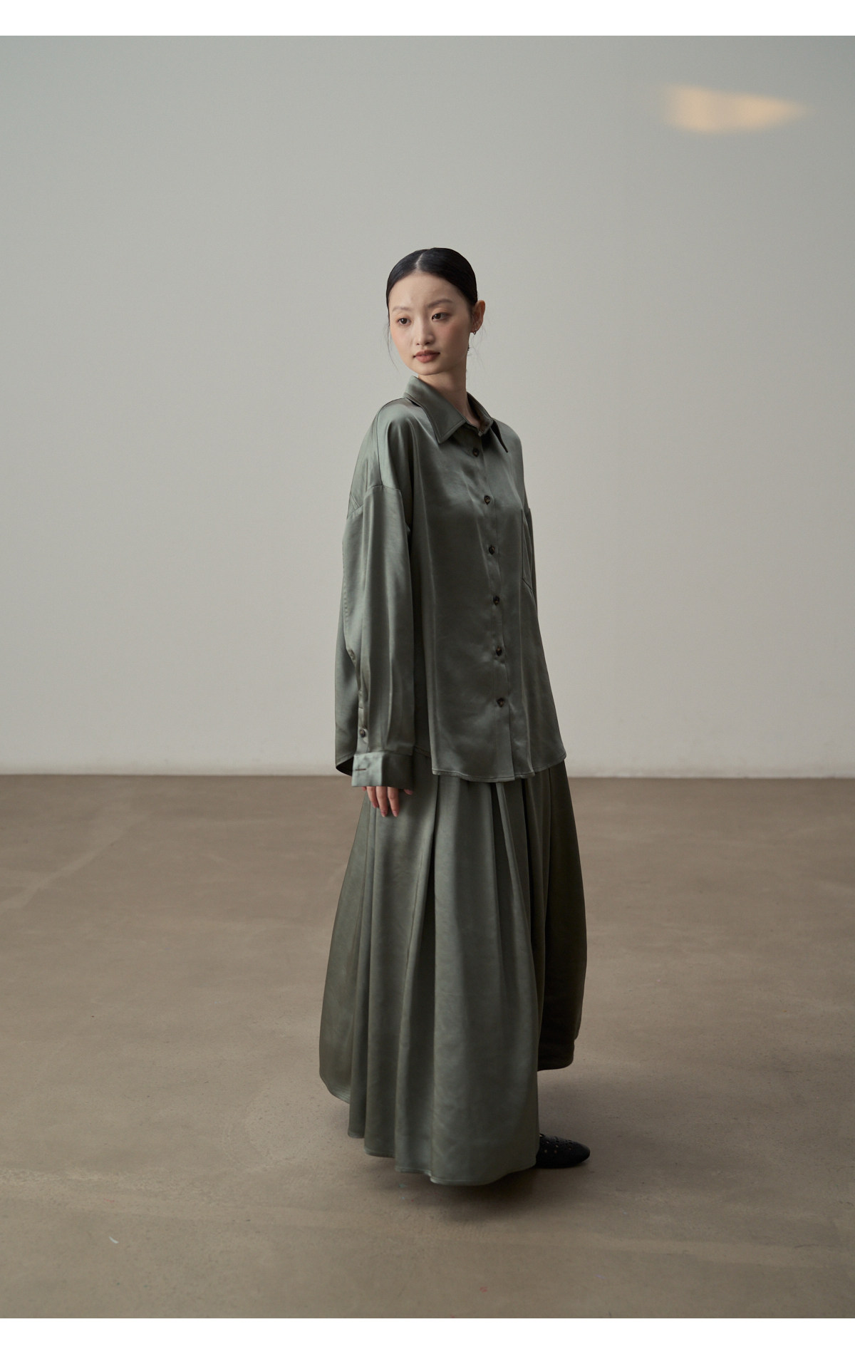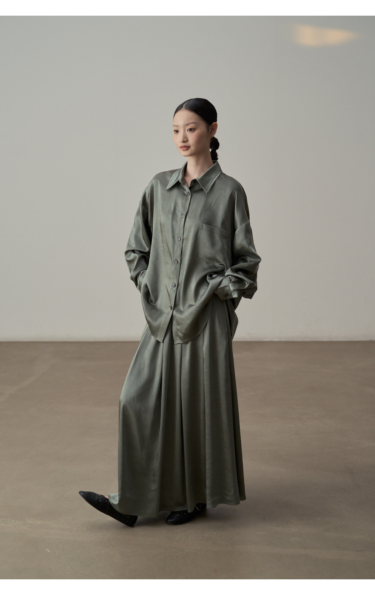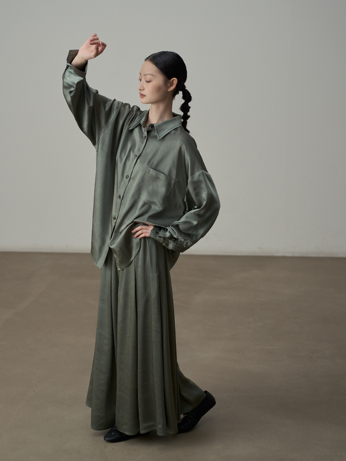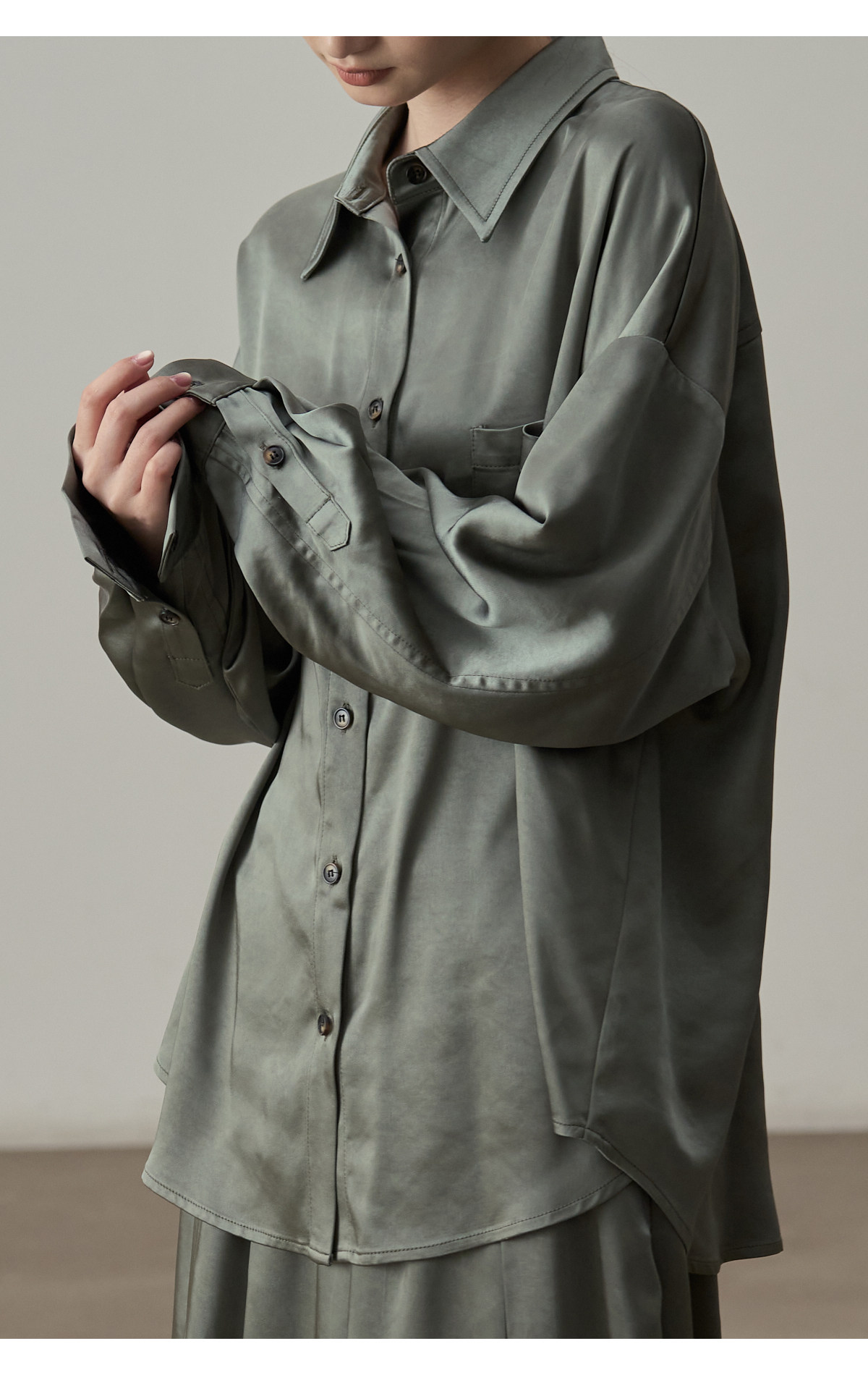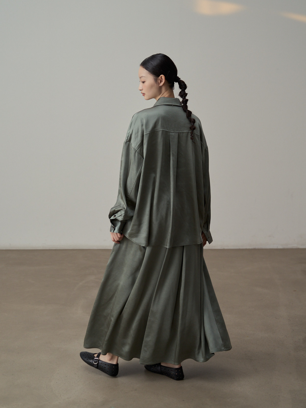 【セットアップ】【単品注文】サテン ゆったり シャツ + フレアプリーツスカート 2点上下セット 【JZシリーズ】