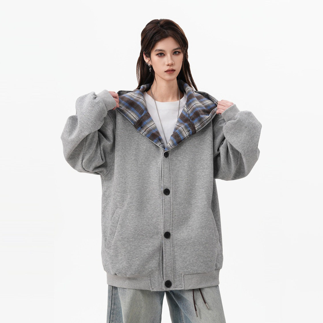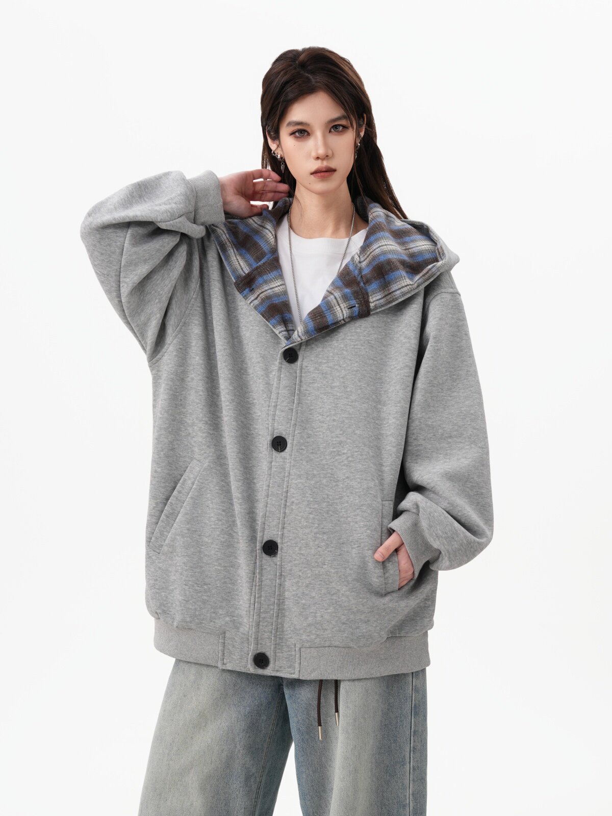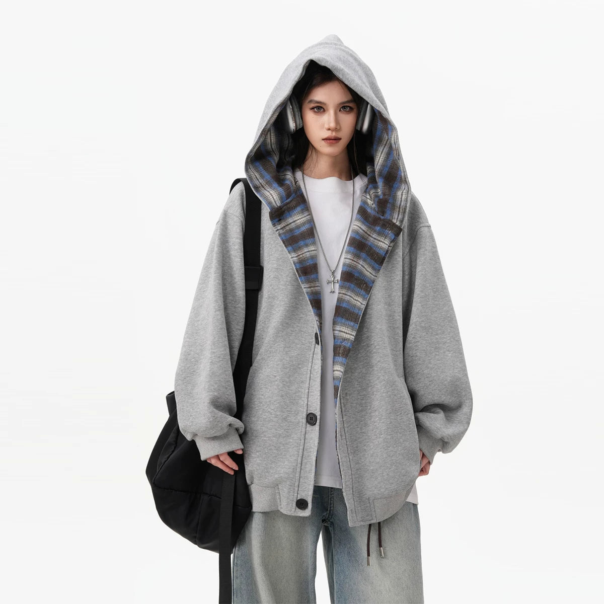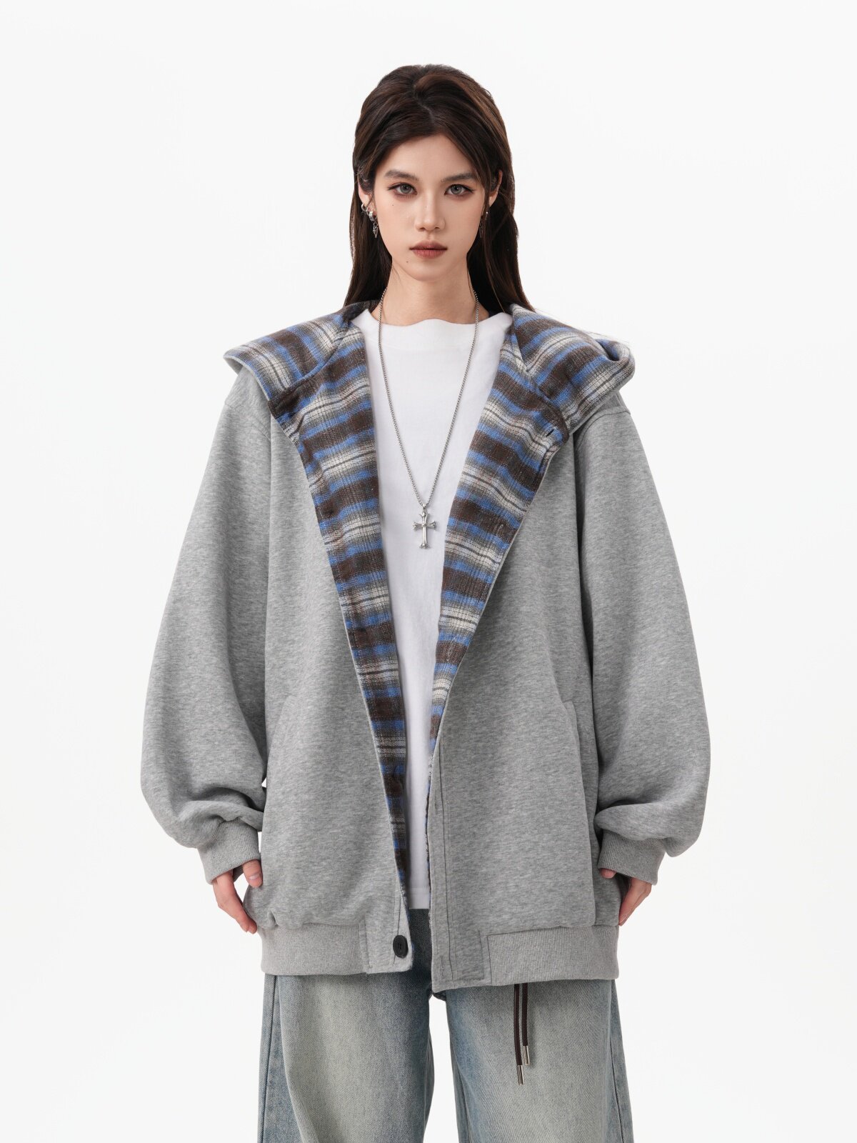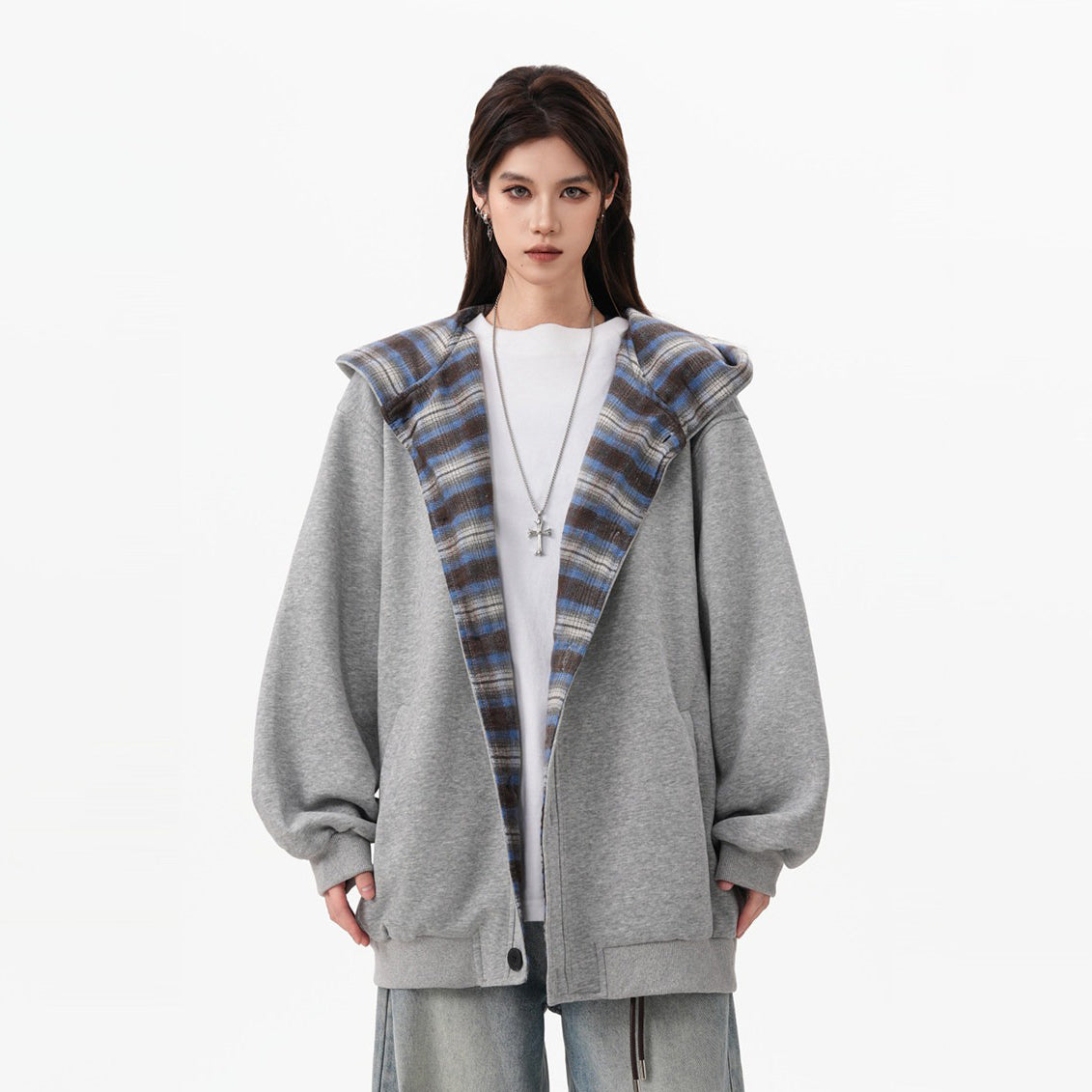 【商品名】【アウター】アメリカンチェック切り替え ジップスウェットパーカー レディース 男女兼用 春 ヘビーウェイト ルーズシルエット スポーツジャケット レトロ学院風 フード付き【FCシリーズ】