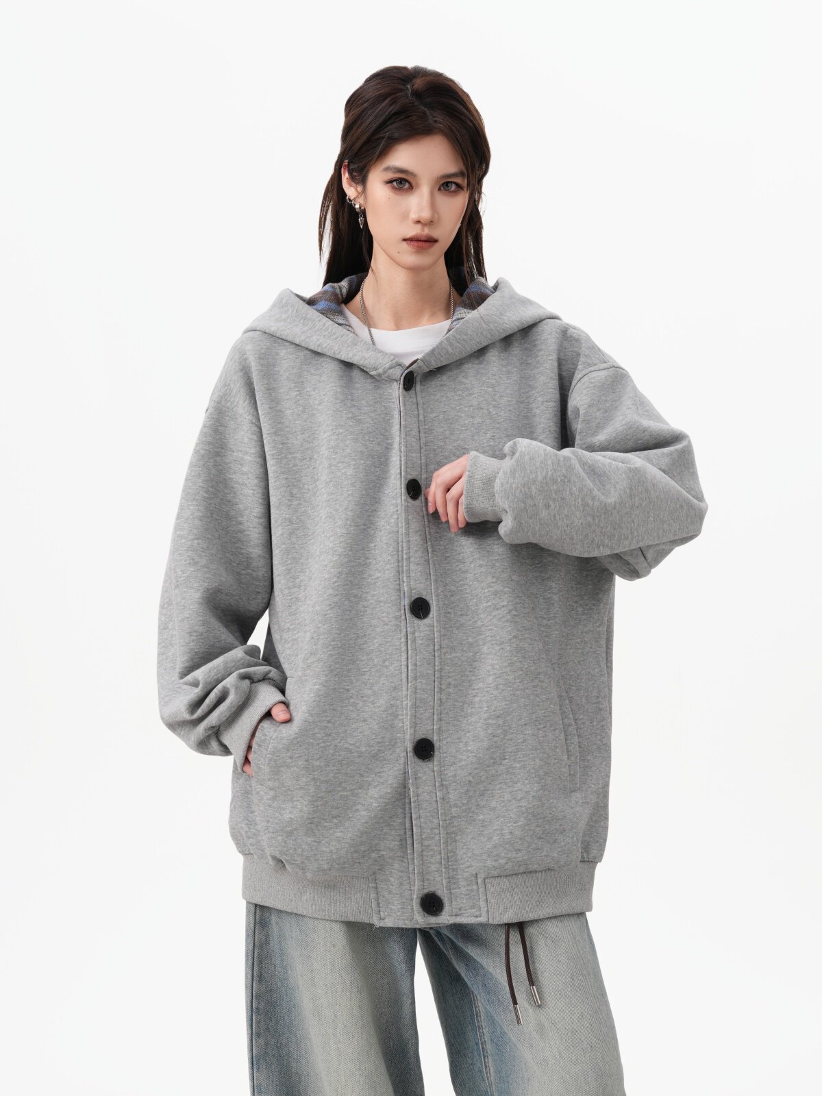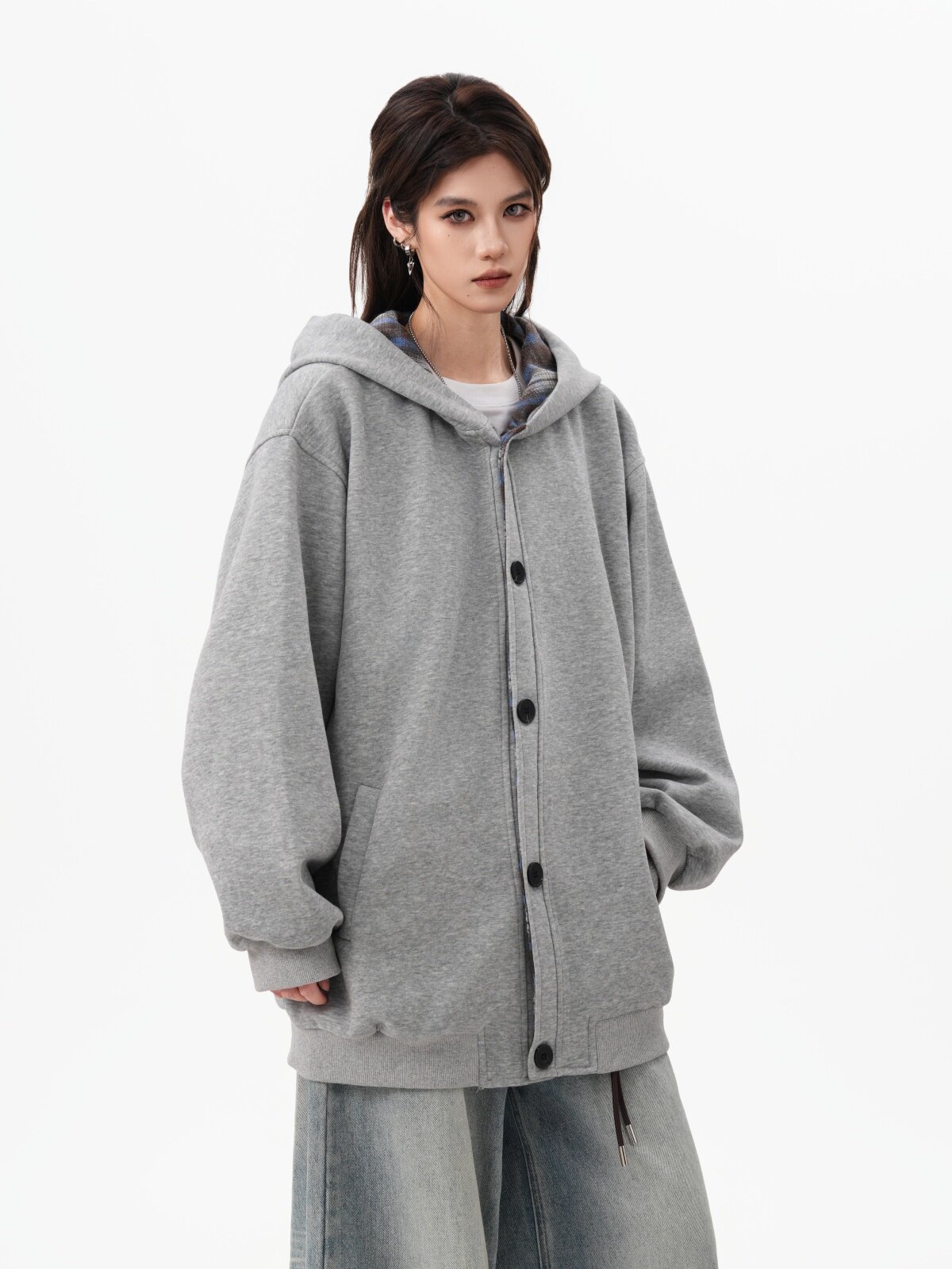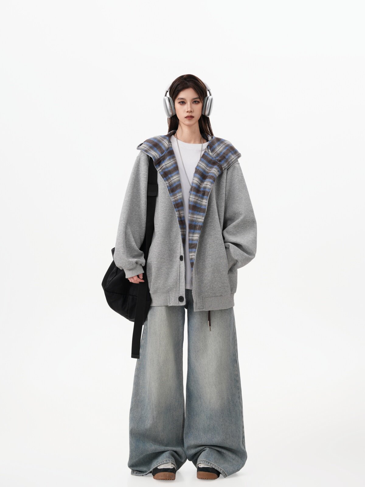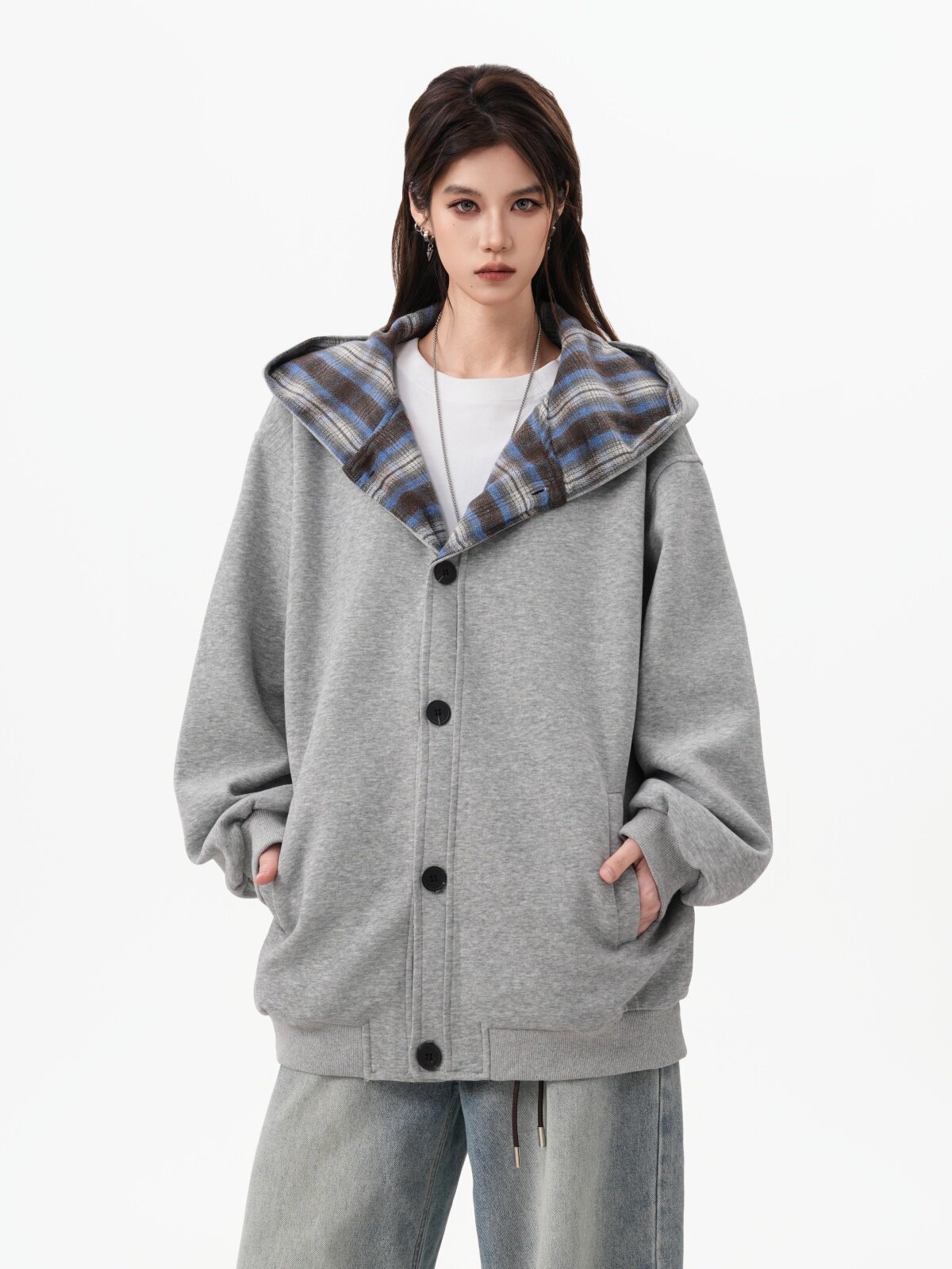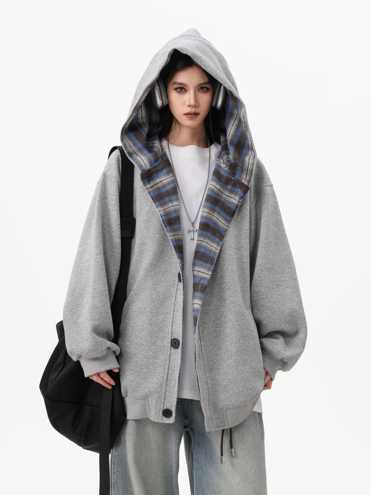 【商品名】【アウター】アメリカンチェック切り替え ジップスウェットパーカー レディース 男女兼用 春 ヘビーウェイト ルーズシルエット スポーツジャケット レトロ学院風 フード付き【FCシリーズ】