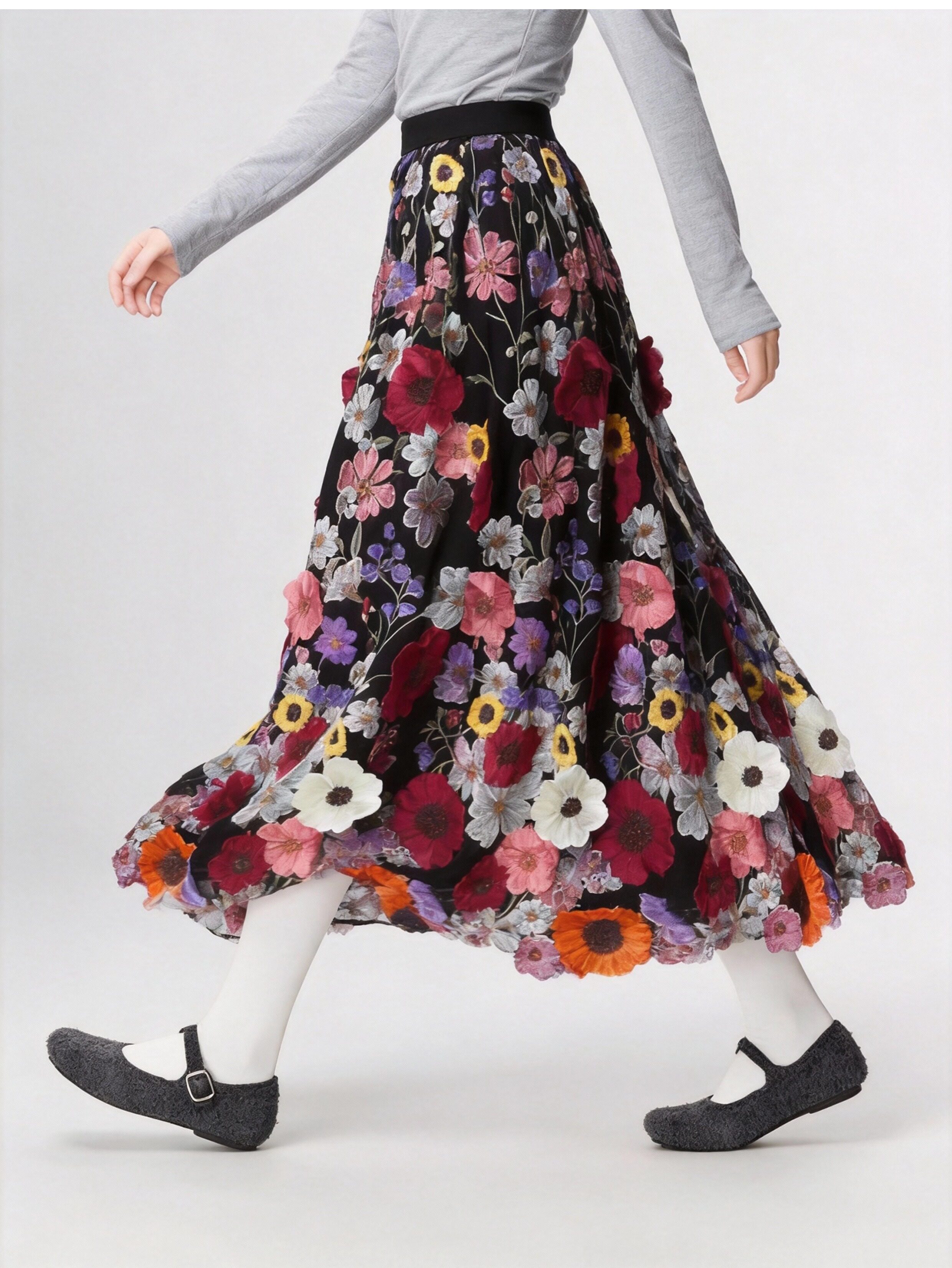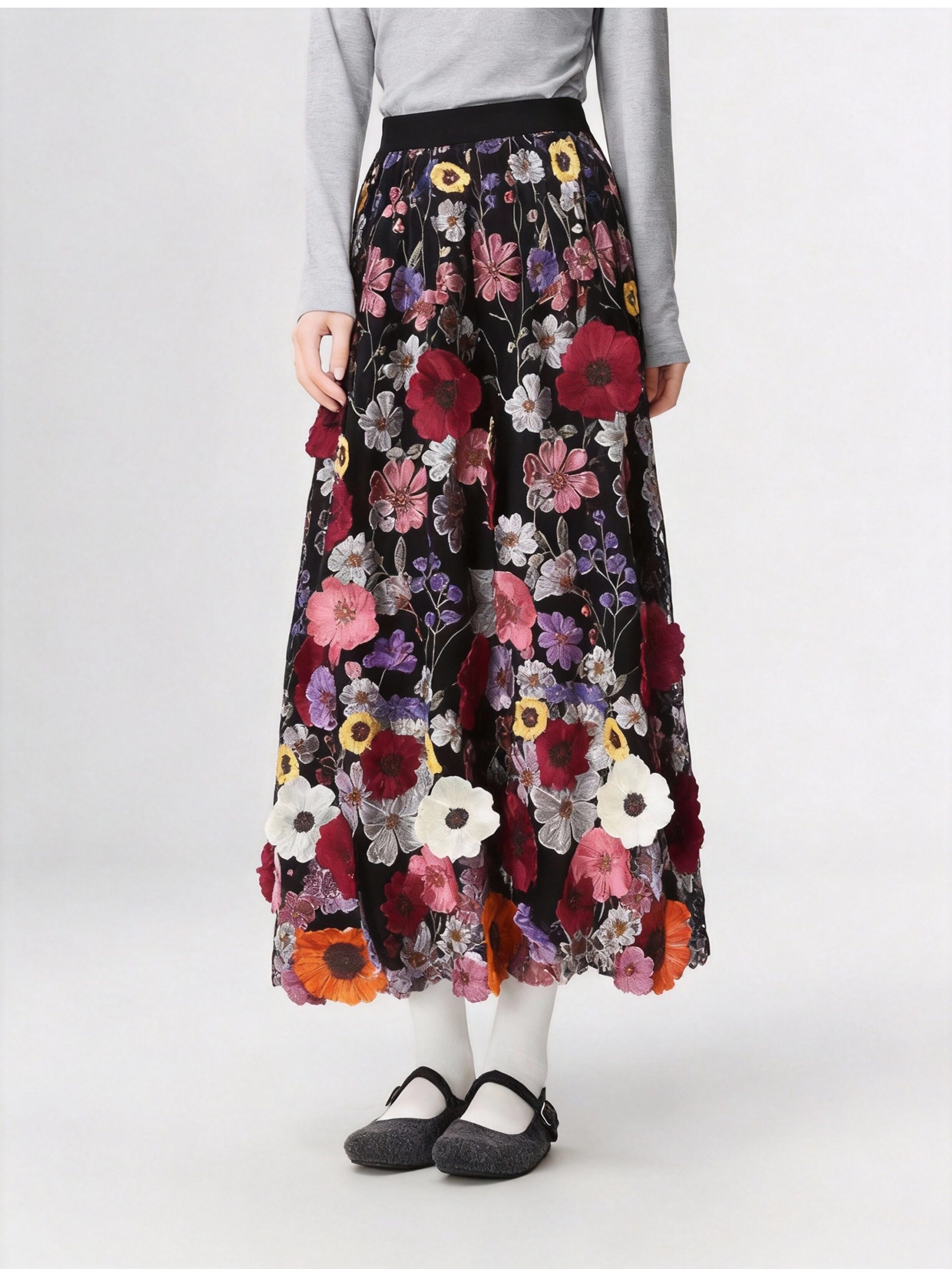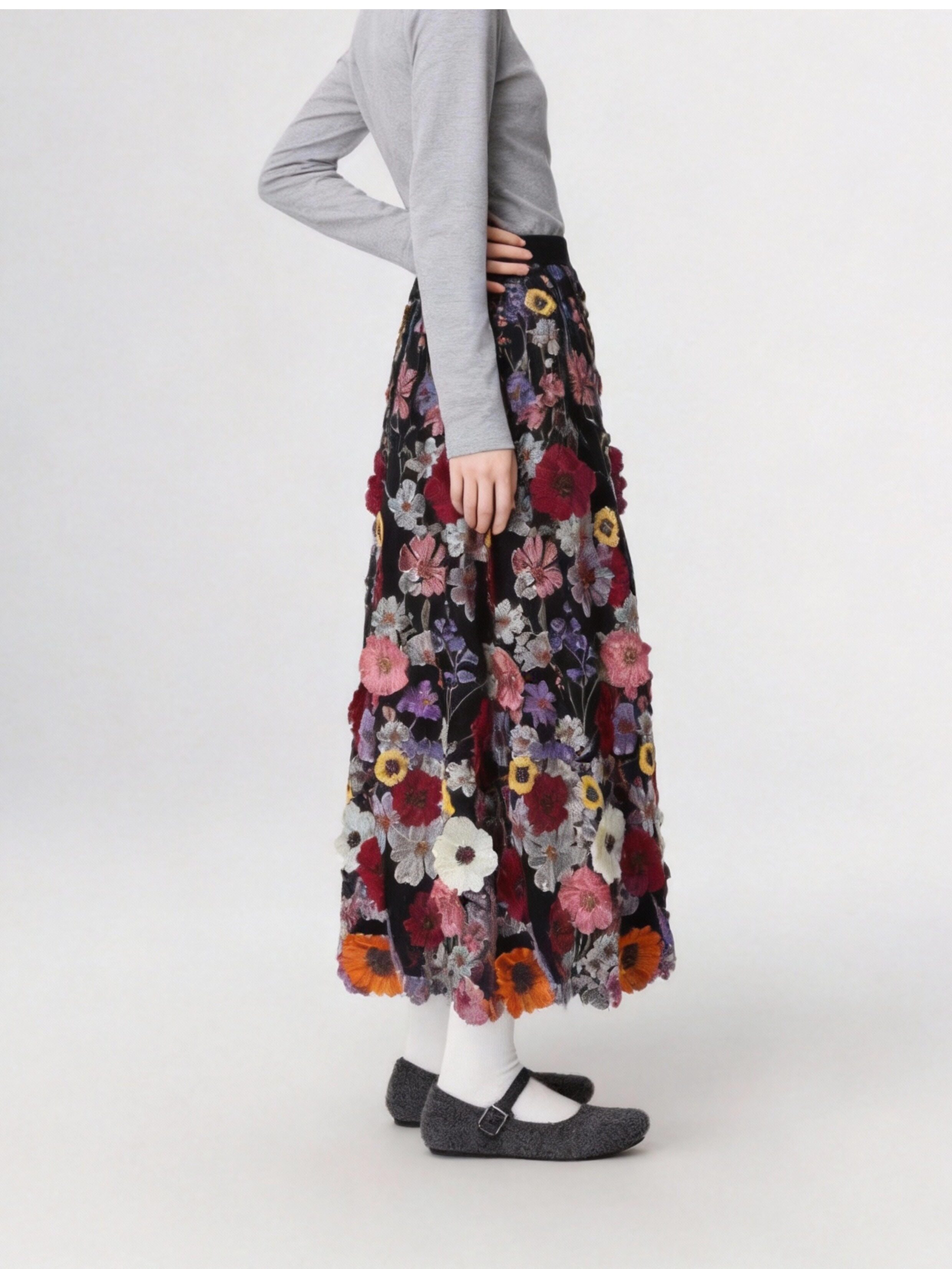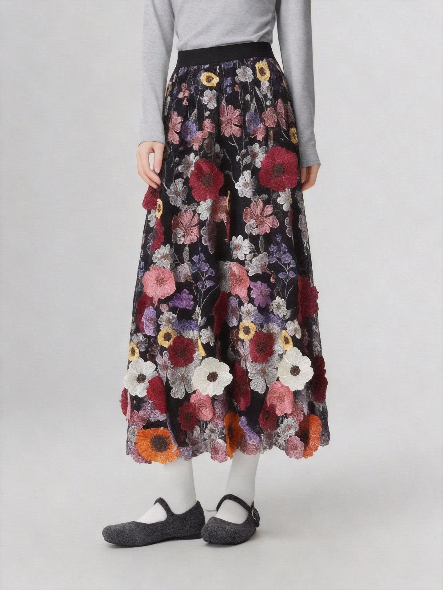 【ボトムス】立体刺繍デザイン ロングスカート レディース 2026春新作 レトロ風 ゆったりシルエット 上品 垂れ感スカート【SHシリーズ】【15~20日内発送】