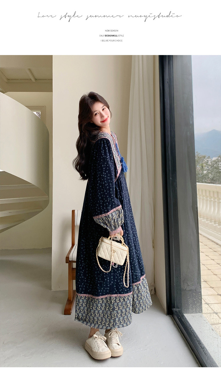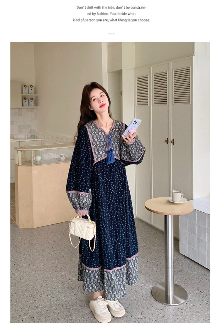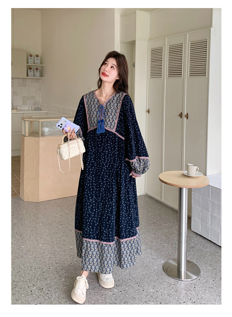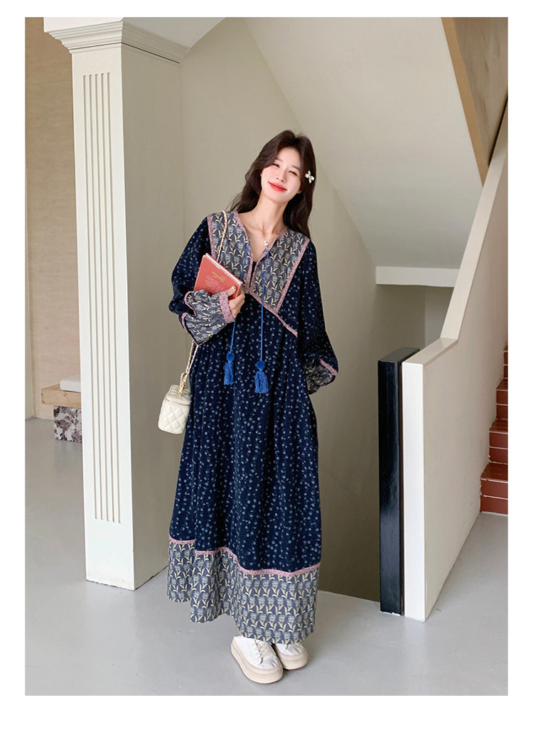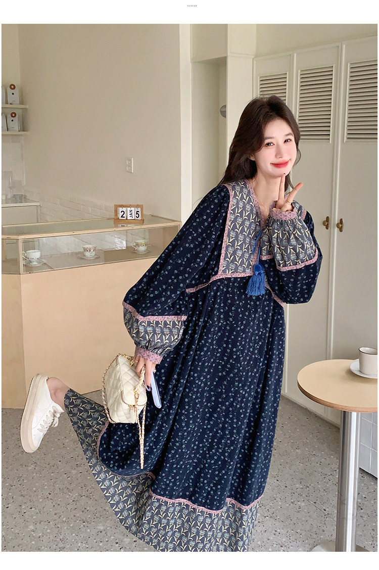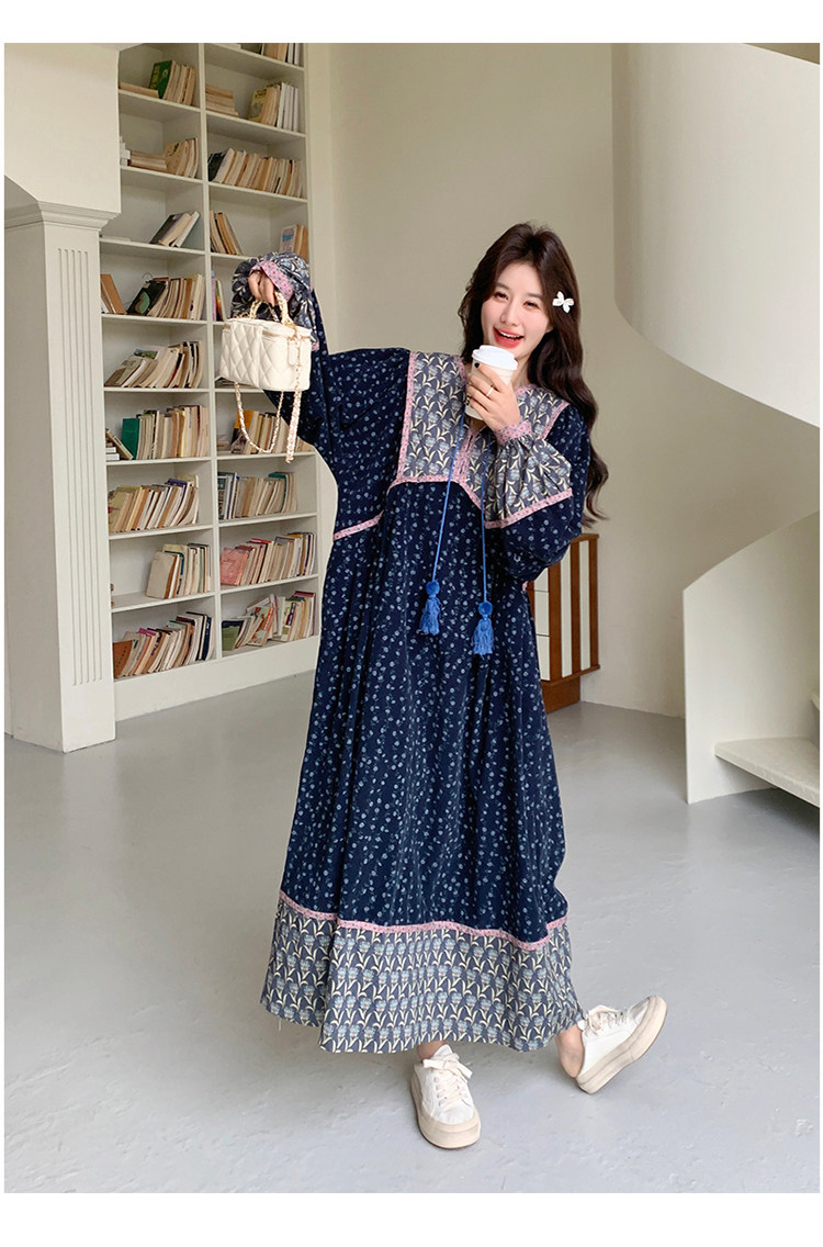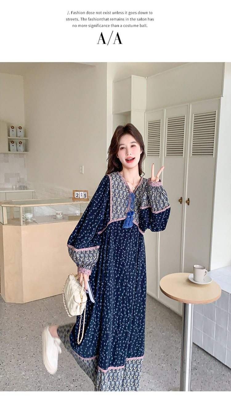 【商品名】【ワンピース】フレンチ風 配色切替 花柄ワンピース レディース 2026春新作 ゆったりシルエット 体型カバー 着痩せ ロング丈 長袖 ワンピース【SHシリーズ】
