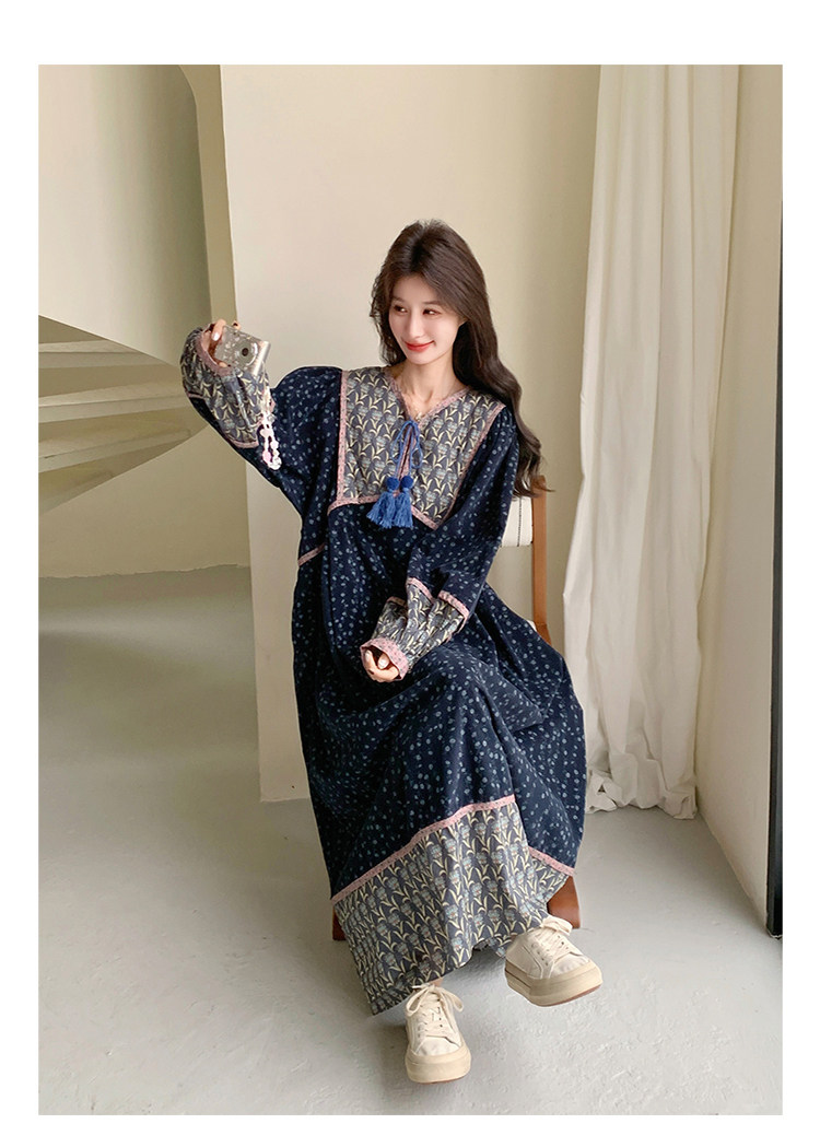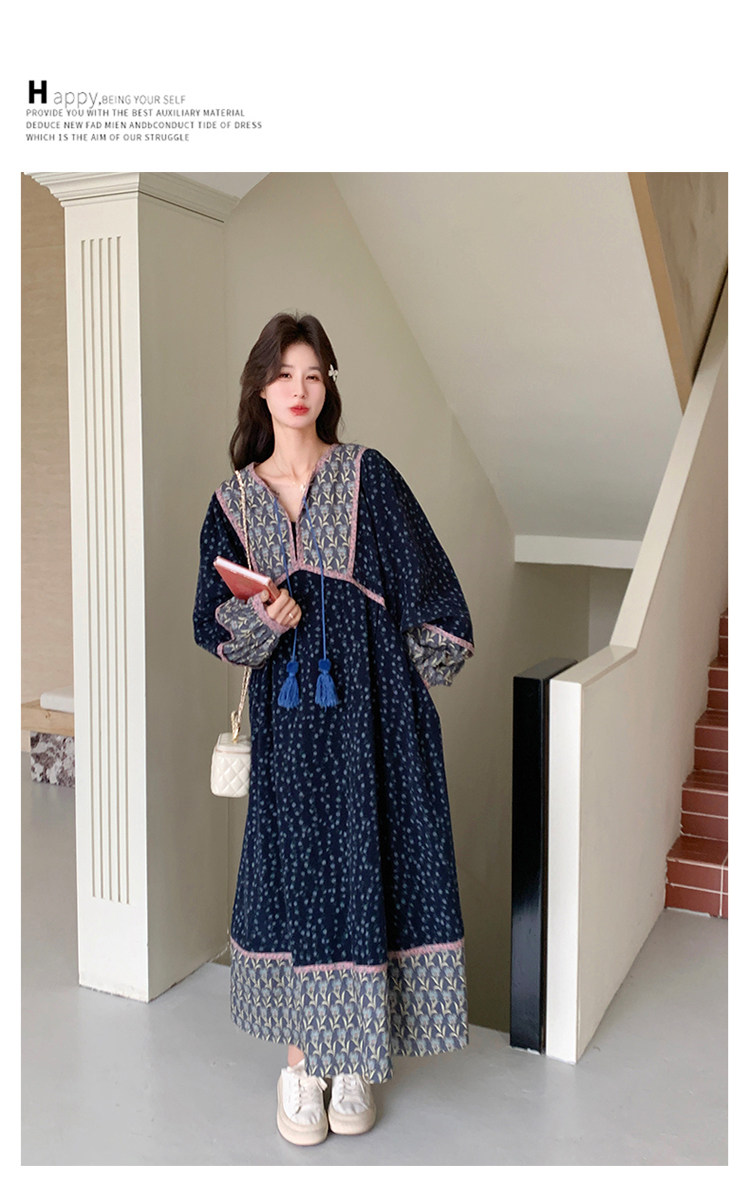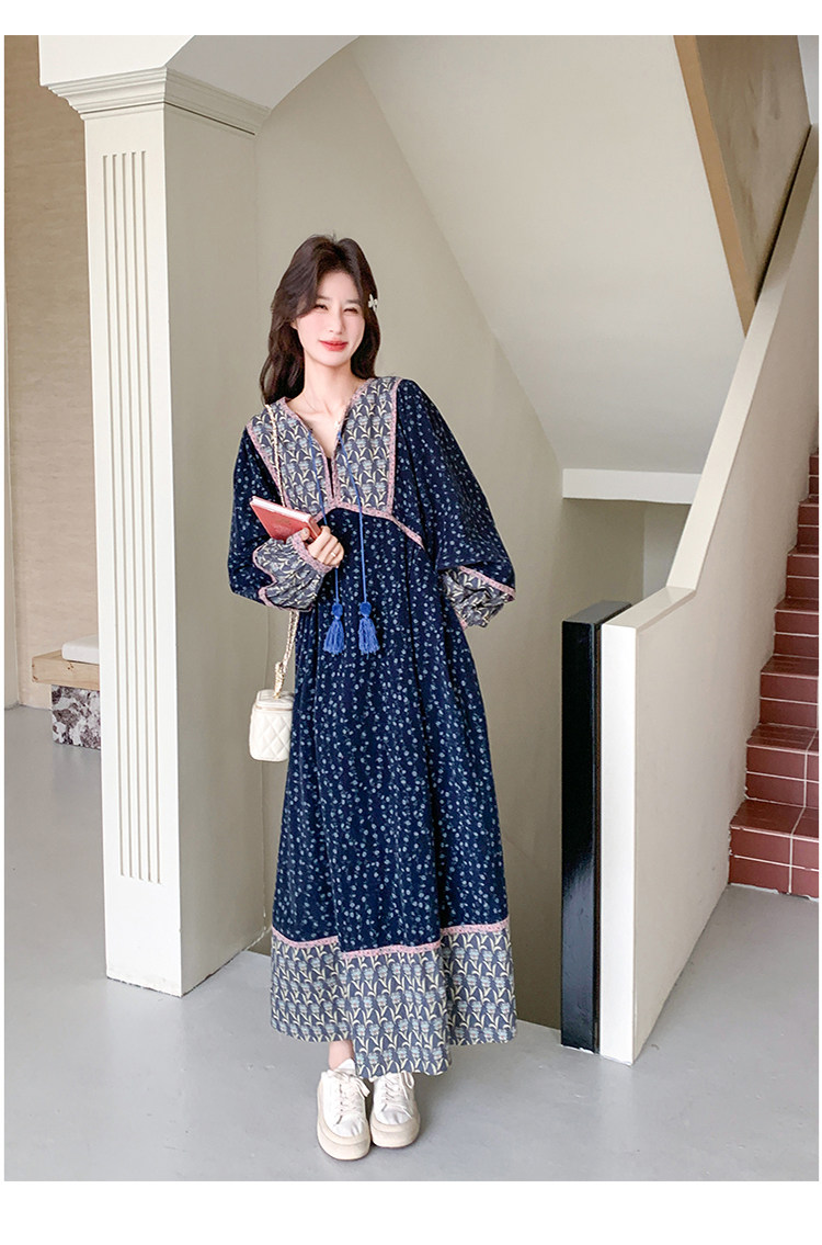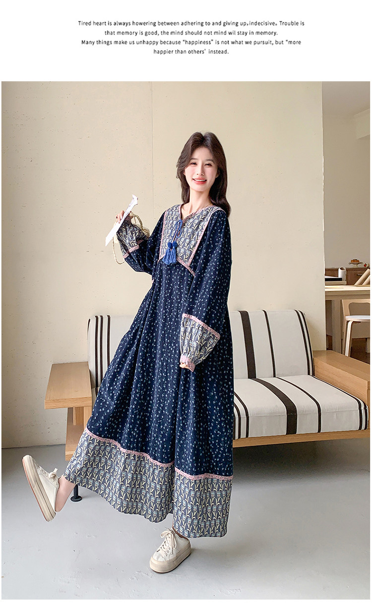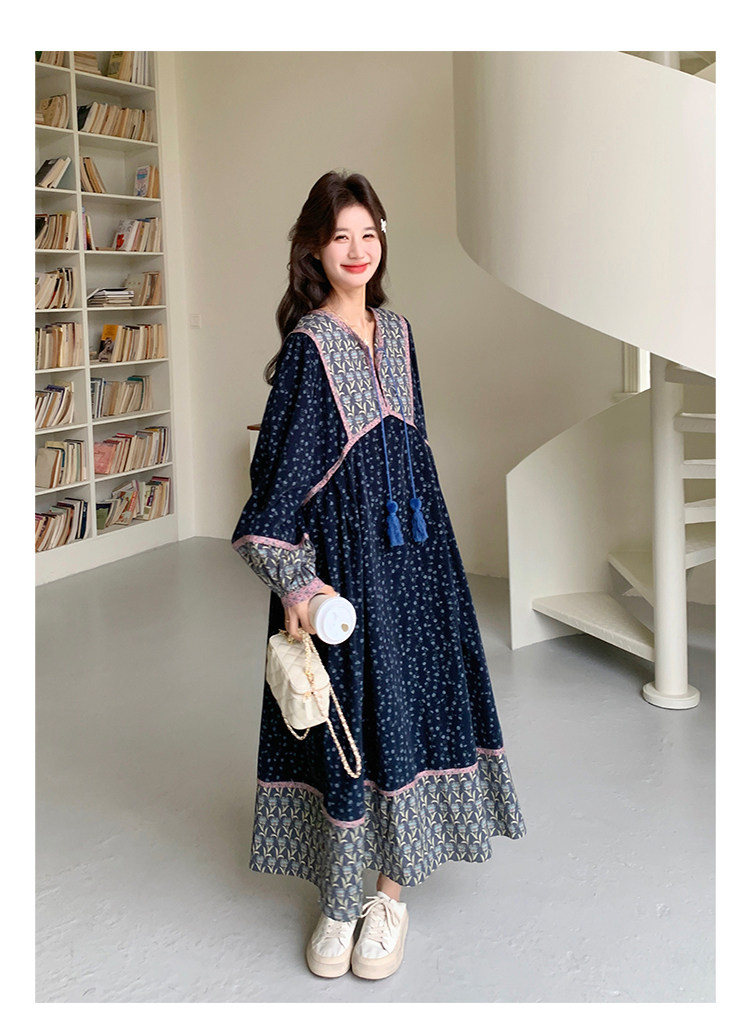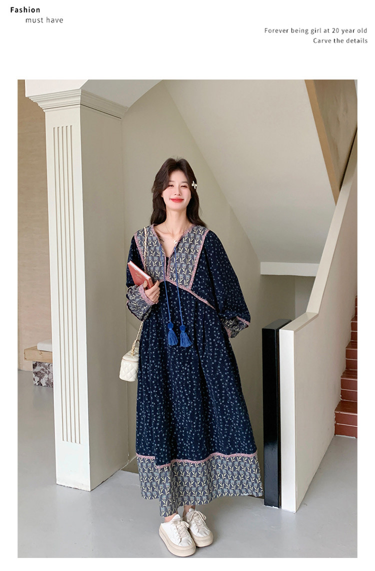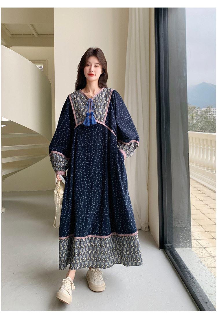 【商品名】【ワンピース】フレンチ風 配色切替 花柄ワンピース レディース 2026春新作 ゆったりシルエット 体型カバー 着痩せ ロング丈 長袖 ワンピース【SHシリーズ】
