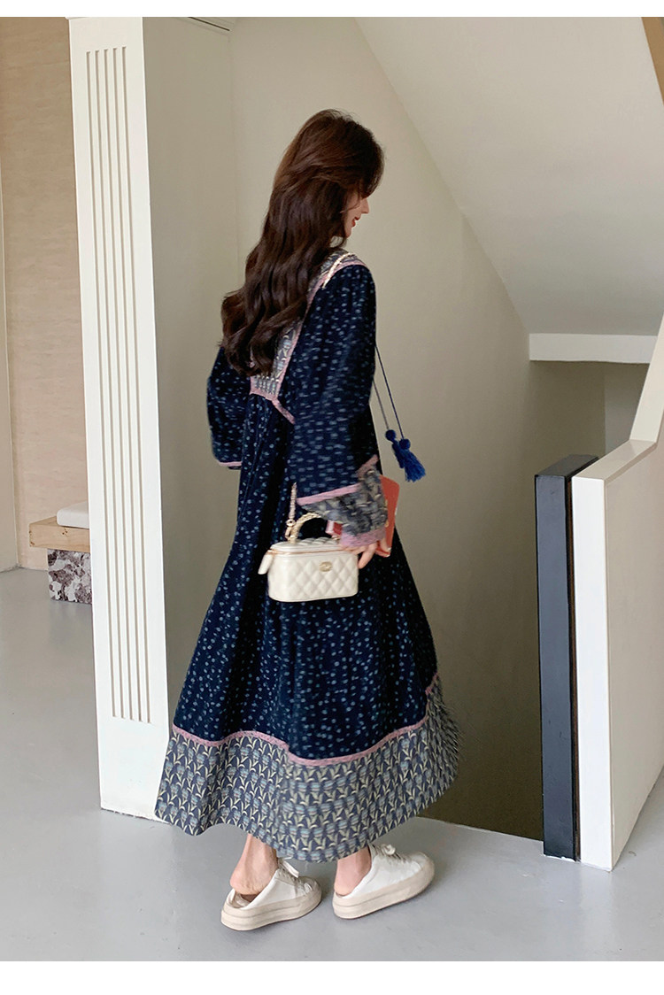 【ワンピース】フレンチ風 配色切替 花柄ワンピース レディース 2026春新作 ゆったりシルエット 体型カバー 着痩せ ロング丈 長袖 ワンピース【SHシリーズ】