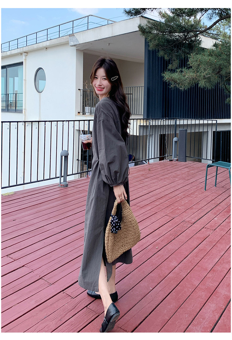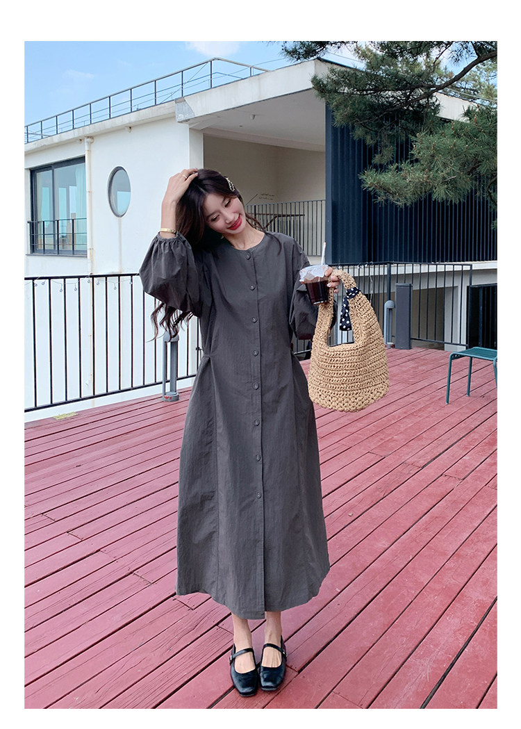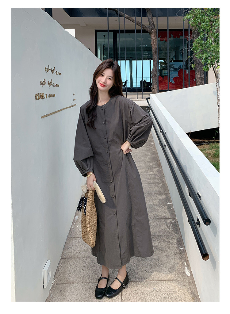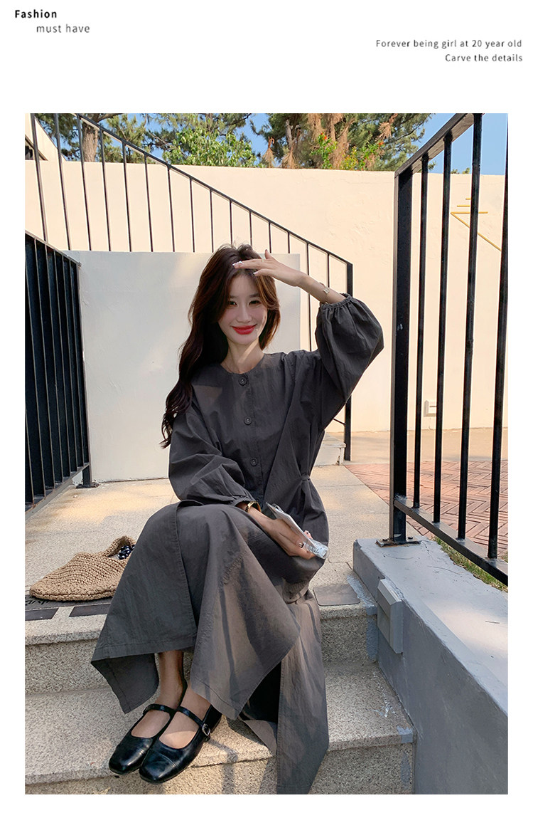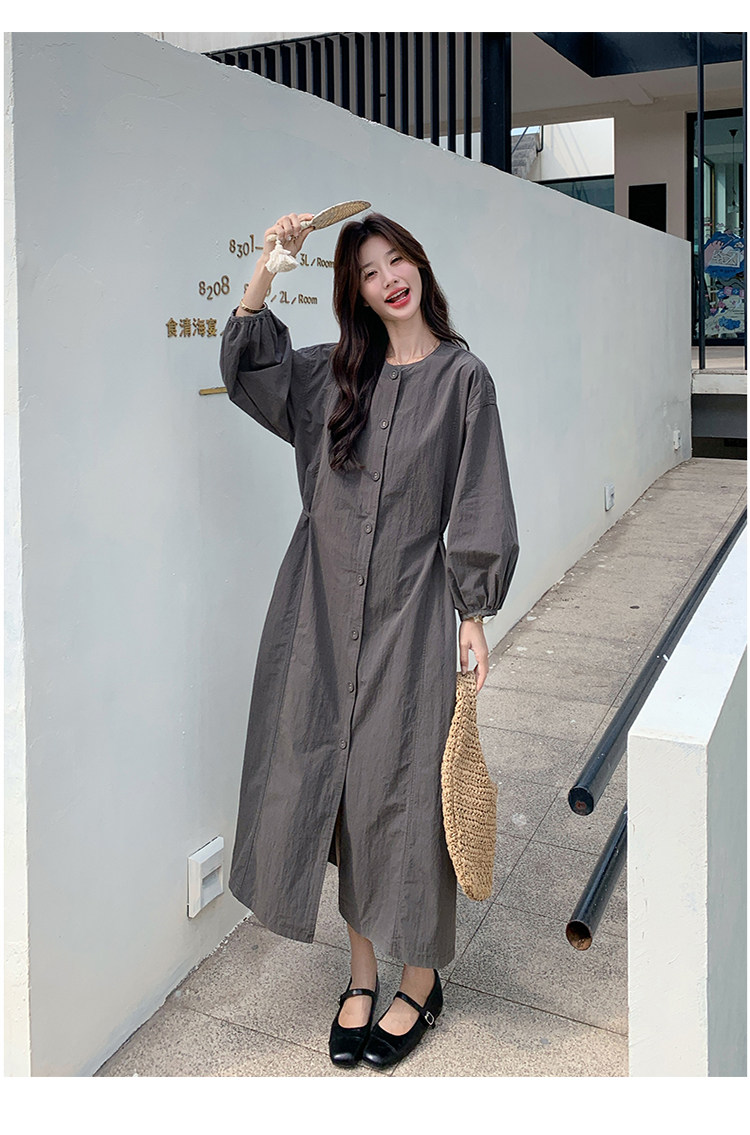 【ワンピース】韓国風 長袖 グレー シャツワンピース ゆったりシルエット リラックス感 ロング丈 体型カバー【JZシリーズ】