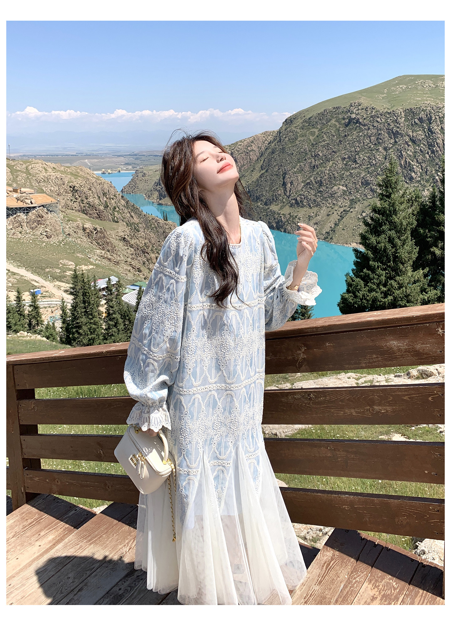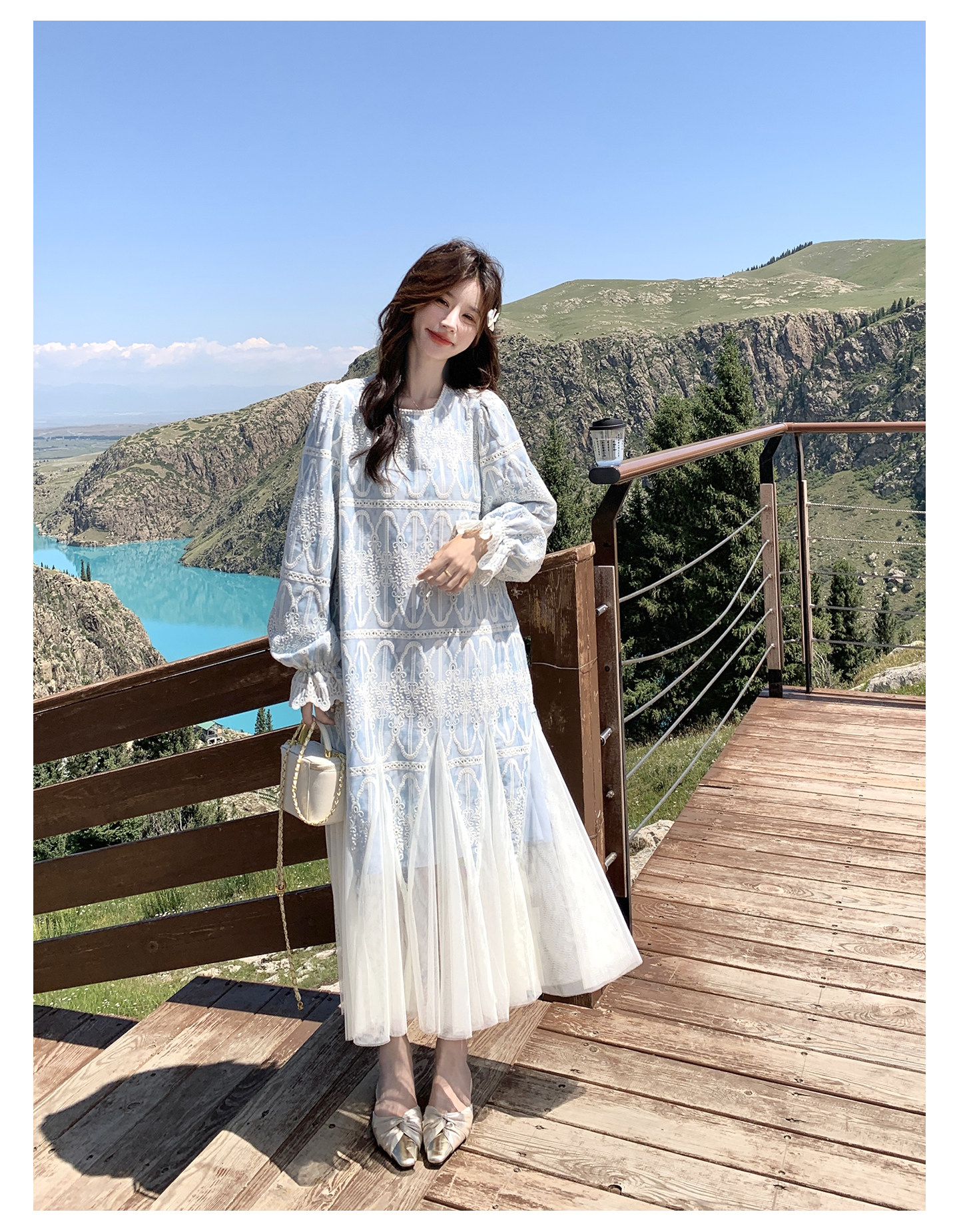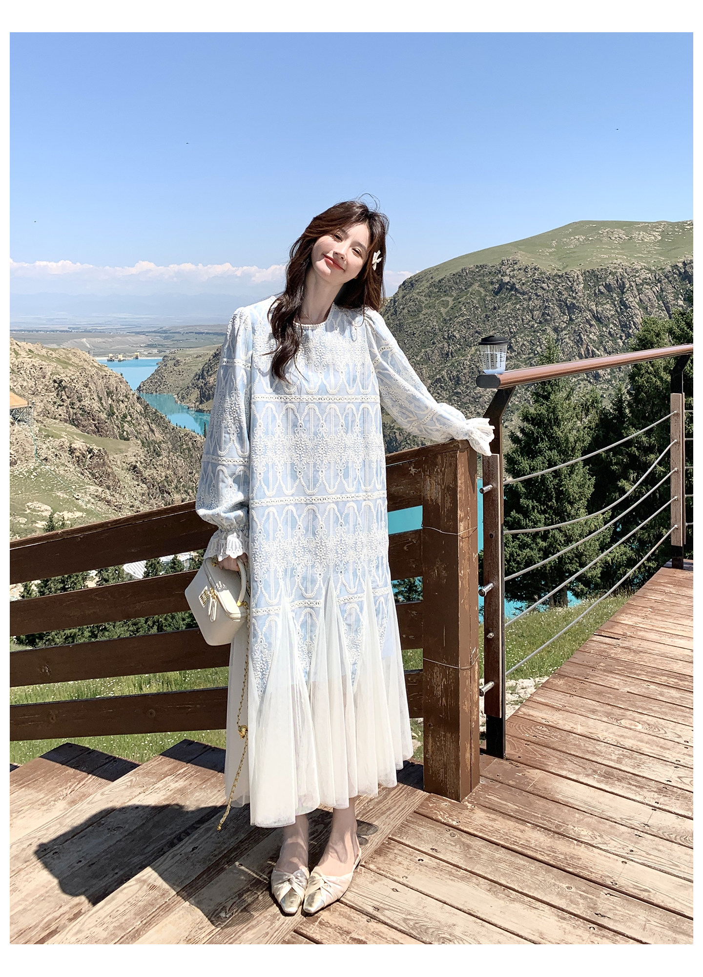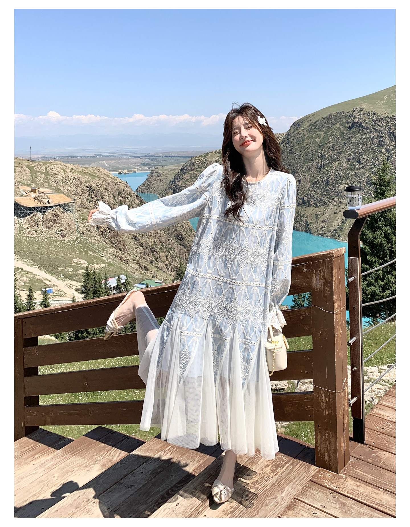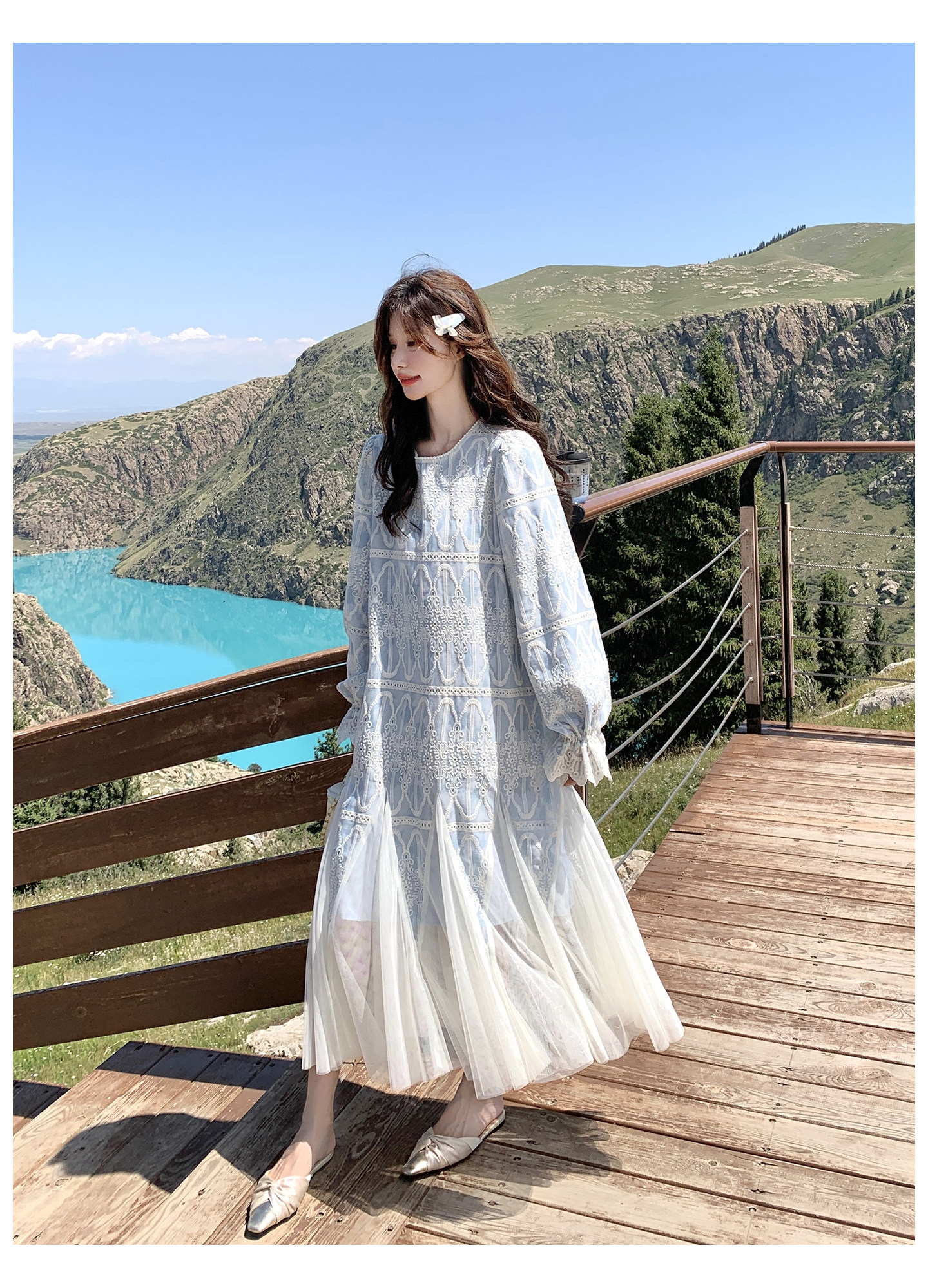 春カラー 大人気おすすめ色✨【ワンピース】フレンチ風 ライトブルー 刺繍チュール切替 レディース ゆったり シルエット 長袖ワンピース【SHシリーズ】