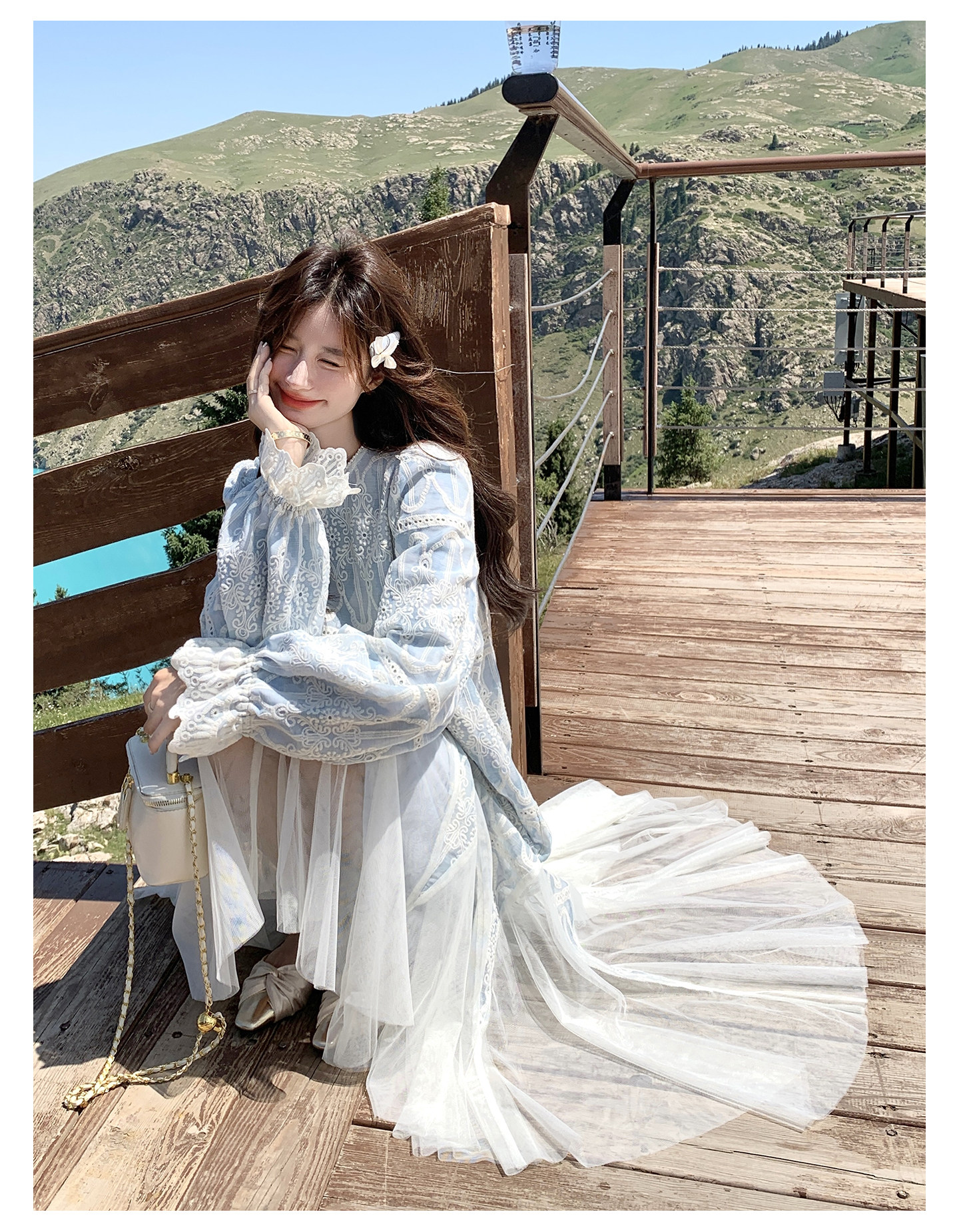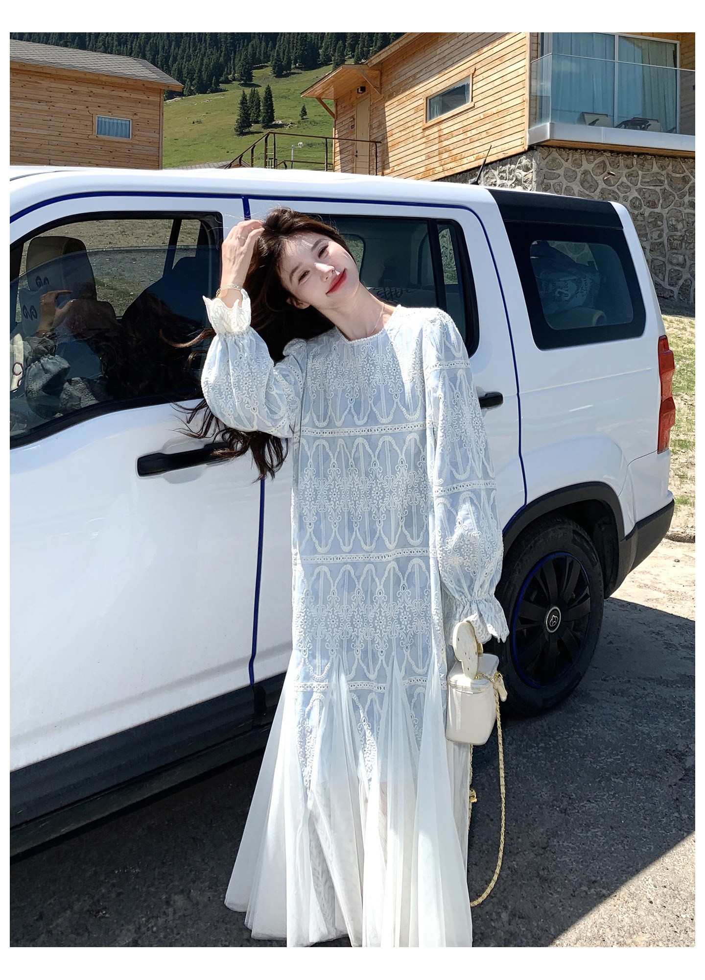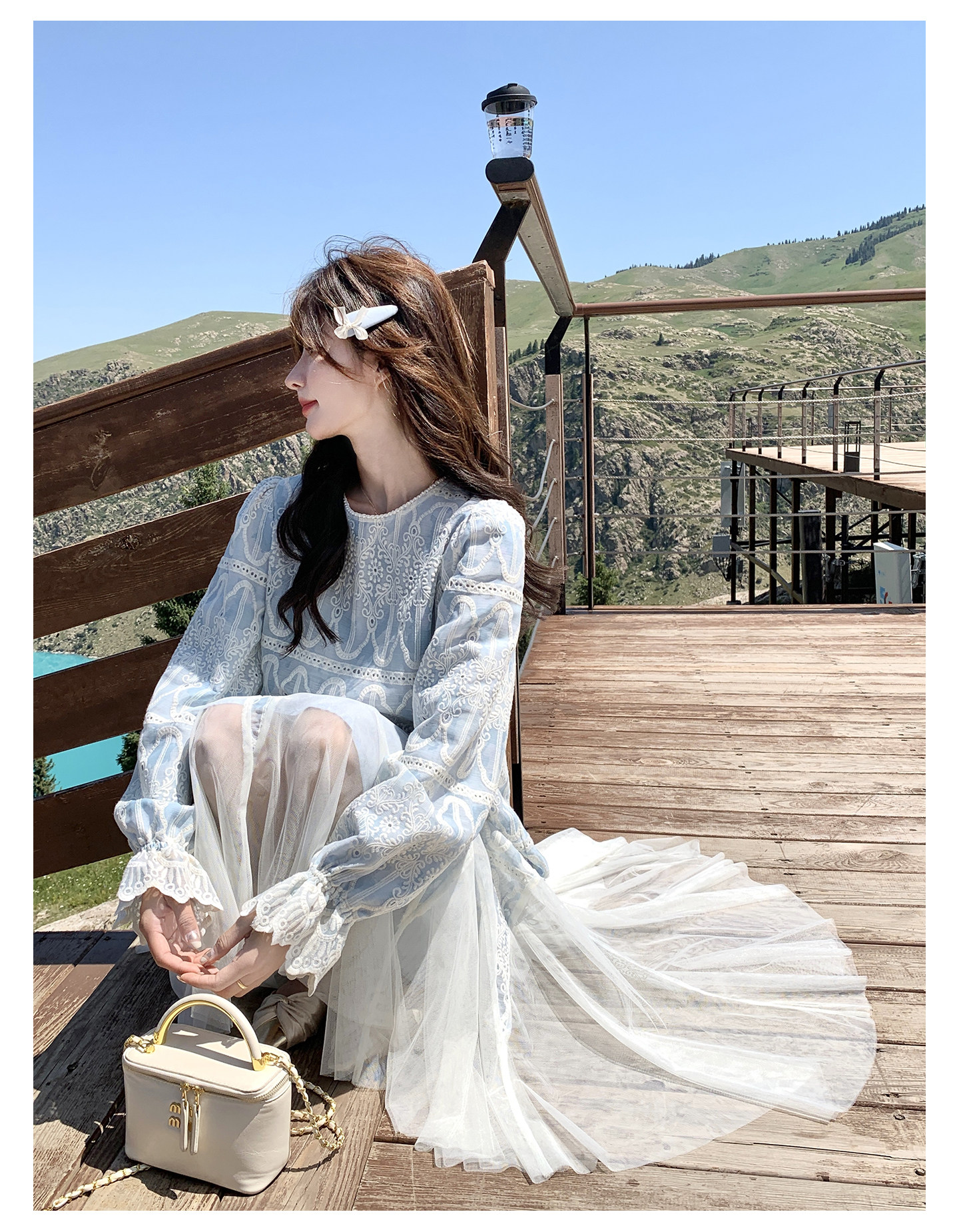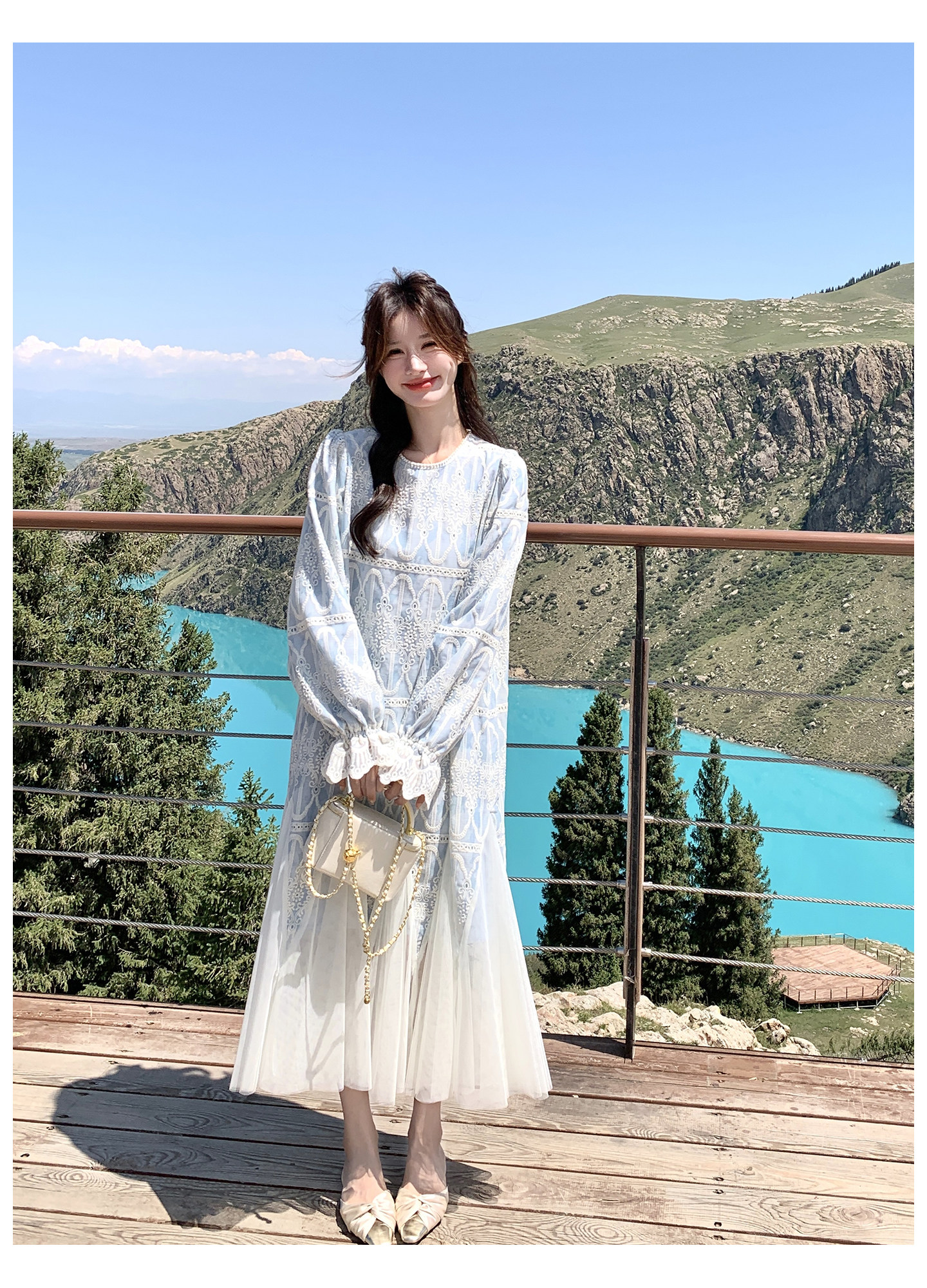 春カラー 大人気おすすめ色✨【ワンピース】フレンチ風 ライトブルー 刺繍チュール切替 レディース ゆったり シルエット 長袖ワンピース【SHシリーズ】