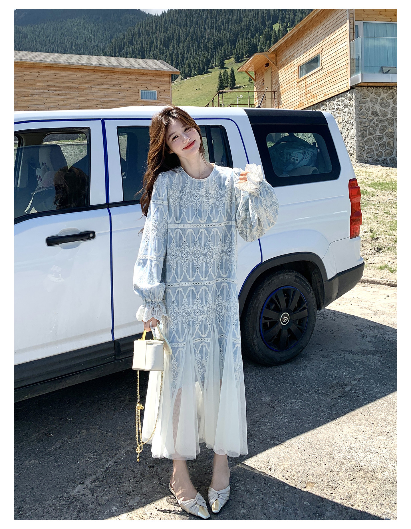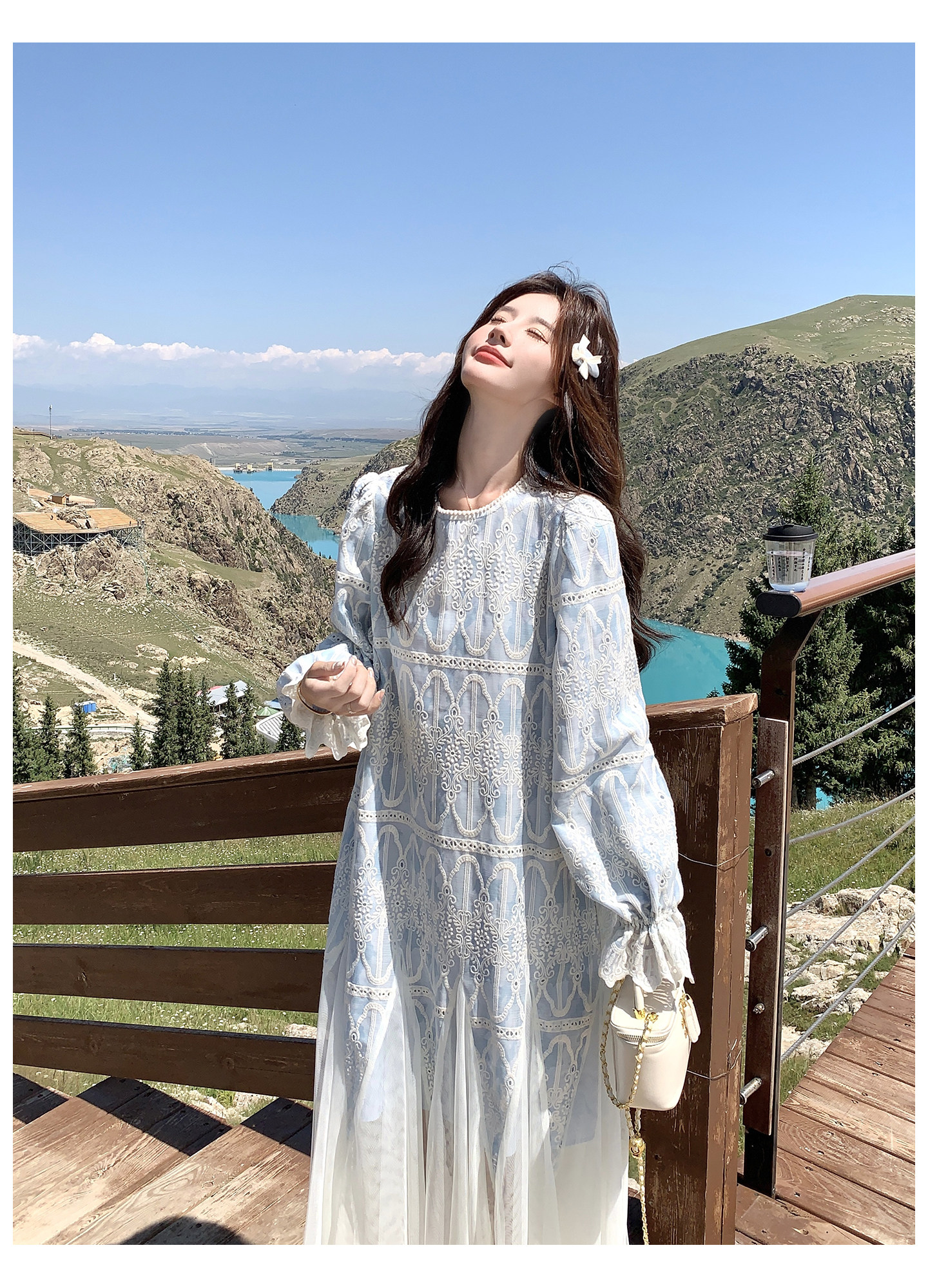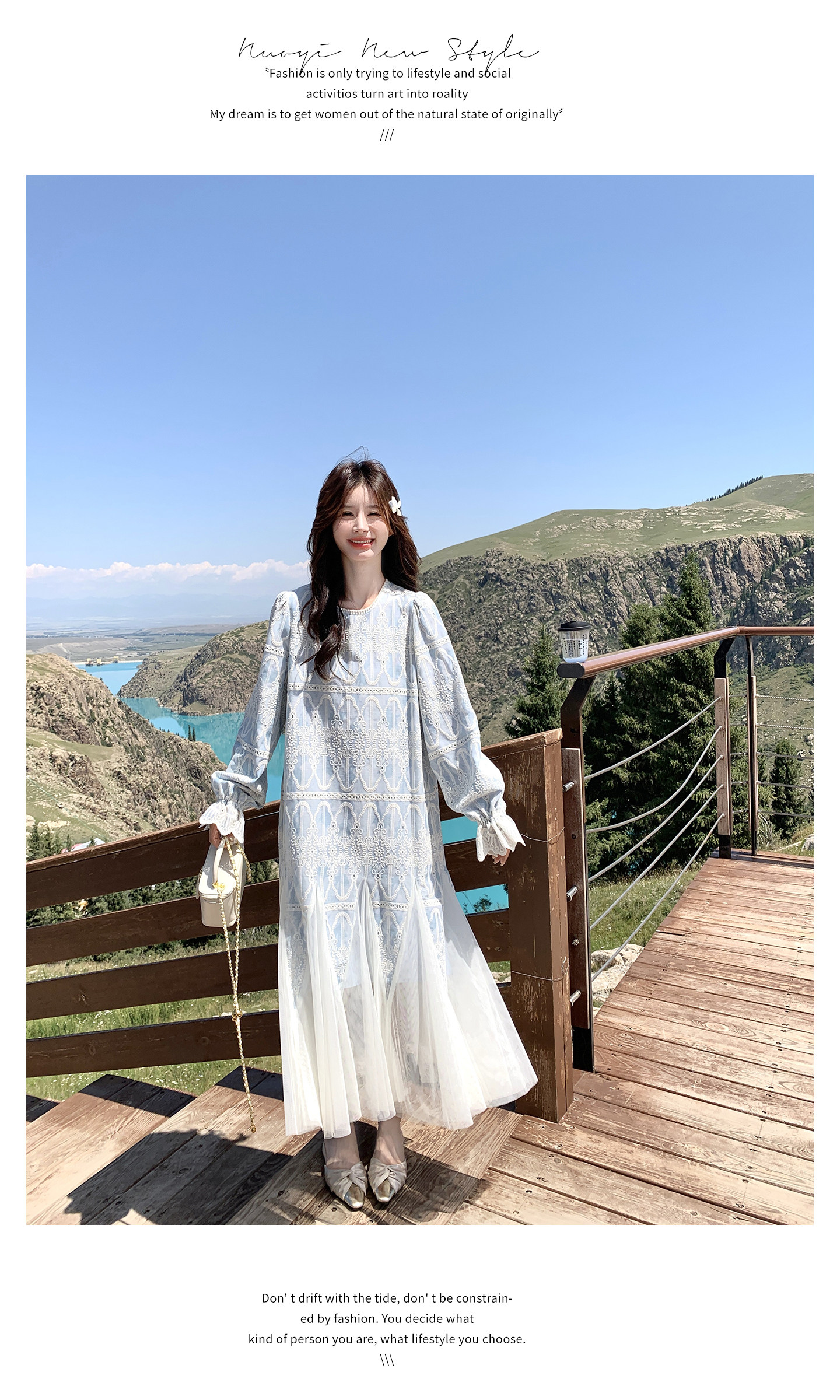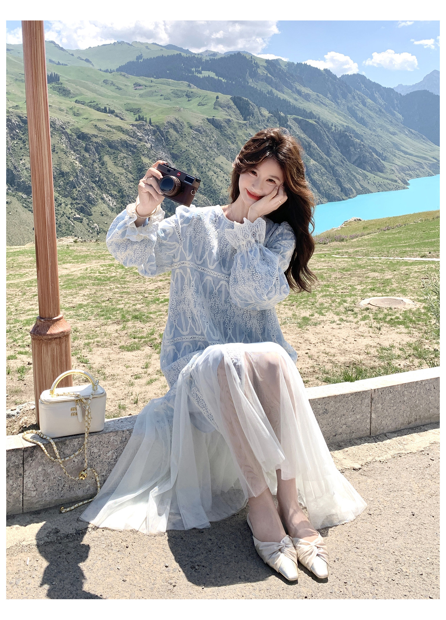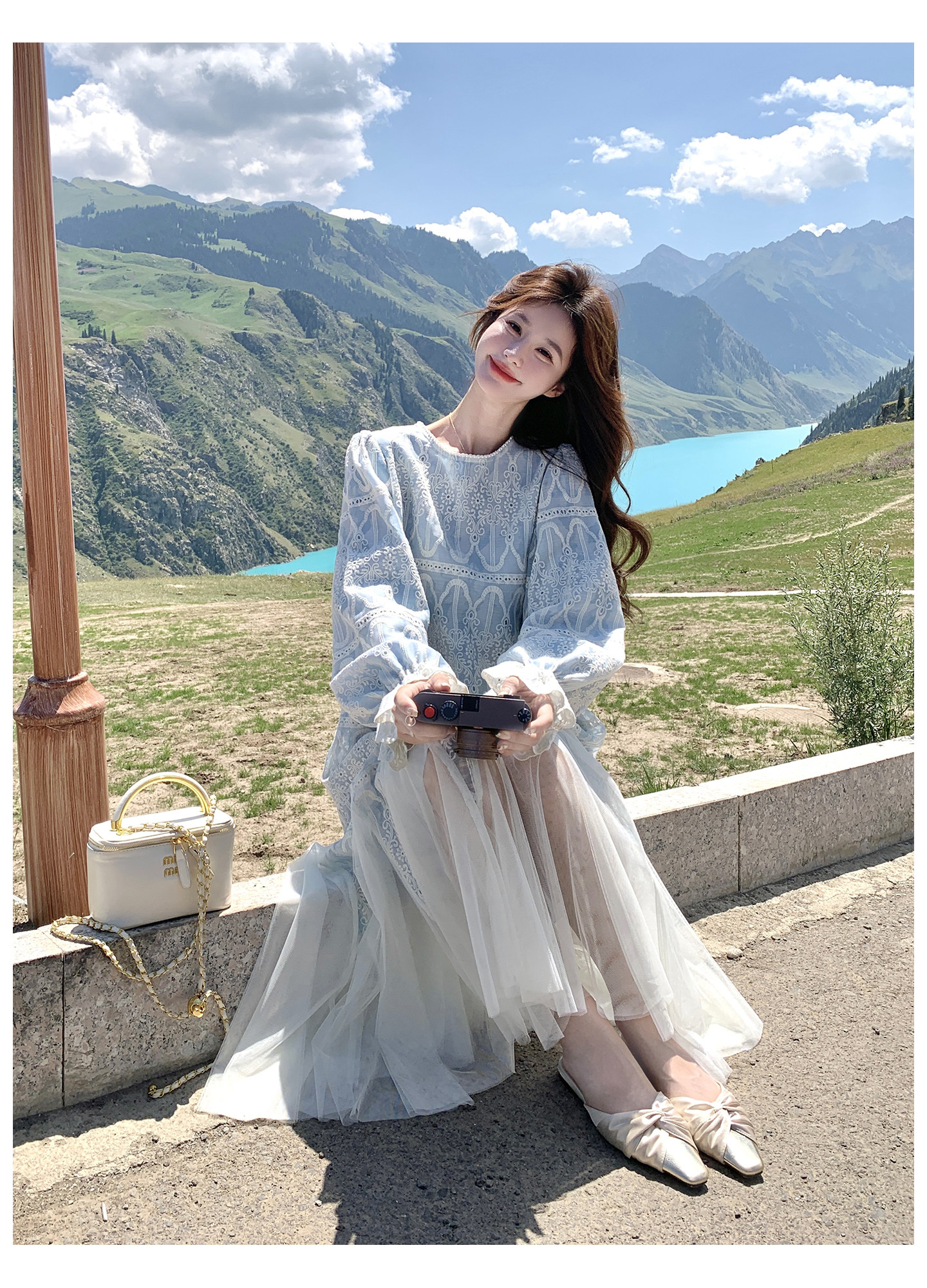春カラー 大人気おすすめ色✨【ワンピース】フレンチ風 ライトブルー 刺繍チュール切替 レディース ゆったり シルエット 長袖ワンピース【SHシリーズ】