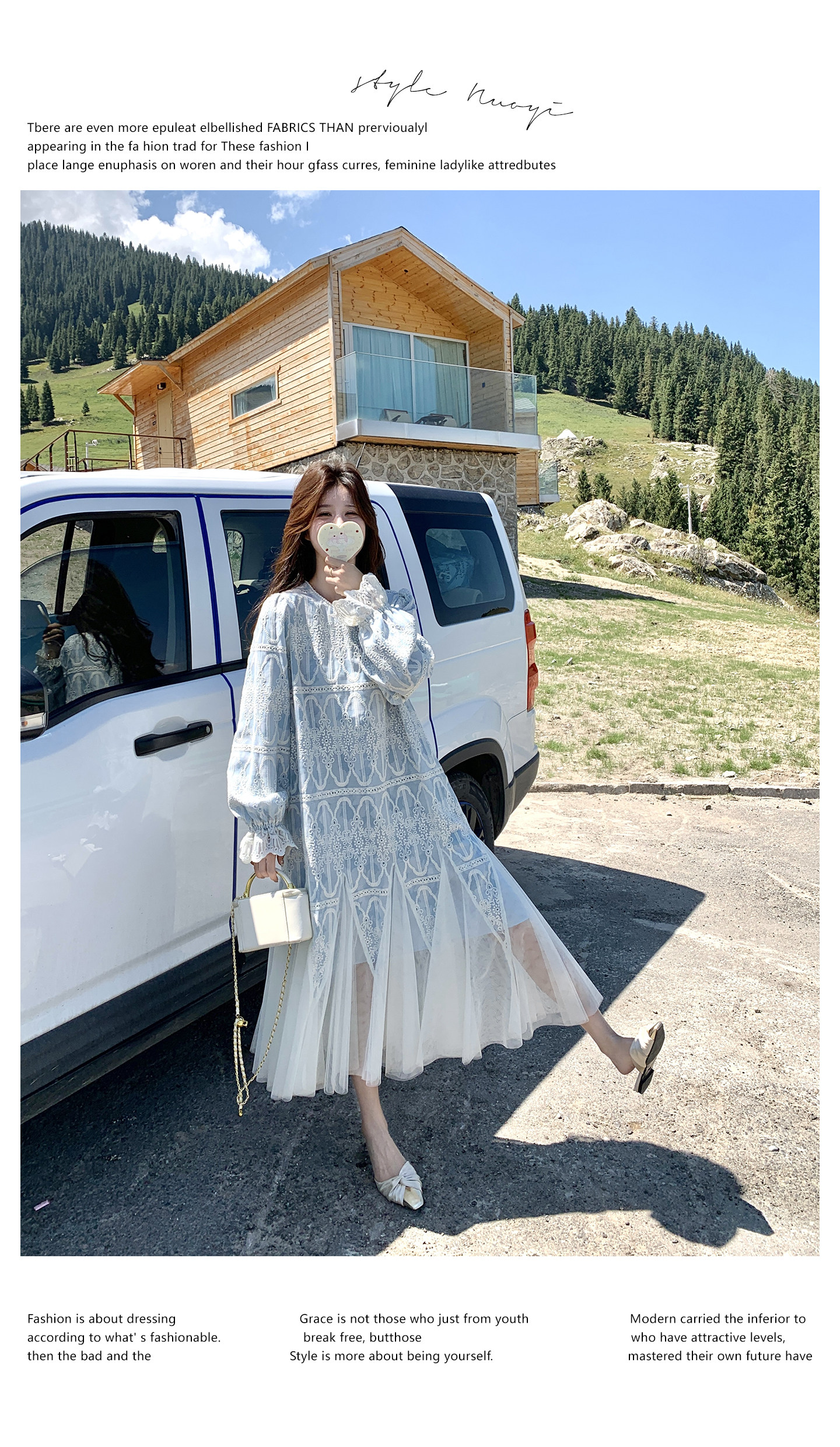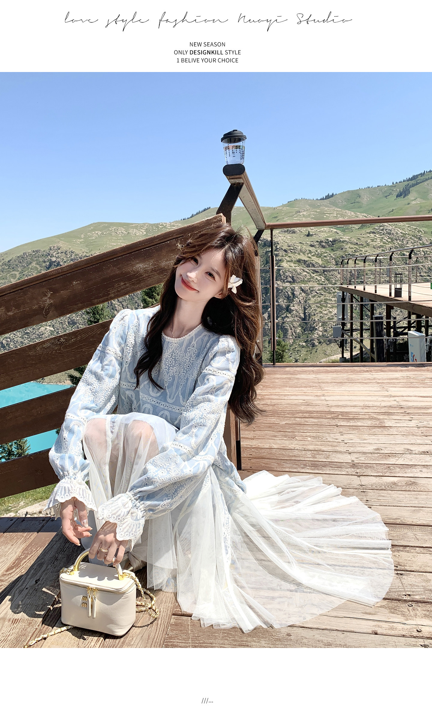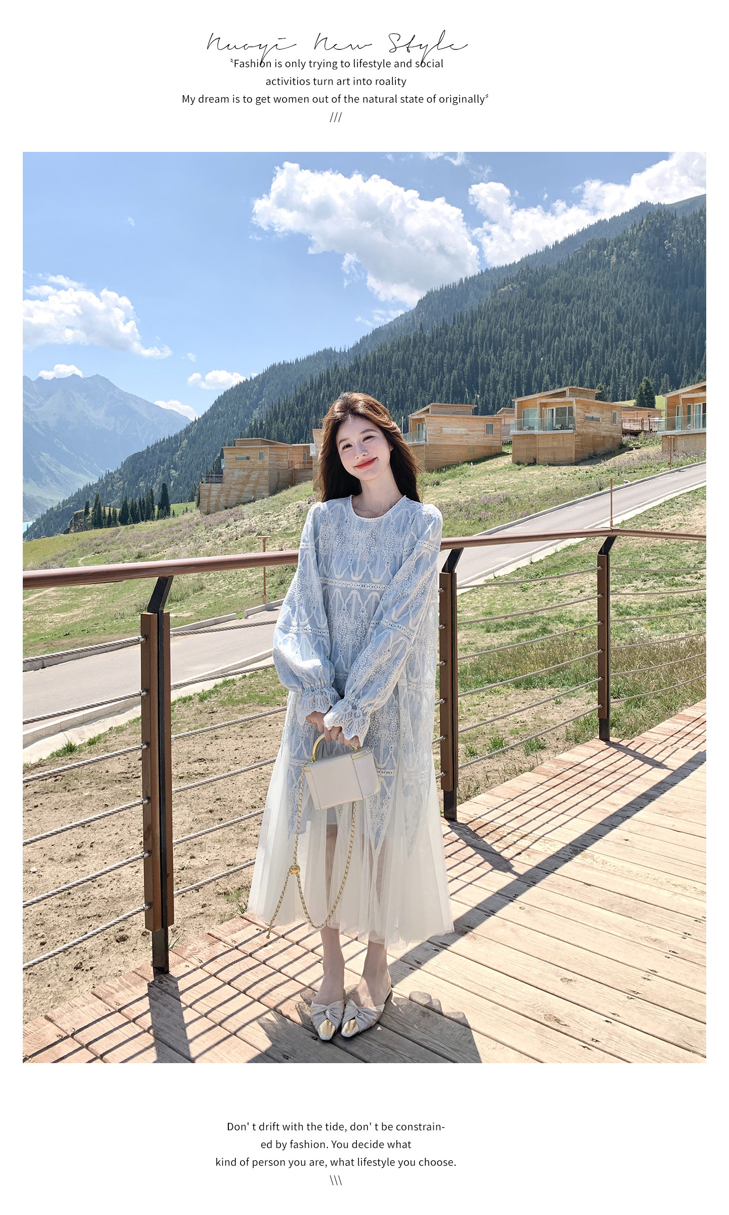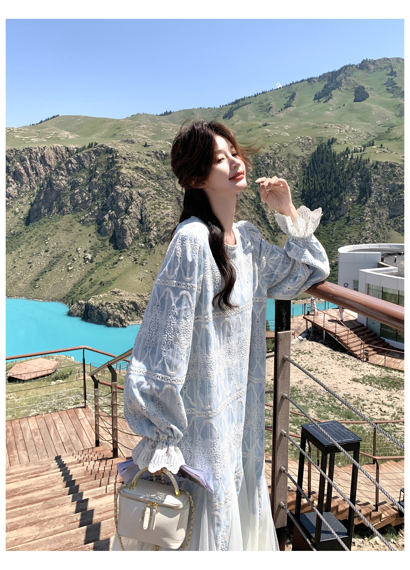 春カラー 大人気おすすめ色✨【ワンピース】フレンチ風 ライトブルー 刺繍チュール切替 レディース ゆったり シルエット 長袖ワンピース【SHシリーズ】