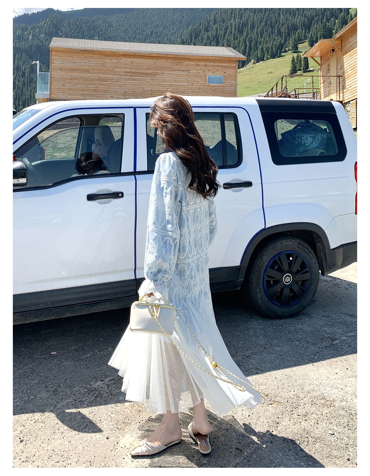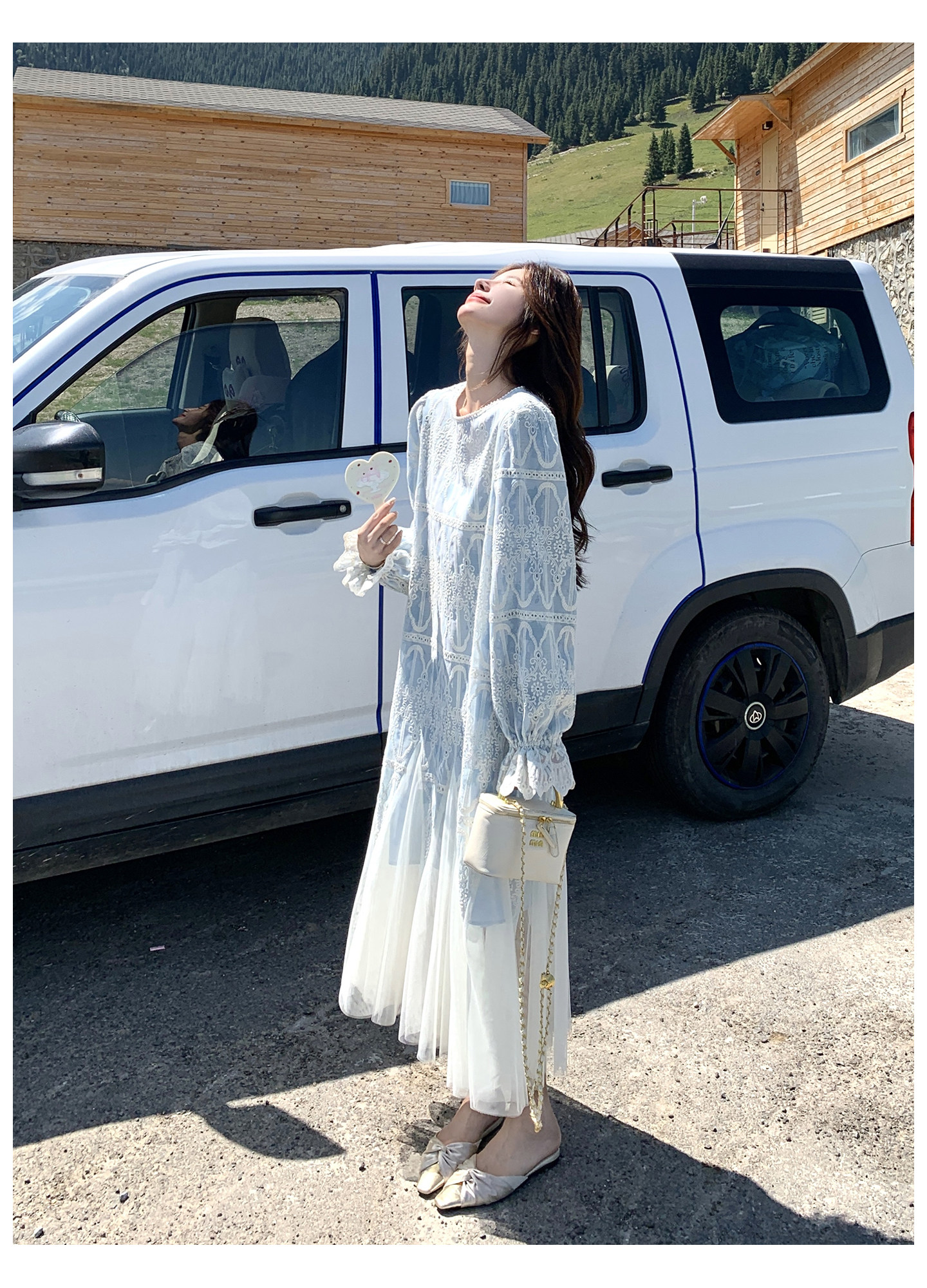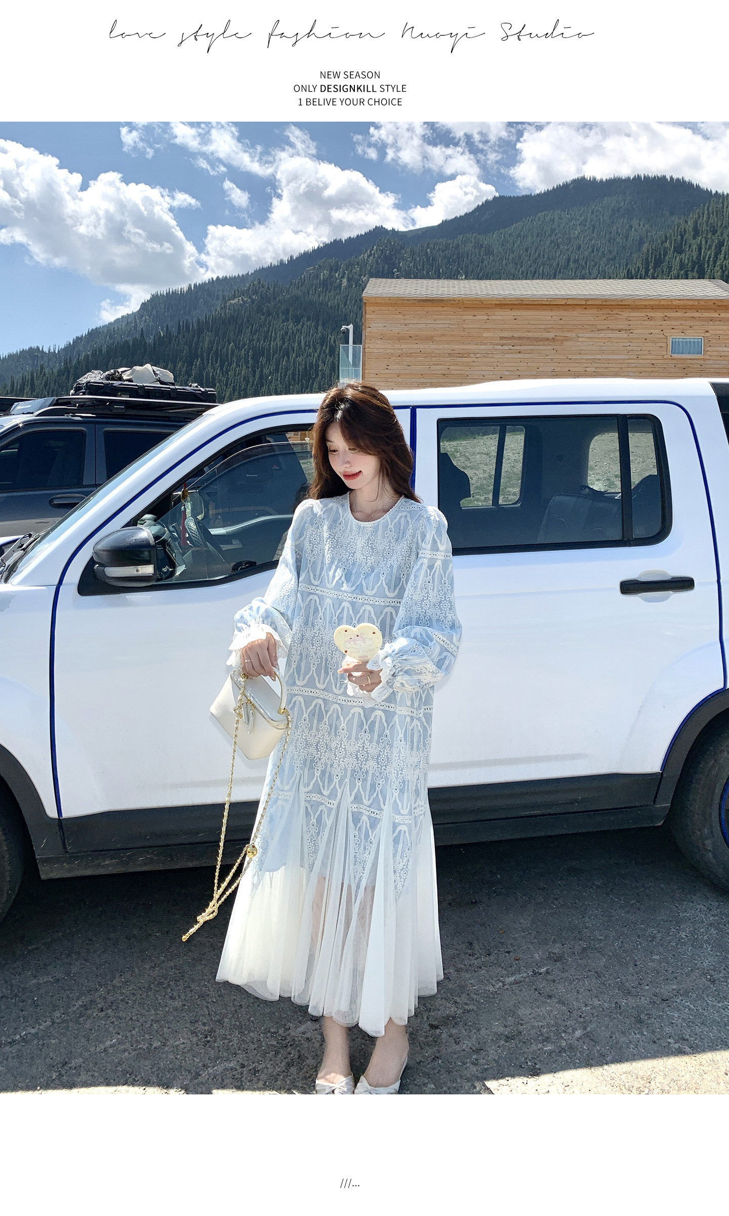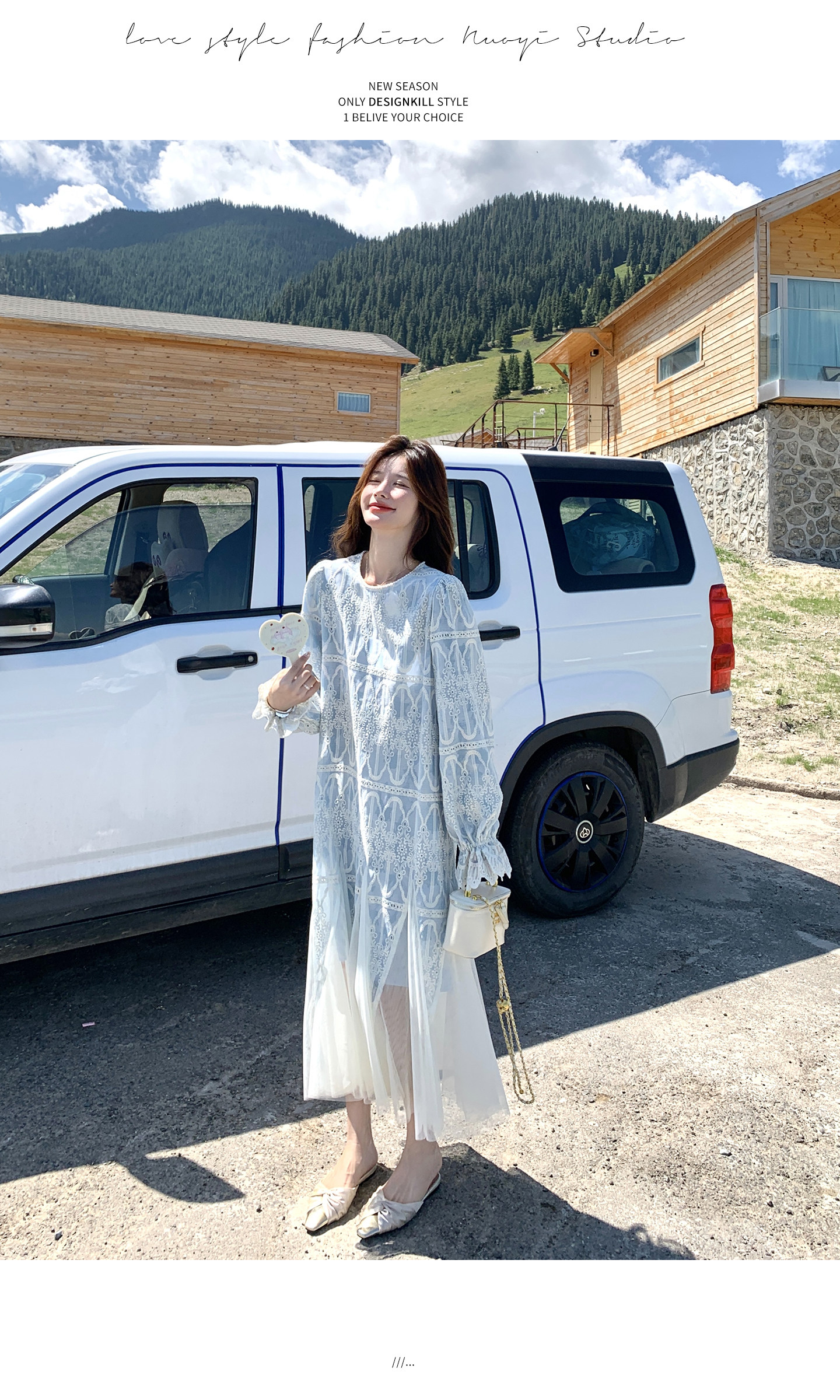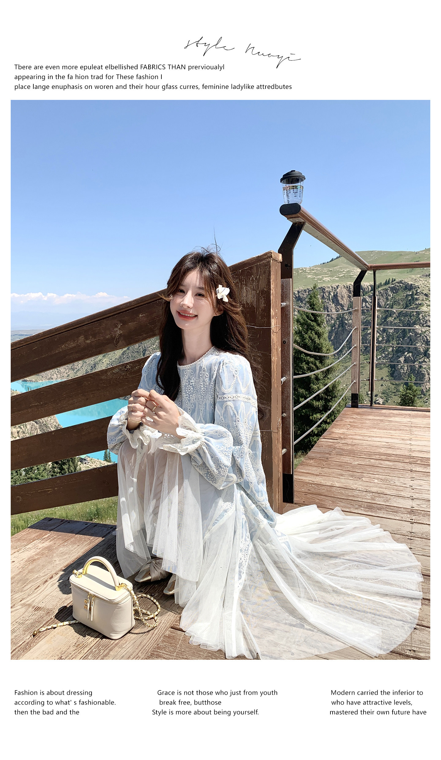 春カラー 大人気おすすめ色✨【ワンピース】フレンチ風 ライトブルー 刺繍チュール切替 レディース ゆったり シルエット 長袖ワンピース【SHシリーズ】